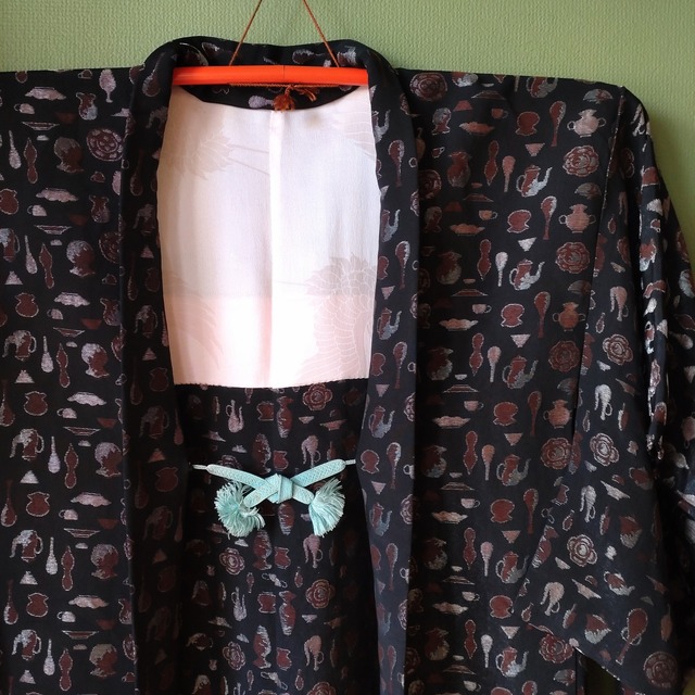 壺柄の羽織です。織りの生地でずっしり重みがあります。黒地に銀糸が織り込まれていて全体的にキラキラ、様々な壺と羽織紐の水色がちょっぴり個性派で可愛い一枚です。 ※左袖の後ろ側に3cm程のリペアがあります。また羽織紐に汚れがあります。画像をご確認の上ご理解いただける方にお願いいたします。 身丈 81cm 裄 62cm 袖丈 48cm 素材/絹、銀糸 ※採寸の多少の誤差はご了承くださいませ。 ※古着の商品につき、使用感やシミなどがある場合がございます。アンティーク・ヴィンテージの性質をご理解頂いた上でご購入頂きますようお願い申し上げます。 ※店頭で同時にご購入があった場合、店頭での販売を優先させていただきます。 ※ご購入後の返品・交換は行っておりません。 予めご了承ください