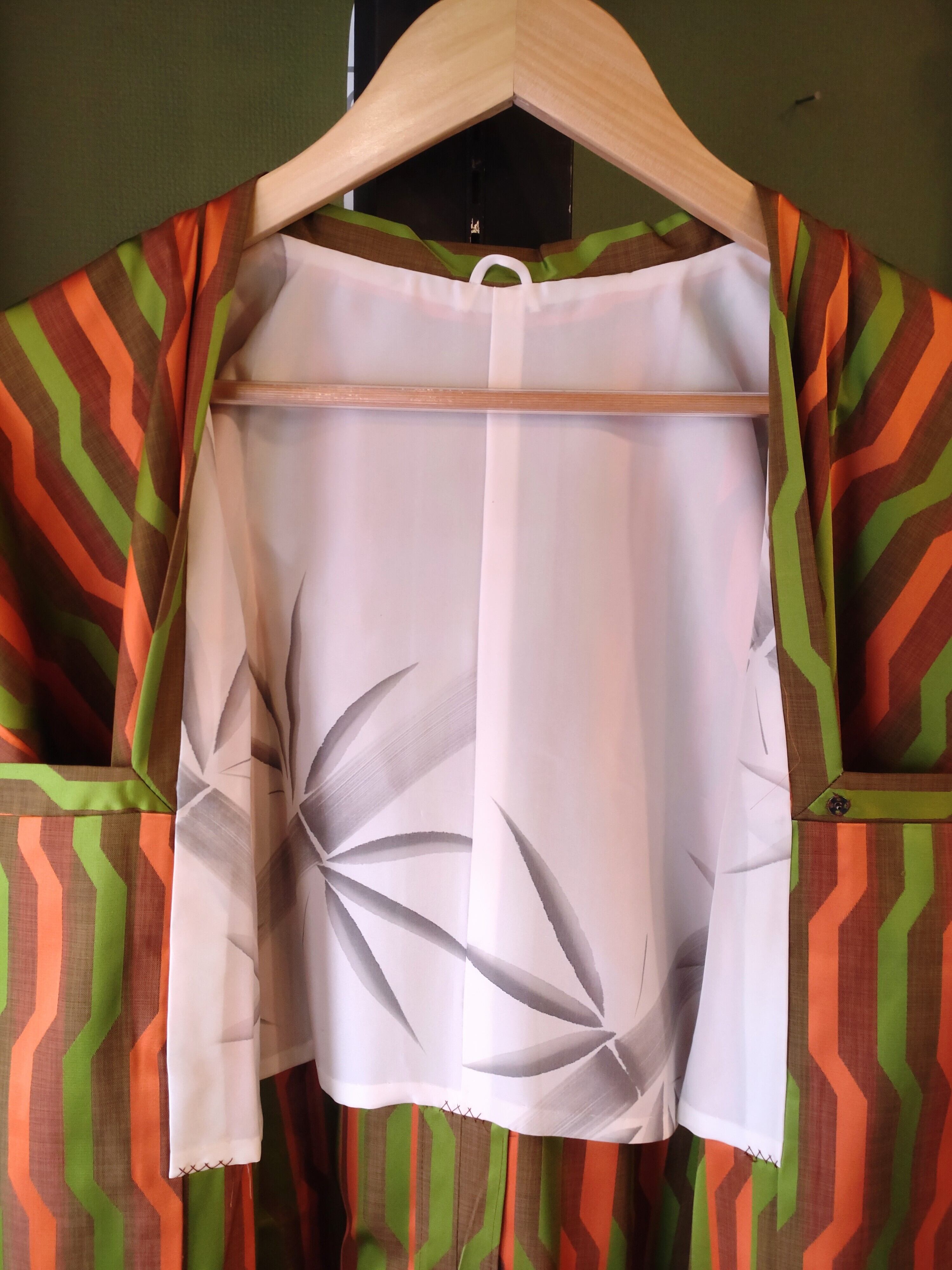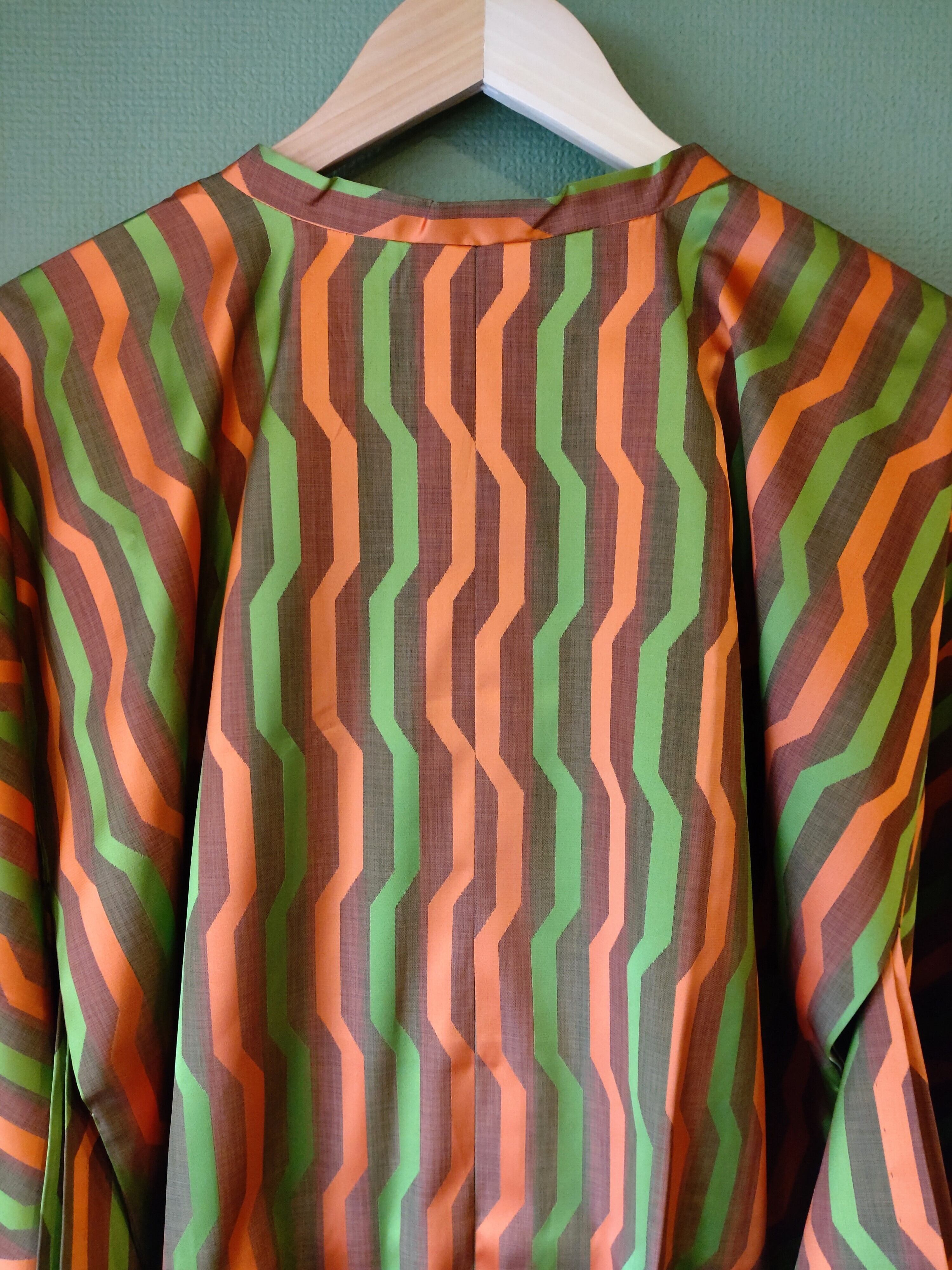 光沢のあるオレンジ・グリーン・ブラウンの変わり縞がレトロポップな雰囲気です。
