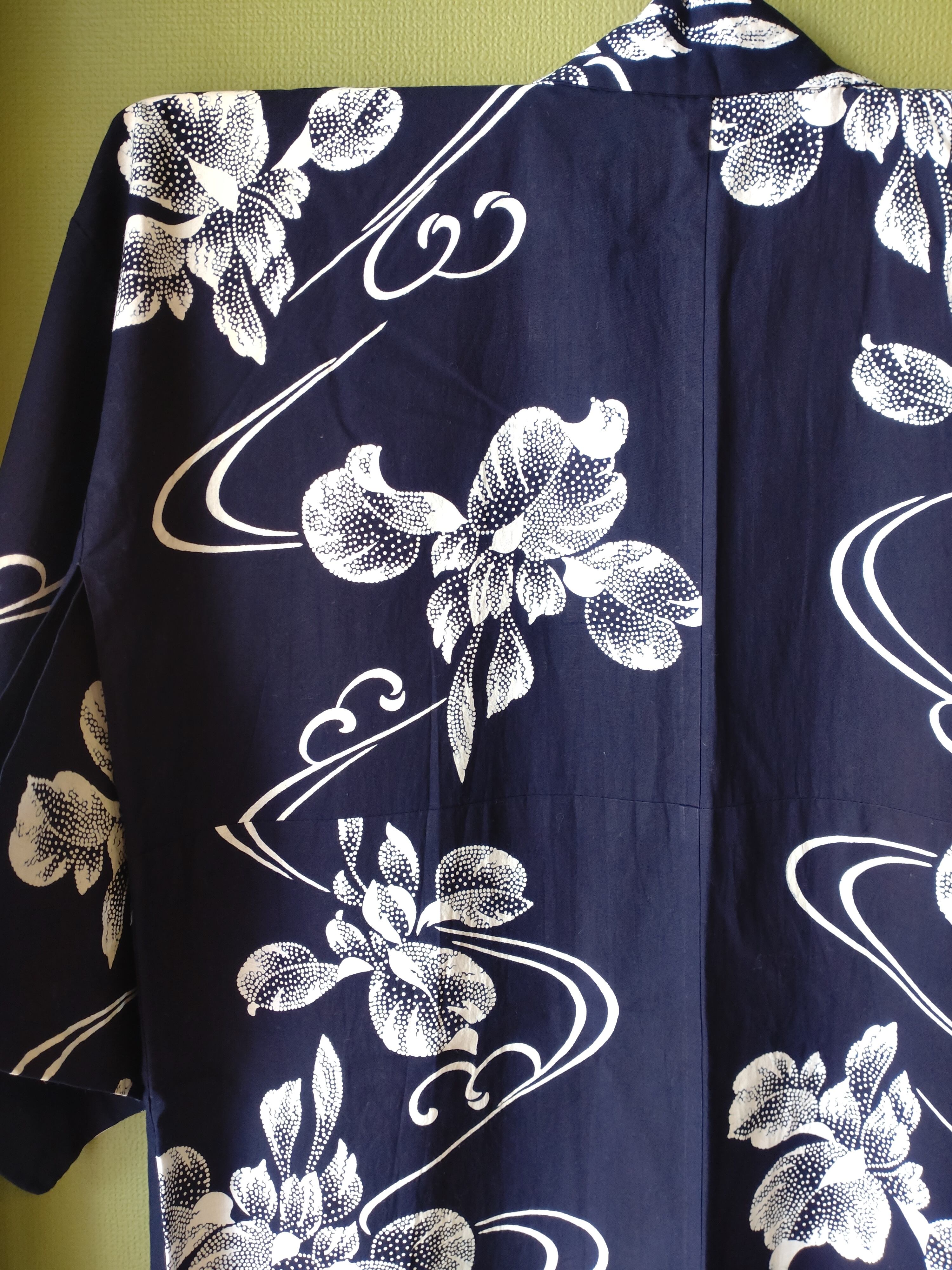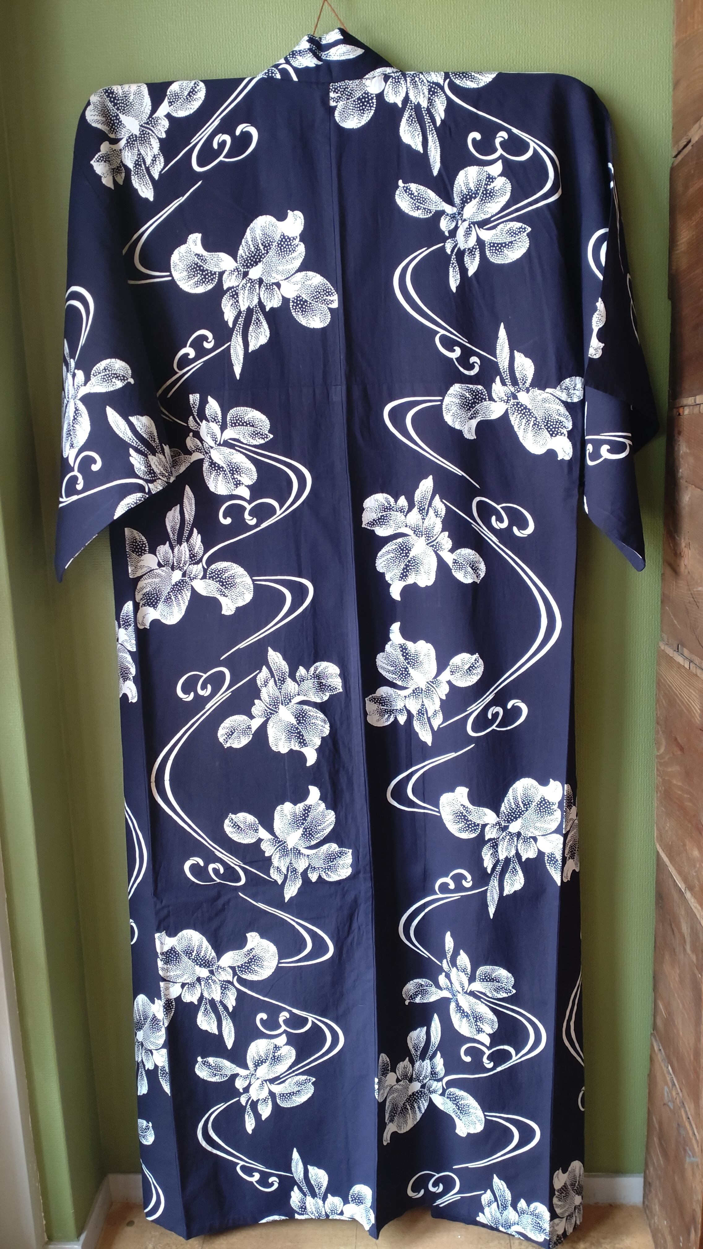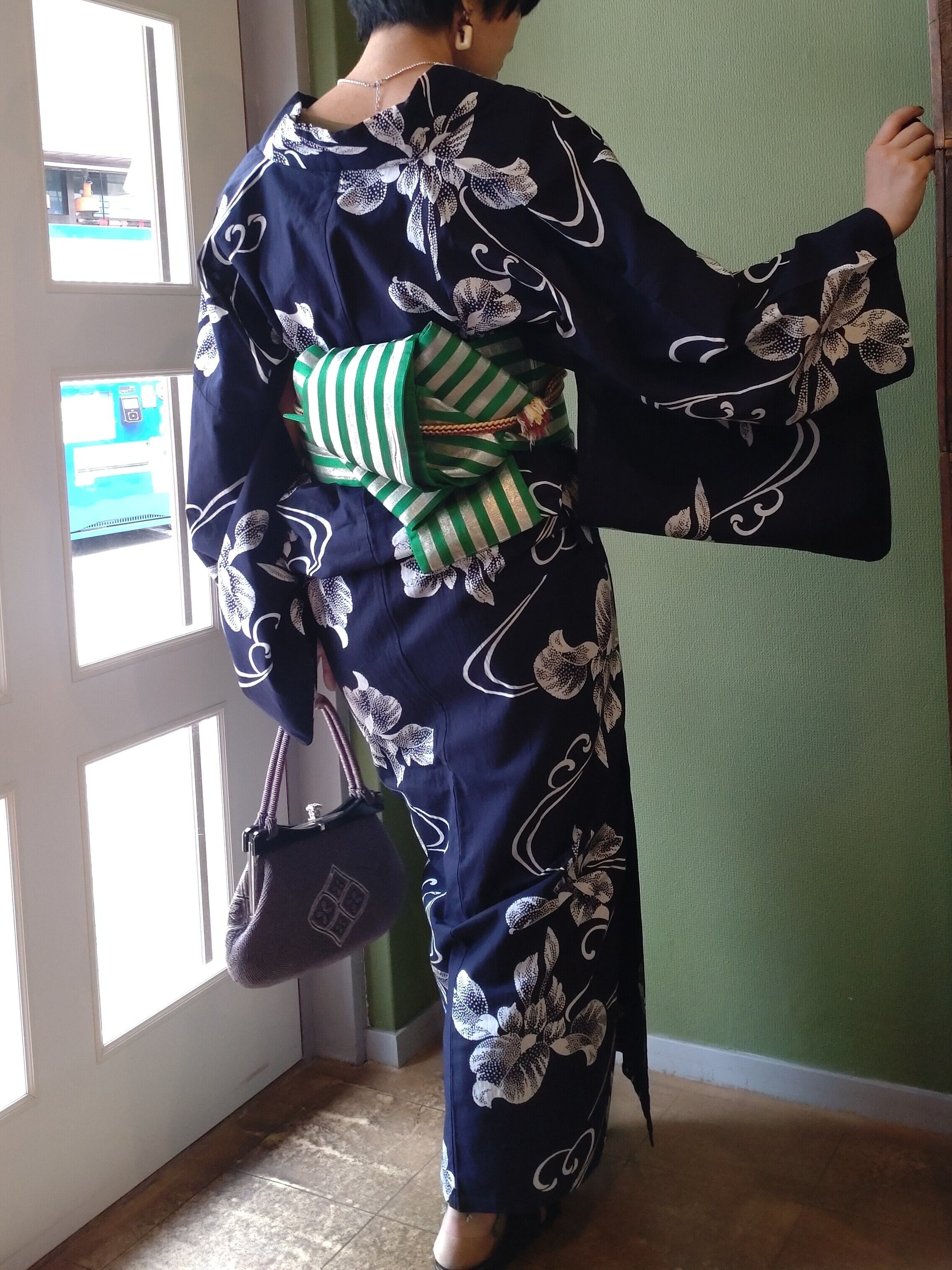 染めの浴衣です。背縫い等の直線はミシン縫いです。点描の菖蒲に流線が美しいデザイン。