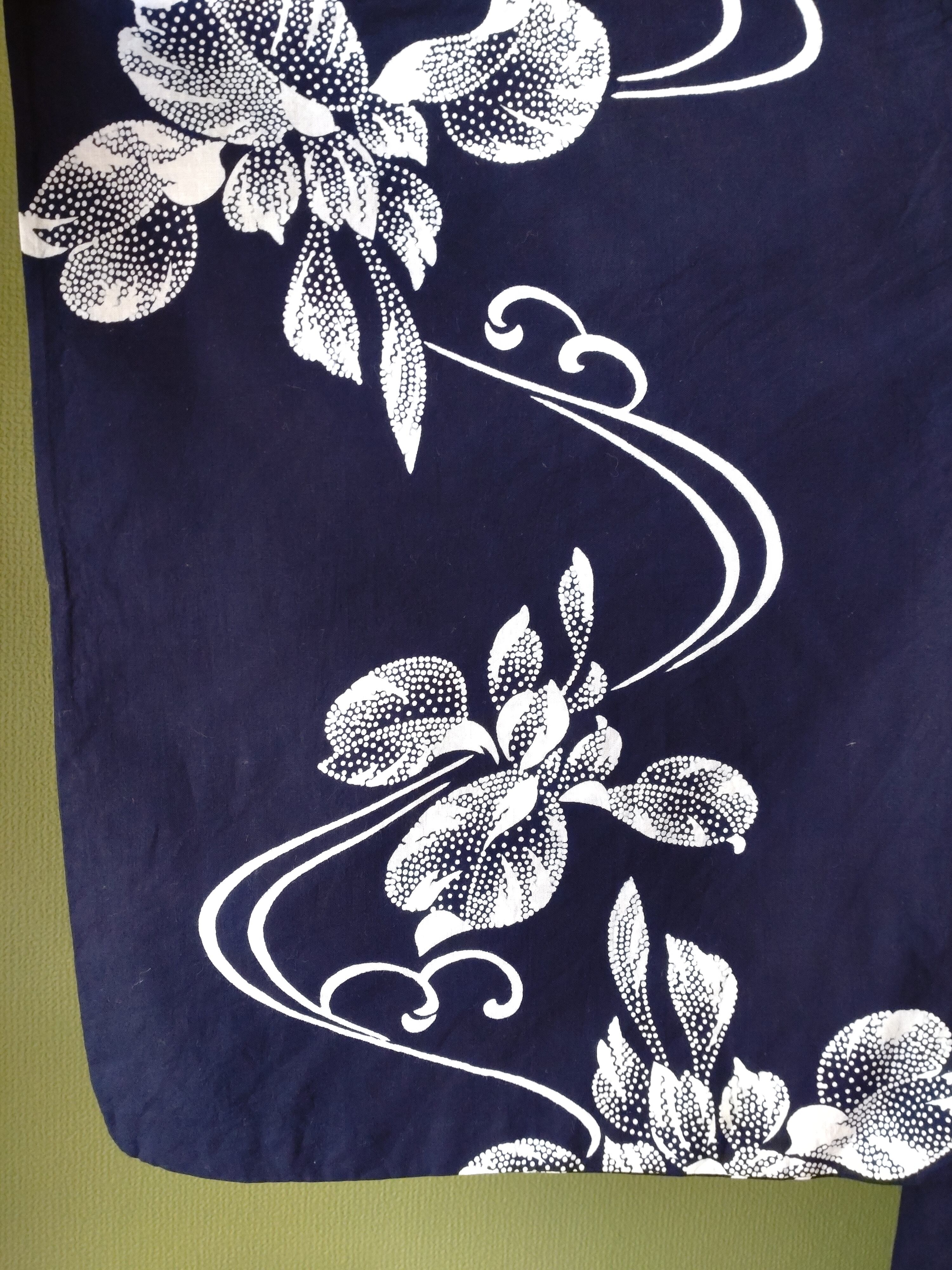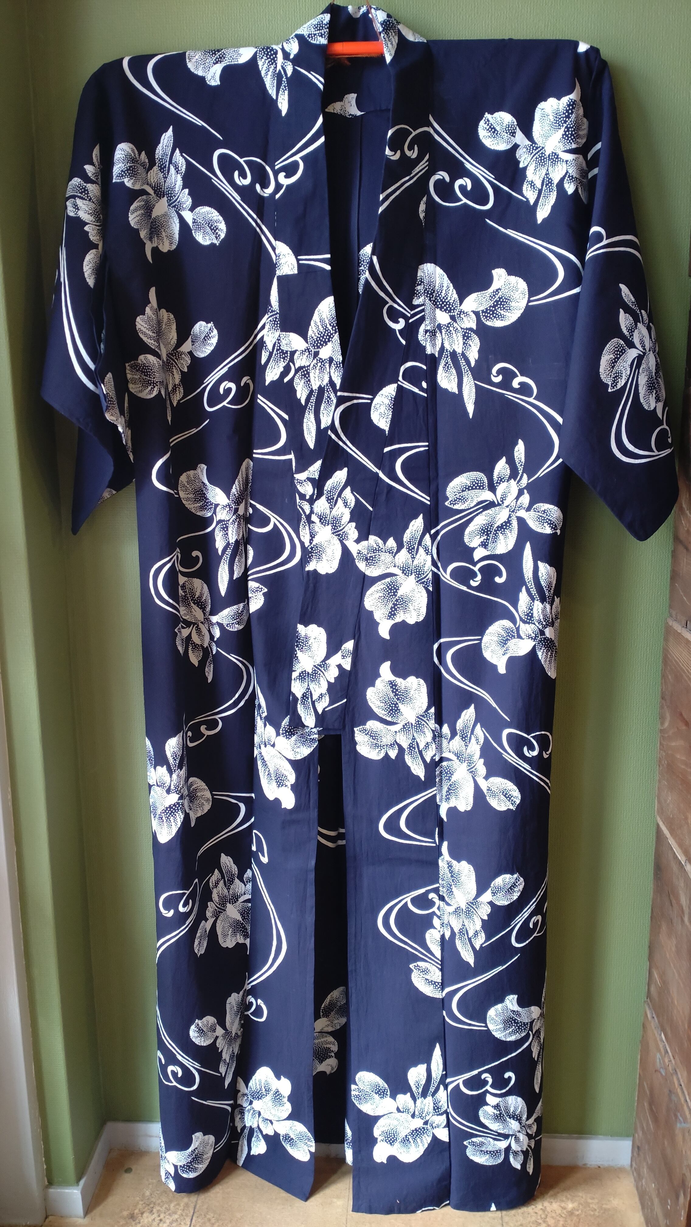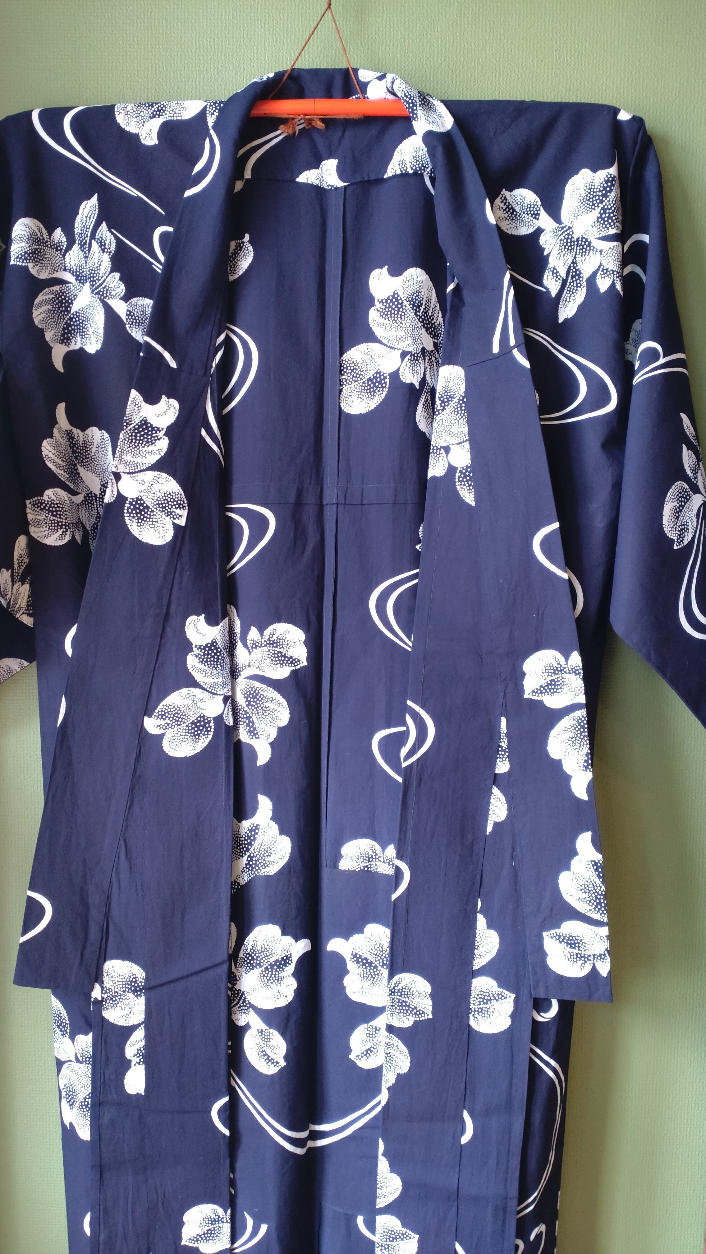 染めの浴衣です。背縫い等の直線はミシン縫いです。点描の菖蒲に流線が美しいデザイン。