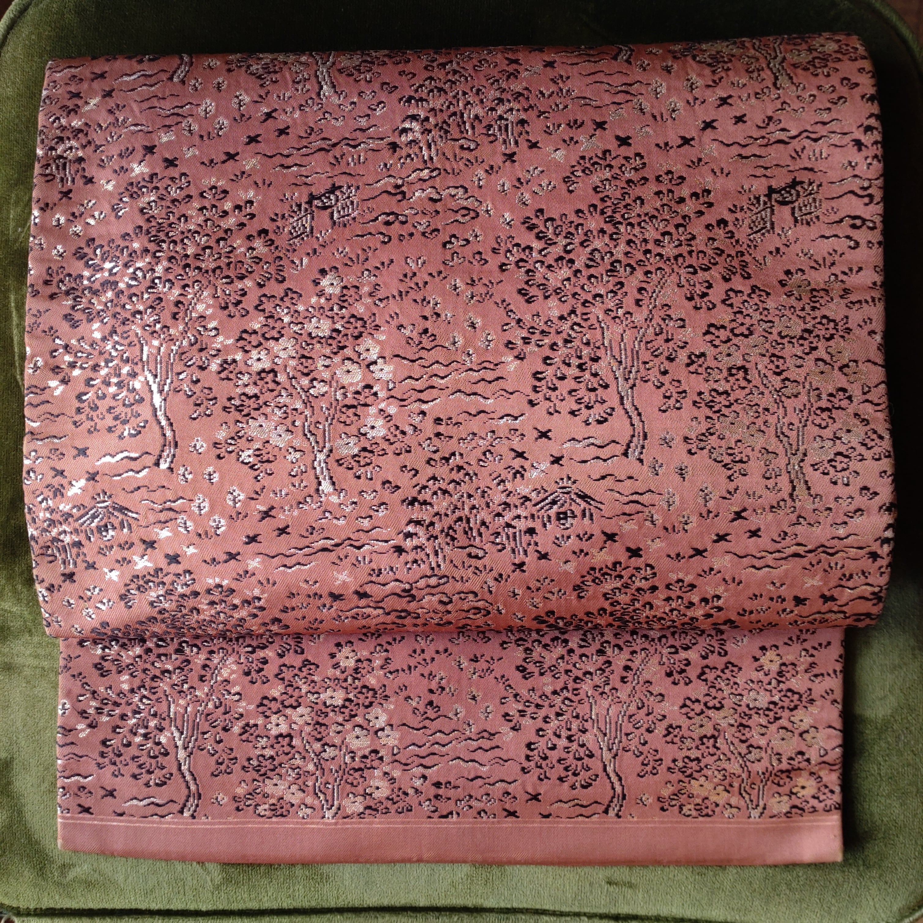 織りの名古屋帯です。赤土色に黒と金の木々の柄がシック。