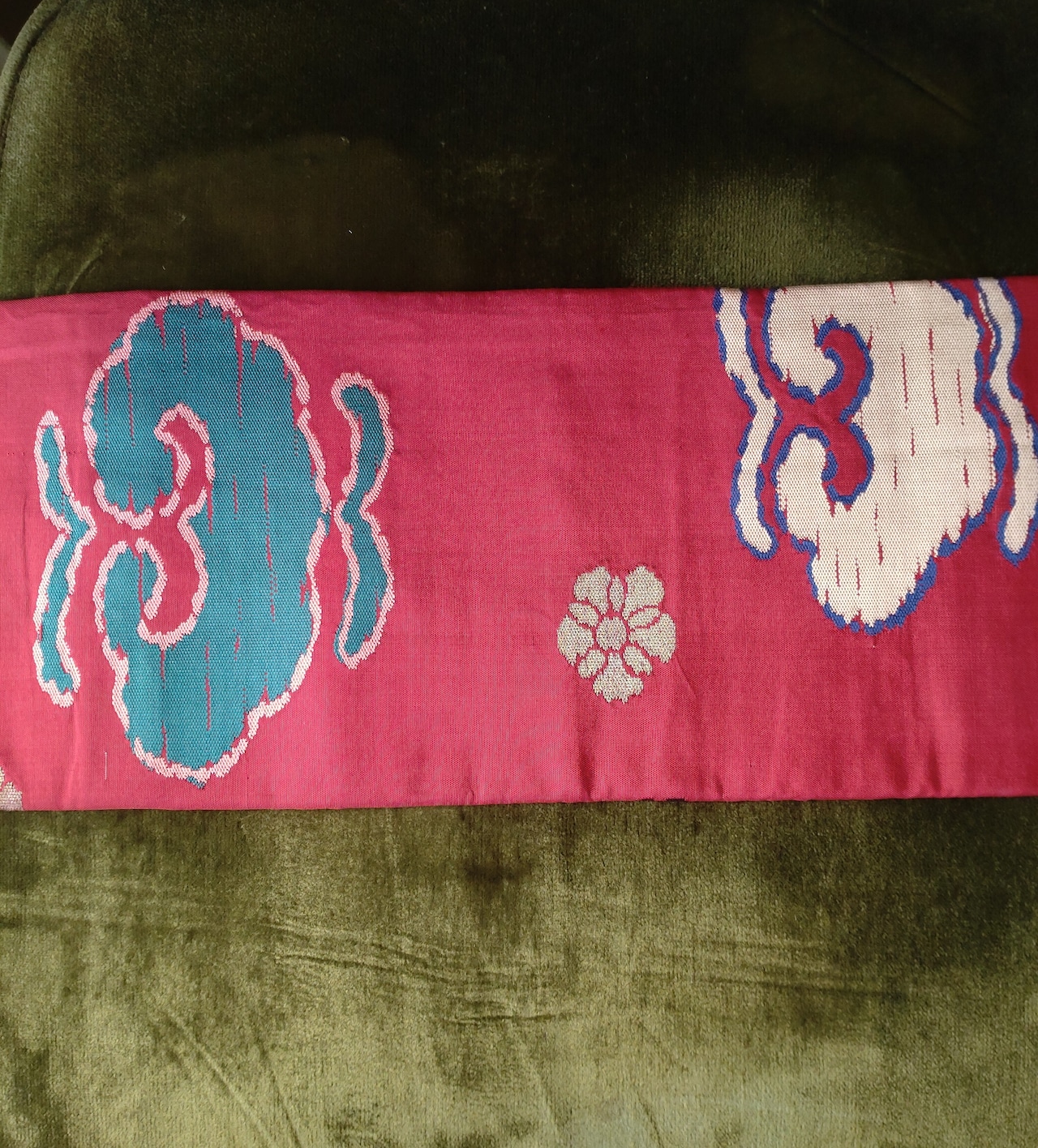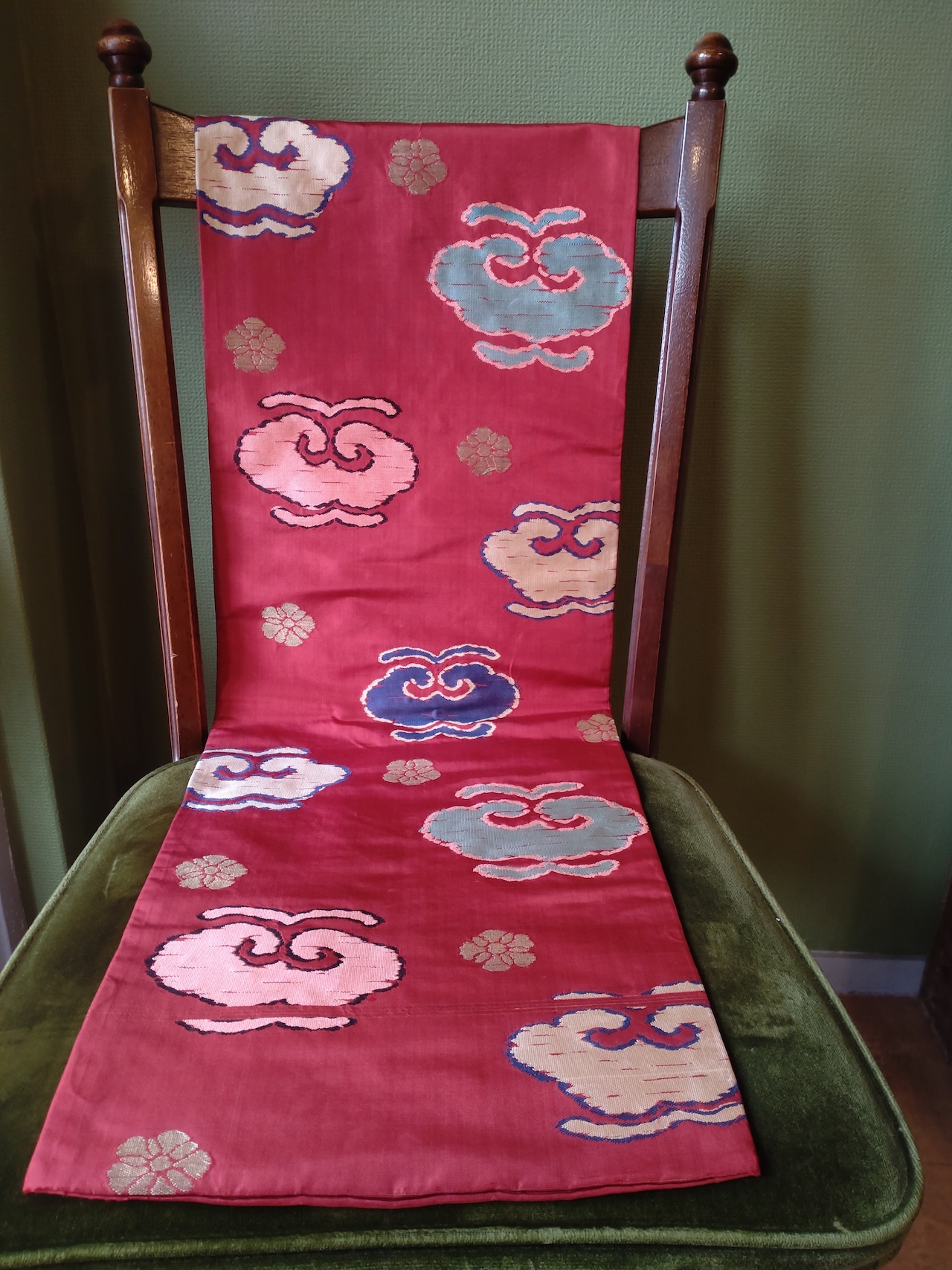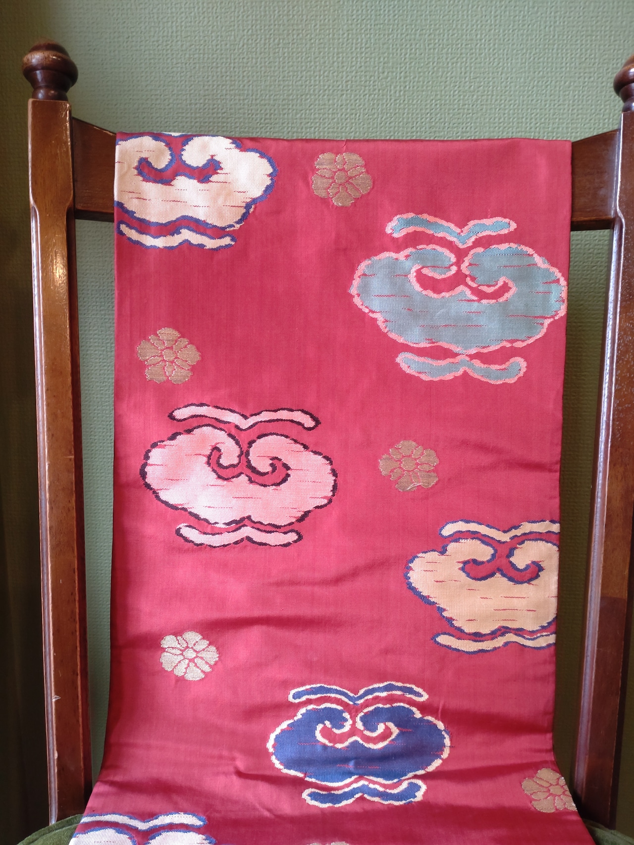 明るめのワインレッドに霊芝雲のような織り模様。蝙蝠紋にも見えますが、どちらにしろ吉祥文様で良い事ありそうです。