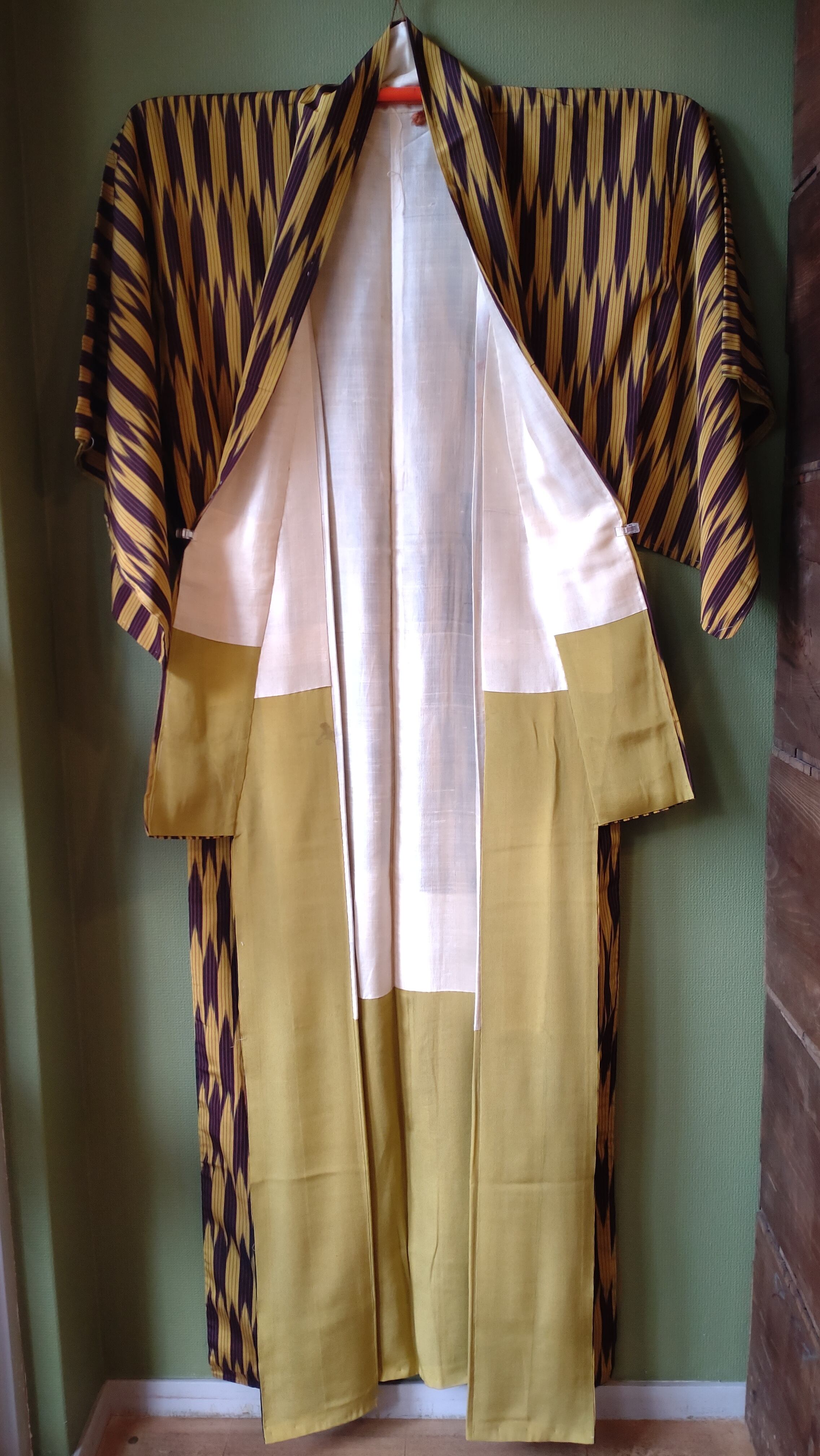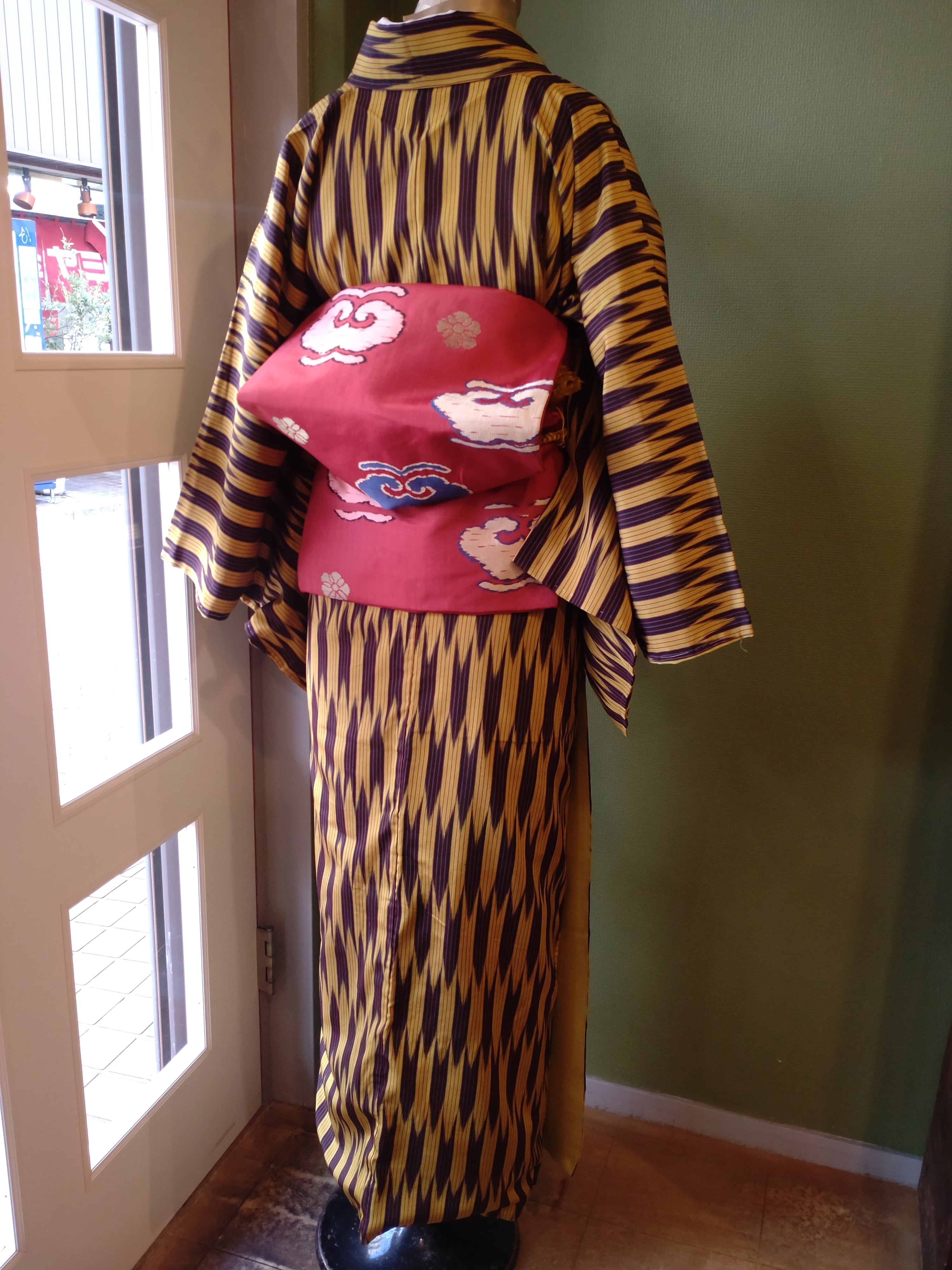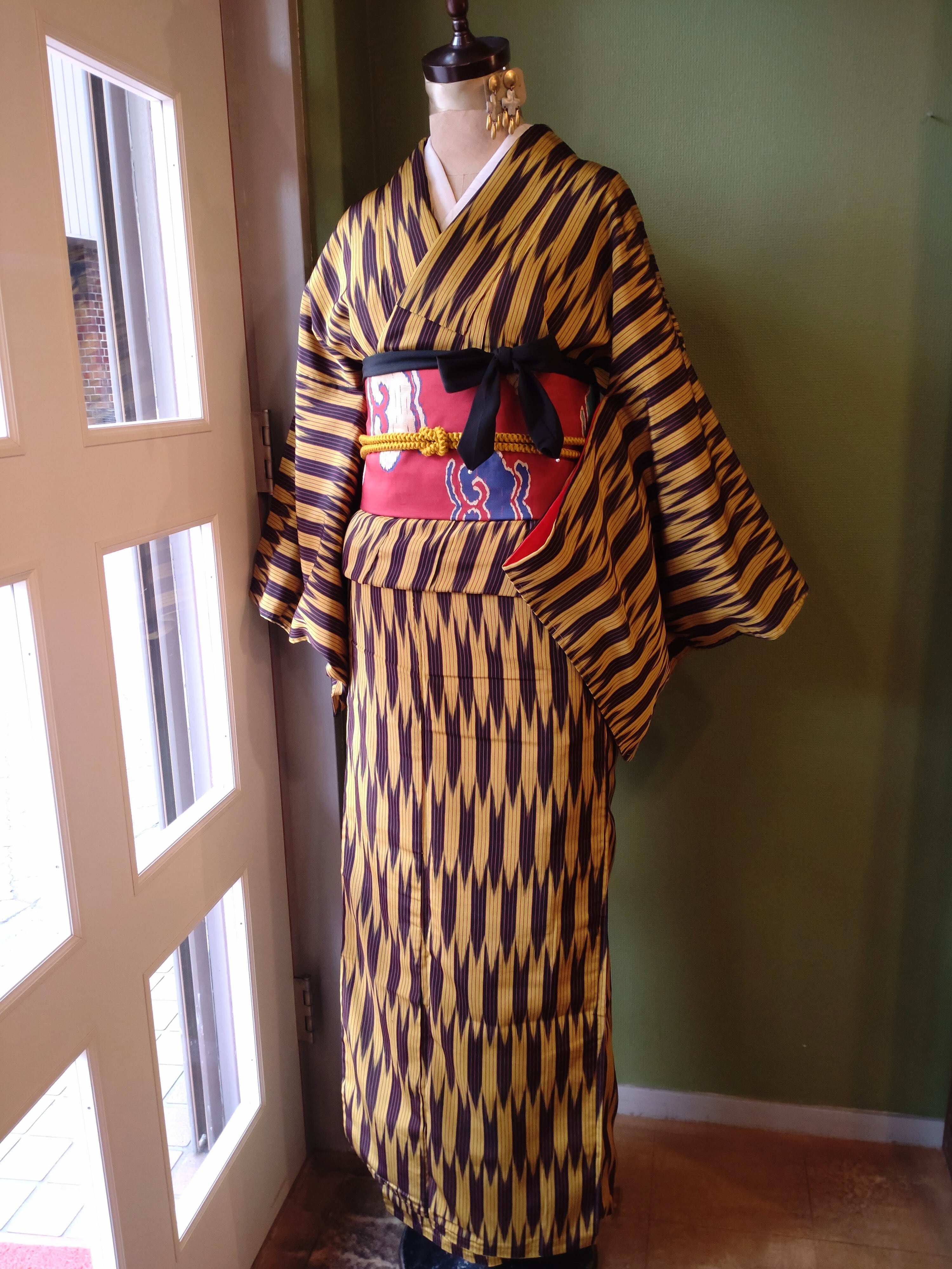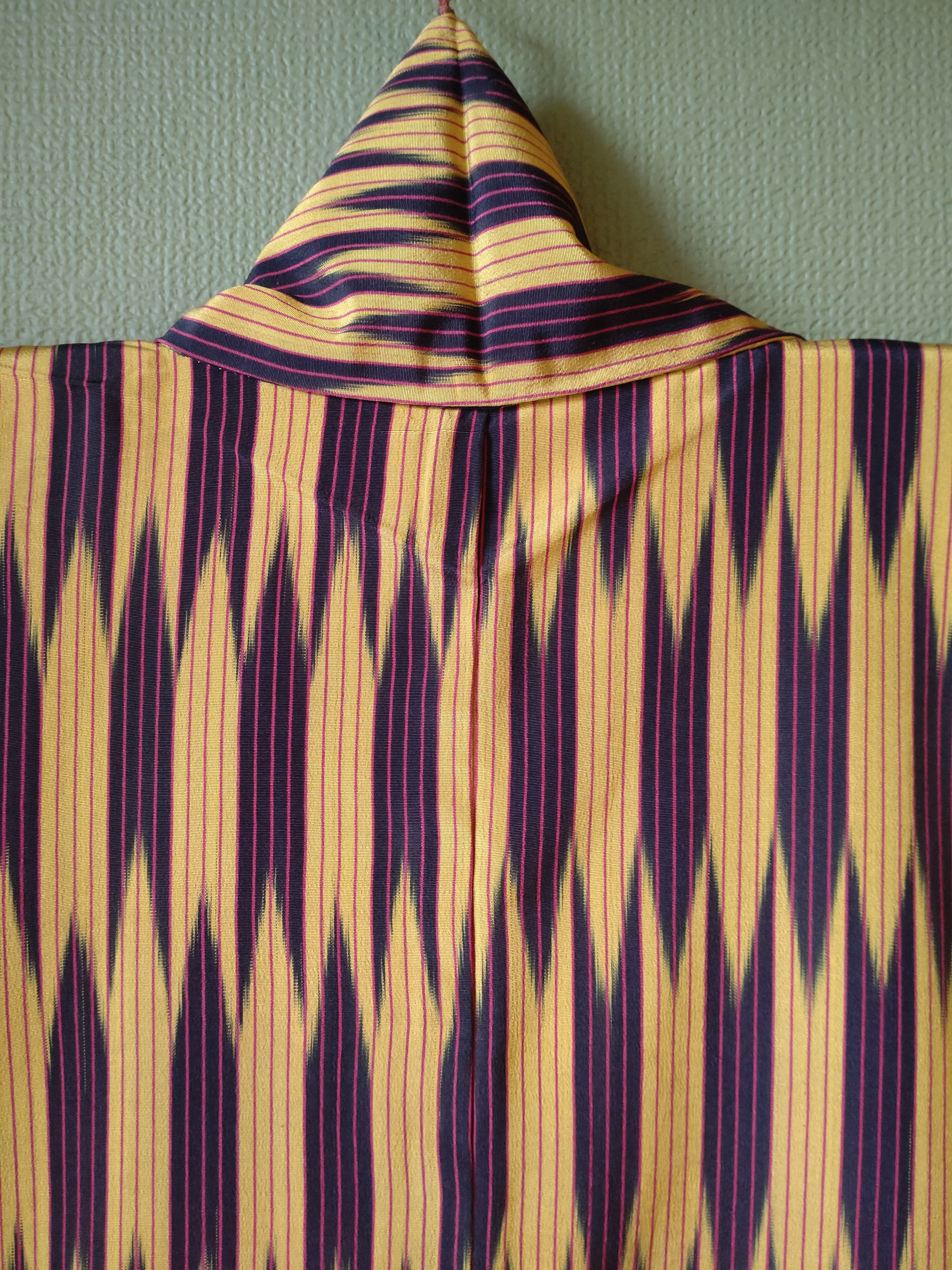 アンティークのお召しです。からし色と濃紺の矢絣がエッジの効いたデザイン。