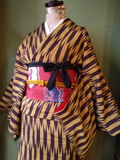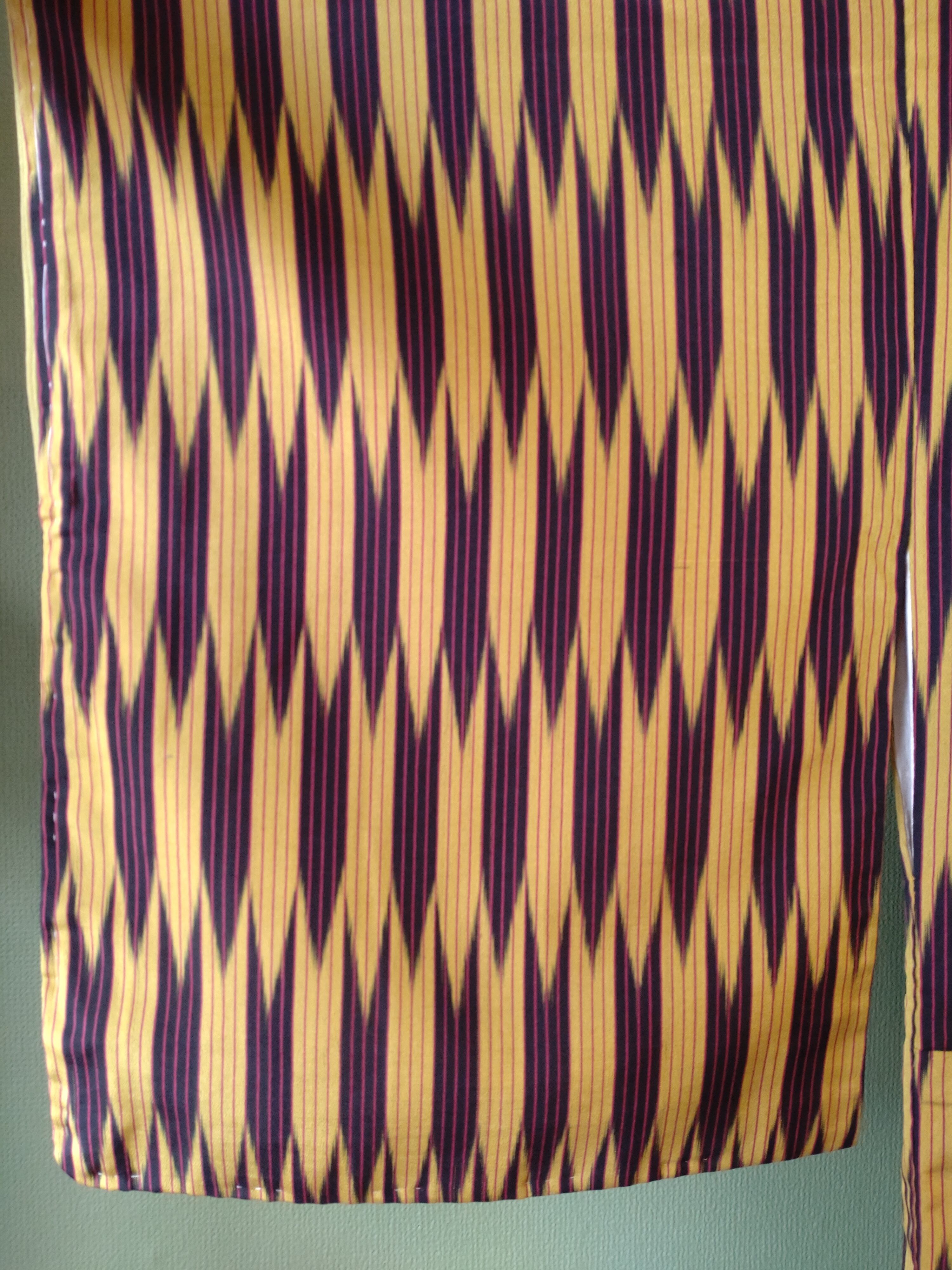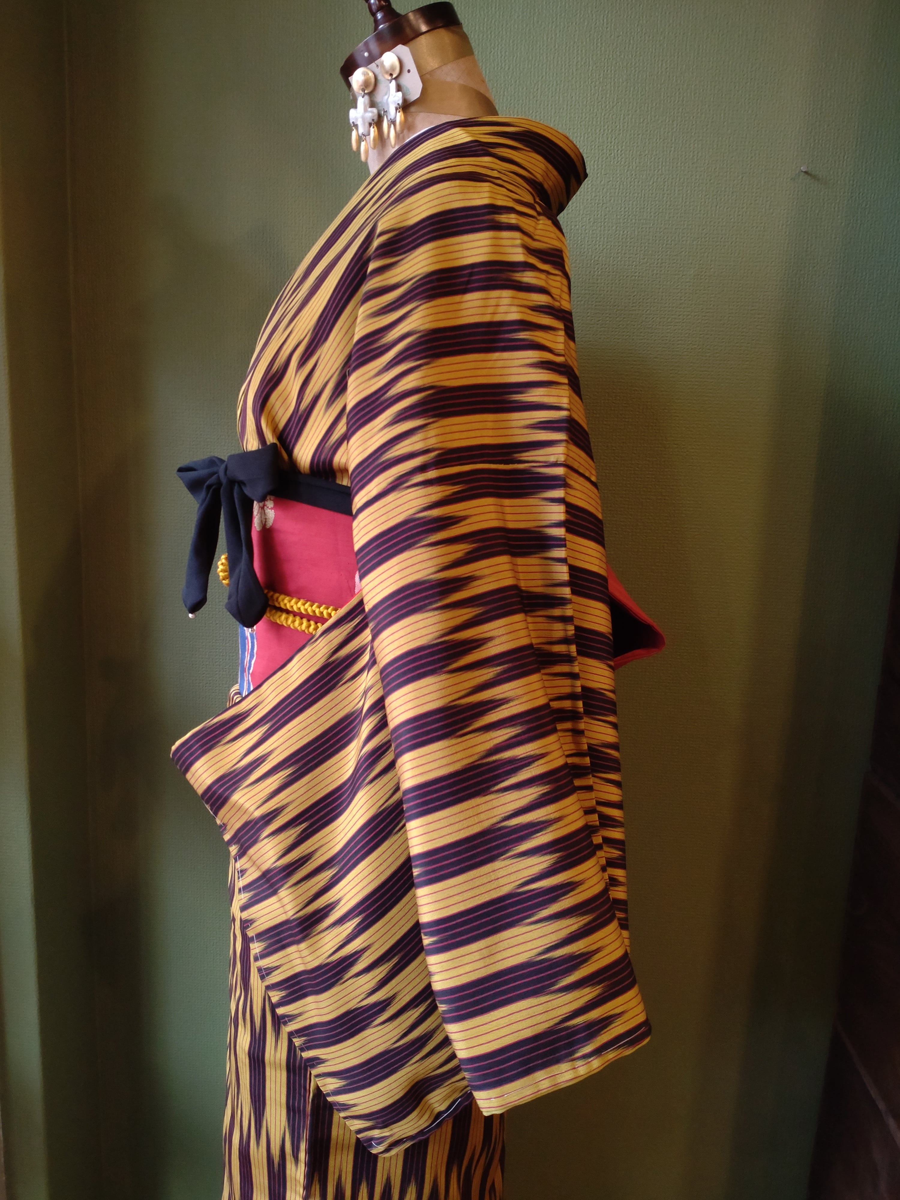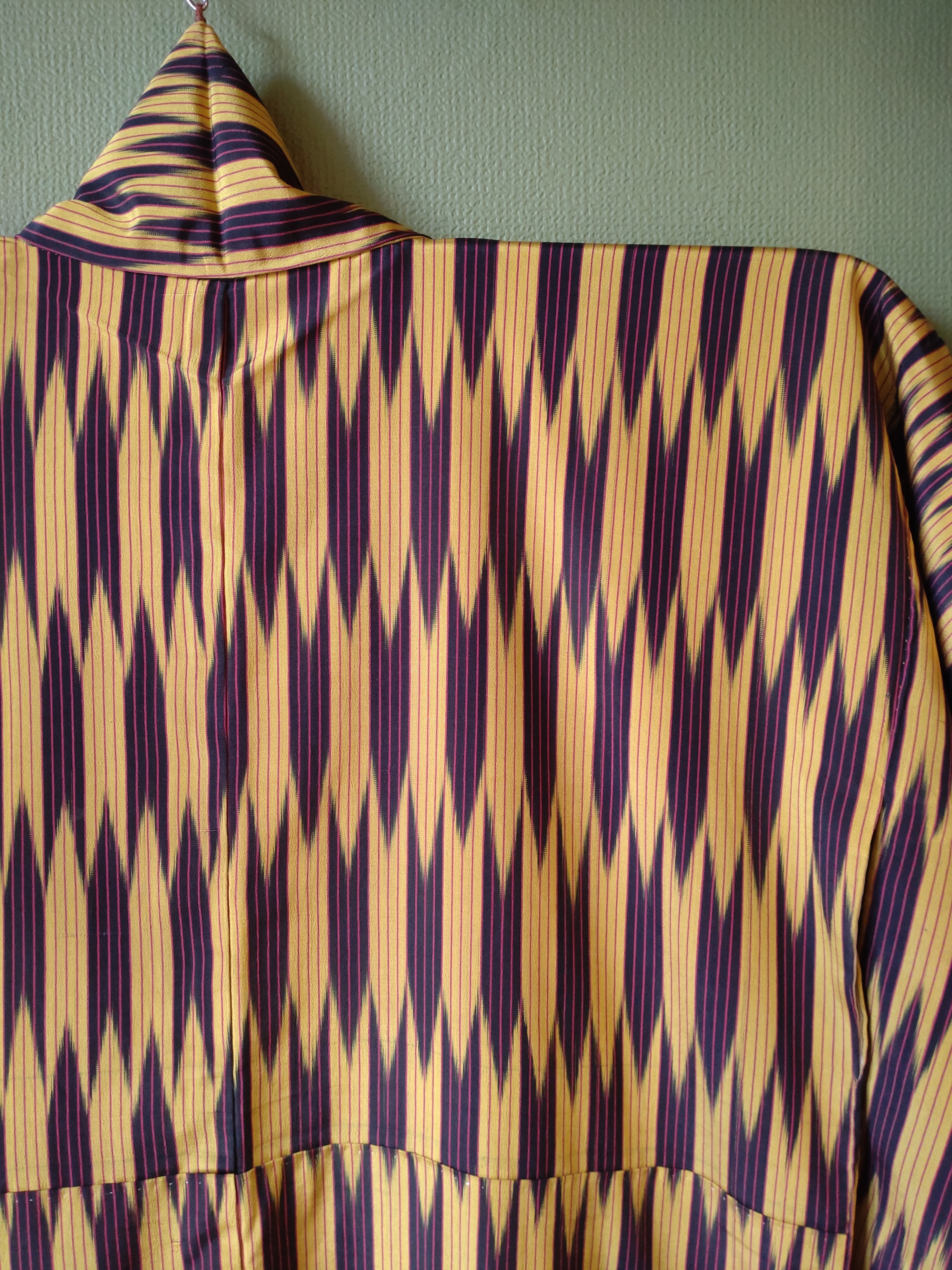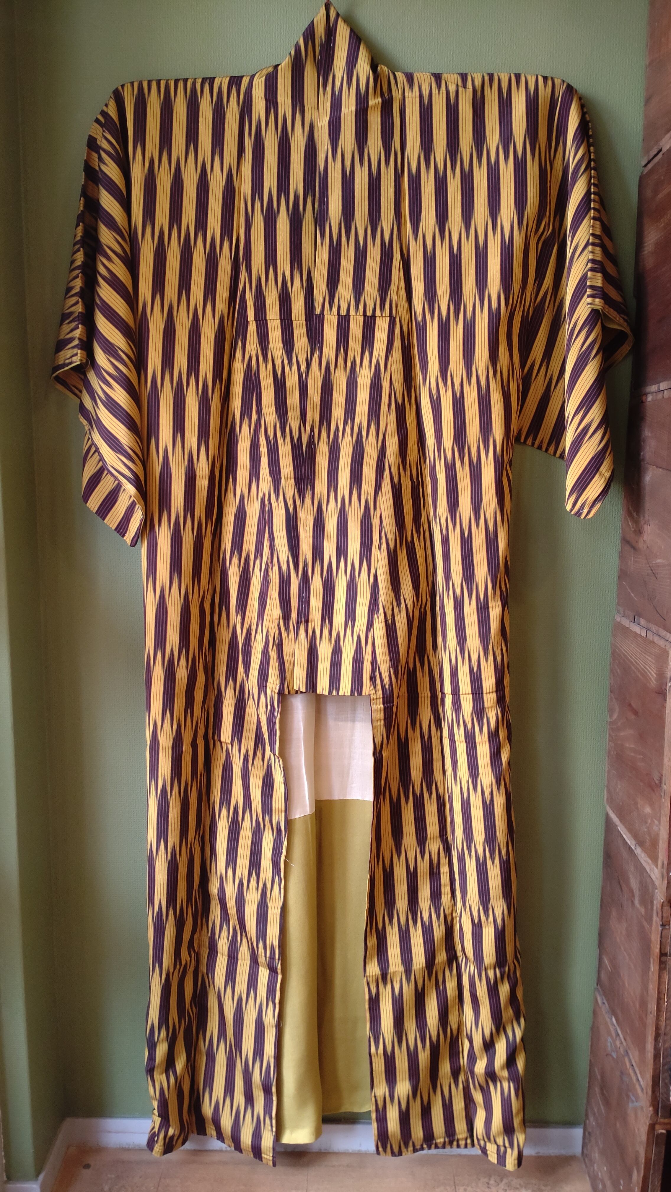 アンティークのお召しです。からし色と濃紺の矢絣がエッジの効いたデザイン。