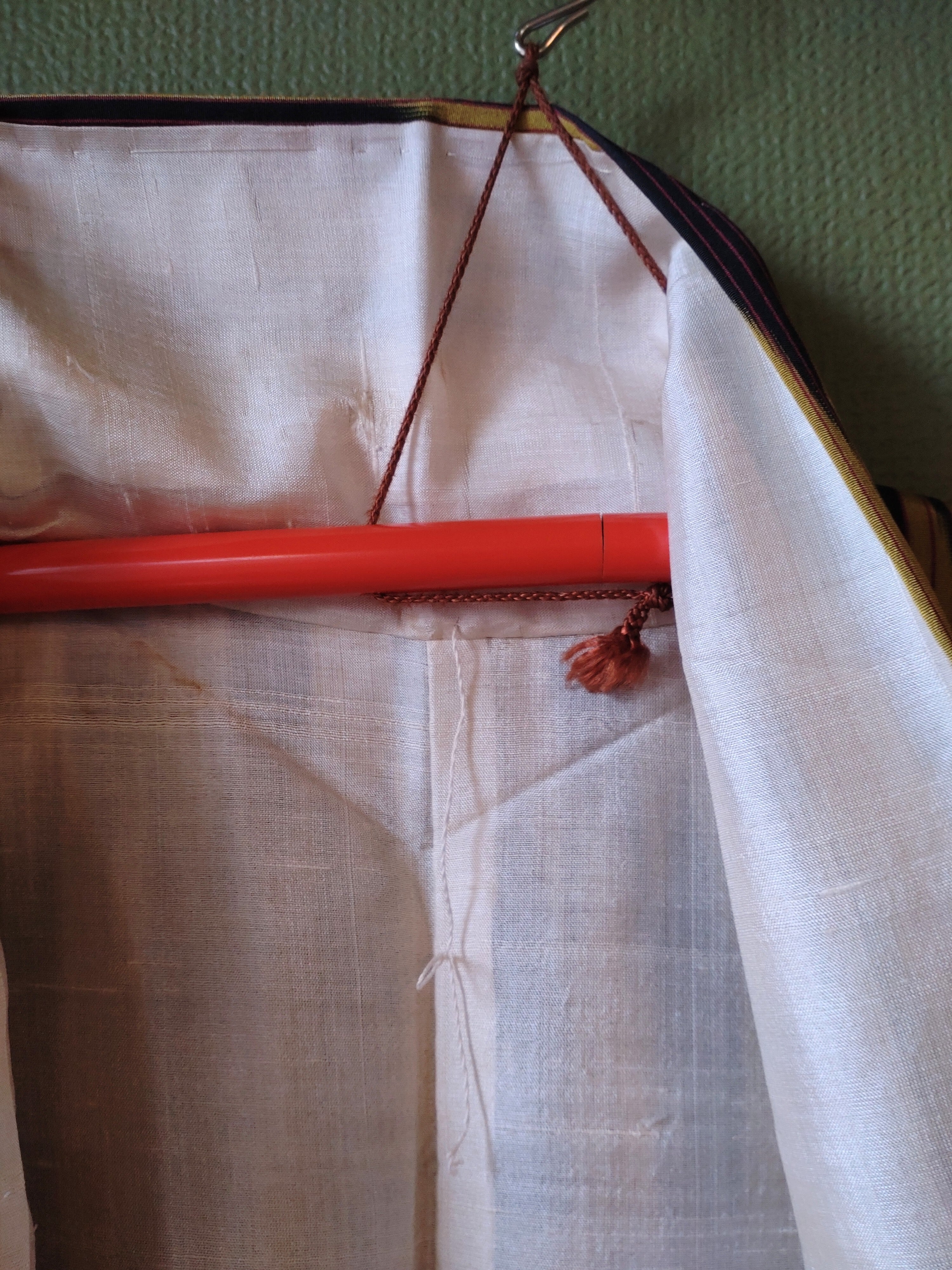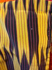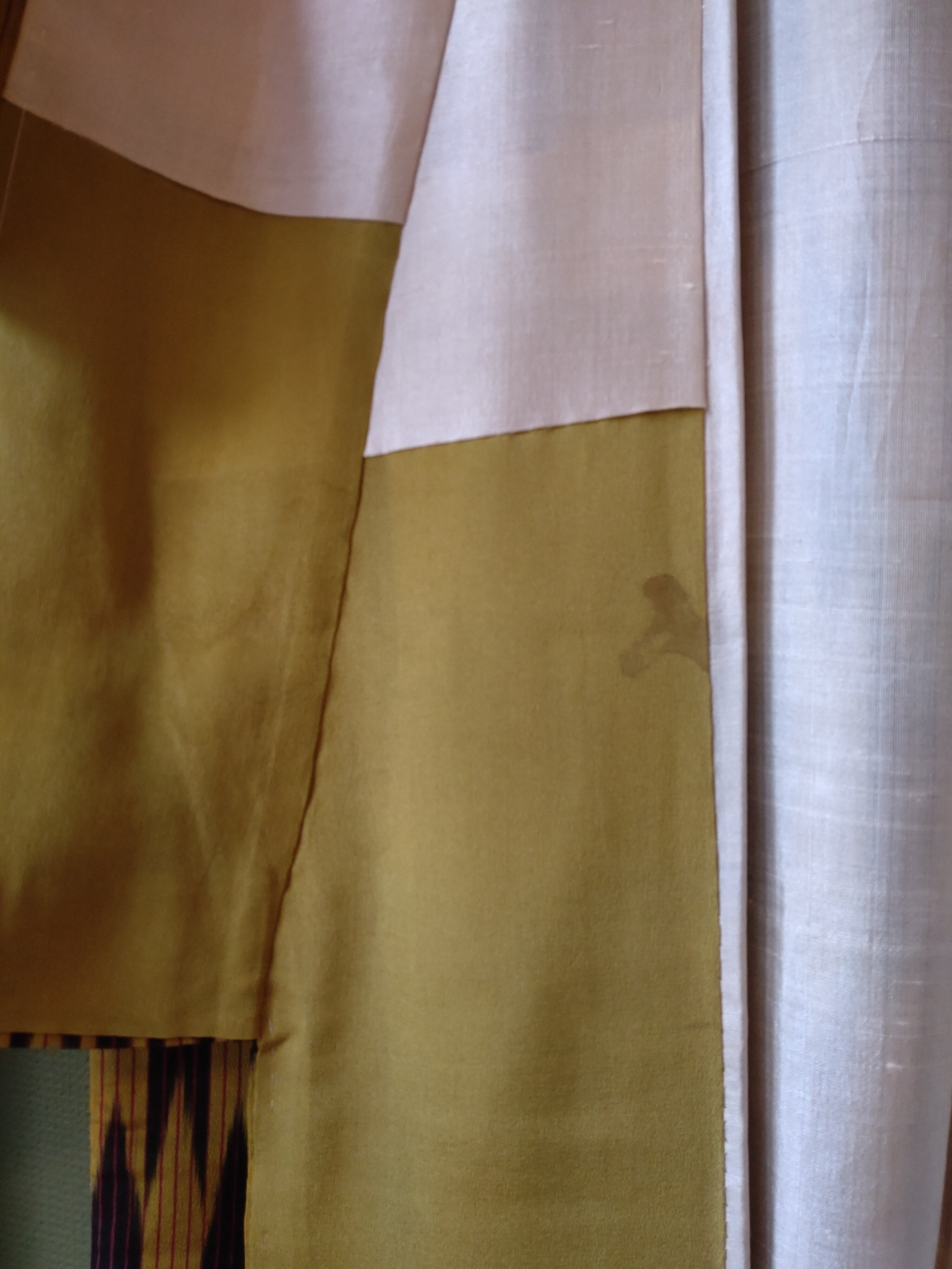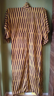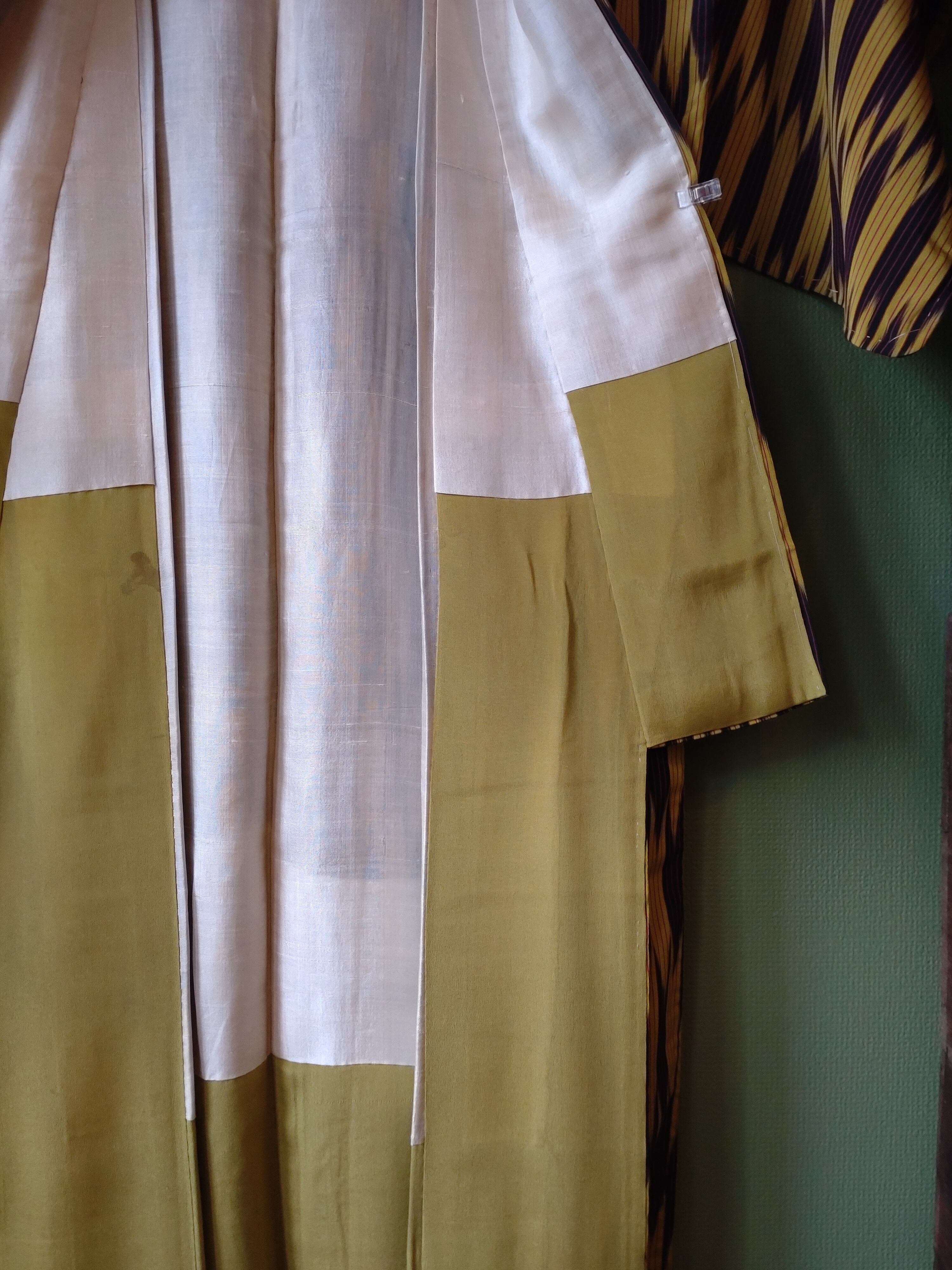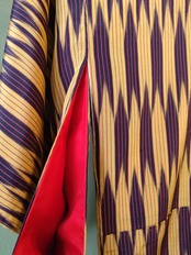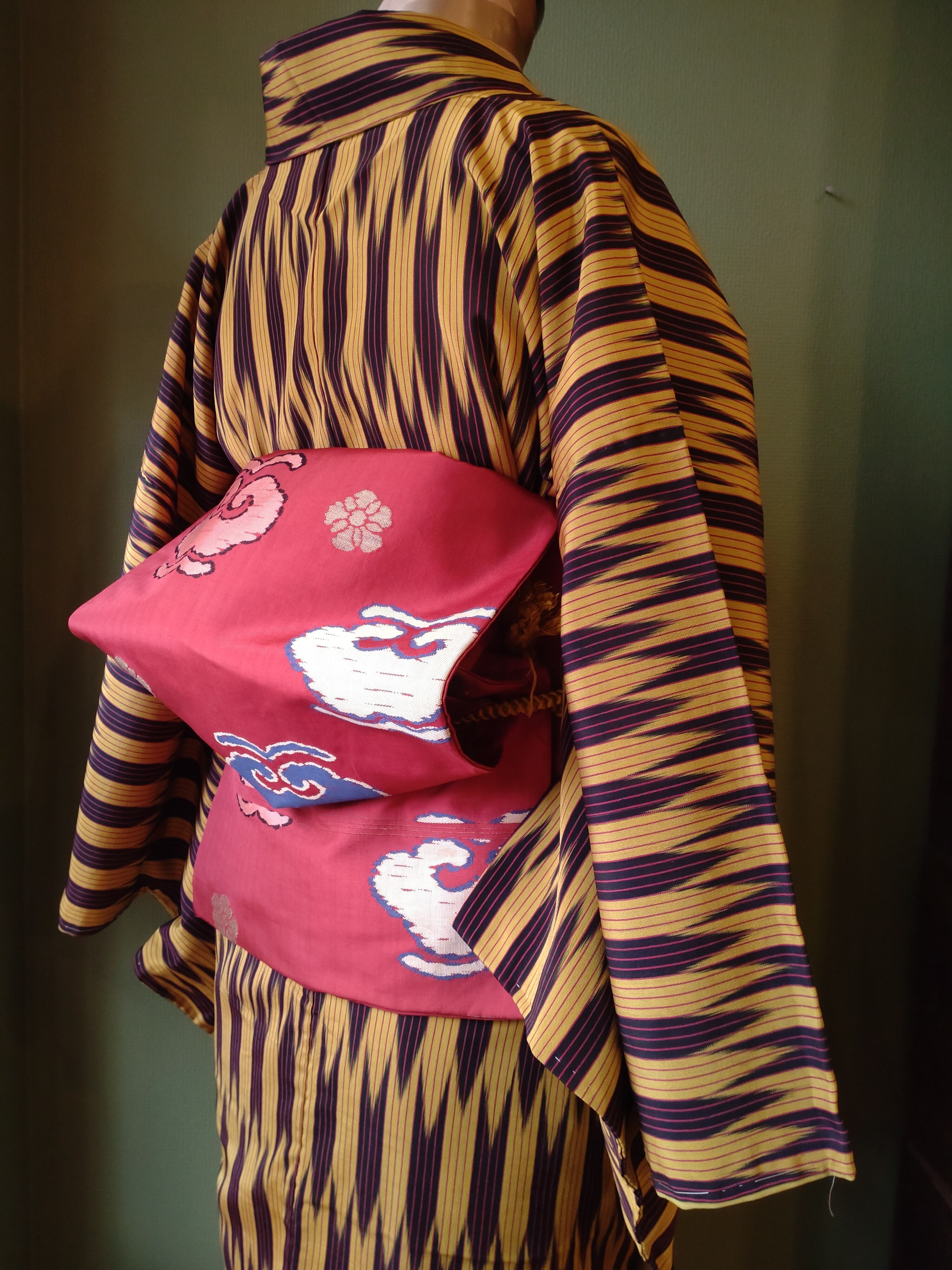 アンティークのお召しです。からし色と濃紺の矢絣がエッジの効いたデザイン。
