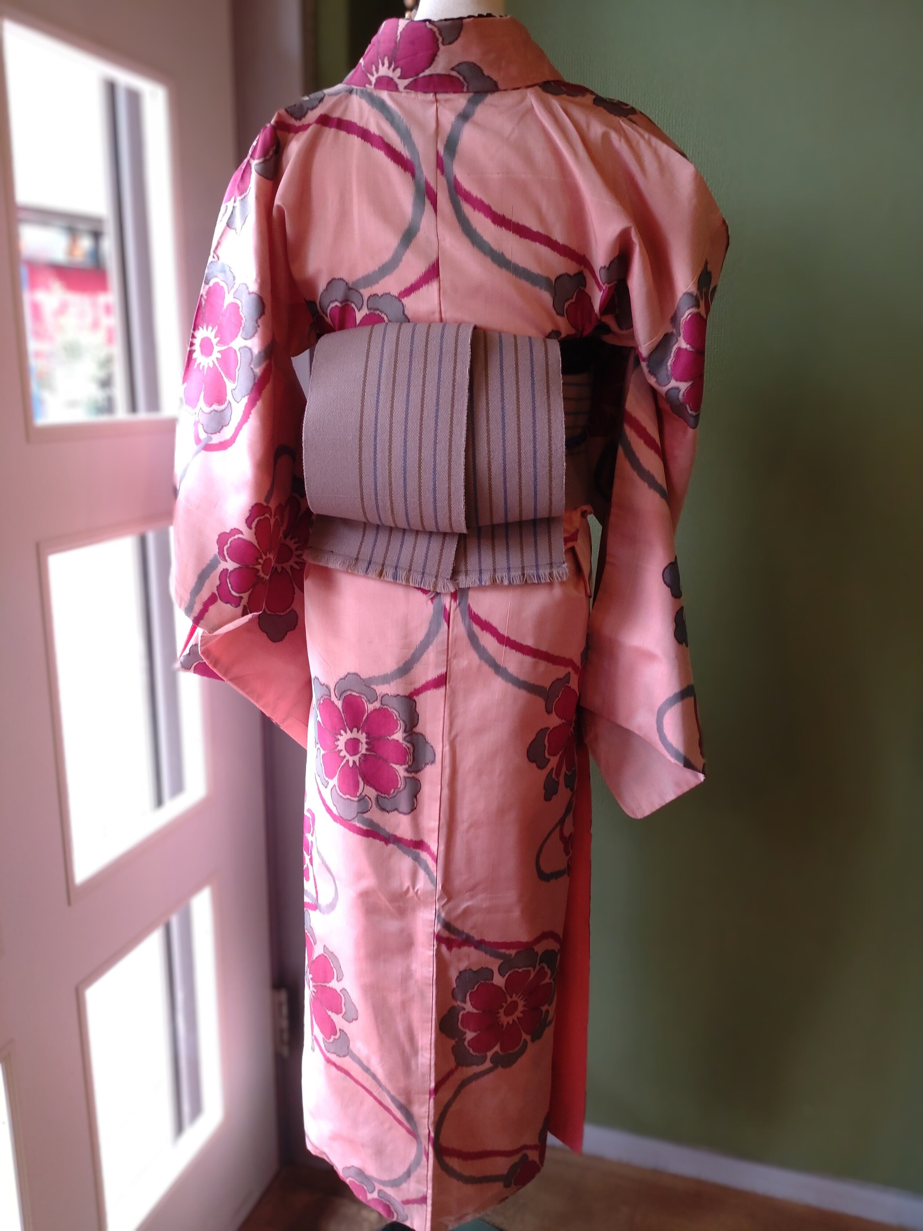 アンティーク銘仙の袷着物です。落ち着いたピンクに青灰色とマゼンタの花が流れるようなデザイン。