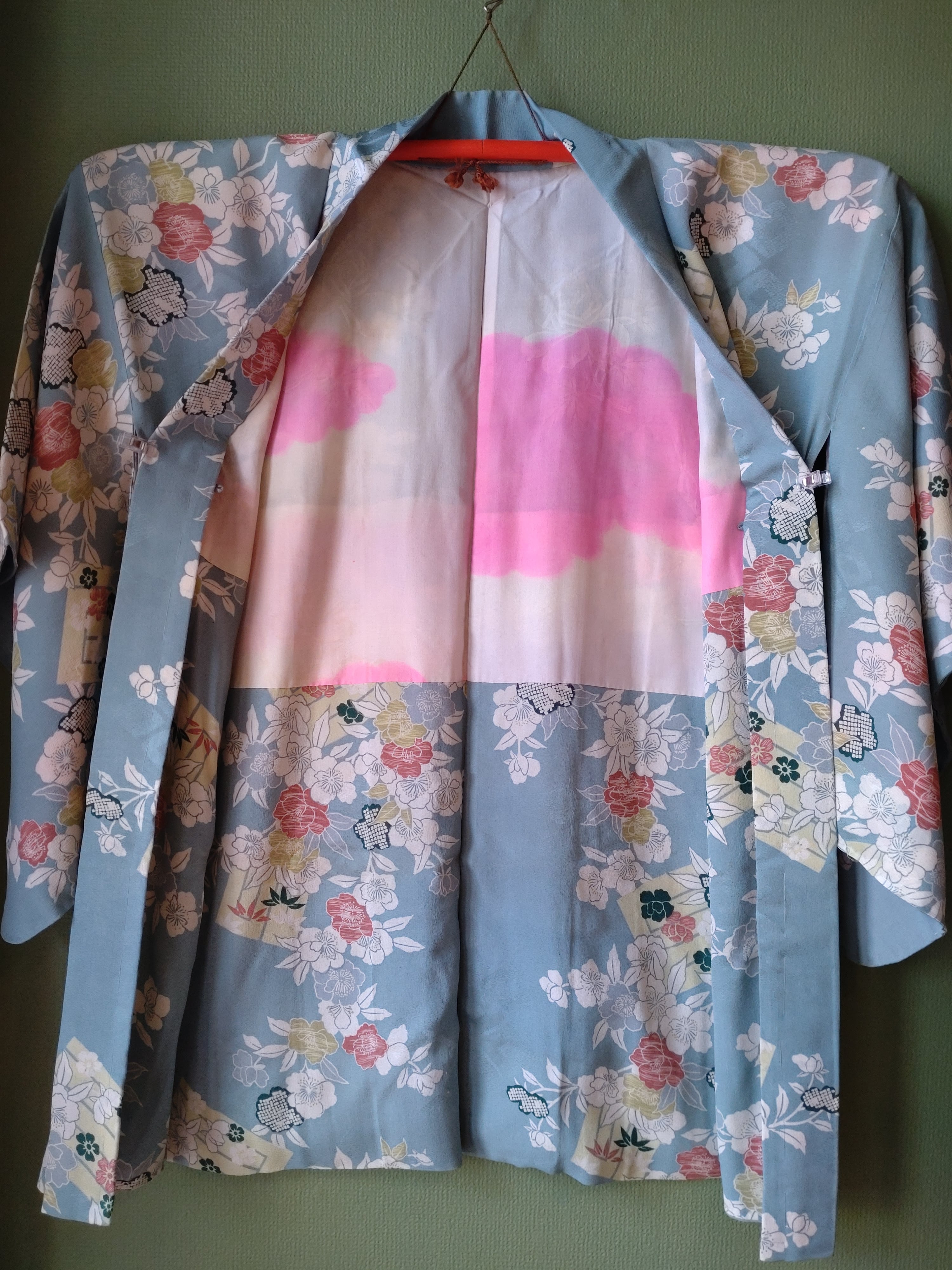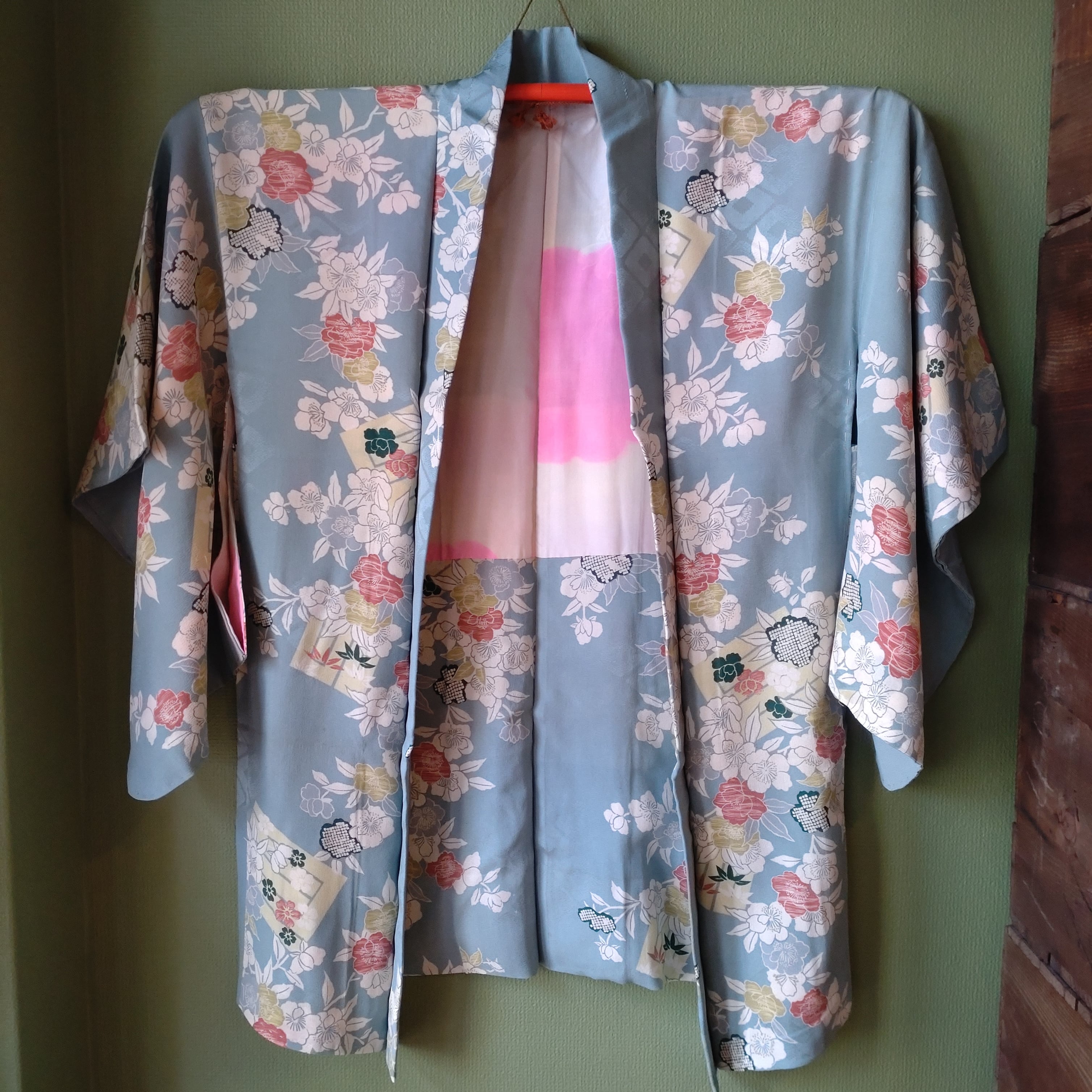 アンティークの羽織です。アンティークには珍しい落ち着いた水色、花に隠れた源氏香模様が品のある美しさです。