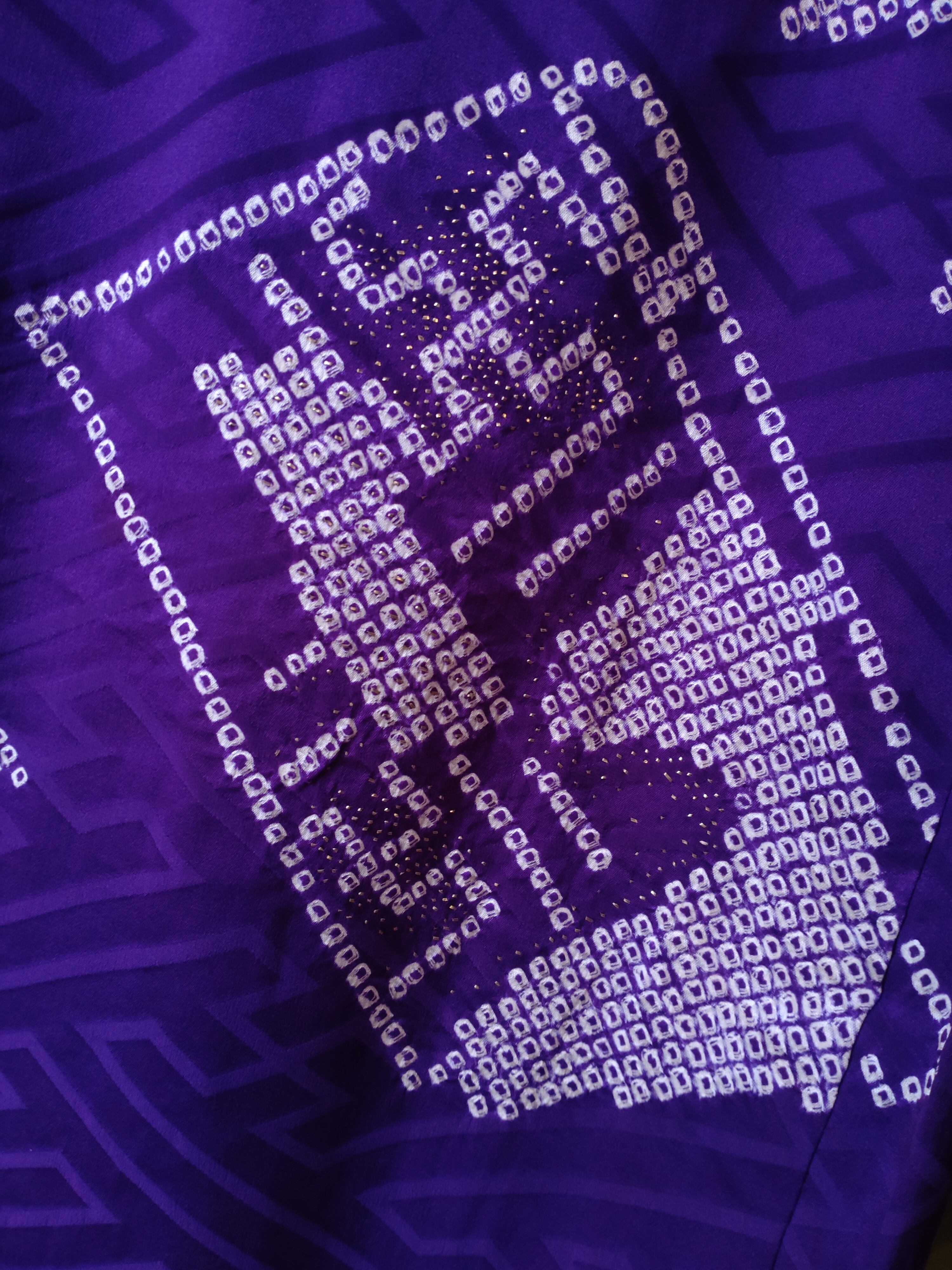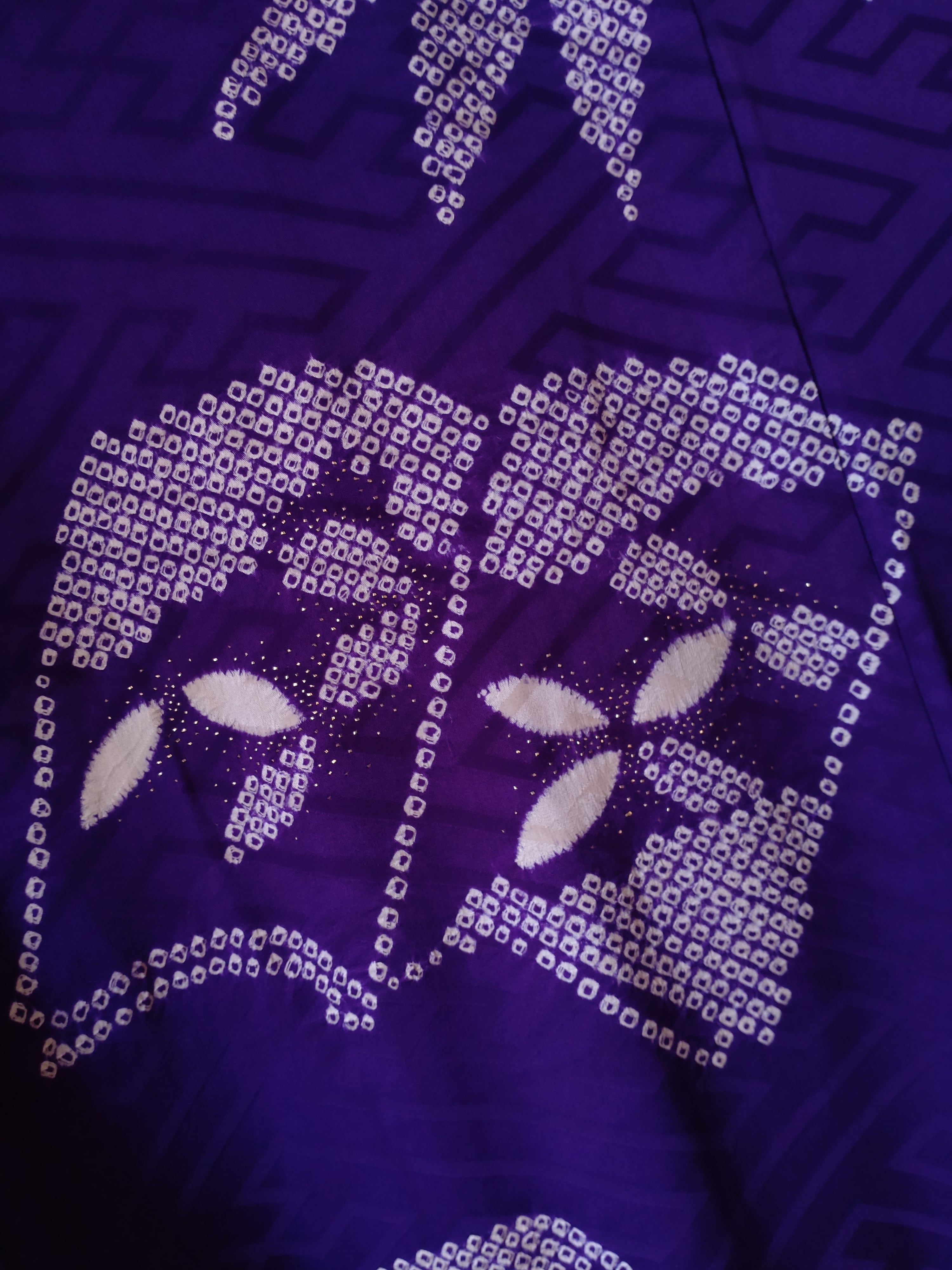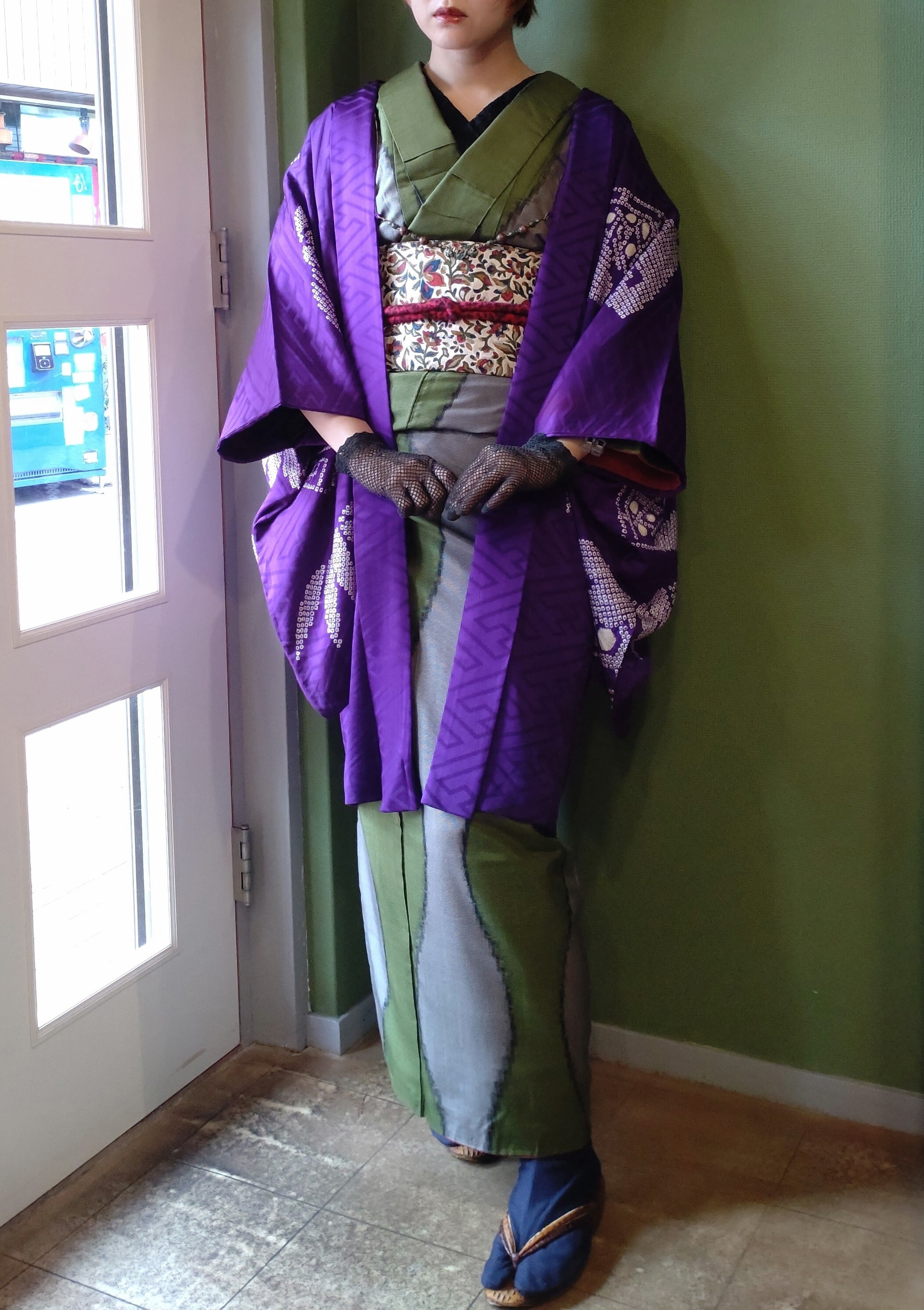 アンティークの羽織です。繻子織りのつるんとした手触りで、絞りで本が描かれています。模様の上のキラキラは貼られた箔や織りではなく、ひと針ひと針刺繍されていて手の込んだ仕立てです。