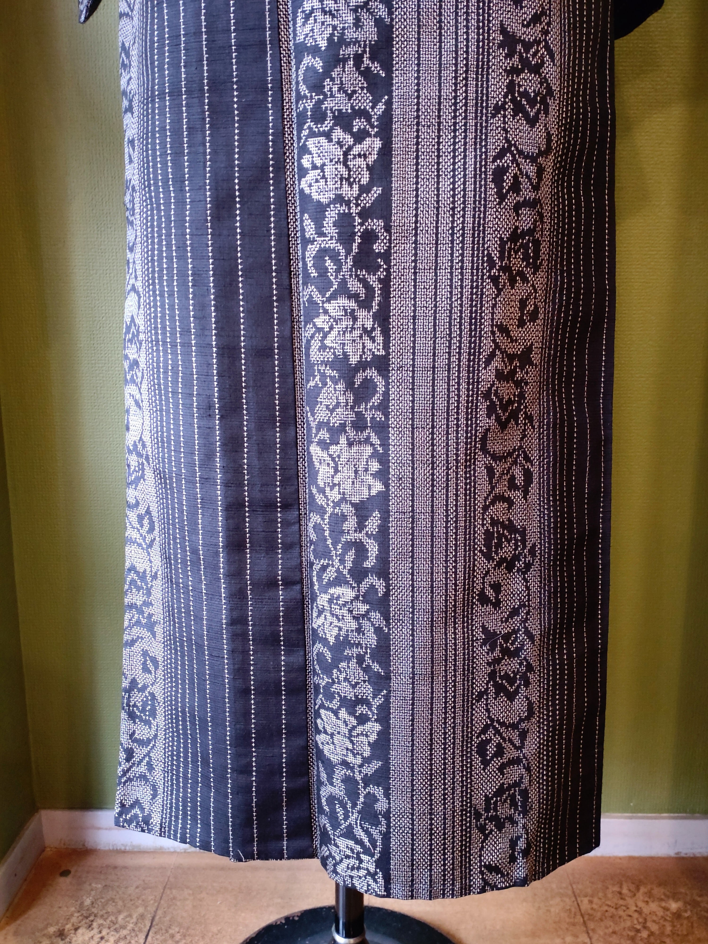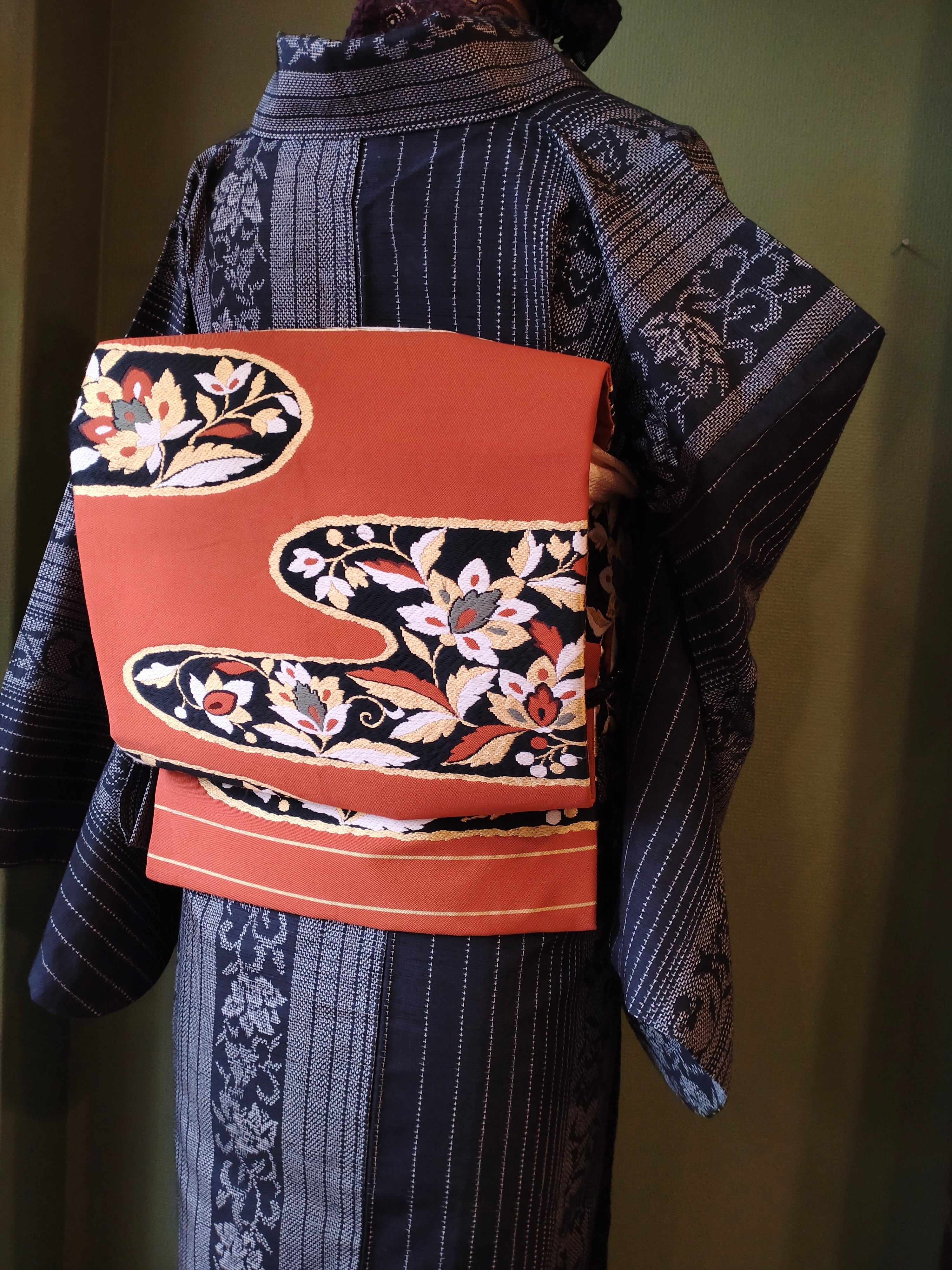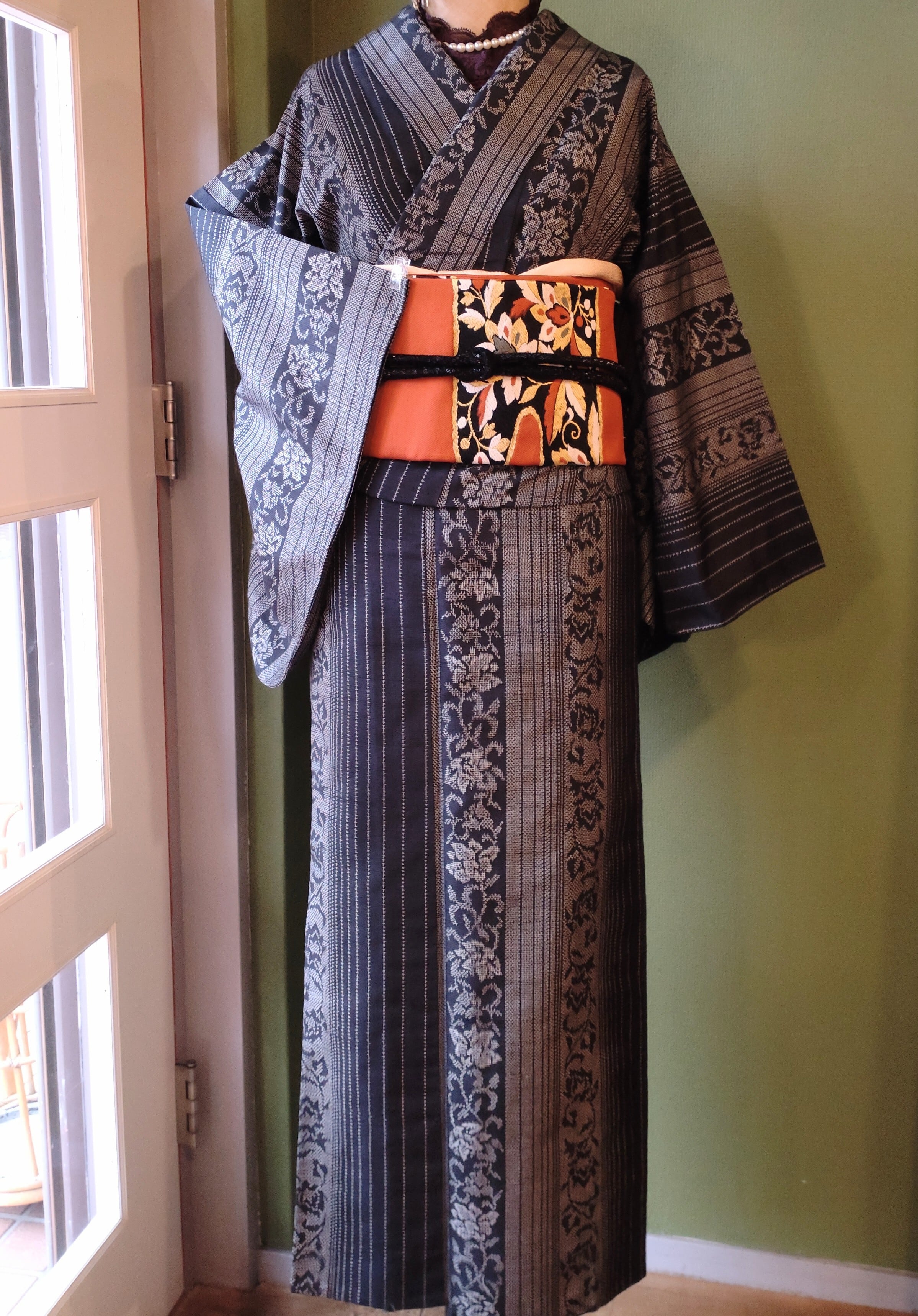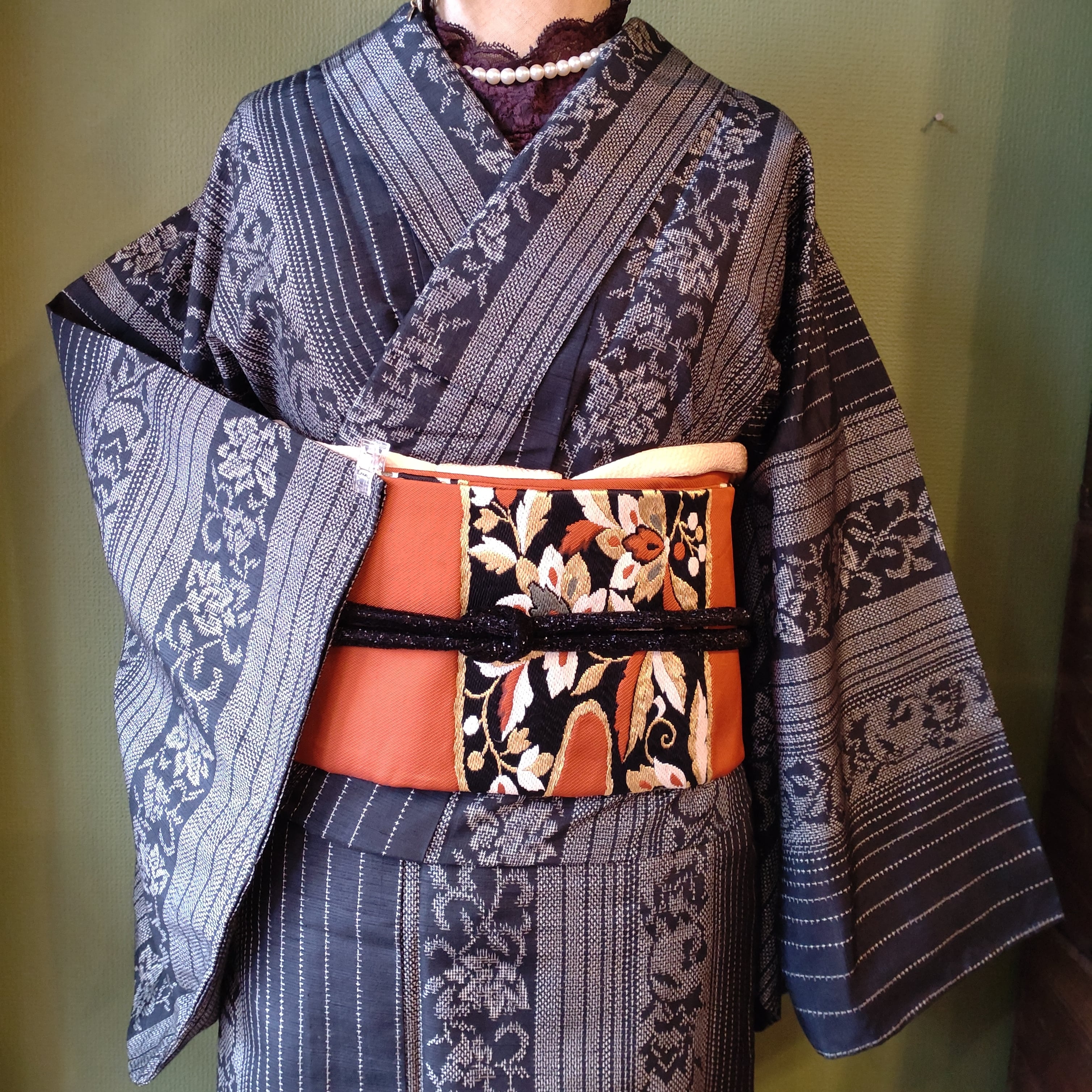 紬のカジュアルさと黒地に薔薇の絣模様で品もあるデザイン。