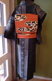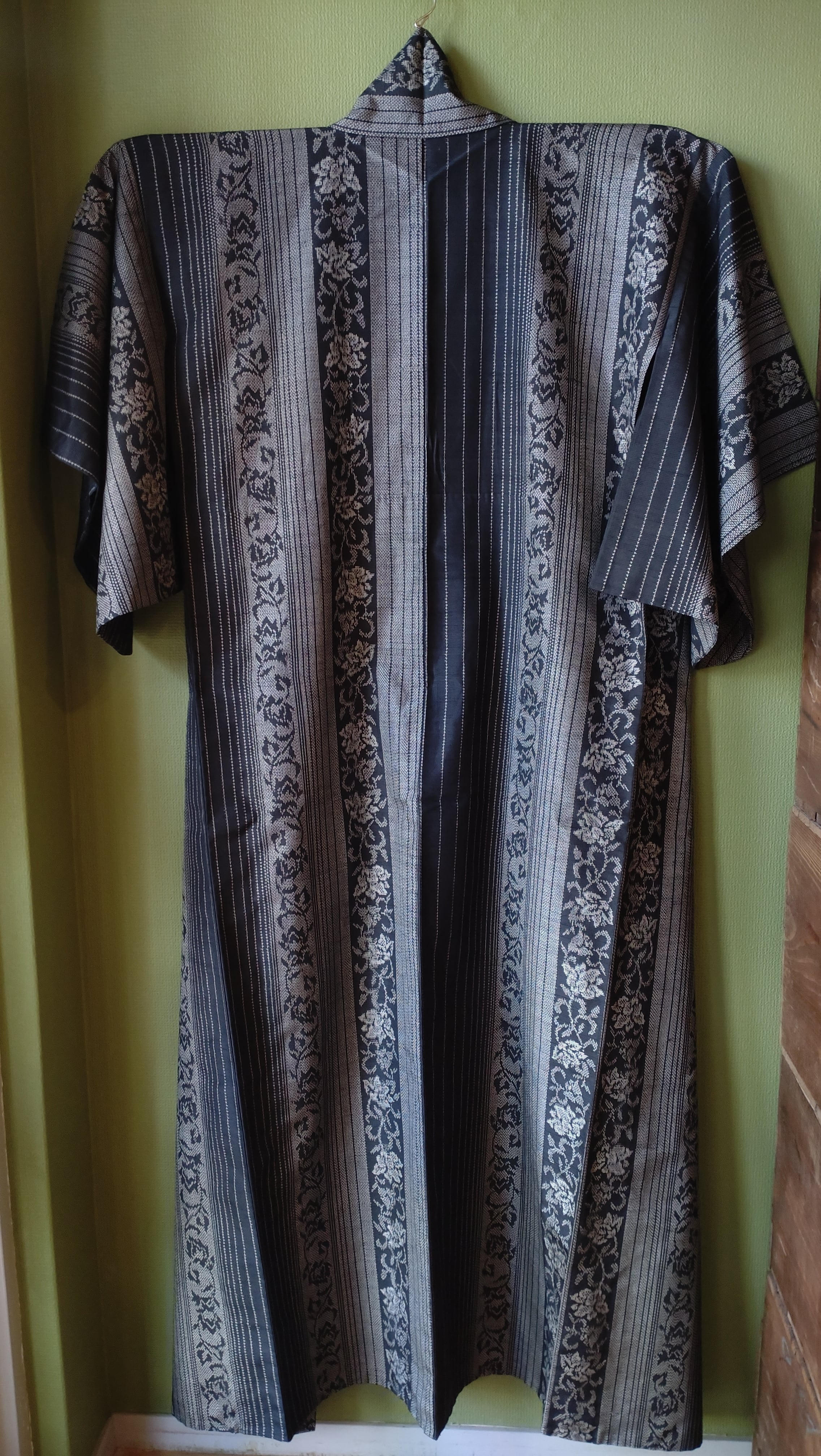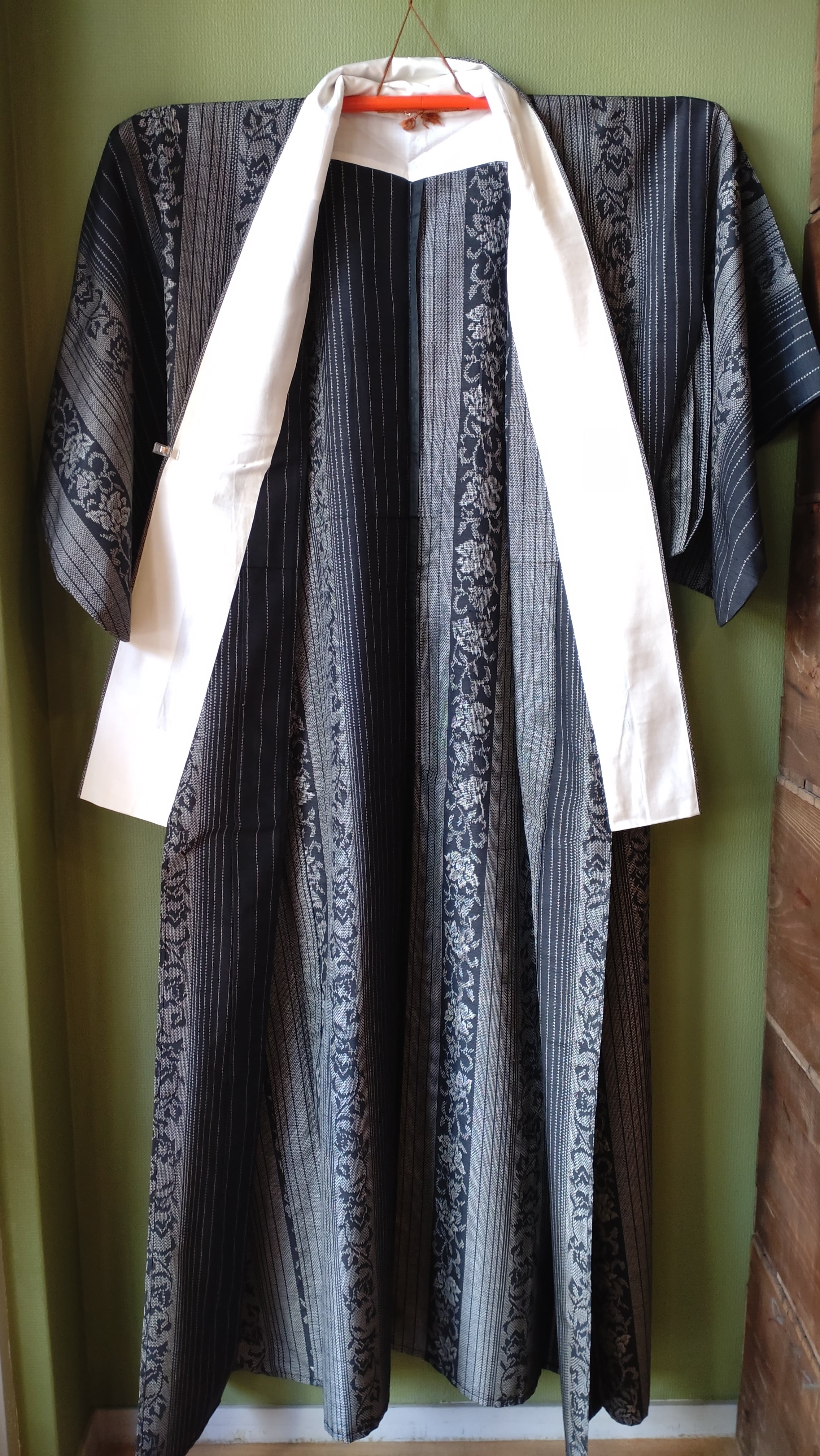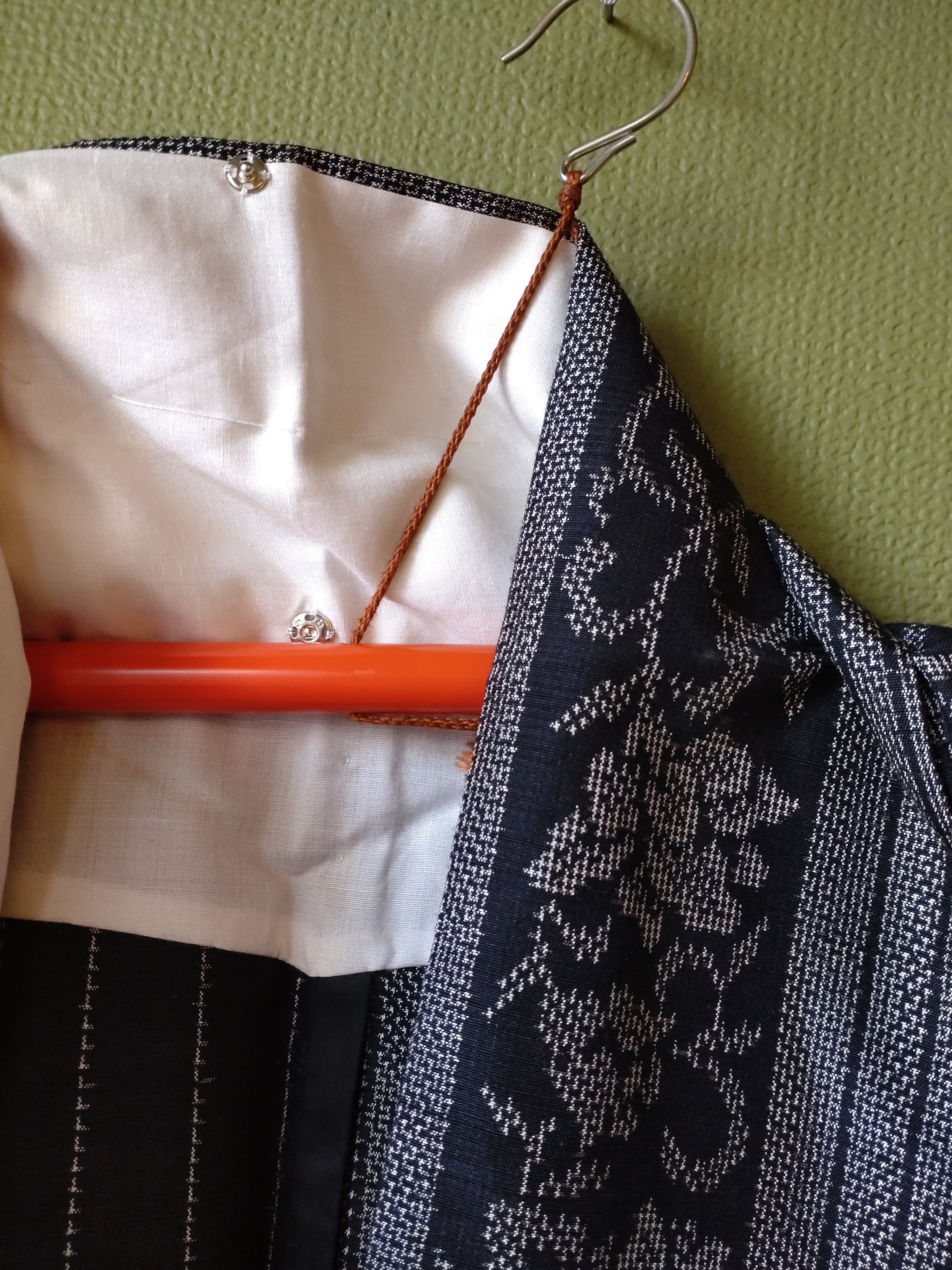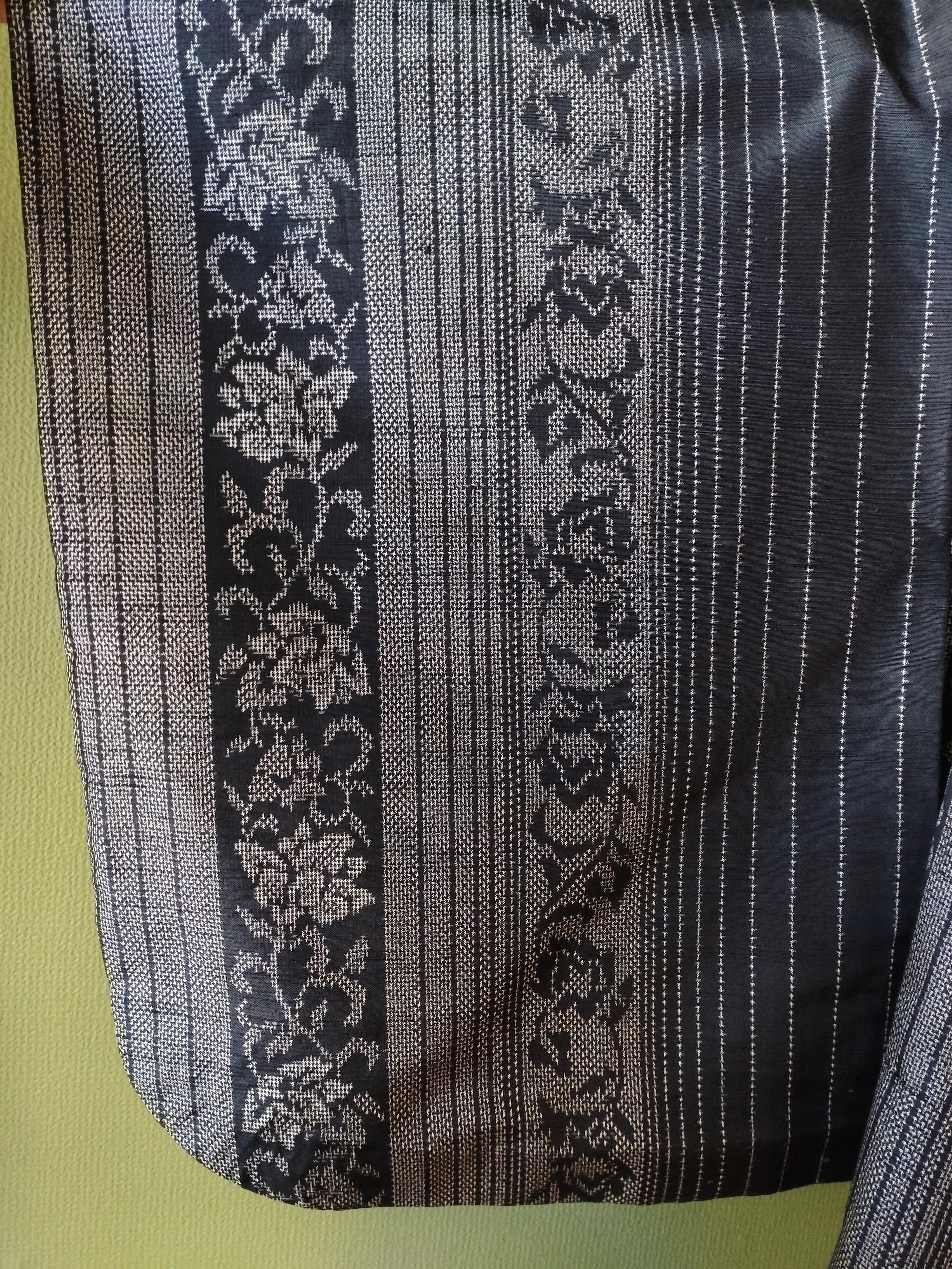 紬のカジュアルさと黒地に薔薇の絣模様で品もあるデザイン。
