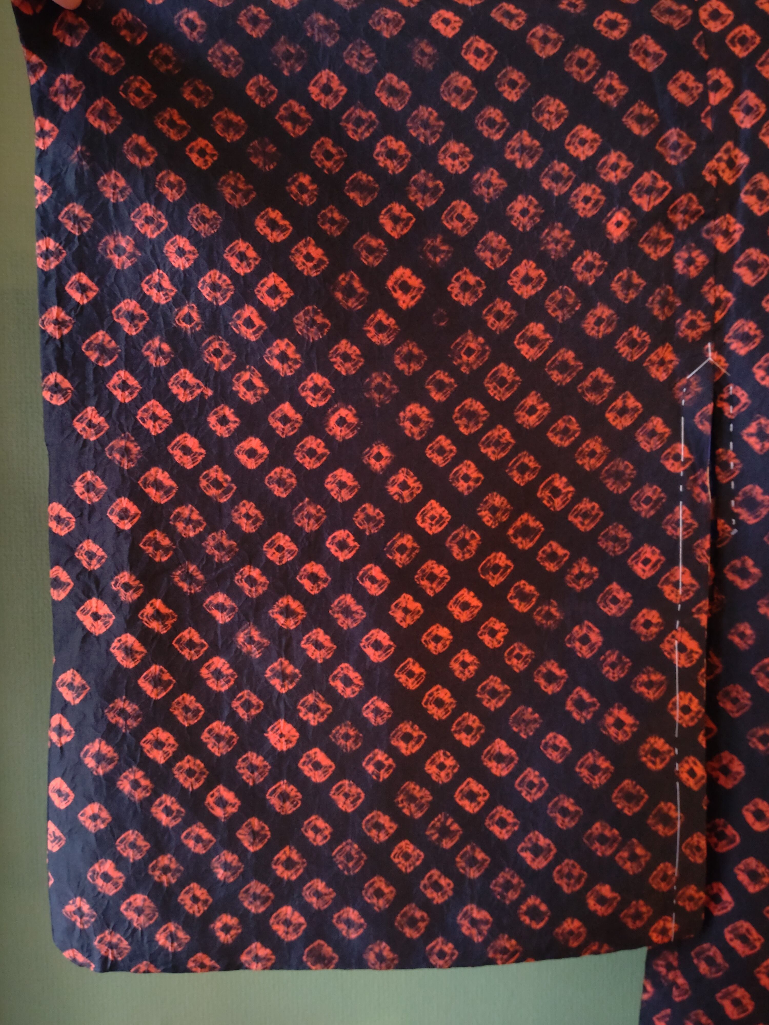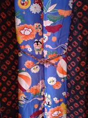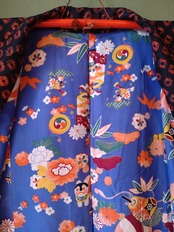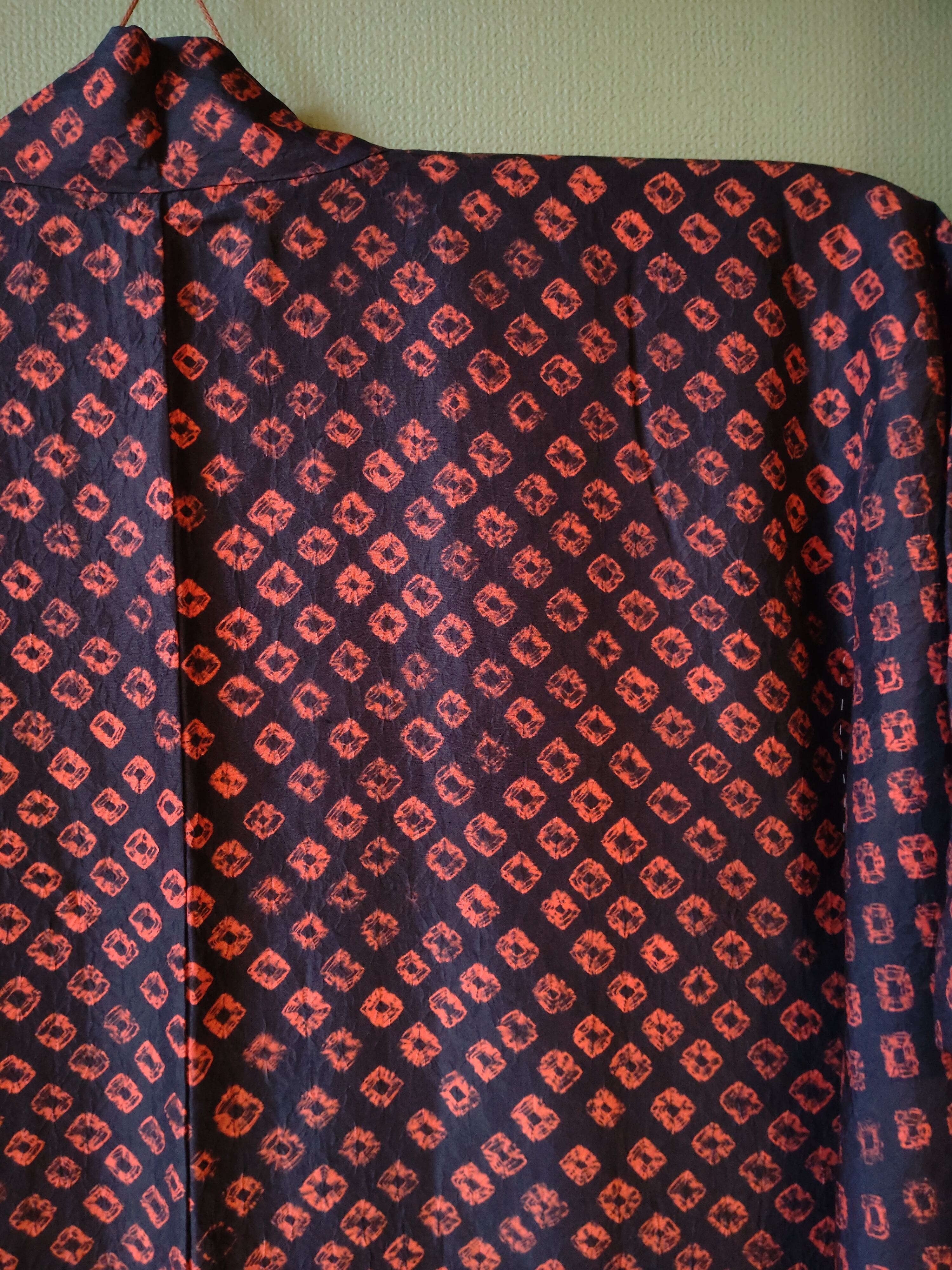 絞りのアンティークの羽織です。革の羽織紐が付いています。犬張子やでんでん太鼓など昔の玩具が描かれた真っ青の羽裏もビビッドでキュートです。