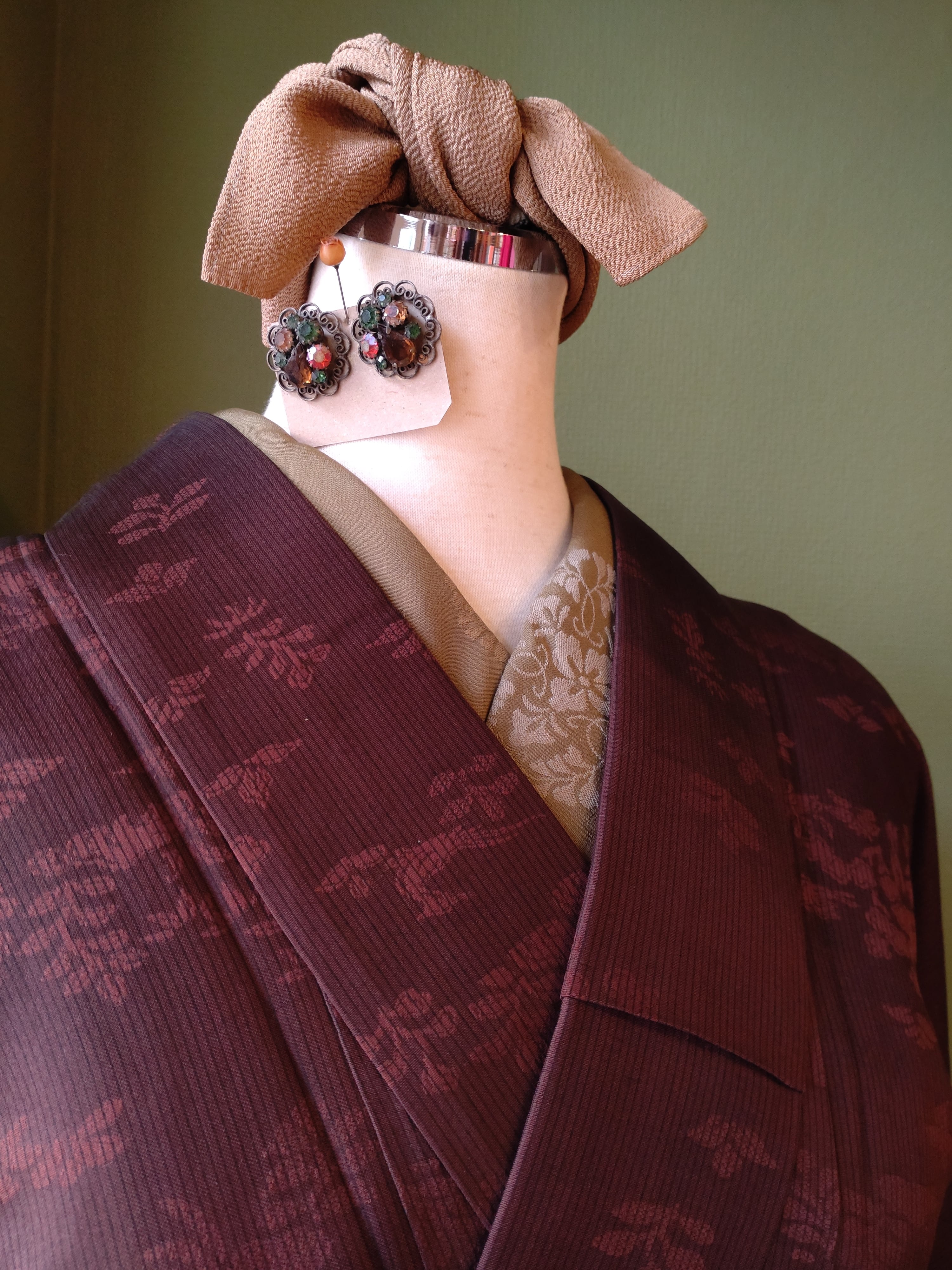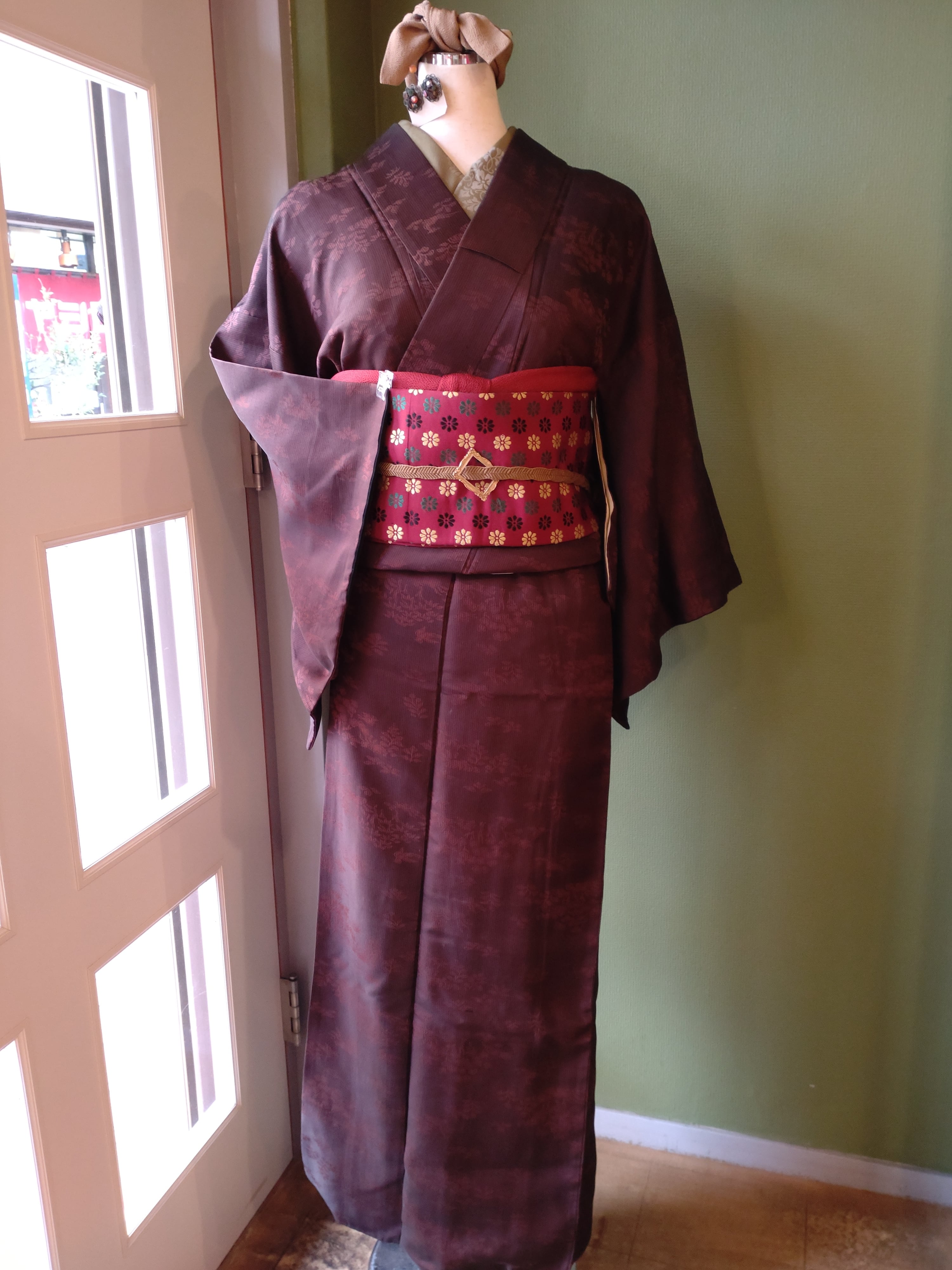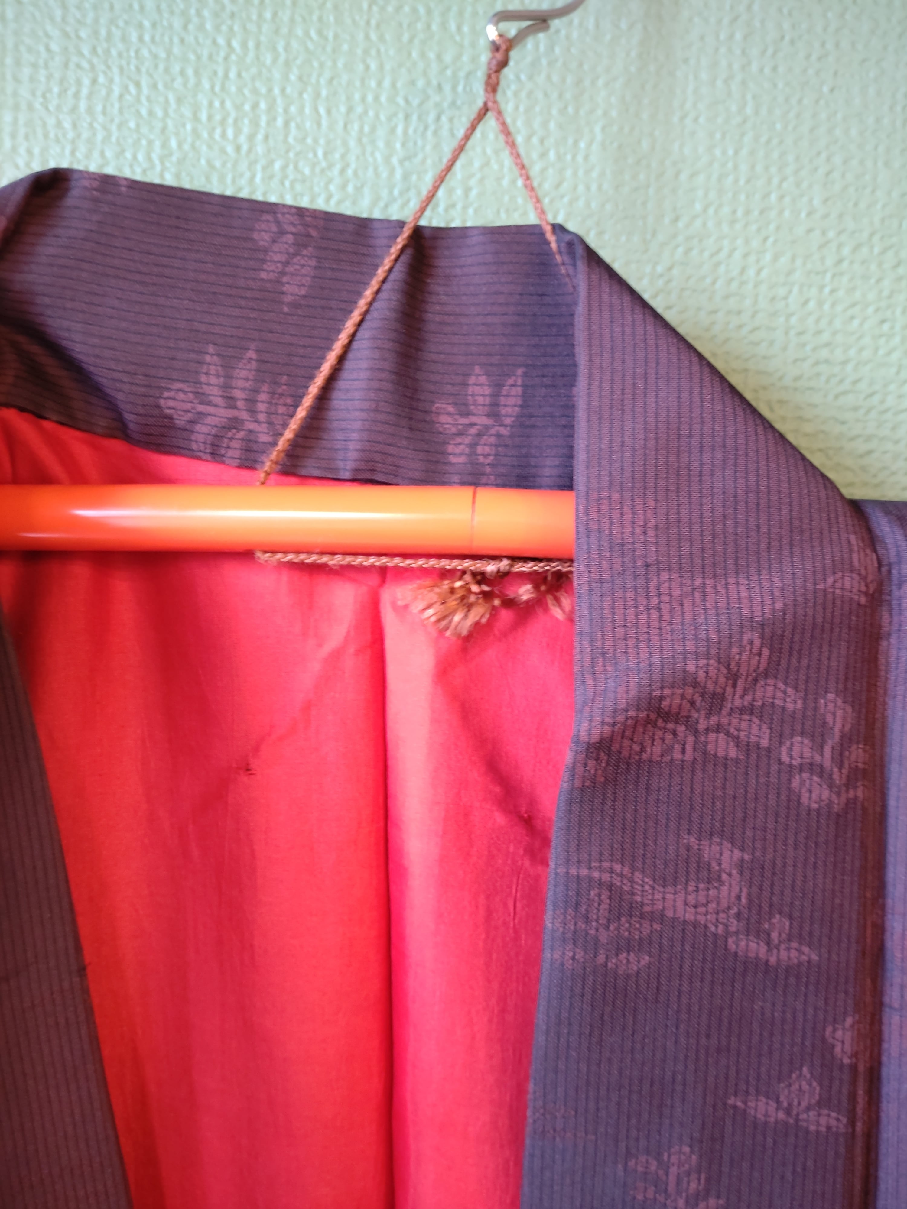 アンティークの袷着物です。落ち着いた色味によく見ると小さな鳥が。