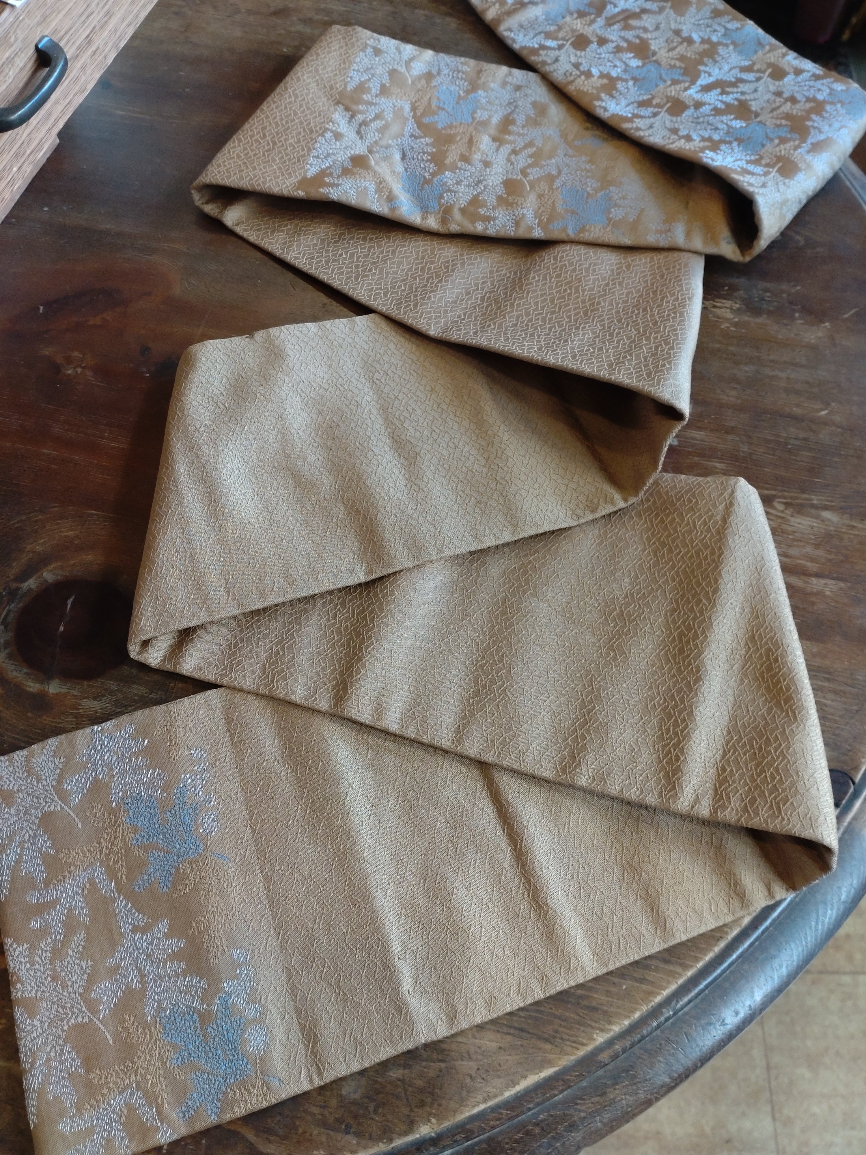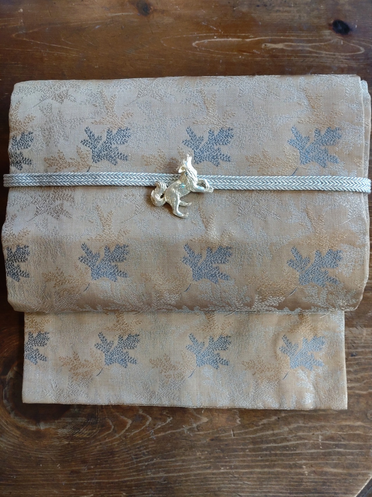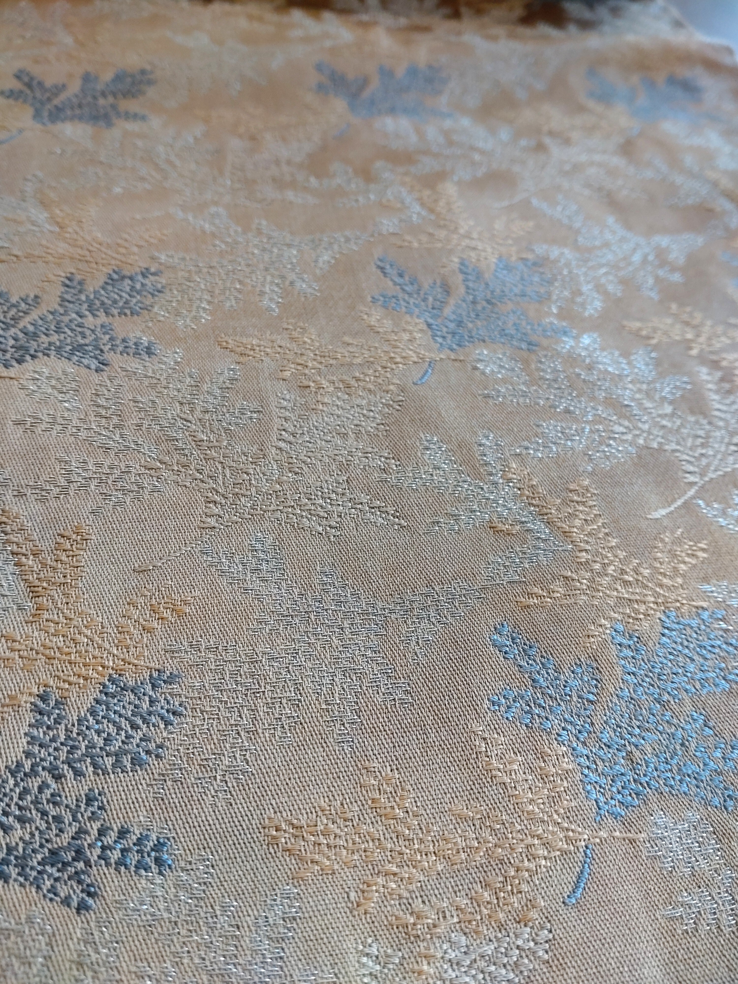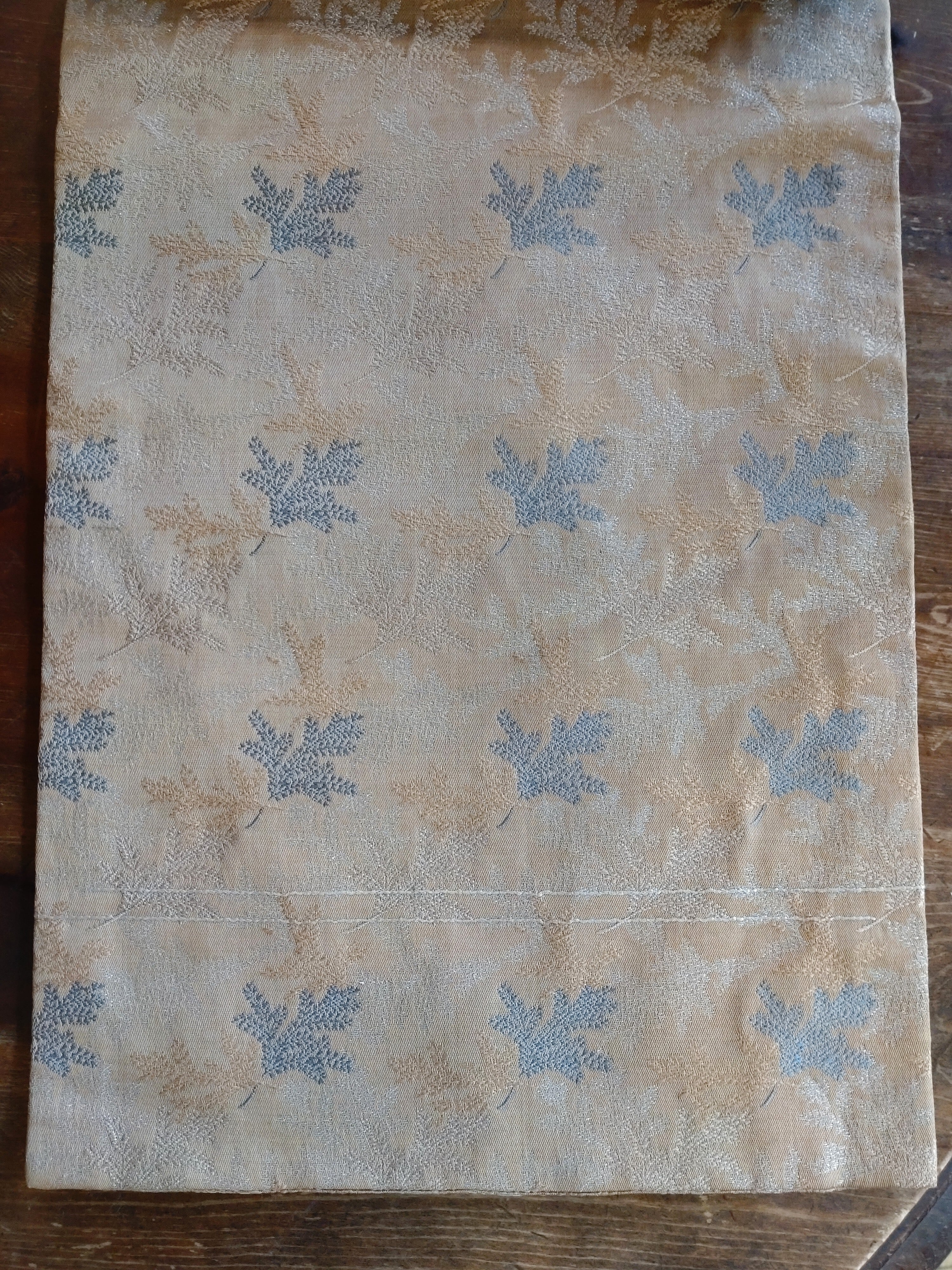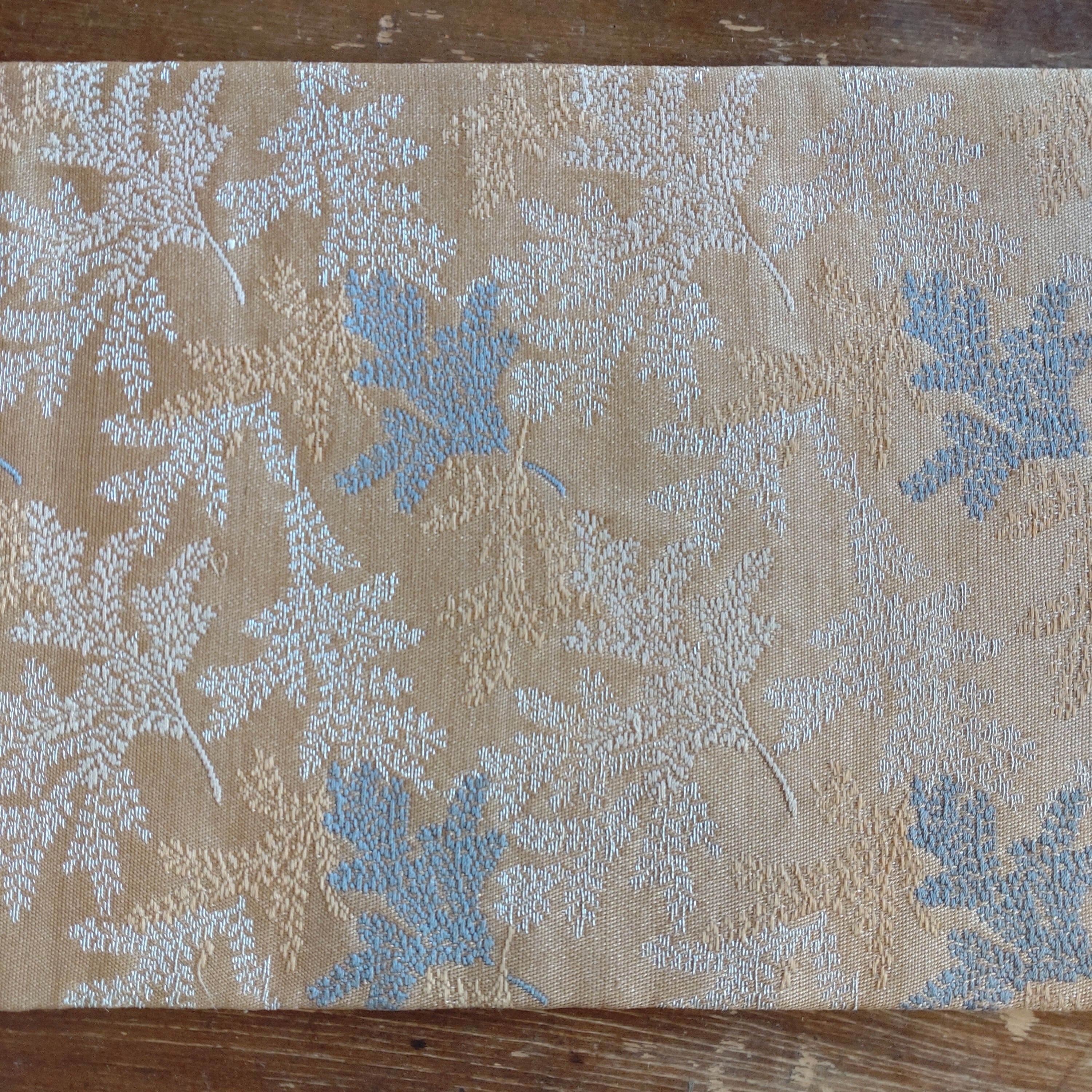ベージュ地に凍ったような白や水色の葉が冬のコーディネートにぴったり。