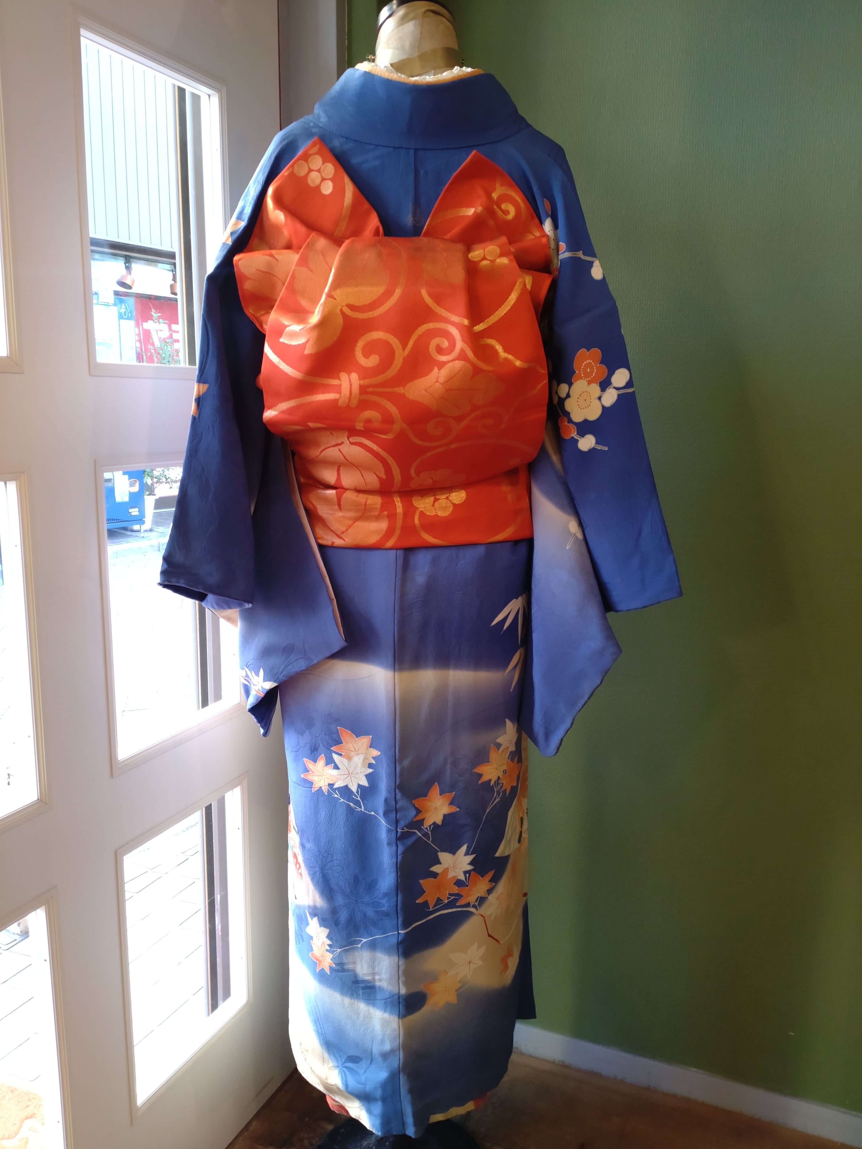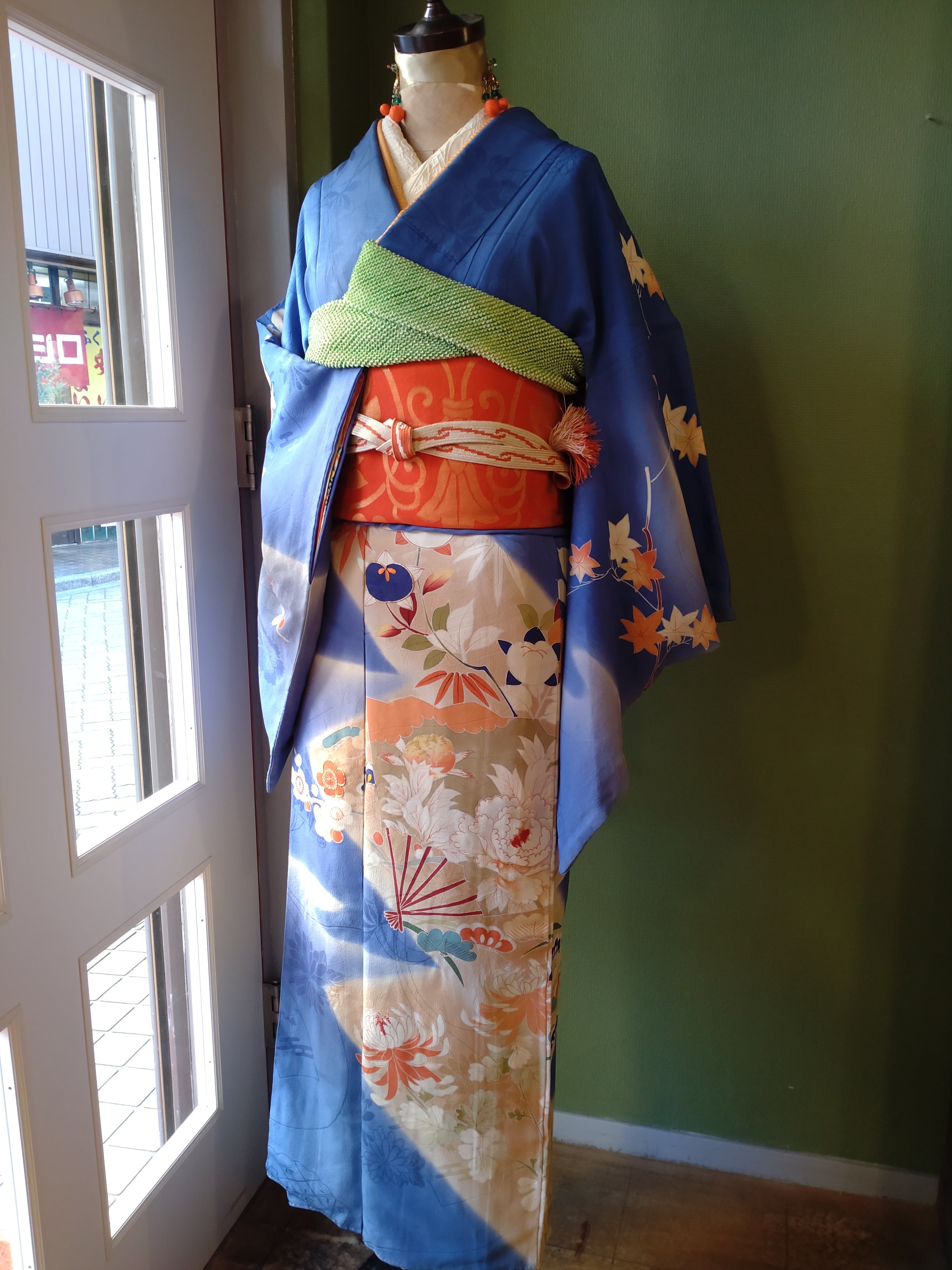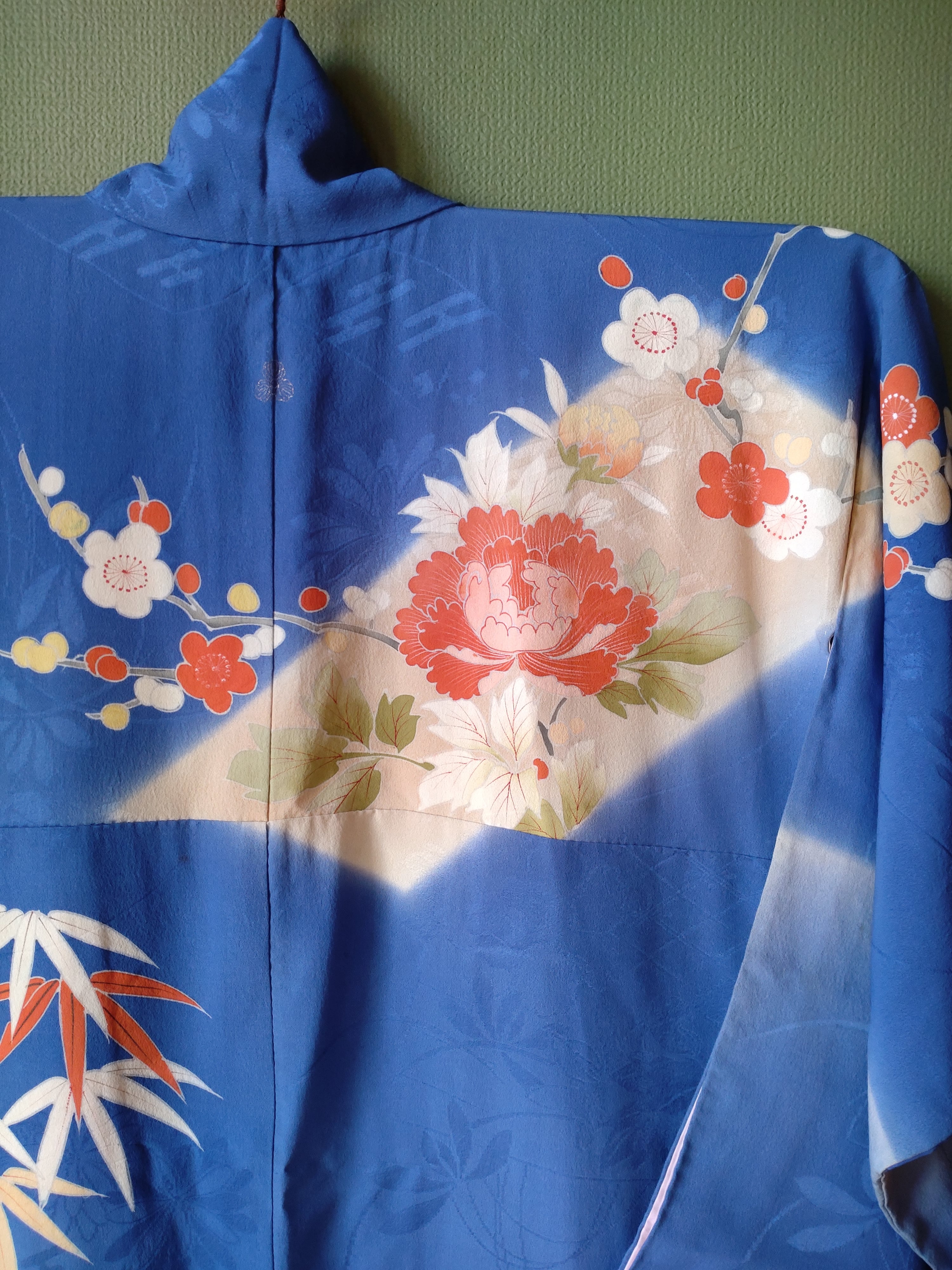 ロイヤルブルーに描かれた牡丹や橘が美しく、所々に繊細な刺繍が施されています。