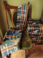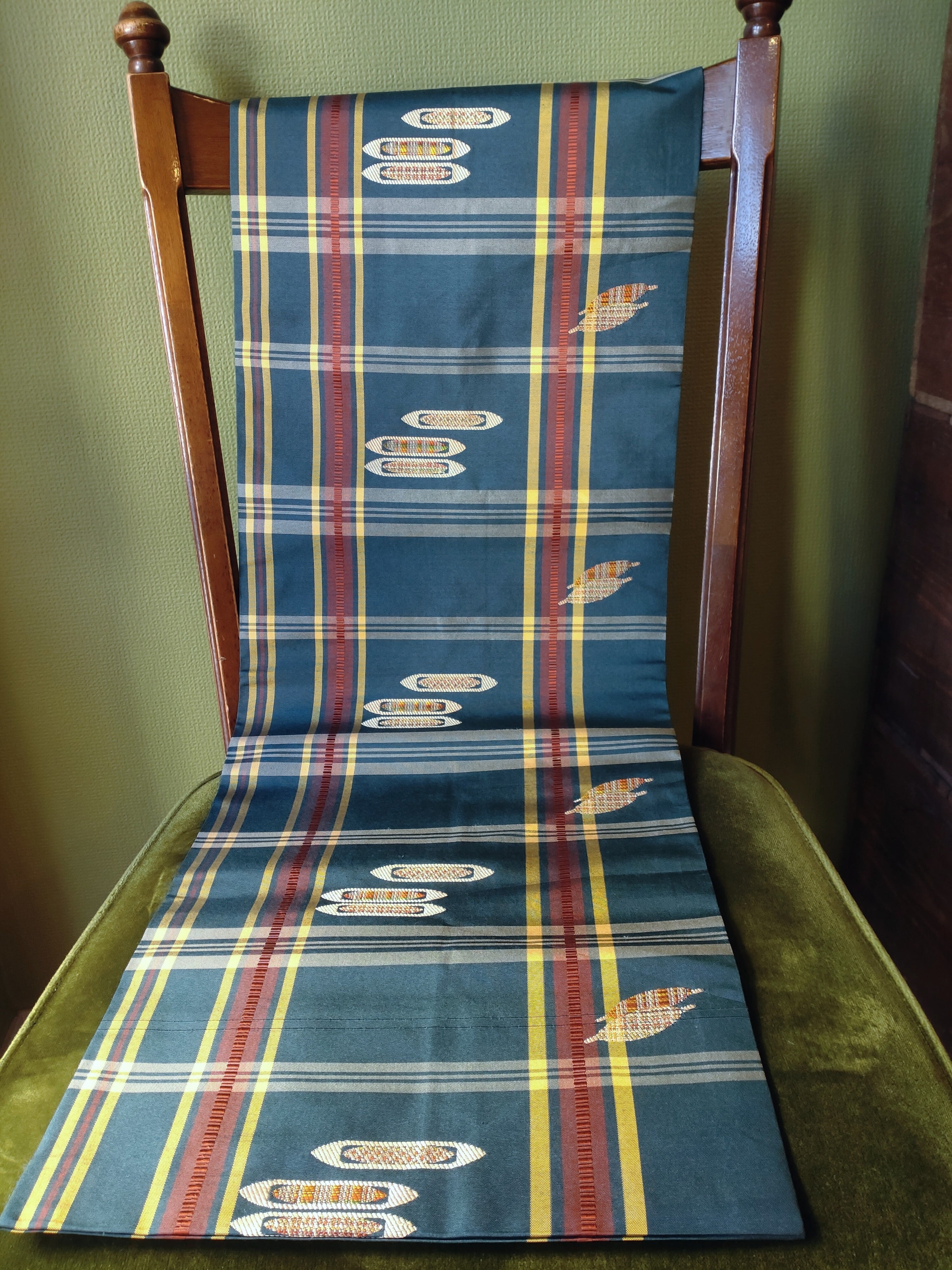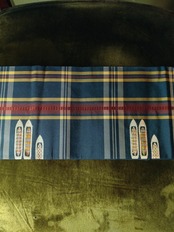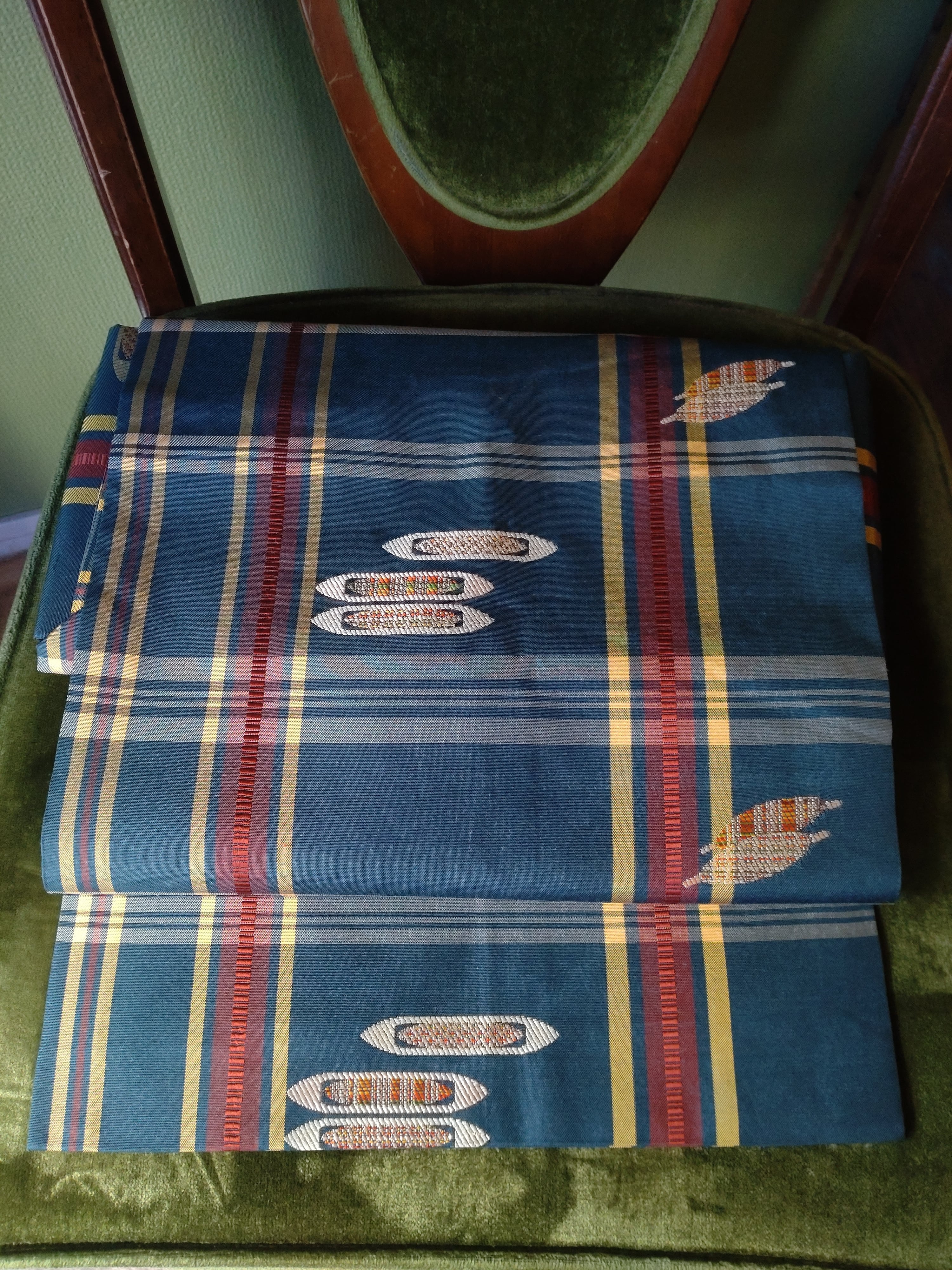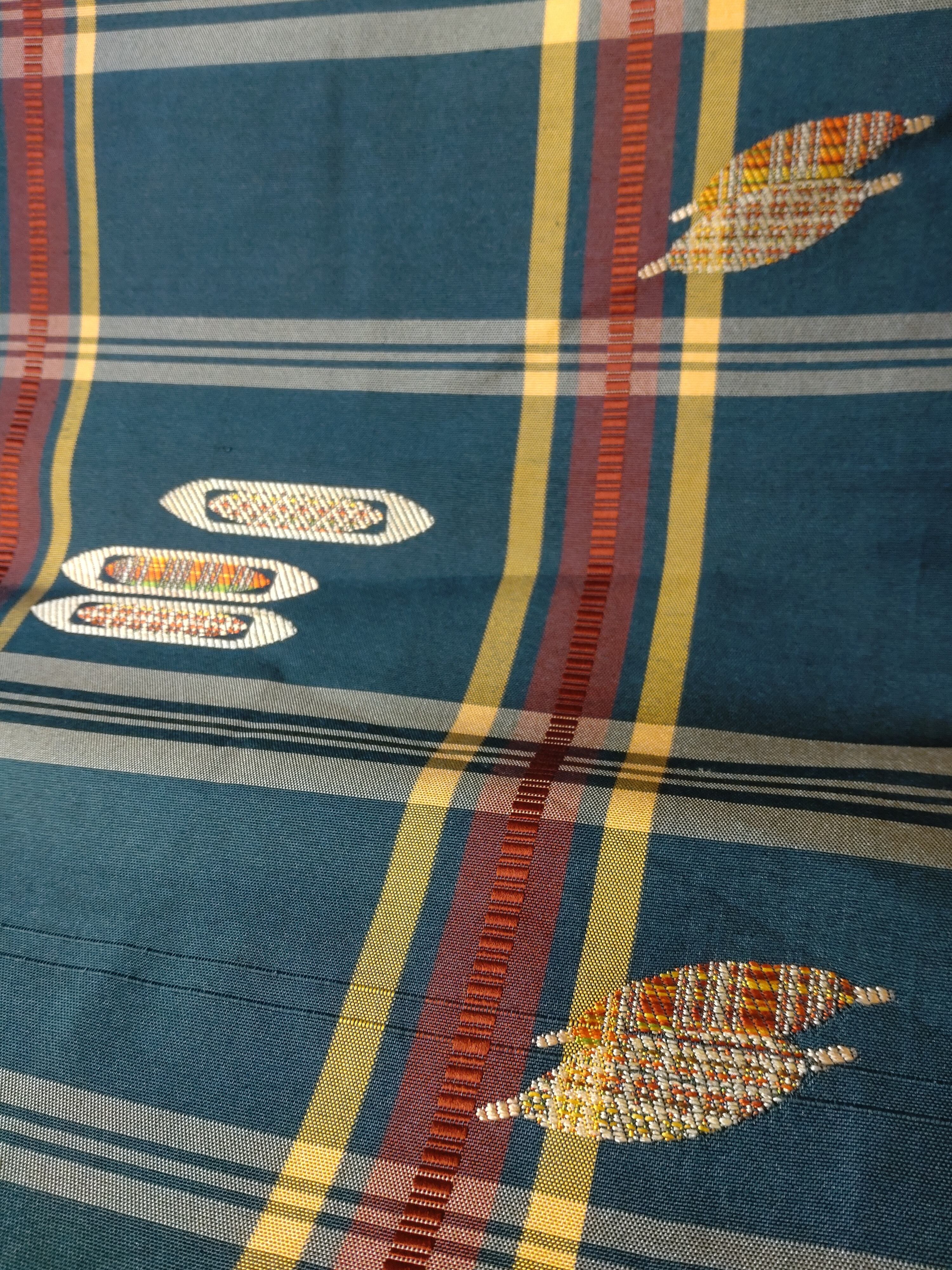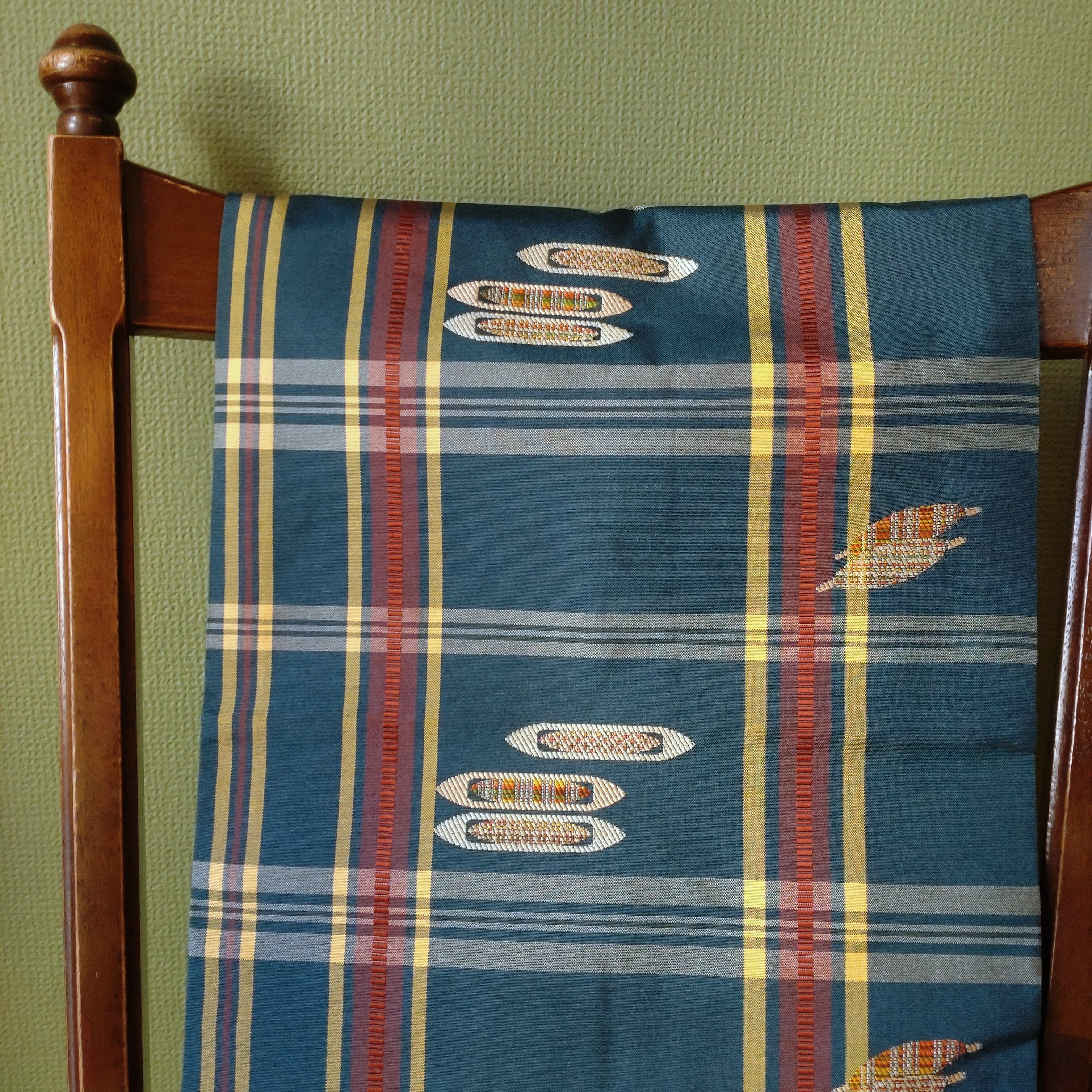 格子柄に糸巻きと杼が織られていて、織り子さんが使っていたのかしら?と思わせる遊び心のあるデザインです。