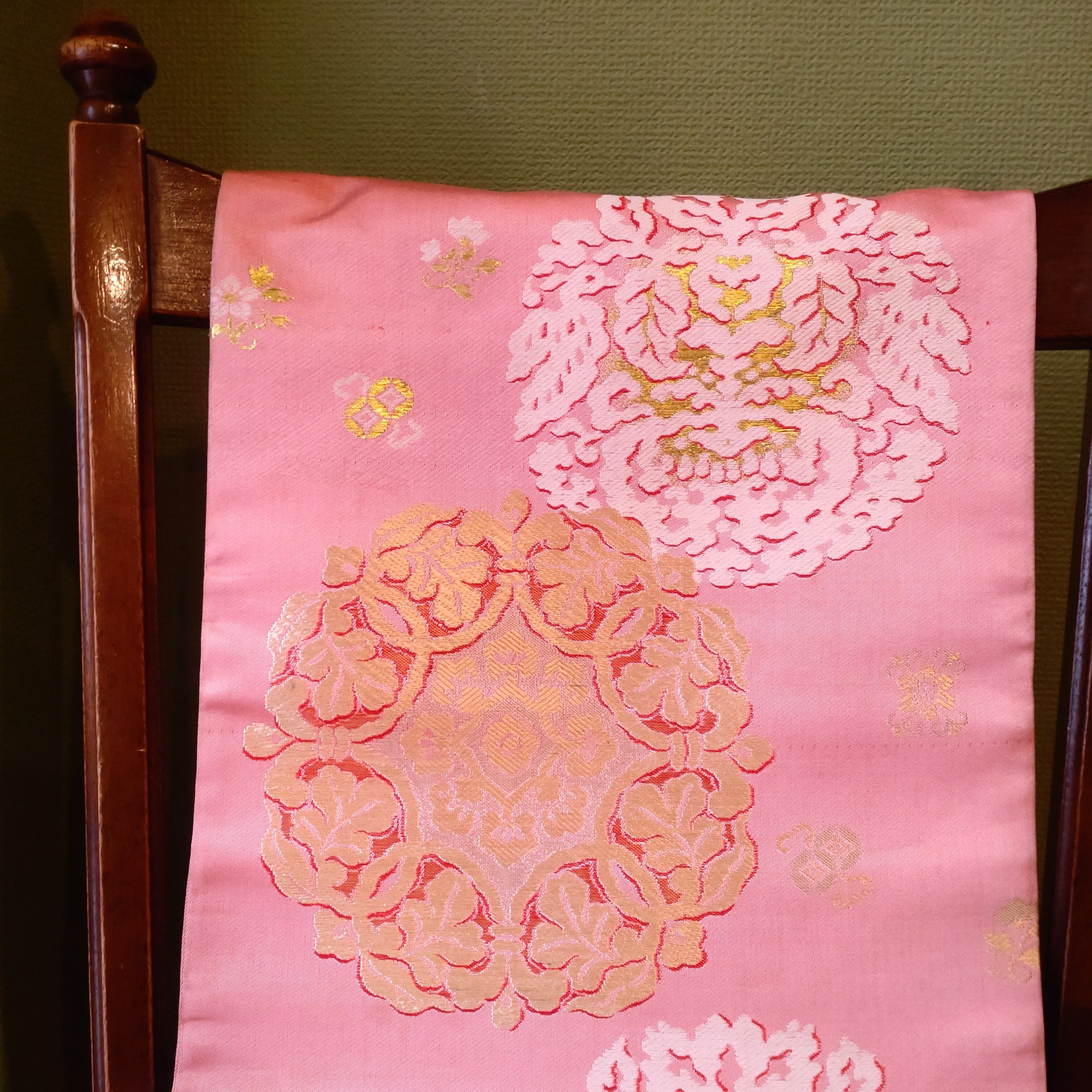 唐花文の名古屋帯です。ミルキーなピンクに浮き出るような織り模様が華やか。