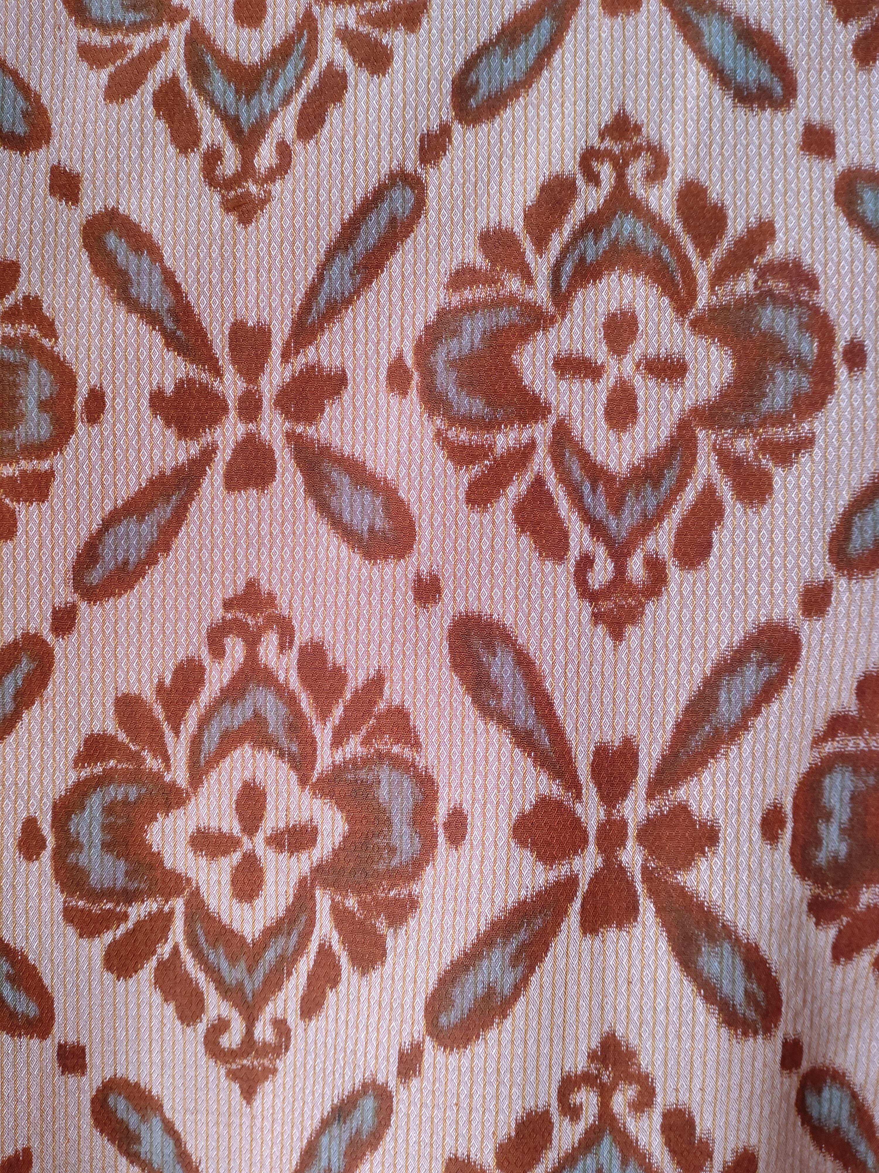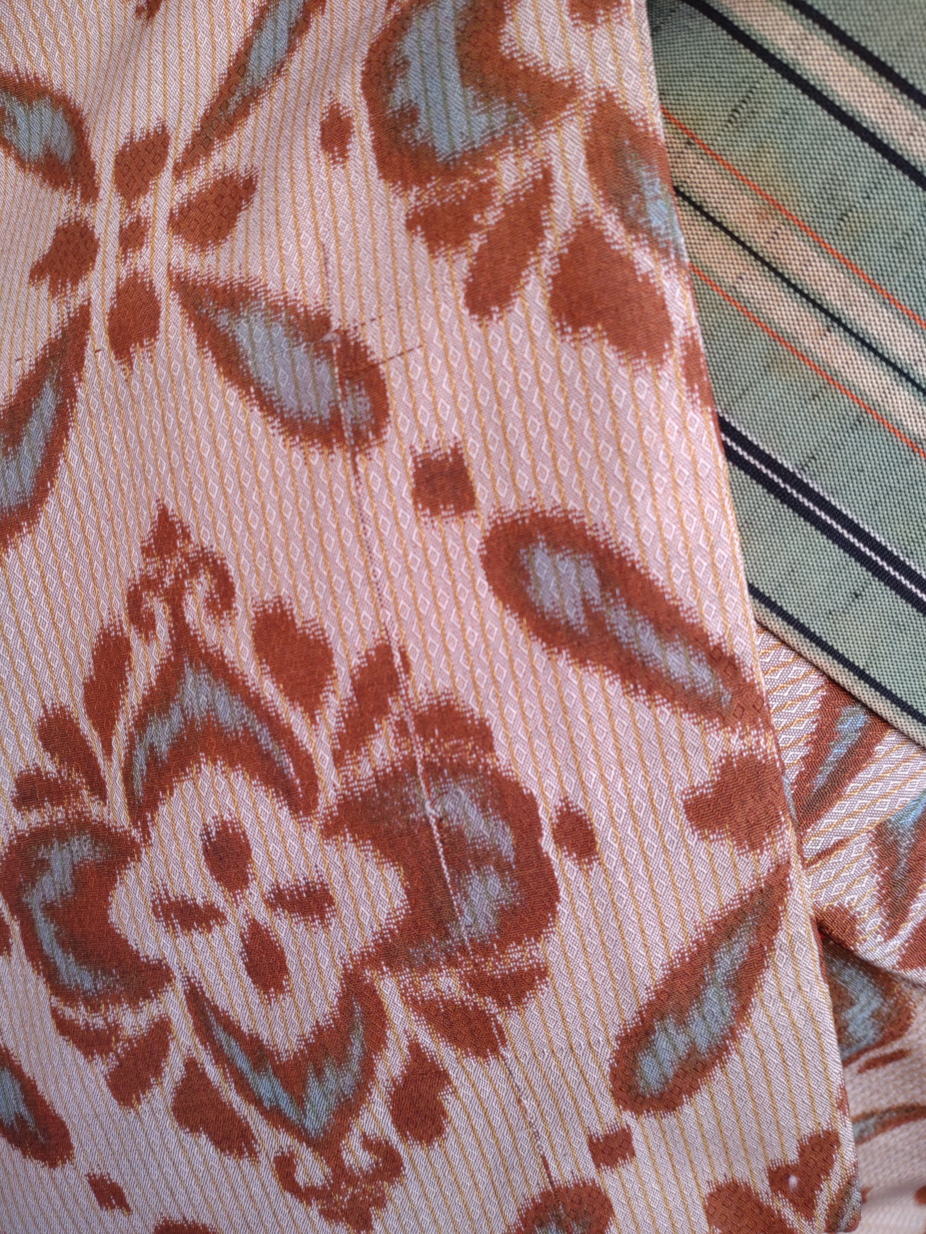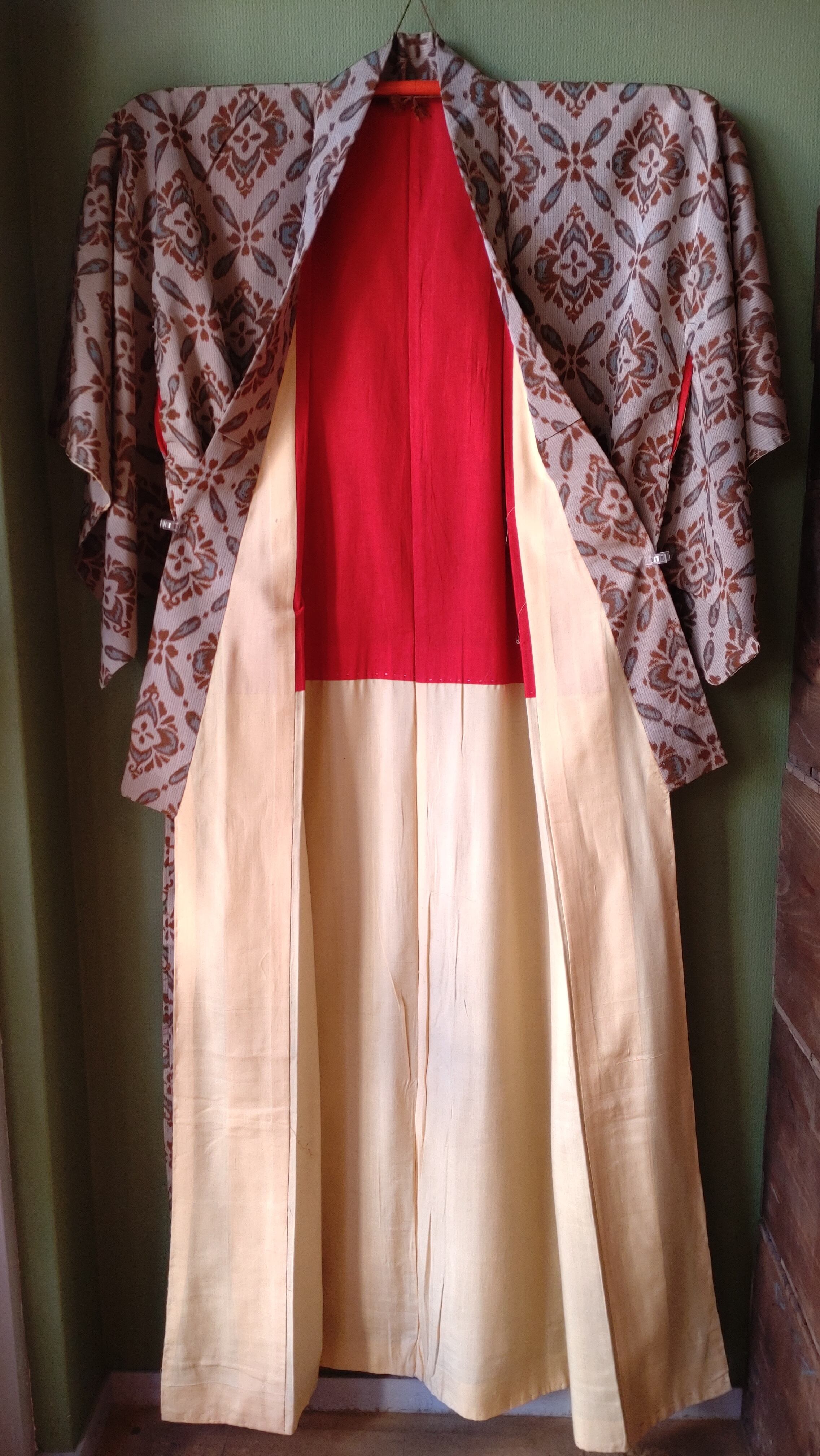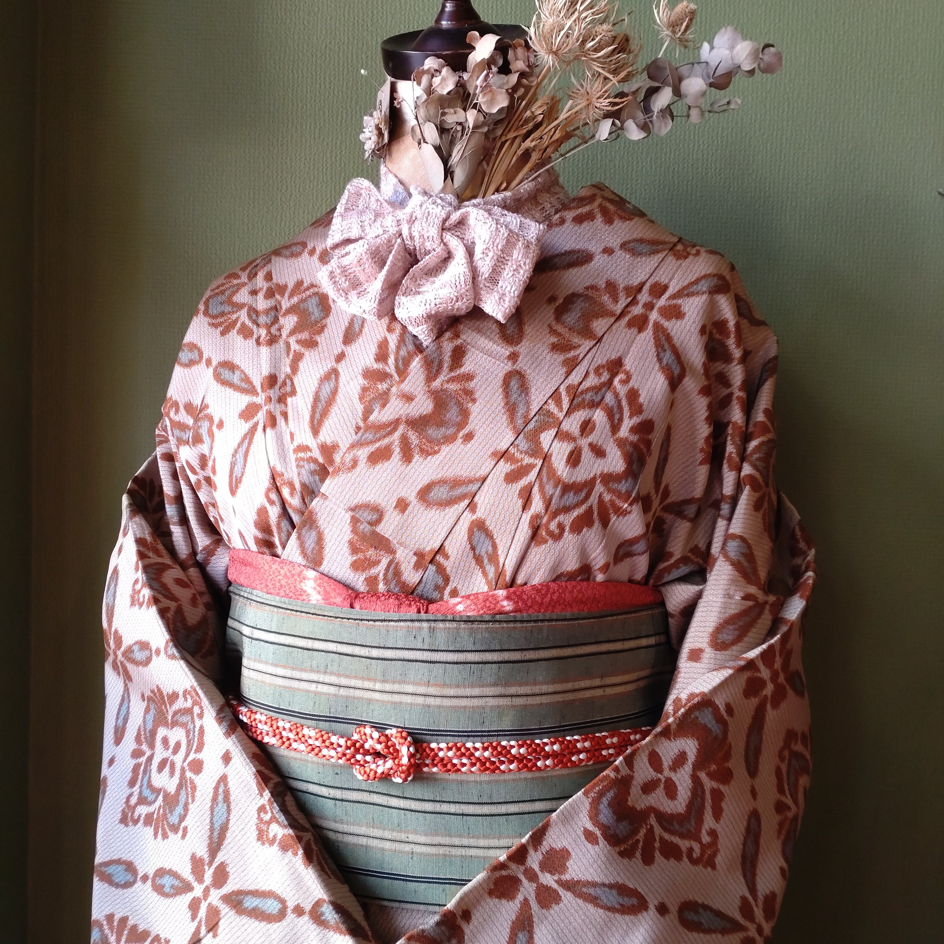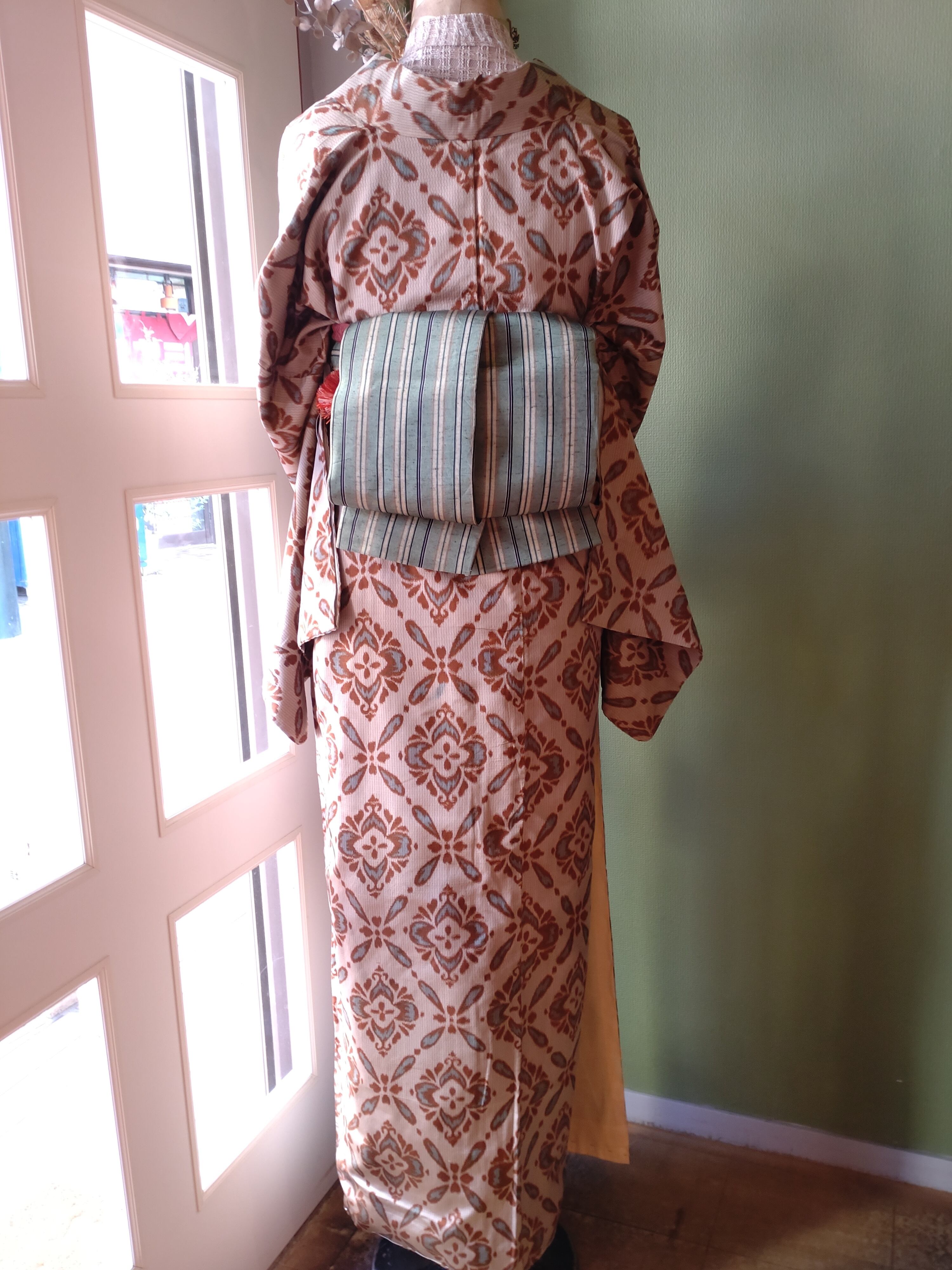 銘仙の袷着物です。ベージュとくすみブルーの落ち着いた色合いに洋風なパターン。アンティークのわりにサイズ大きめなのも嬉しいポイントです。