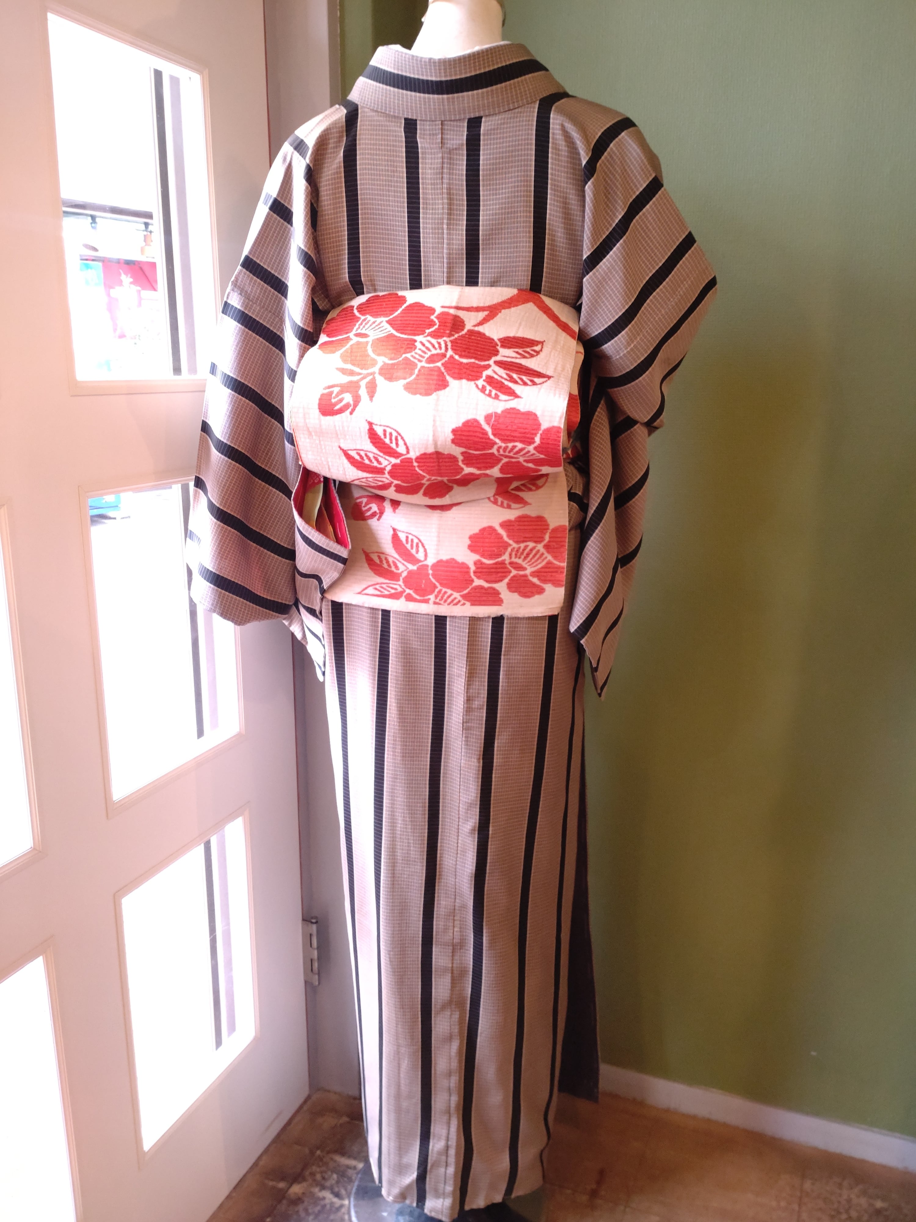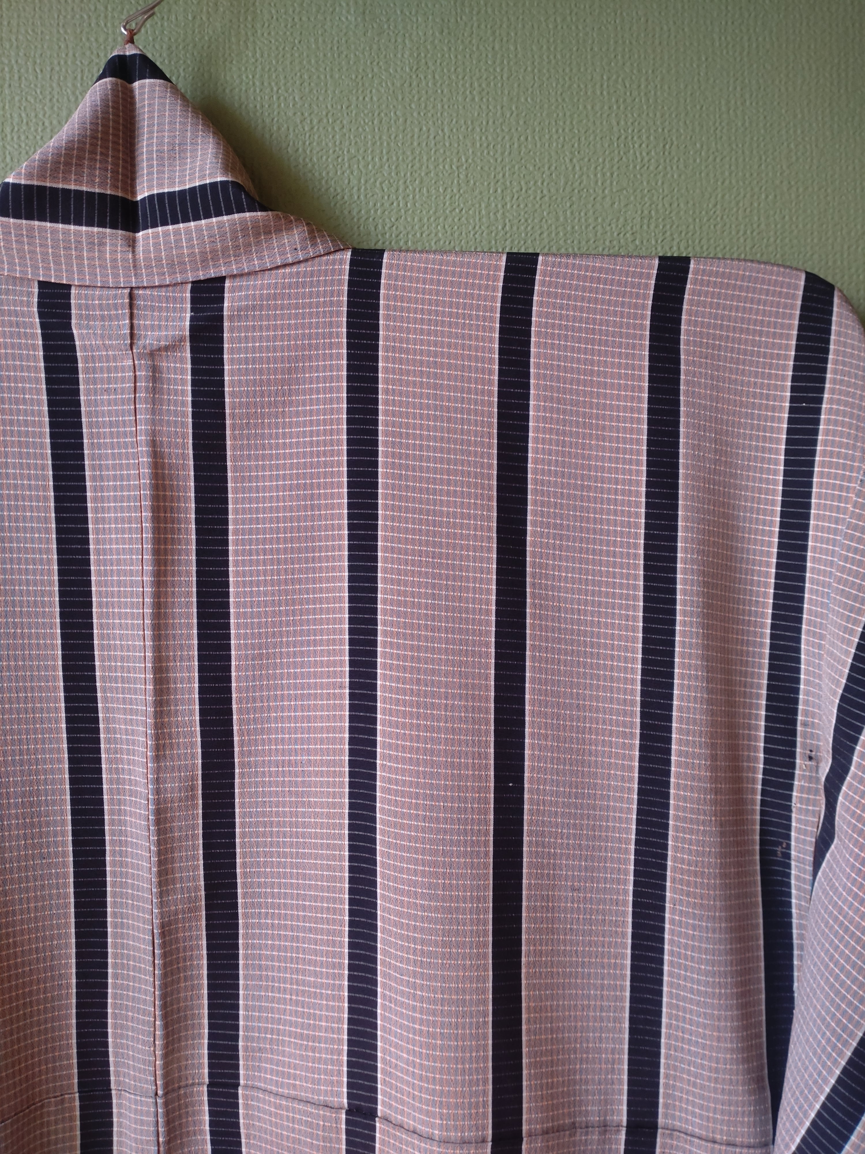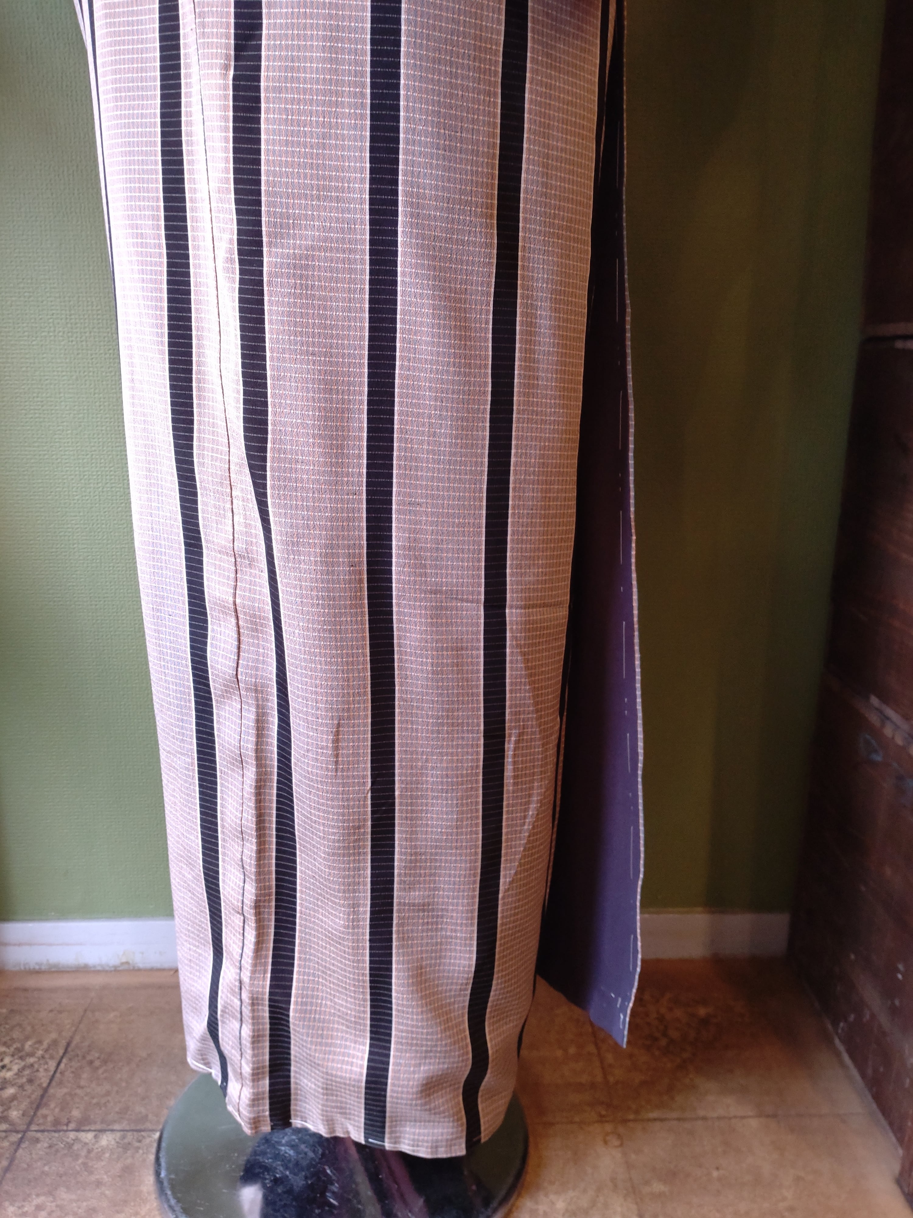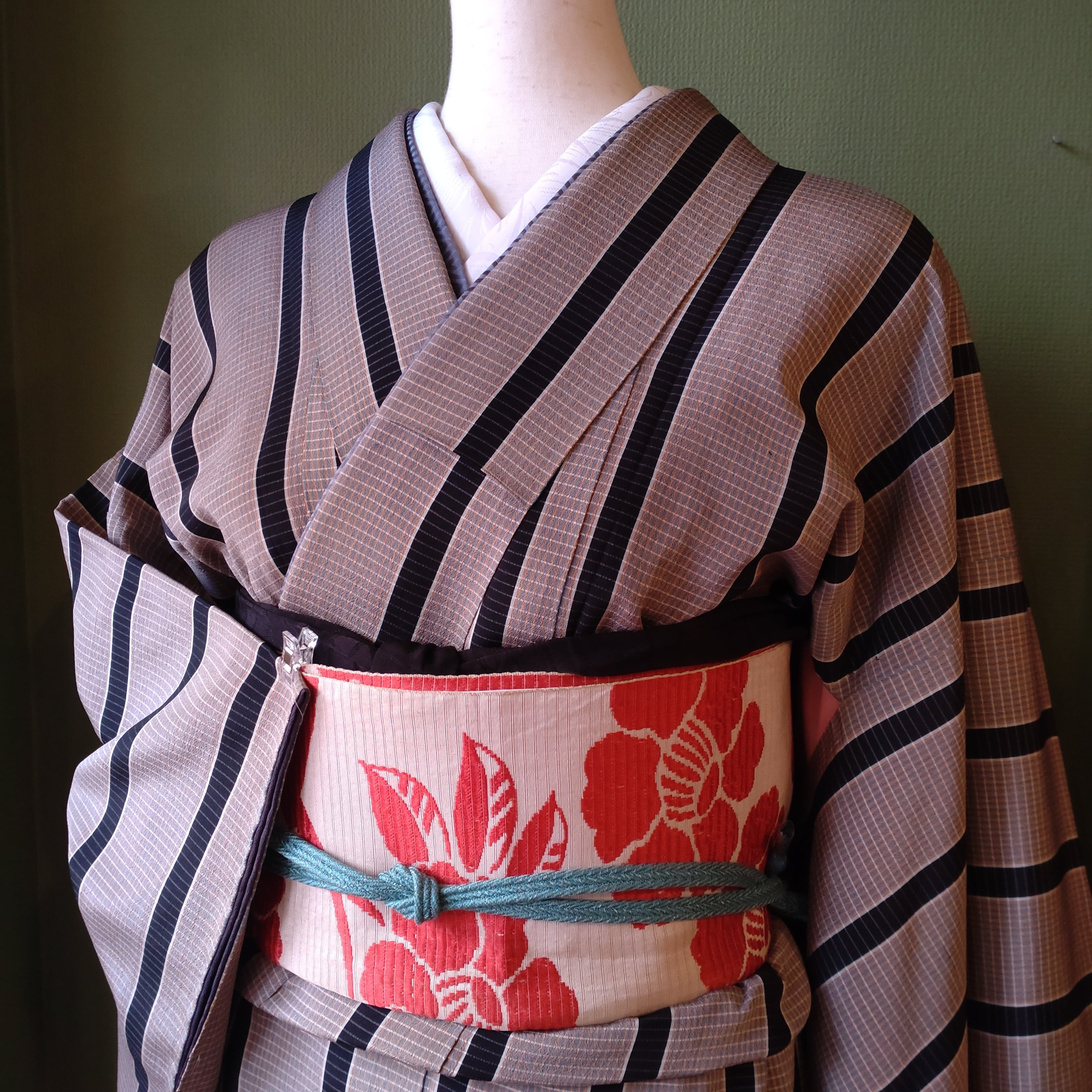 アンティークの袷着物です。黒とベージュの縞に、よく見ると水色と白の格子柄。渋さの中にカジュアルさのある日常使いしやすいデザインです。墨黒の八掛も格好良いです。状態も◎