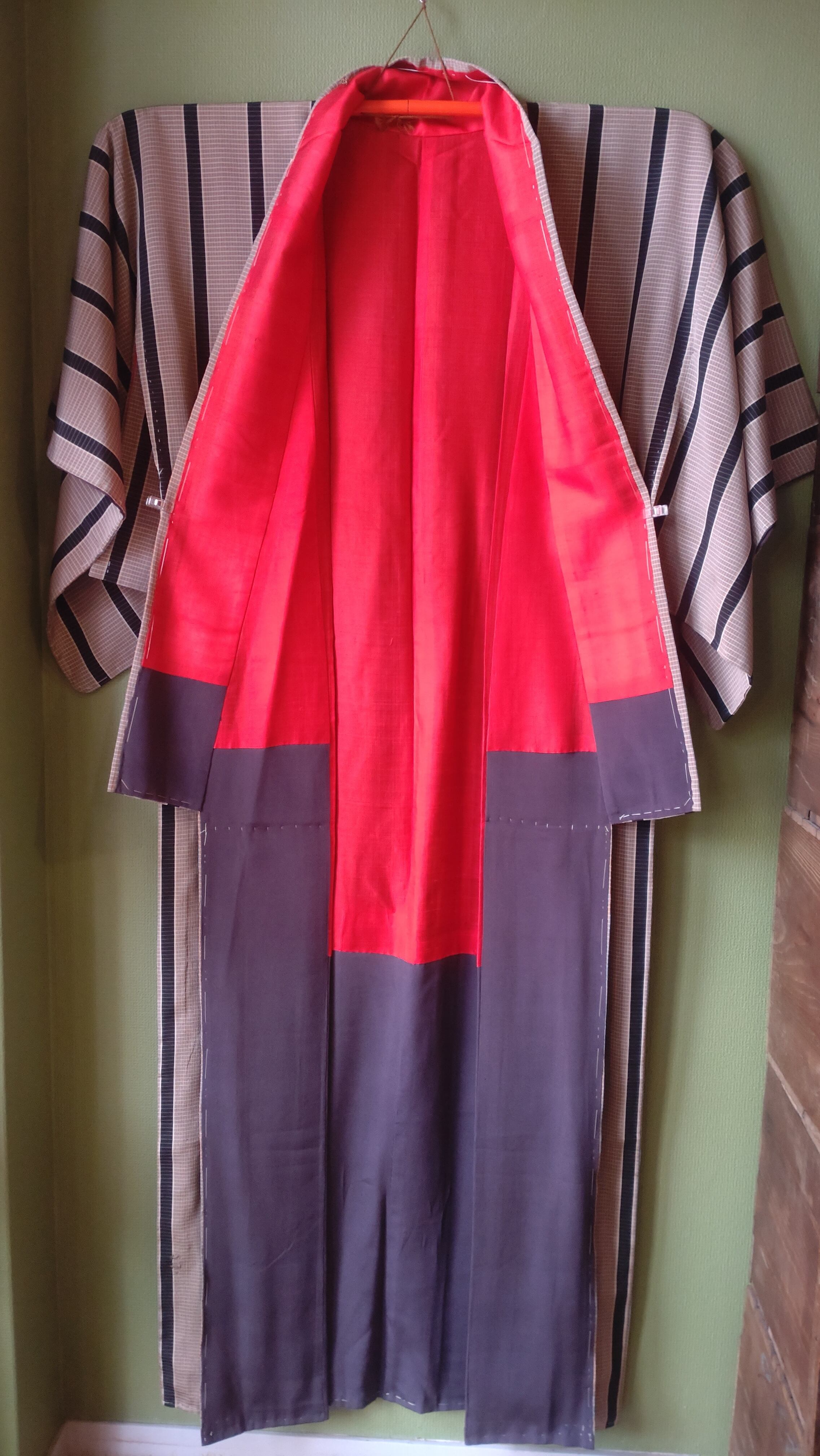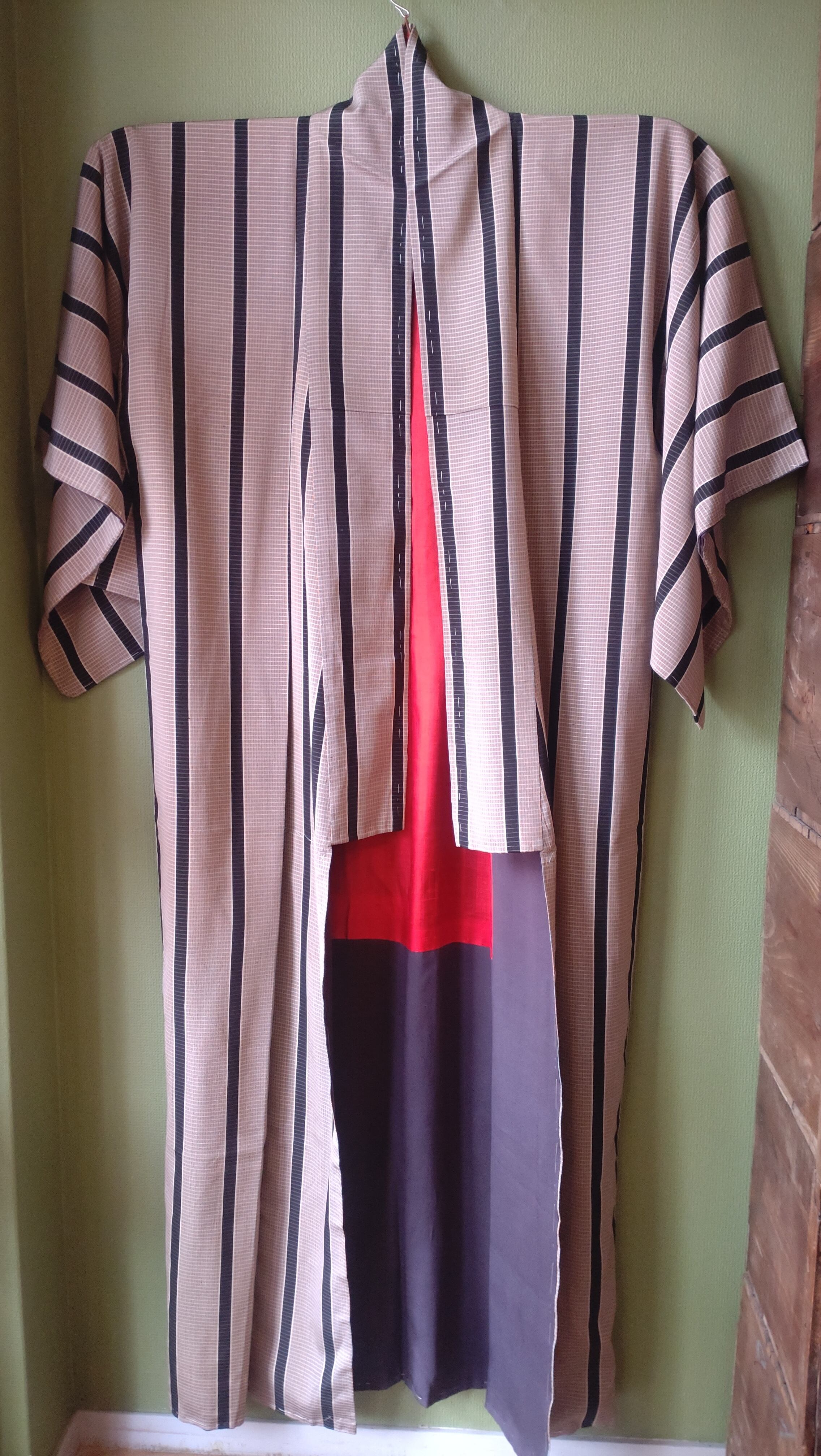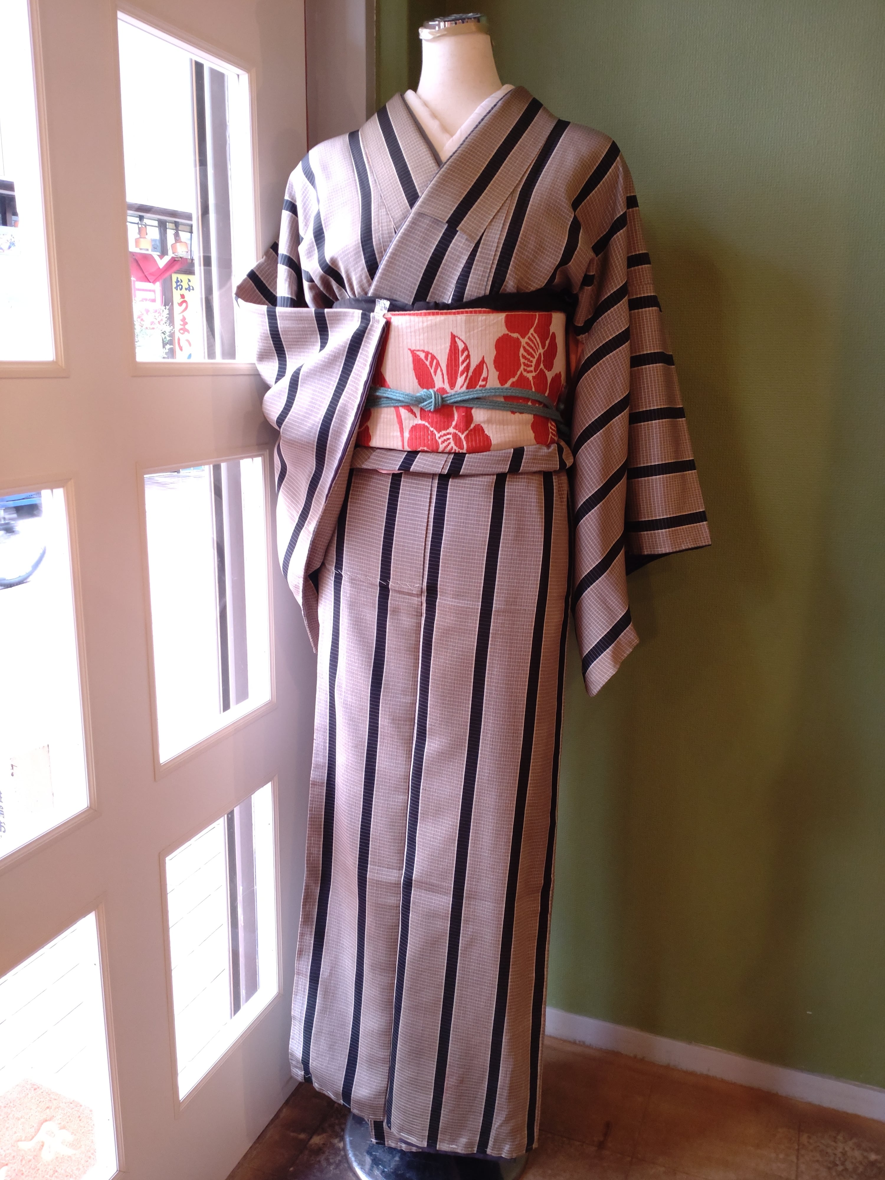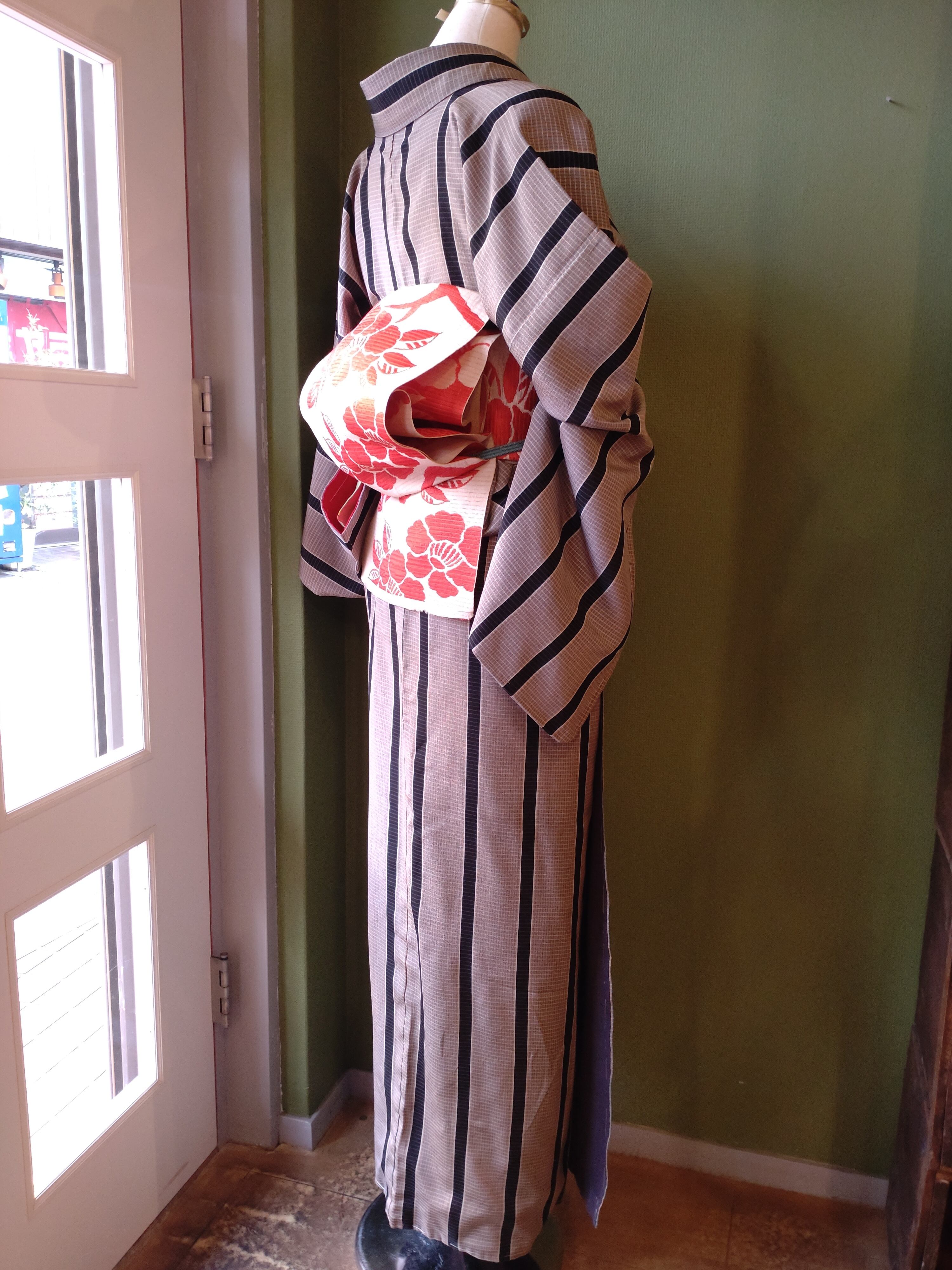 アンティークの袷着物です。黒とベージュの縞に、よく見ると水色と白の格子柄。渋さの中にカジュアルさのある日常使いしやすいデザインです。墨黒の八掛も格好良いです。状態も◎