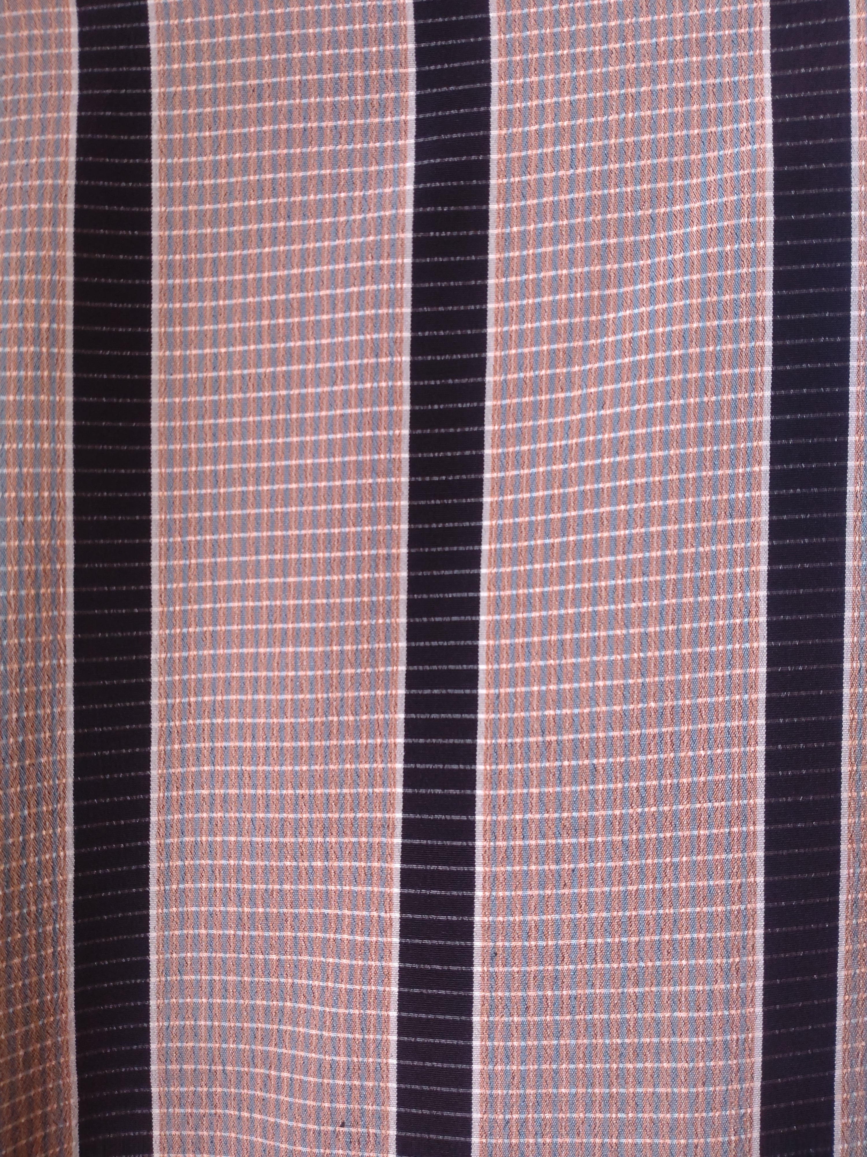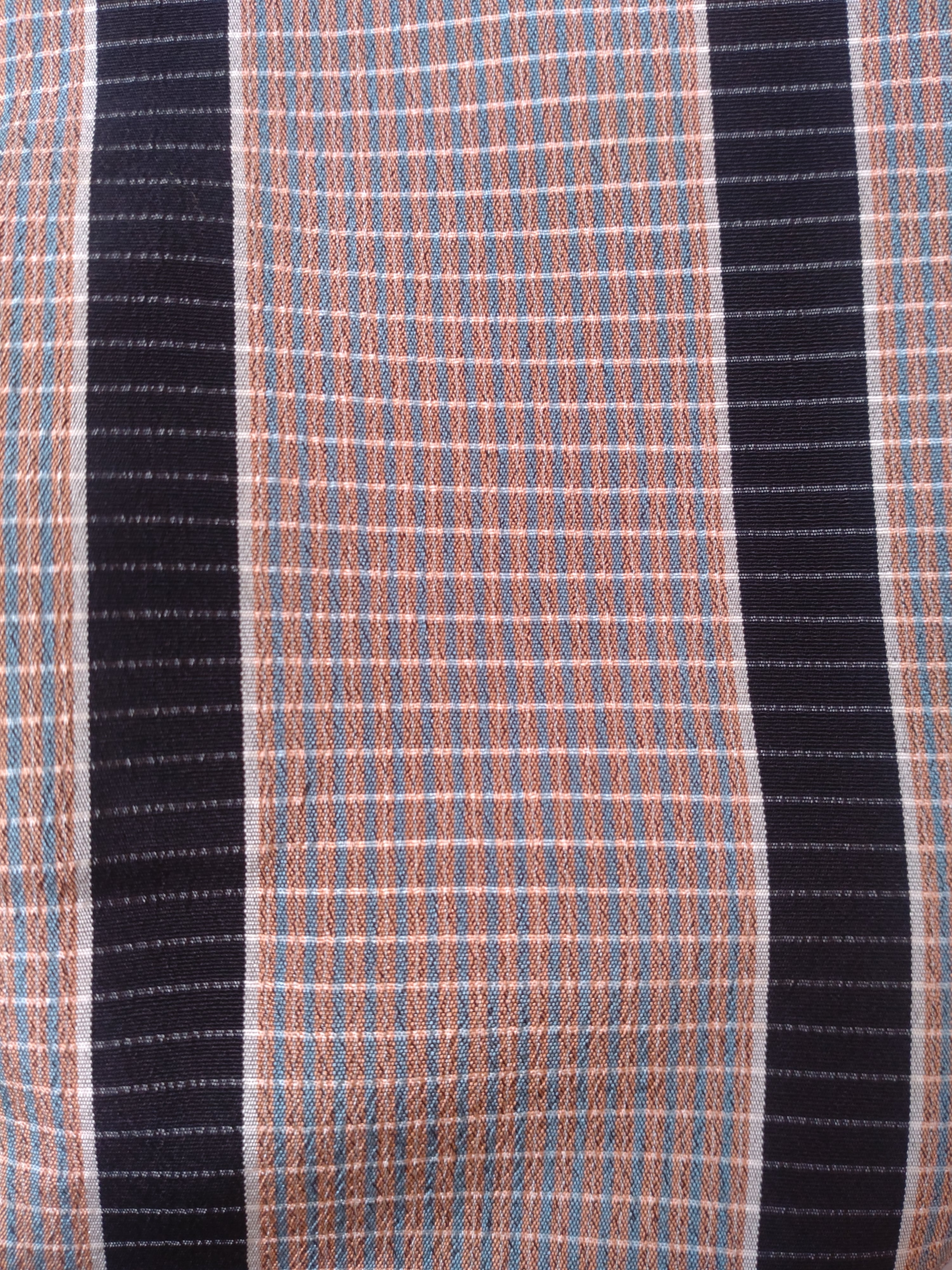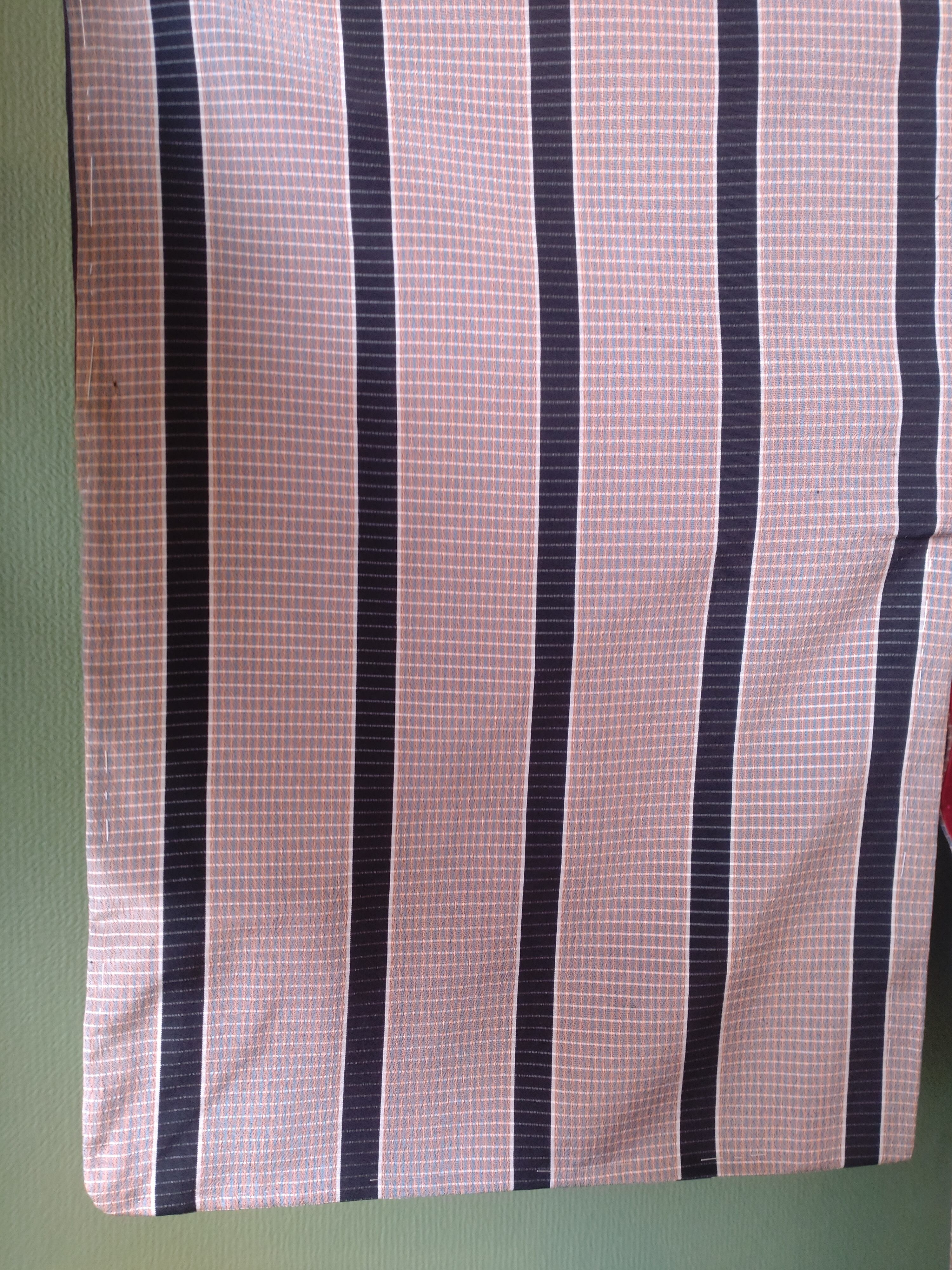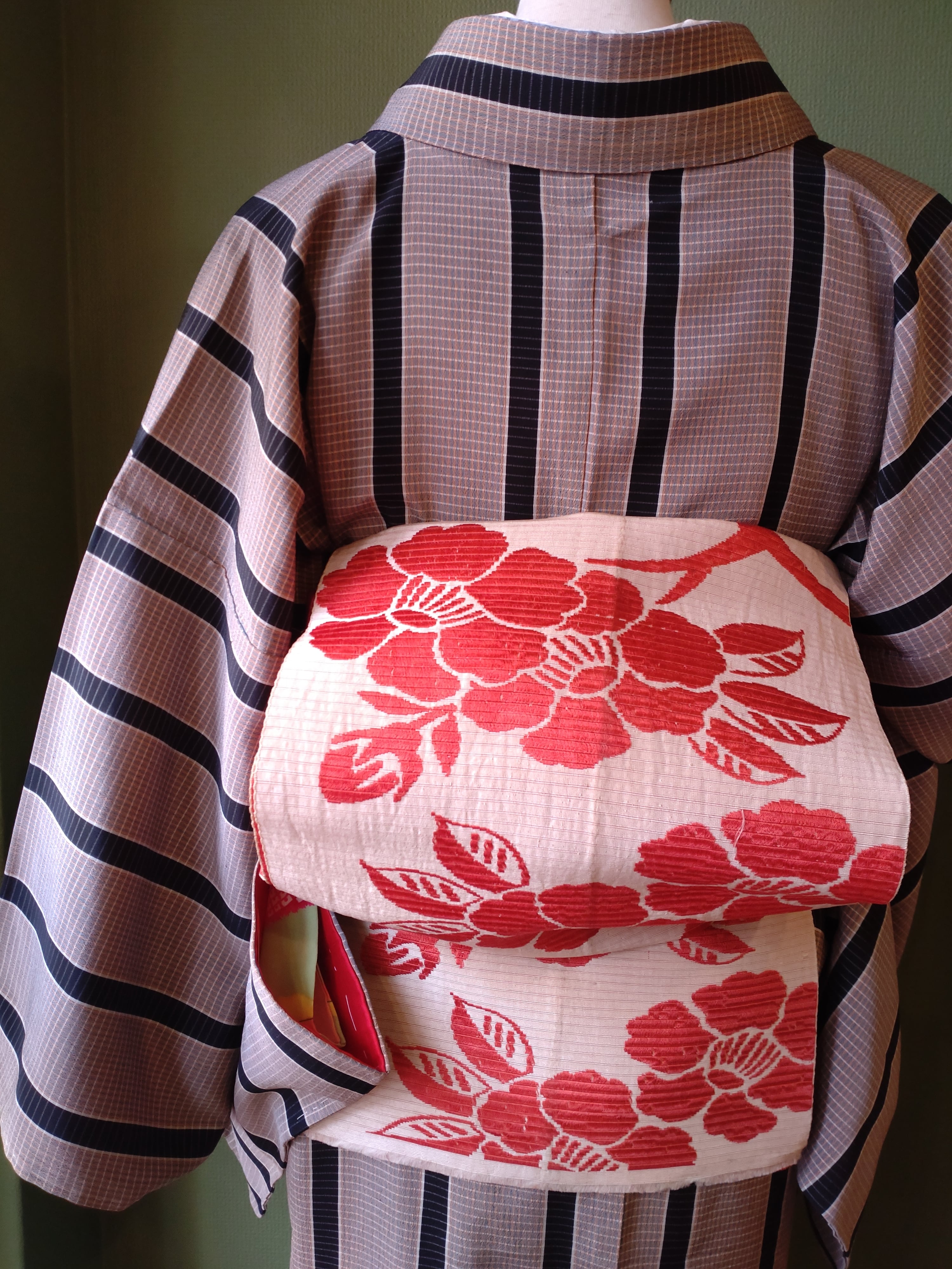 アンティークの袷着物です。黒とベージュの縞に、よく見ると水色と白の格子柄。渋さの中にカジュアルさのある日常使いしやすいデザインです。墨黒の八掛も格好良いです。状態も◎