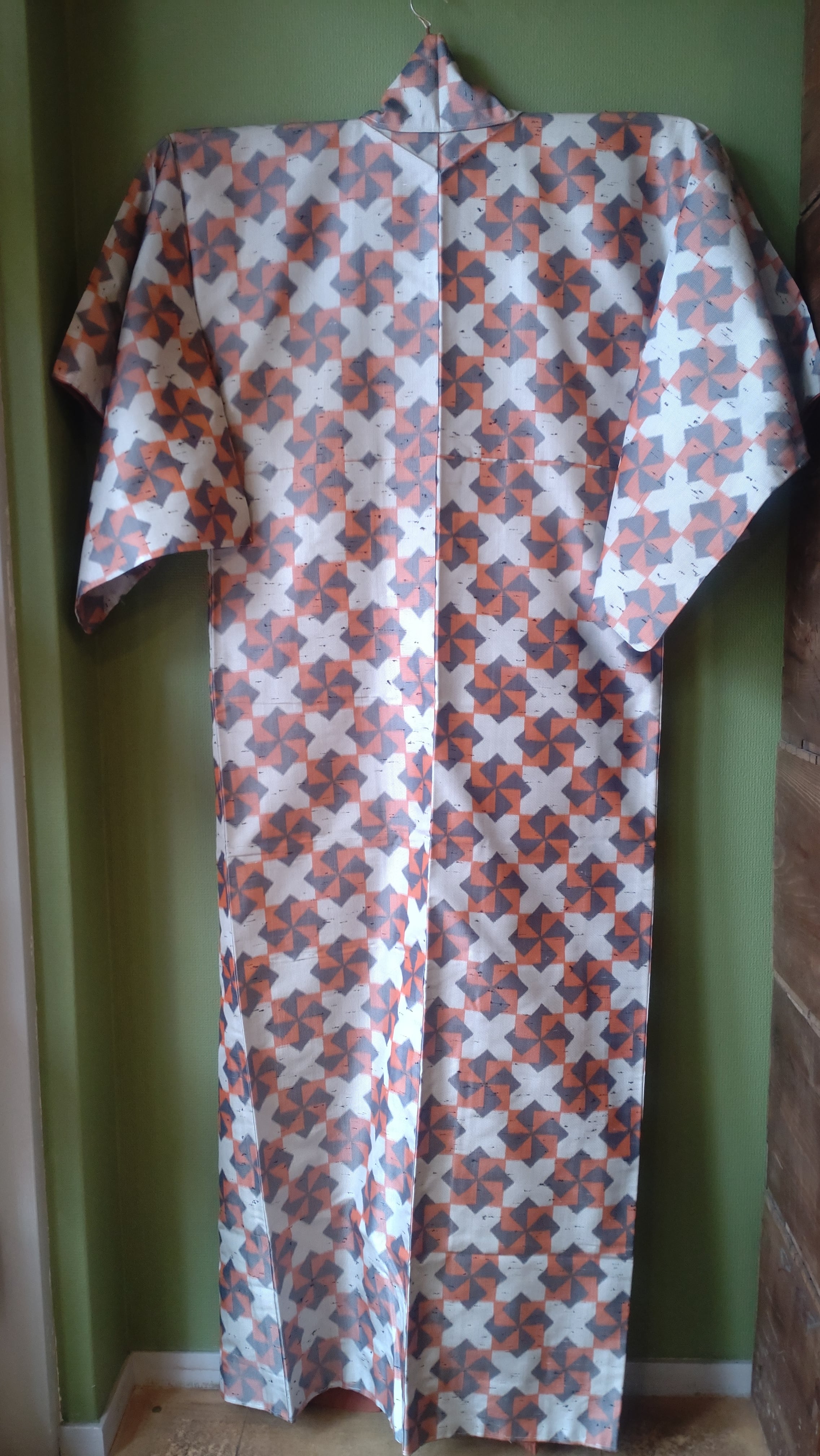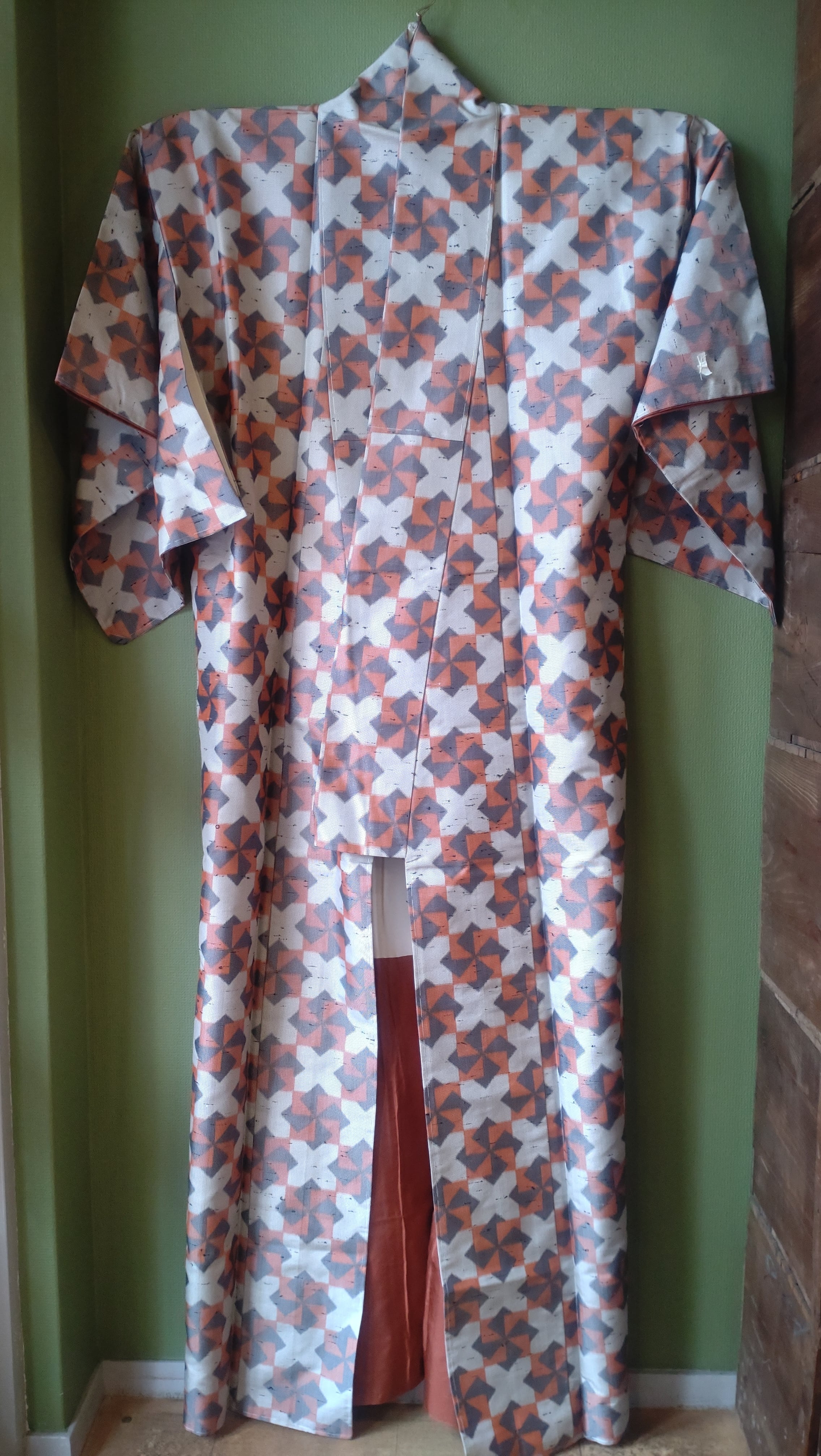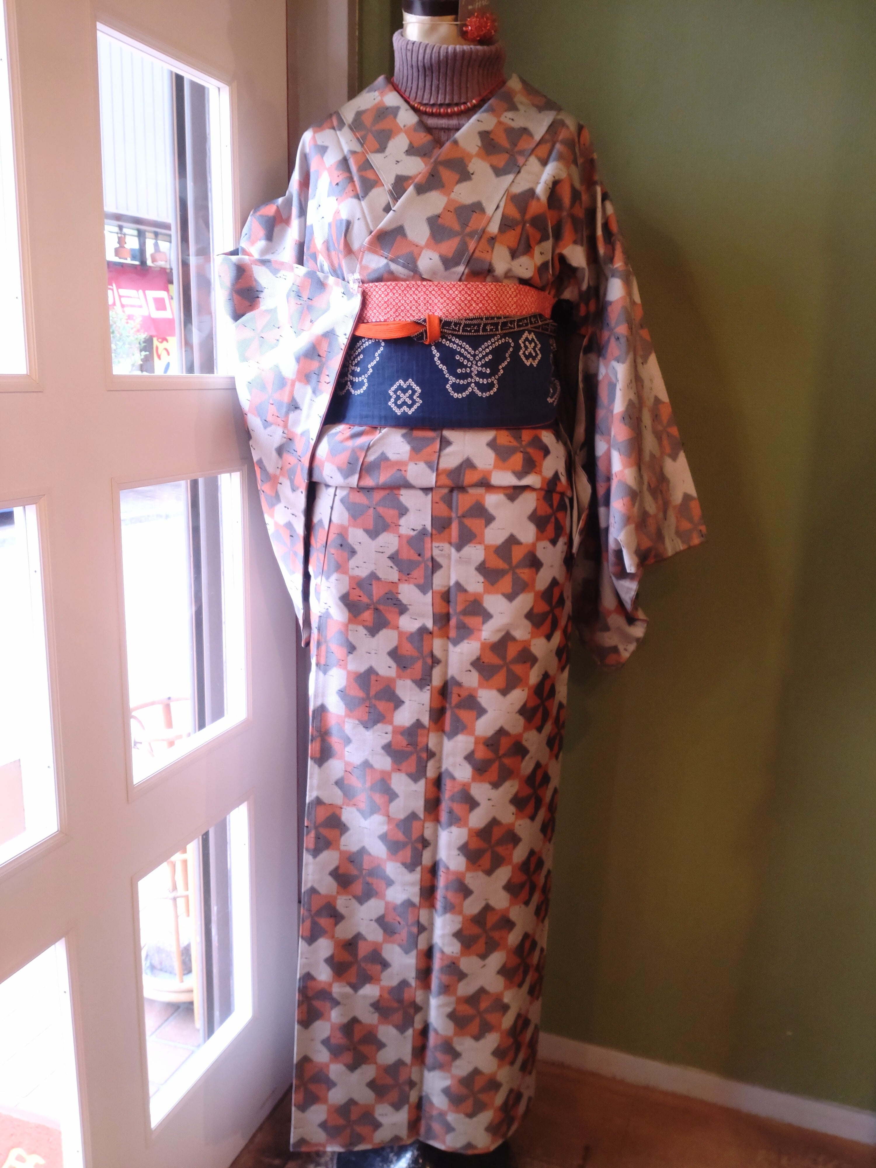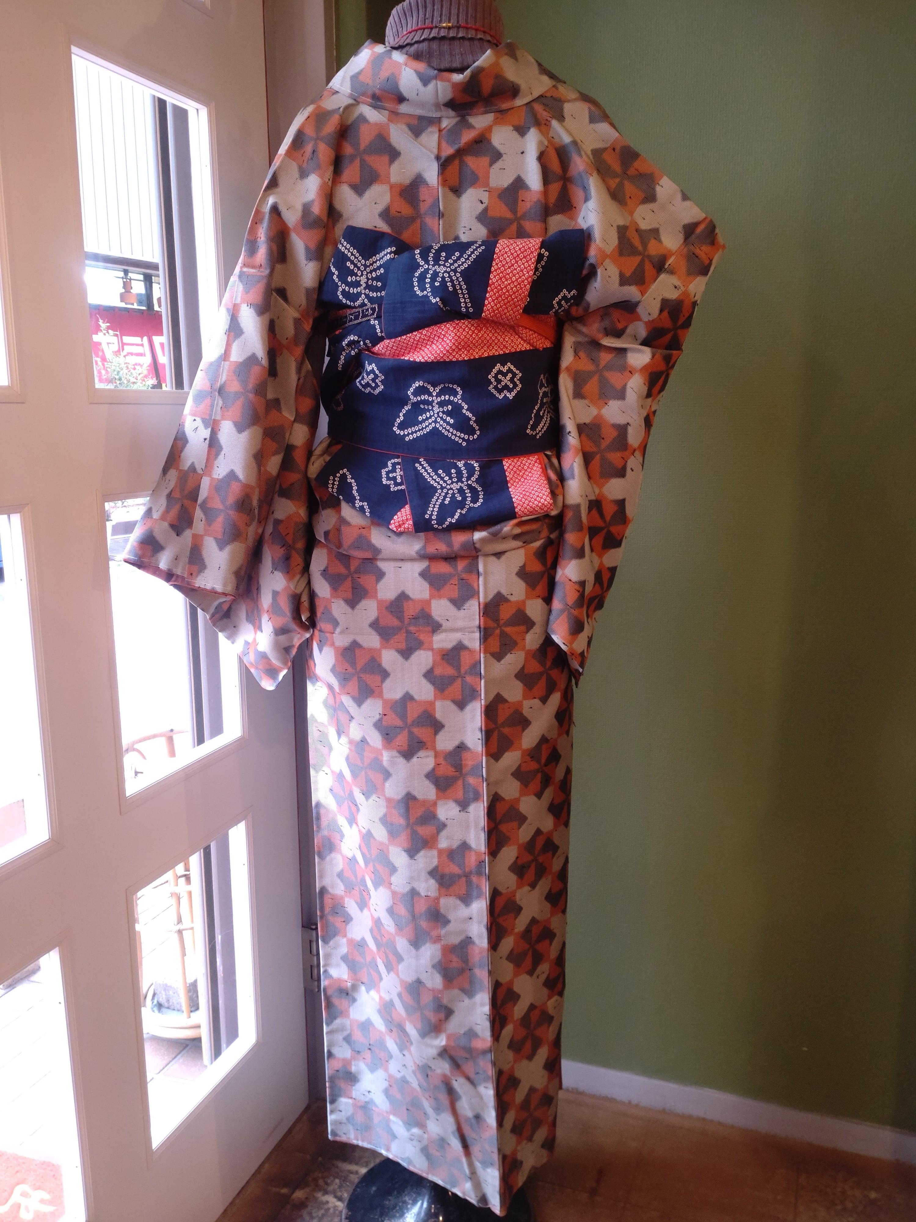 節織の袷着物です。張りのある生地に折り紙の風車のような柄。季節問わず使えるデザインです。