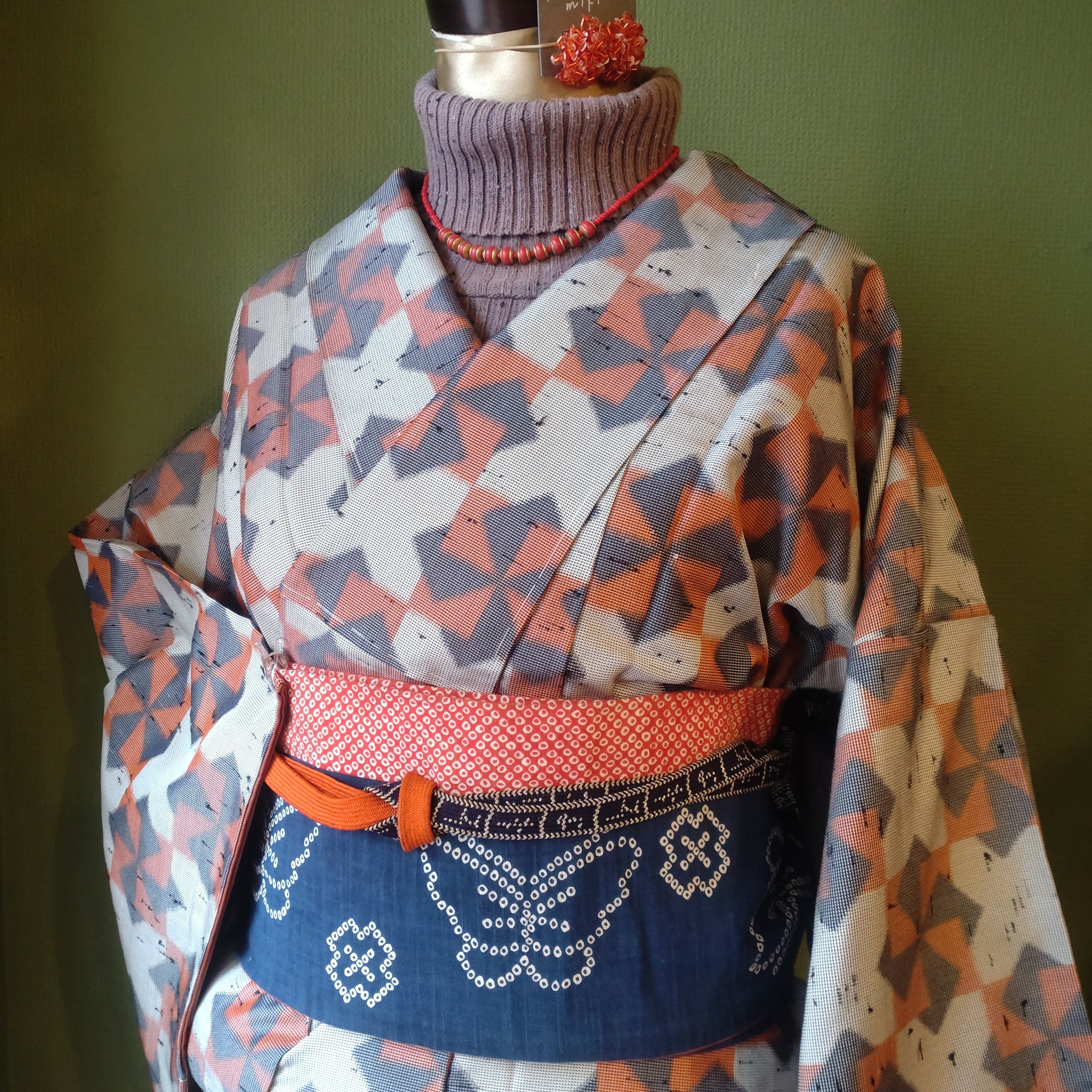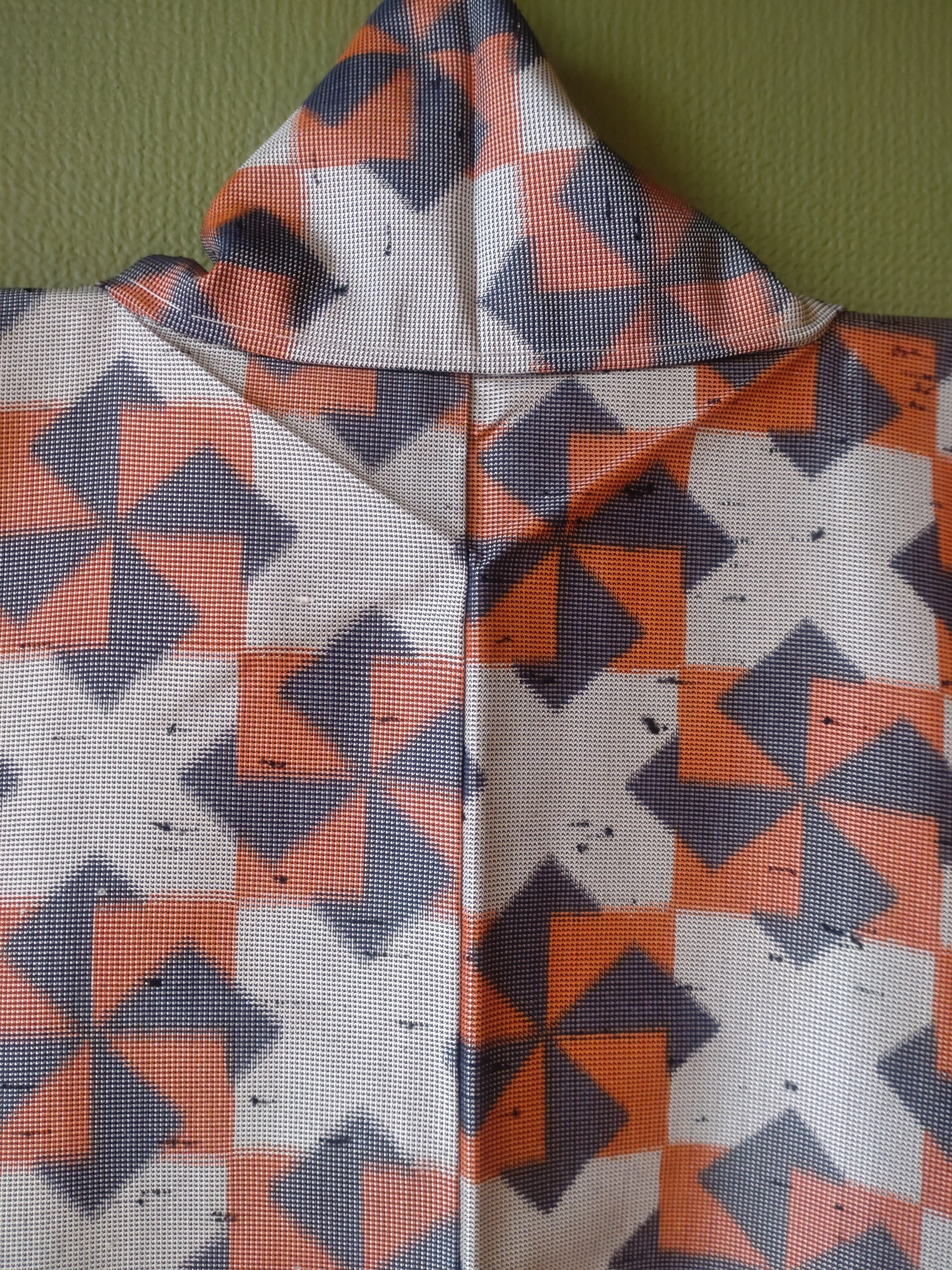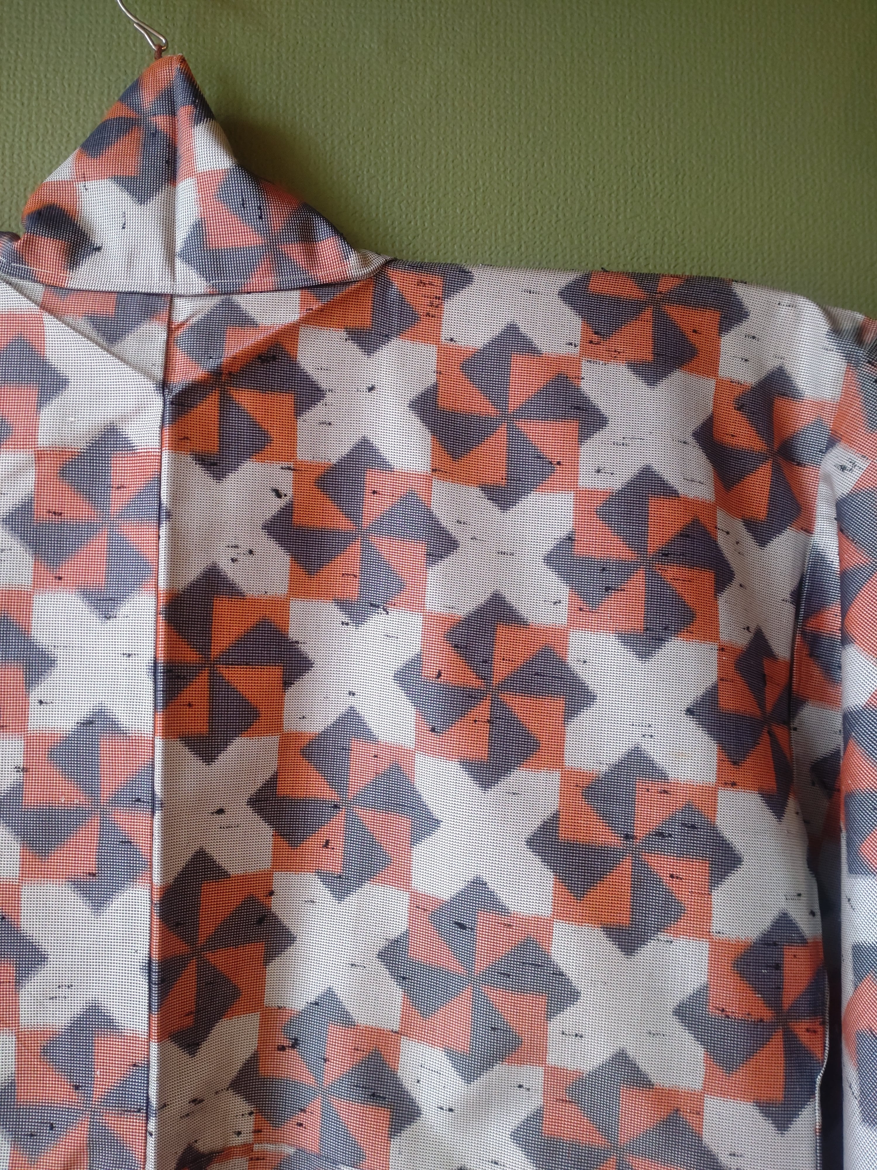 節織の袷着物です。張りのある生地に折り紙の風車のような柄。季節問わず使えるデザインです。
