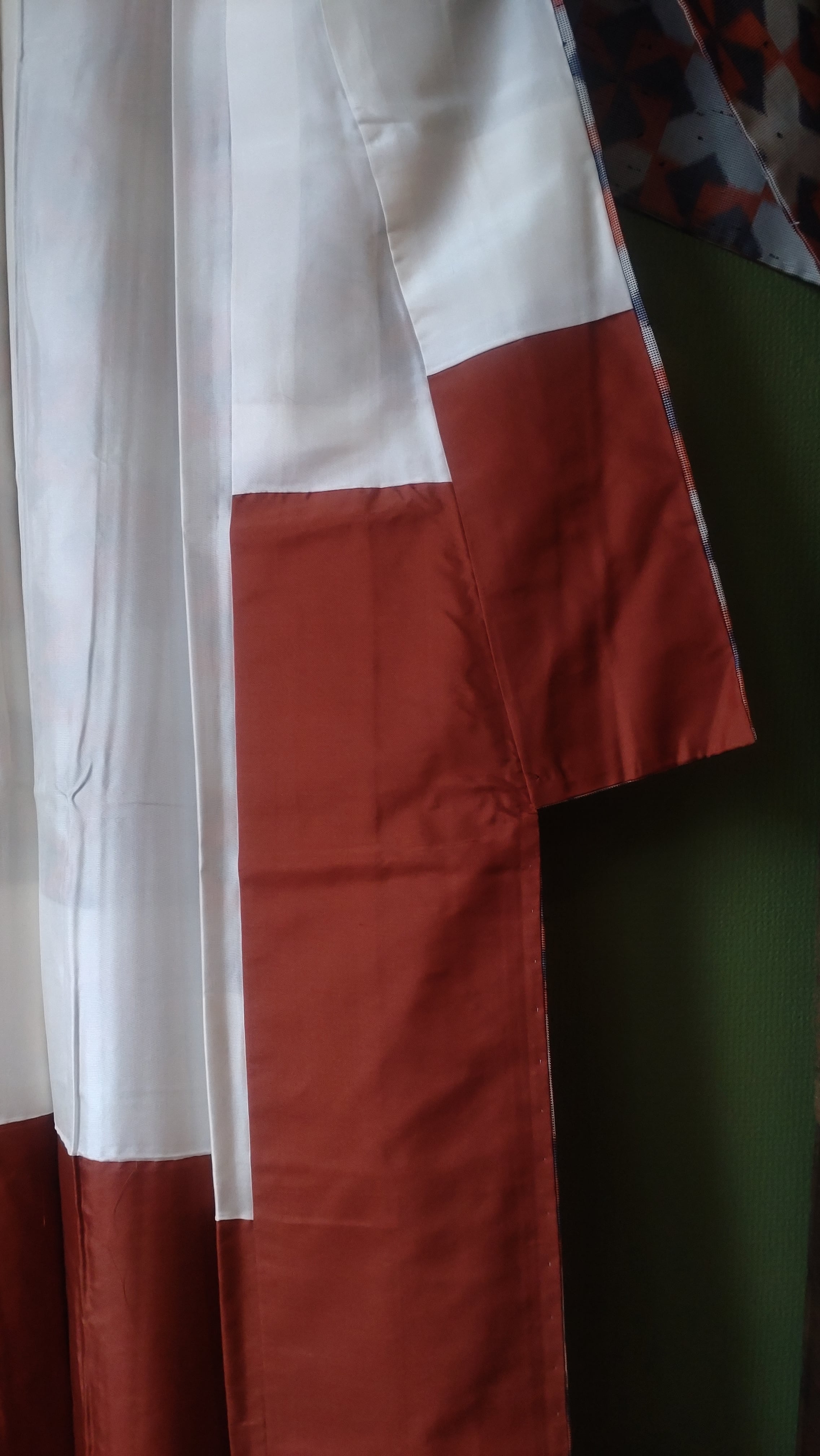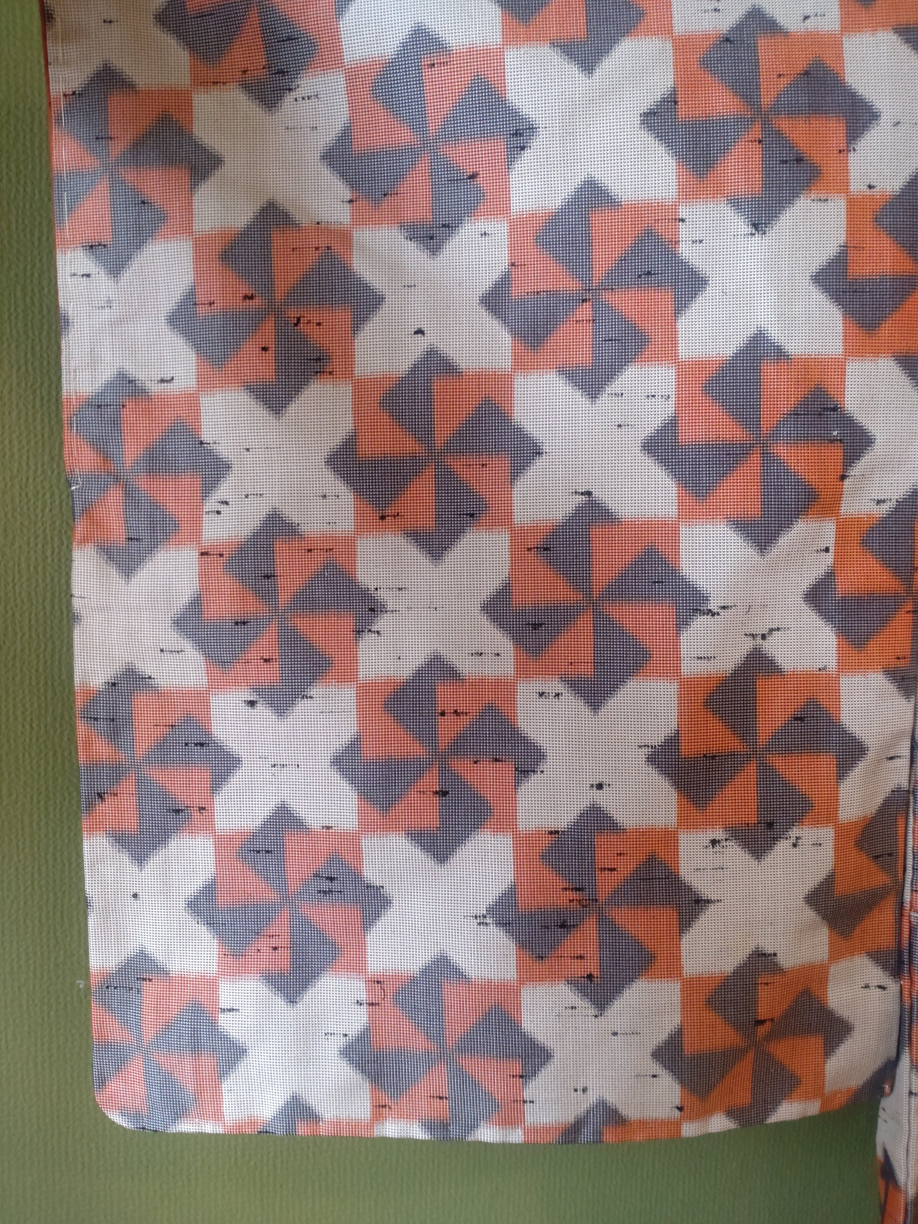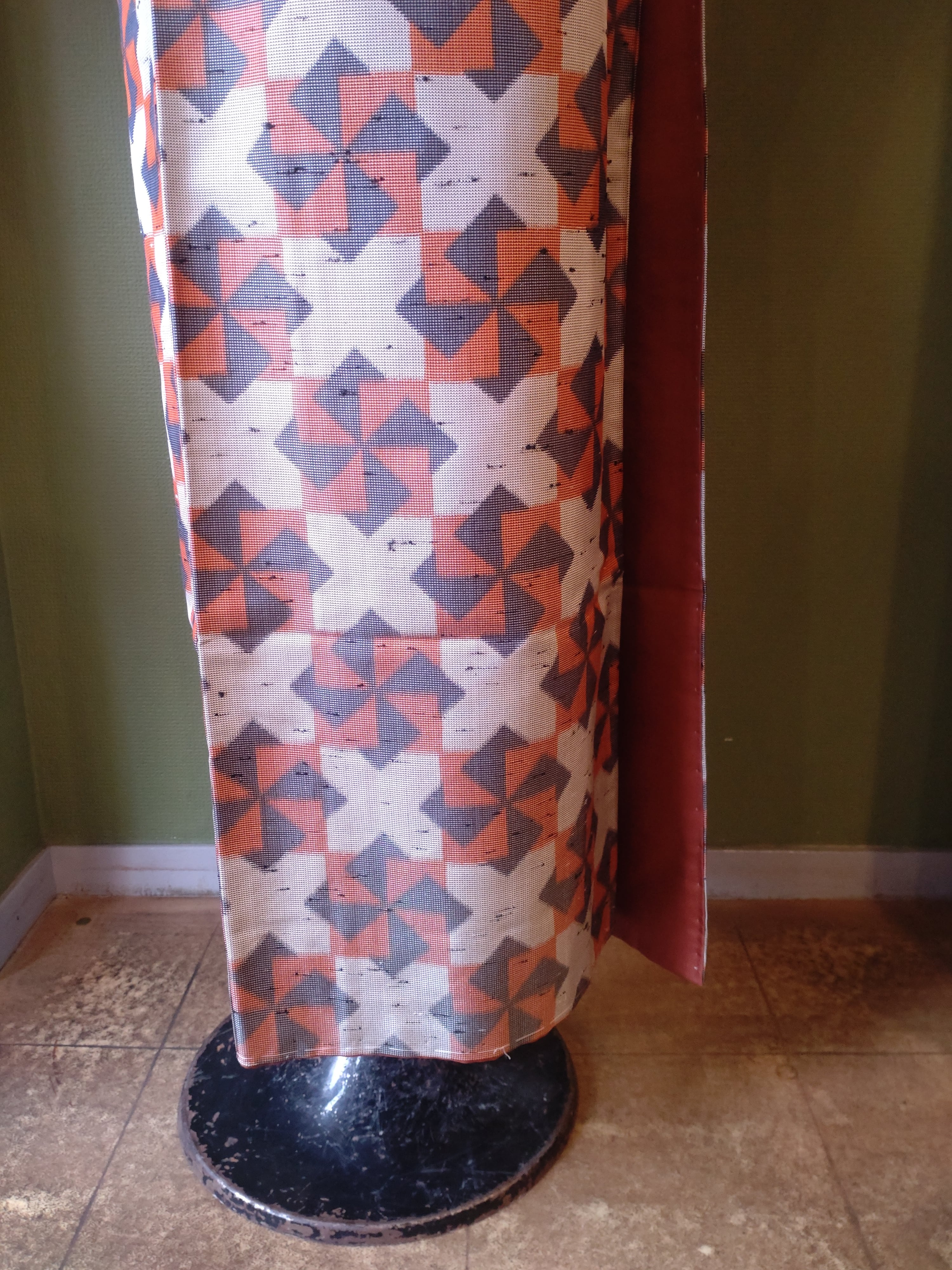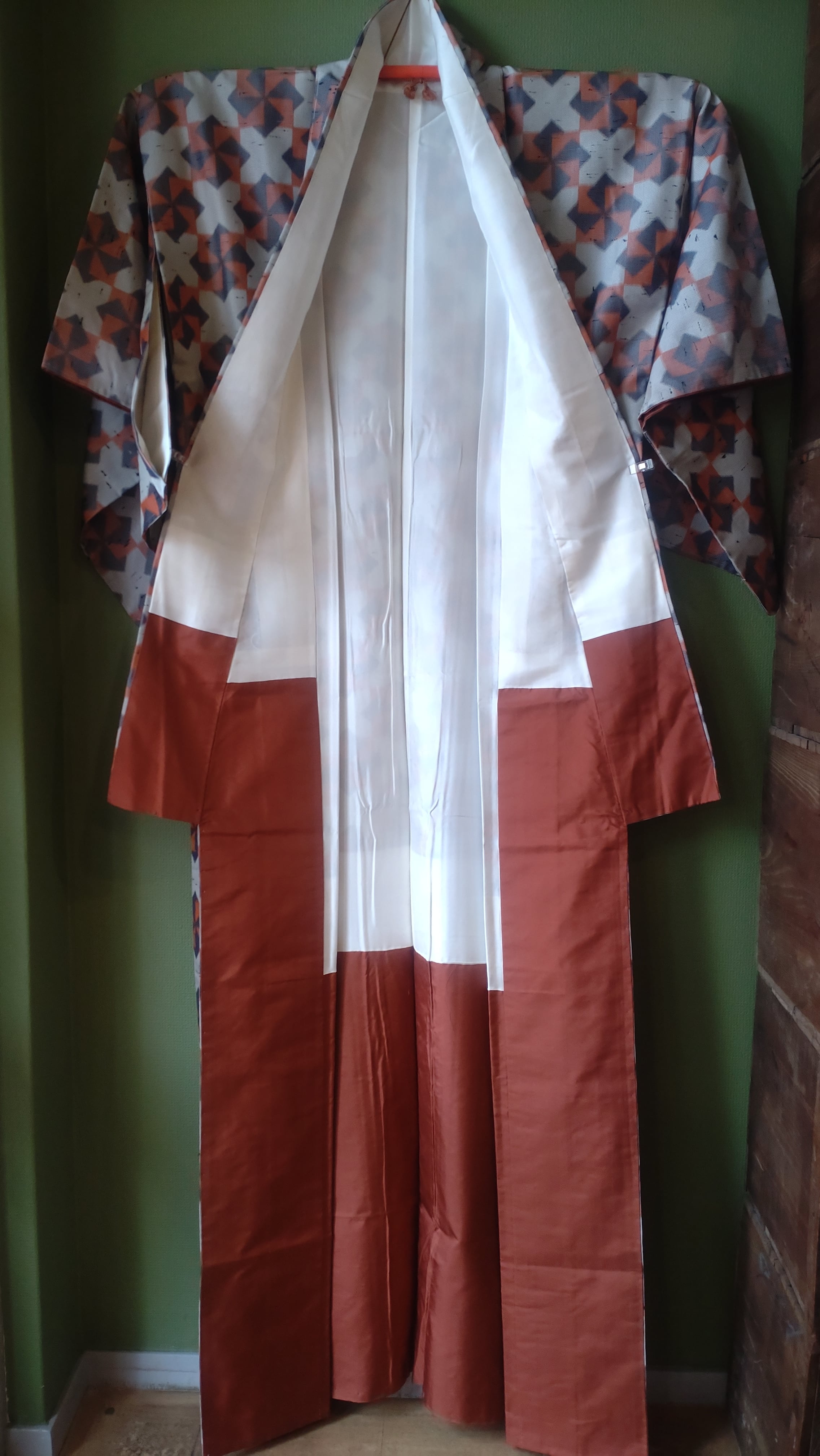 節織の袷着物です。張りのある生地に折り紙の風車のような柄。季節問わず使えるデザインです。