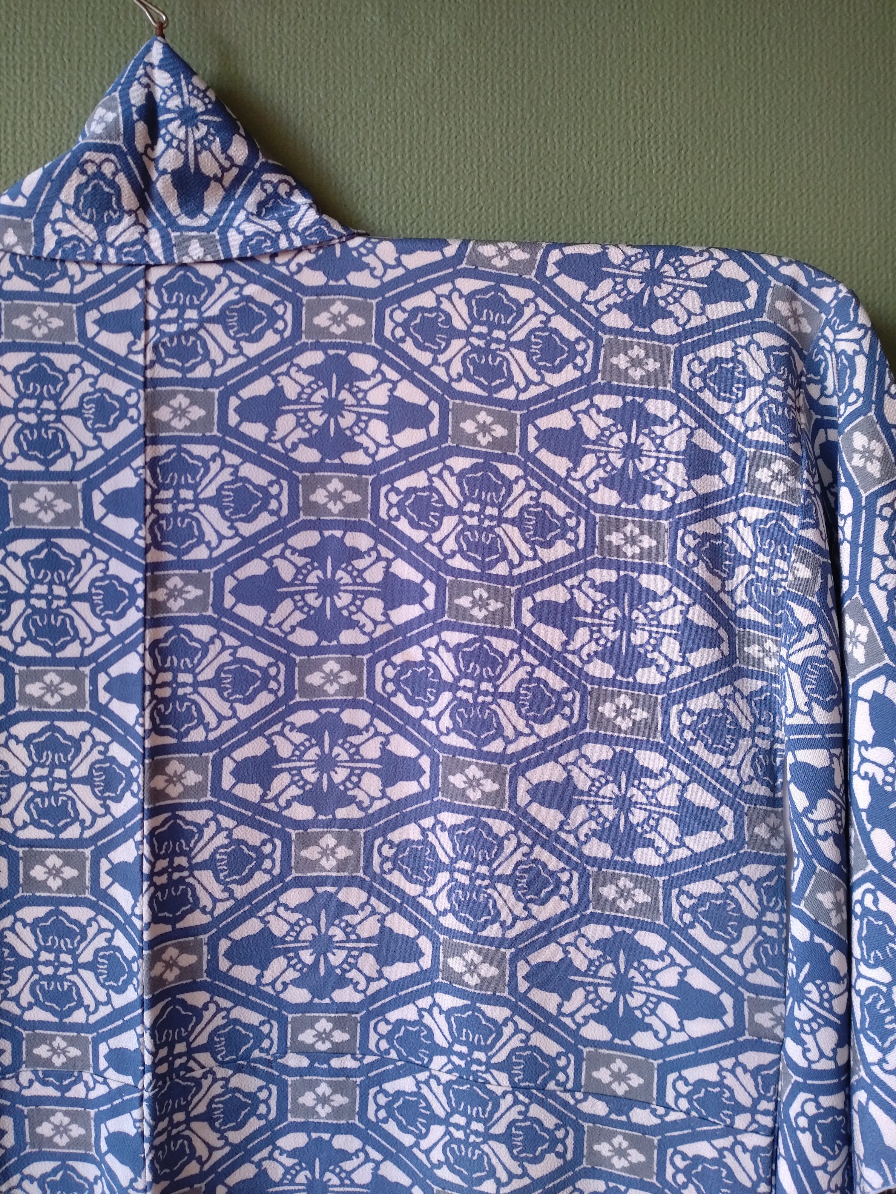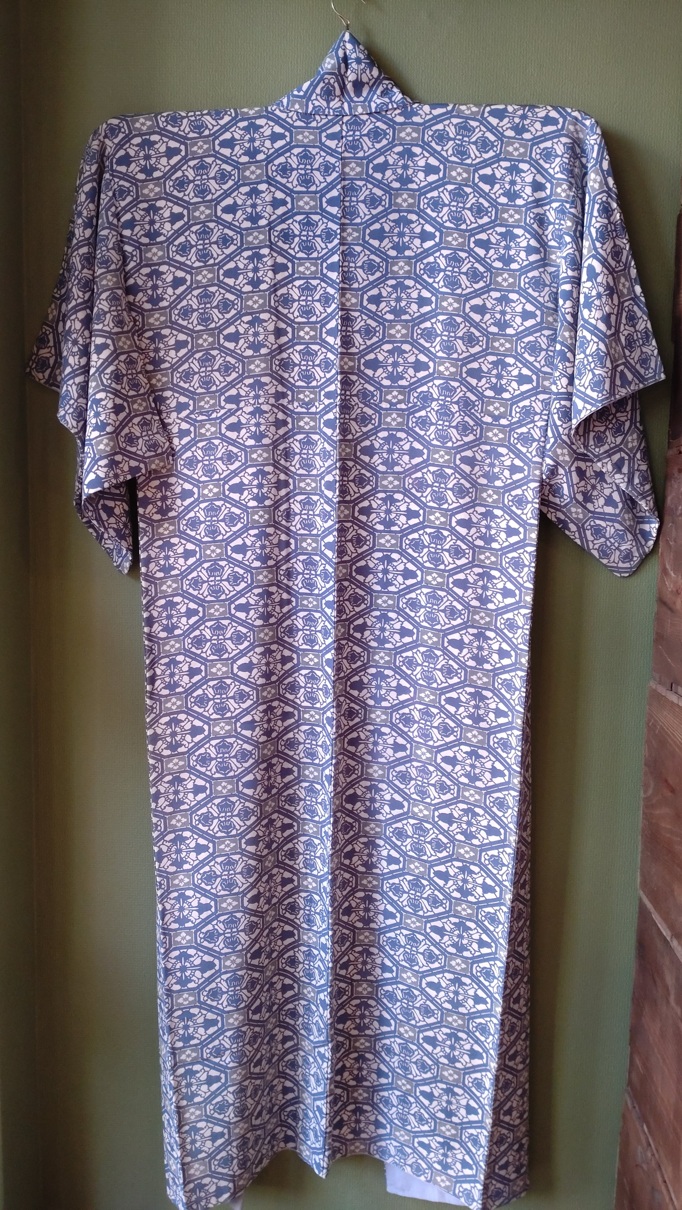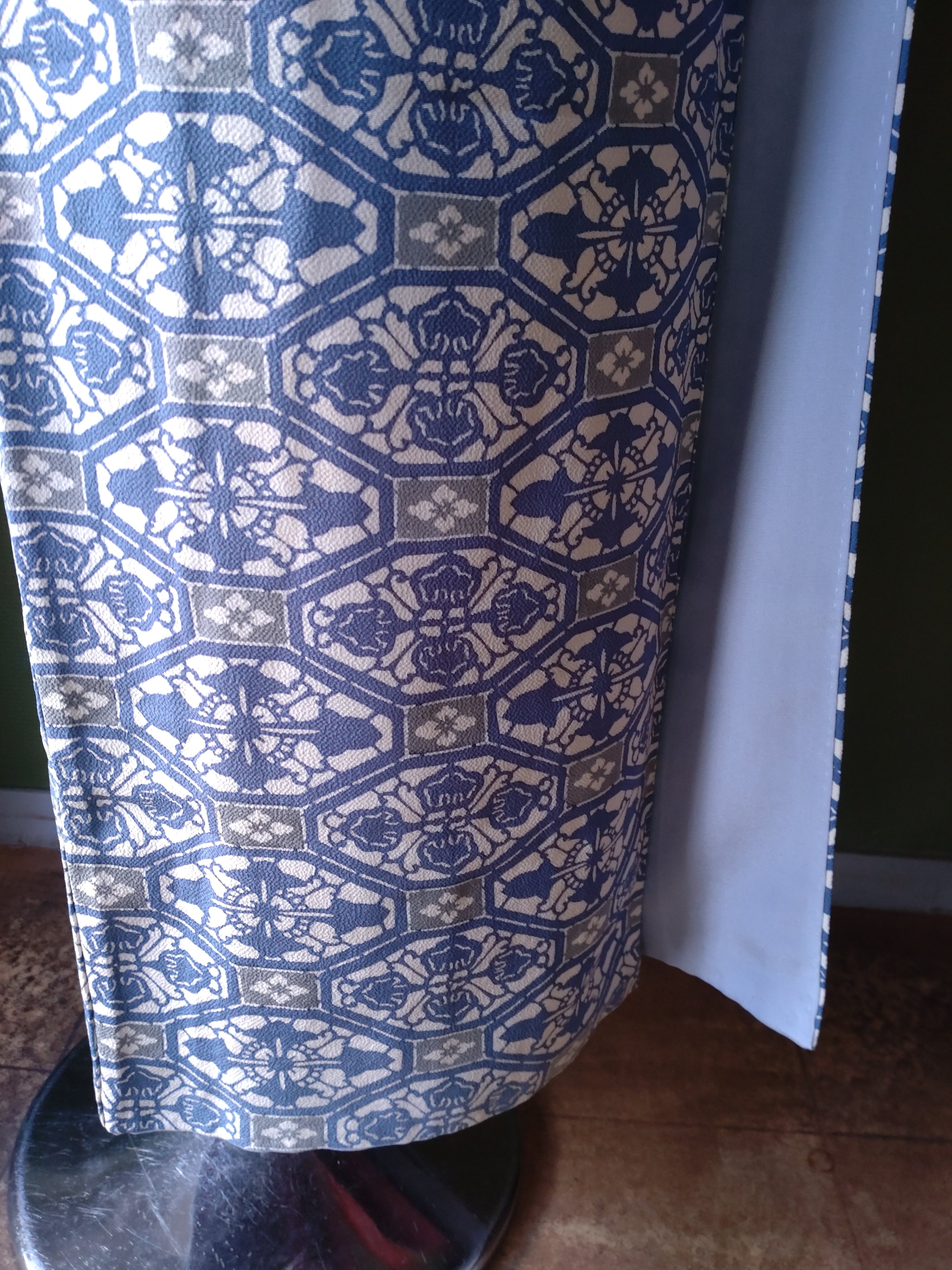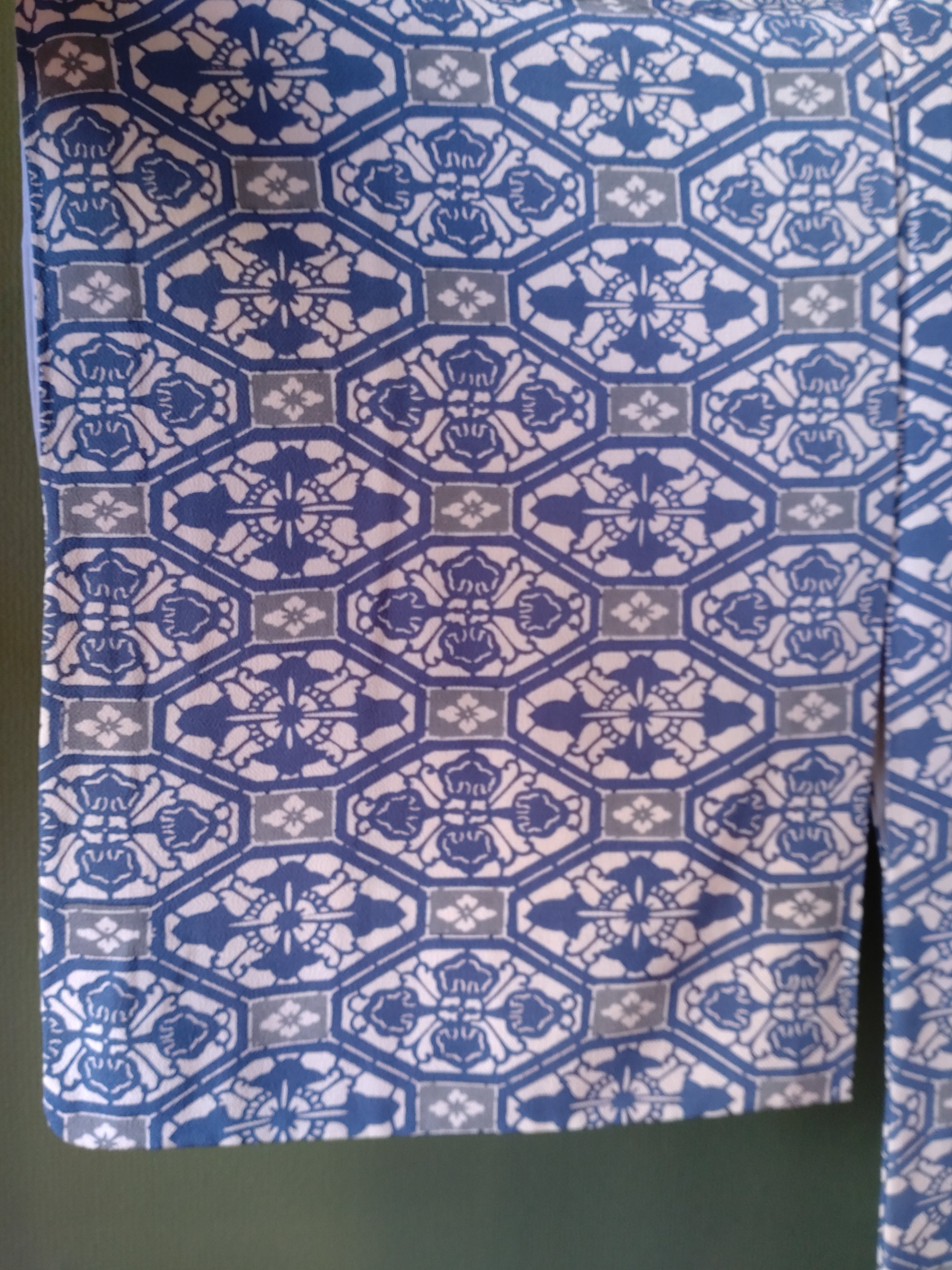 型染めの袷着物です。ブルーと灰色の柄に八掛の水色が爽やか。
