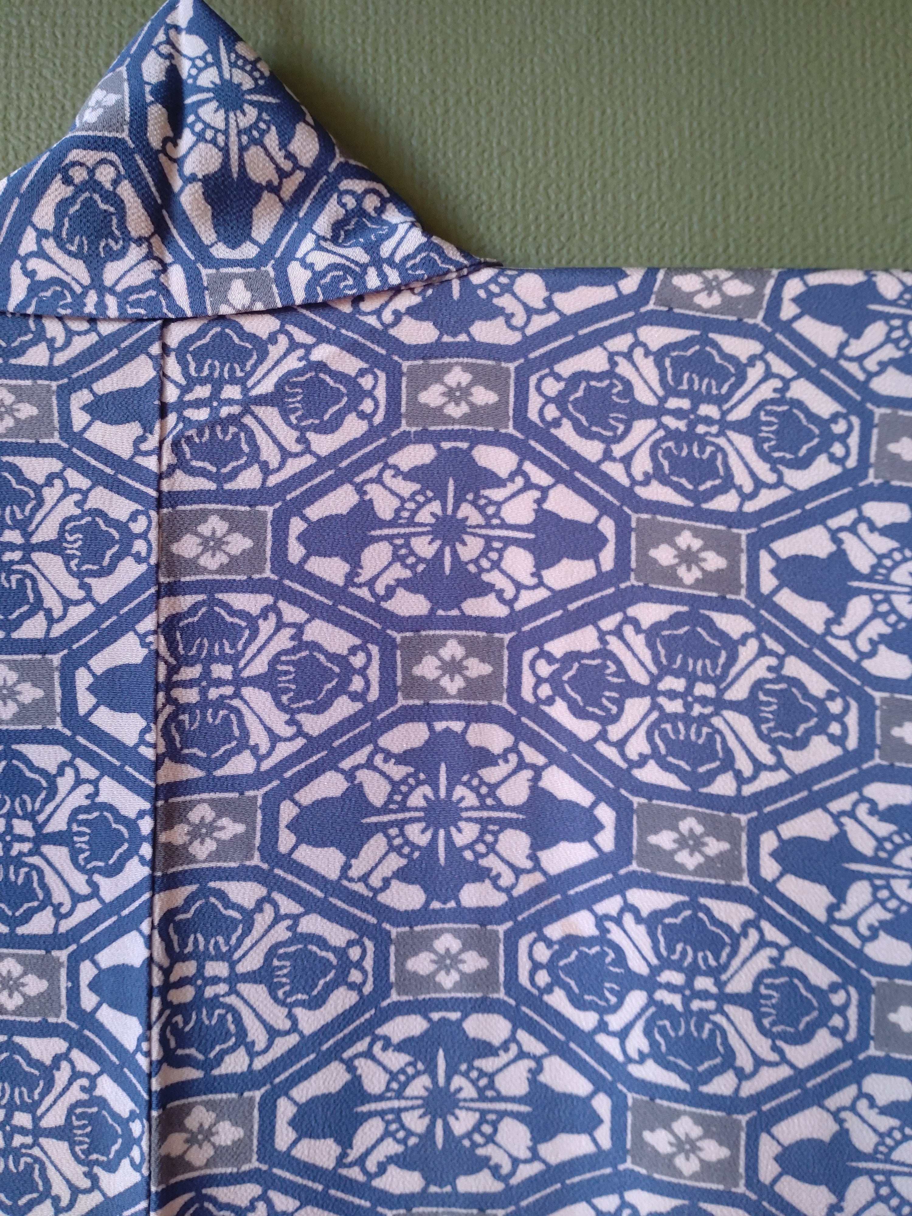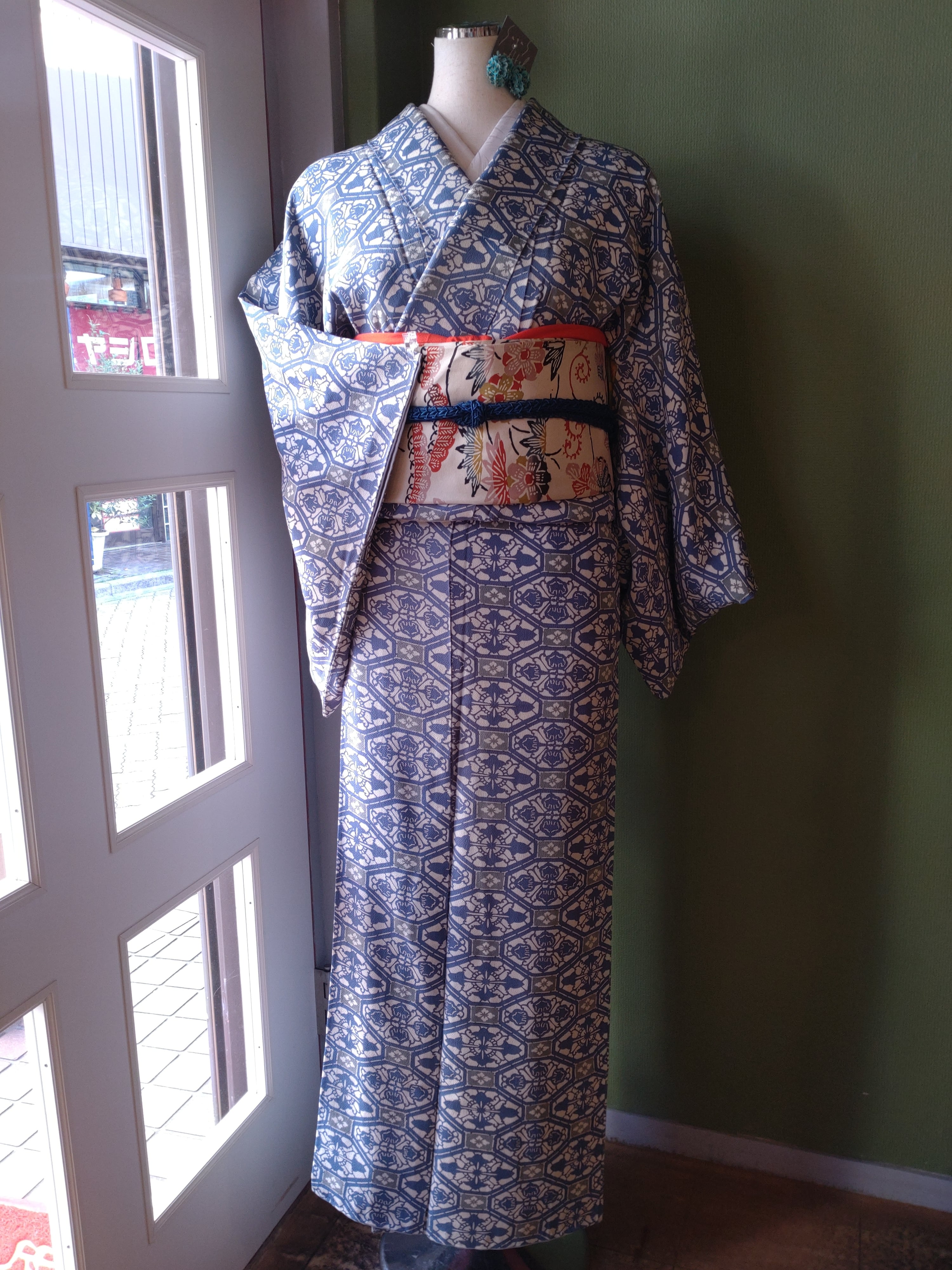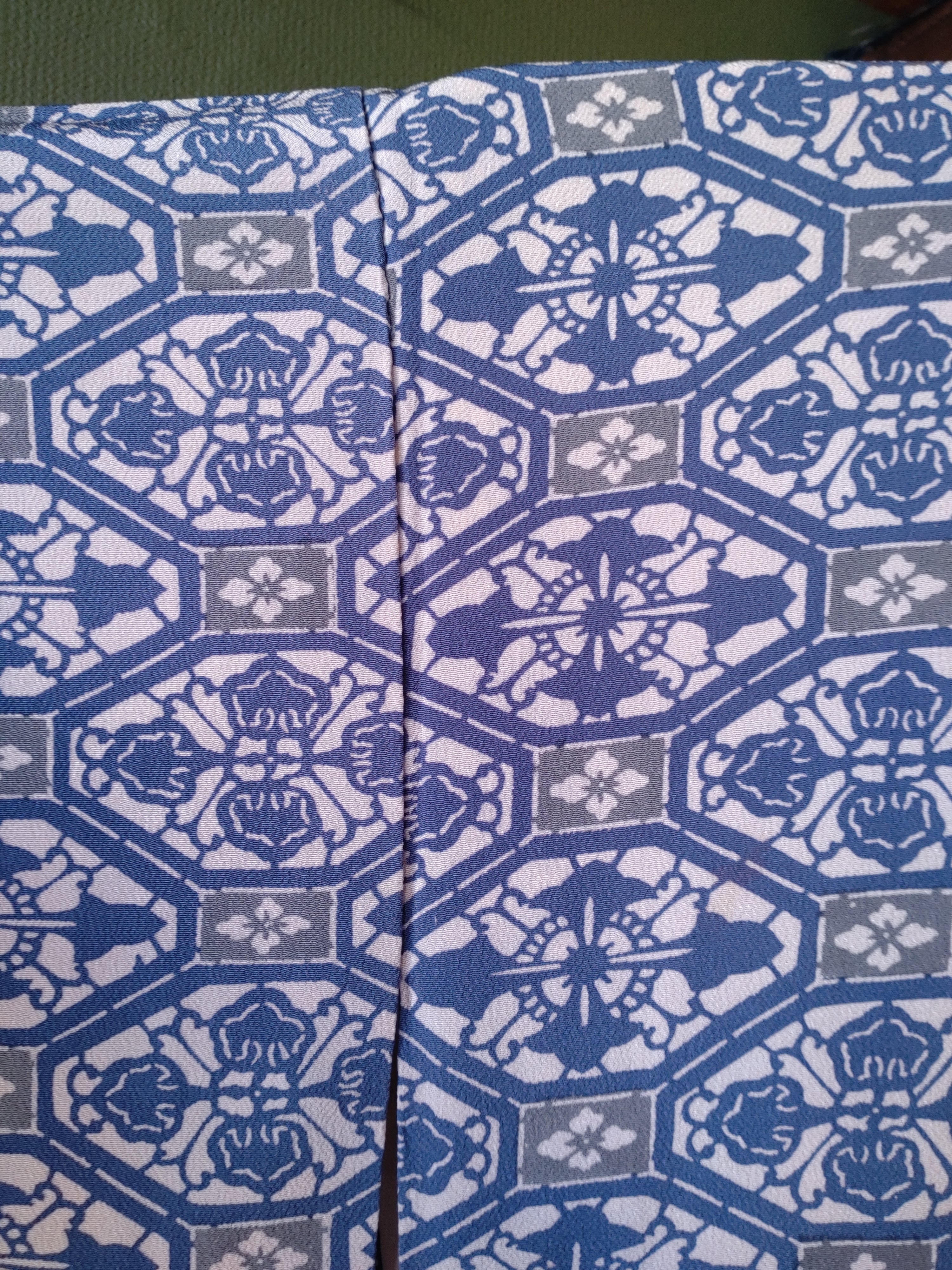 型染めの袷着物です。ブルーと灰色の柄に八掛の水色が爽やか。