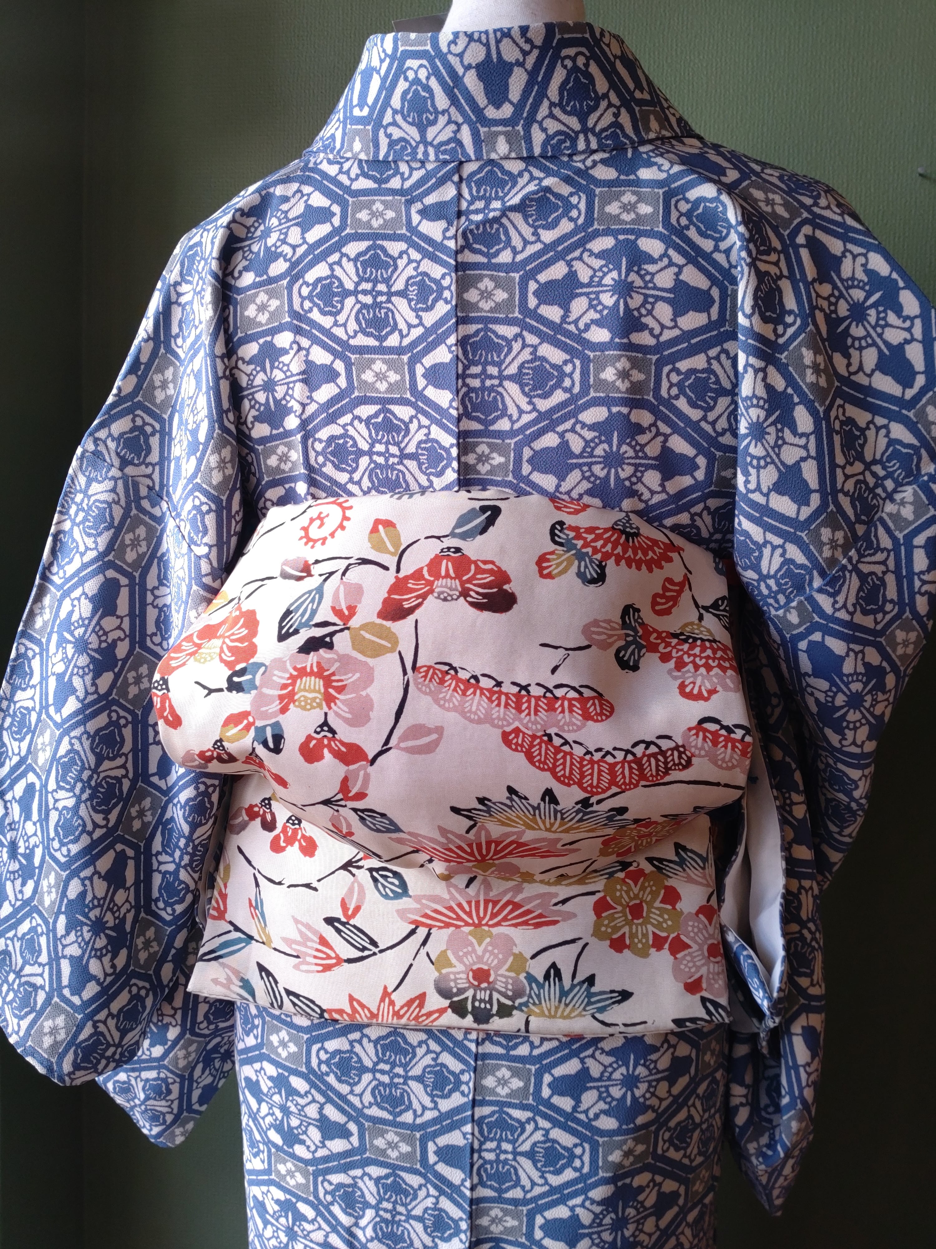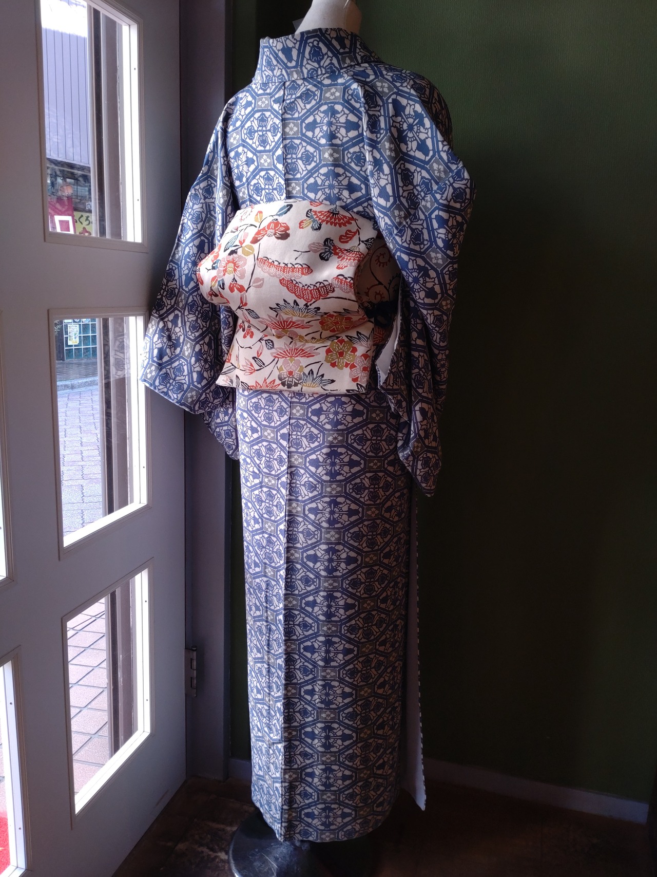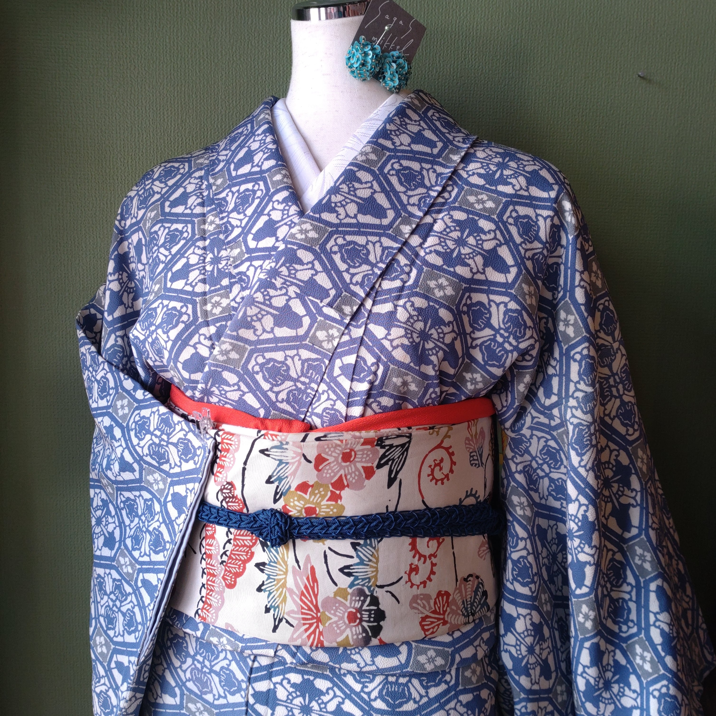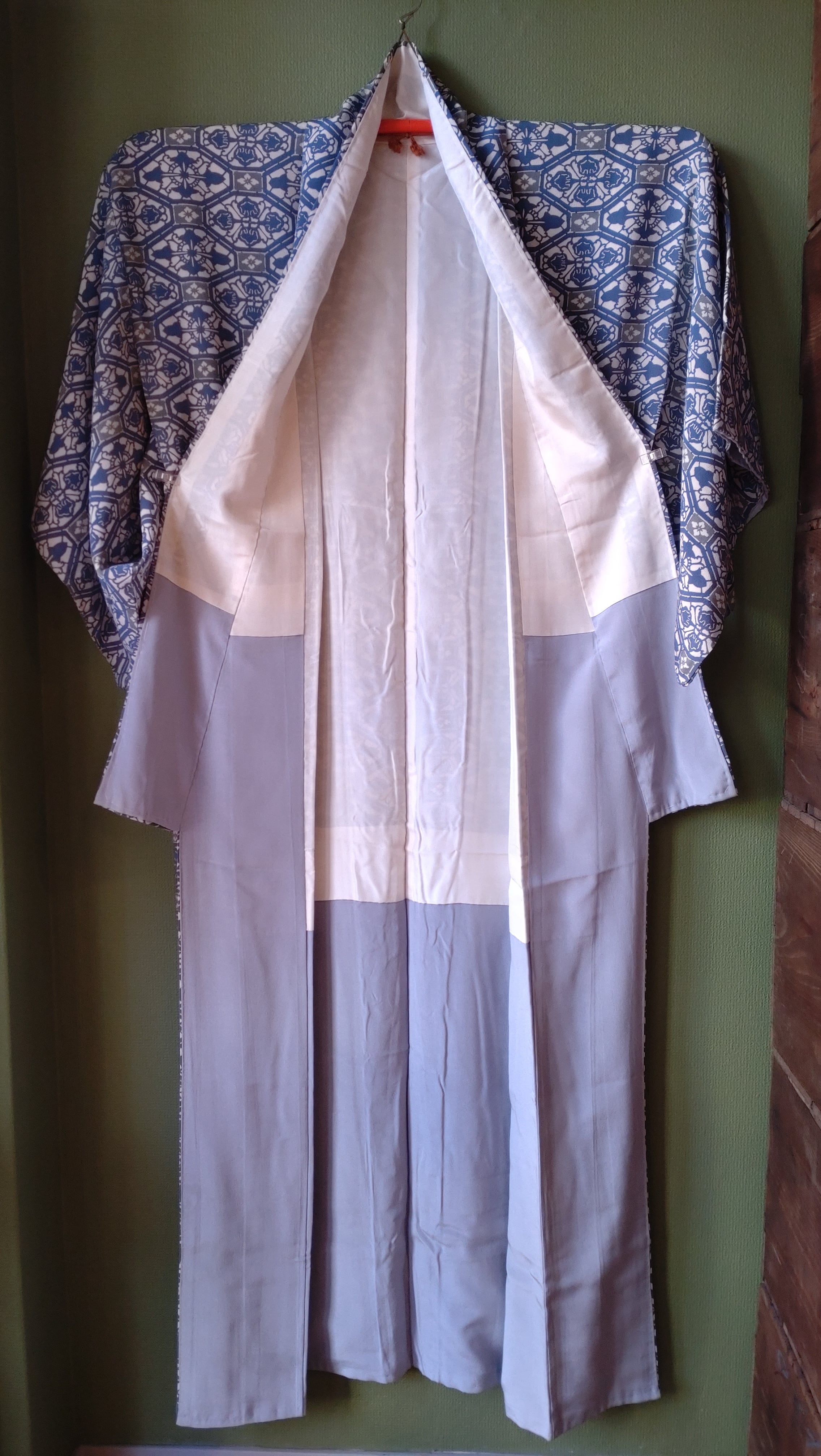 型染めの袷着物です。ブルーと灰色の柄に八掛の水色が爽やか。
