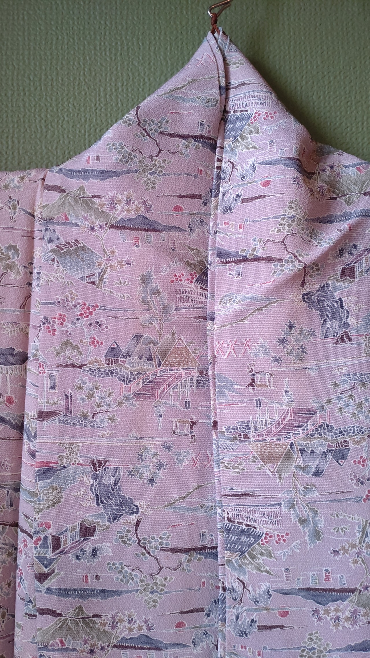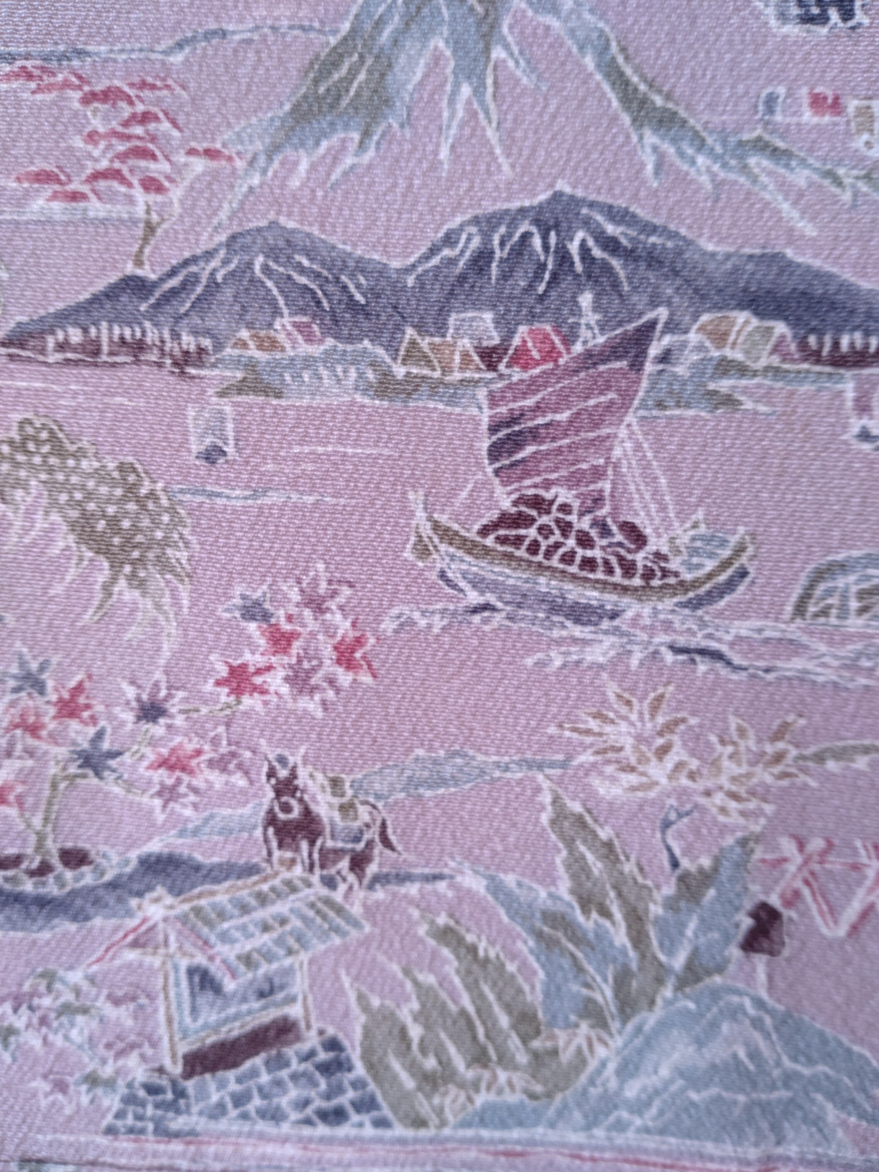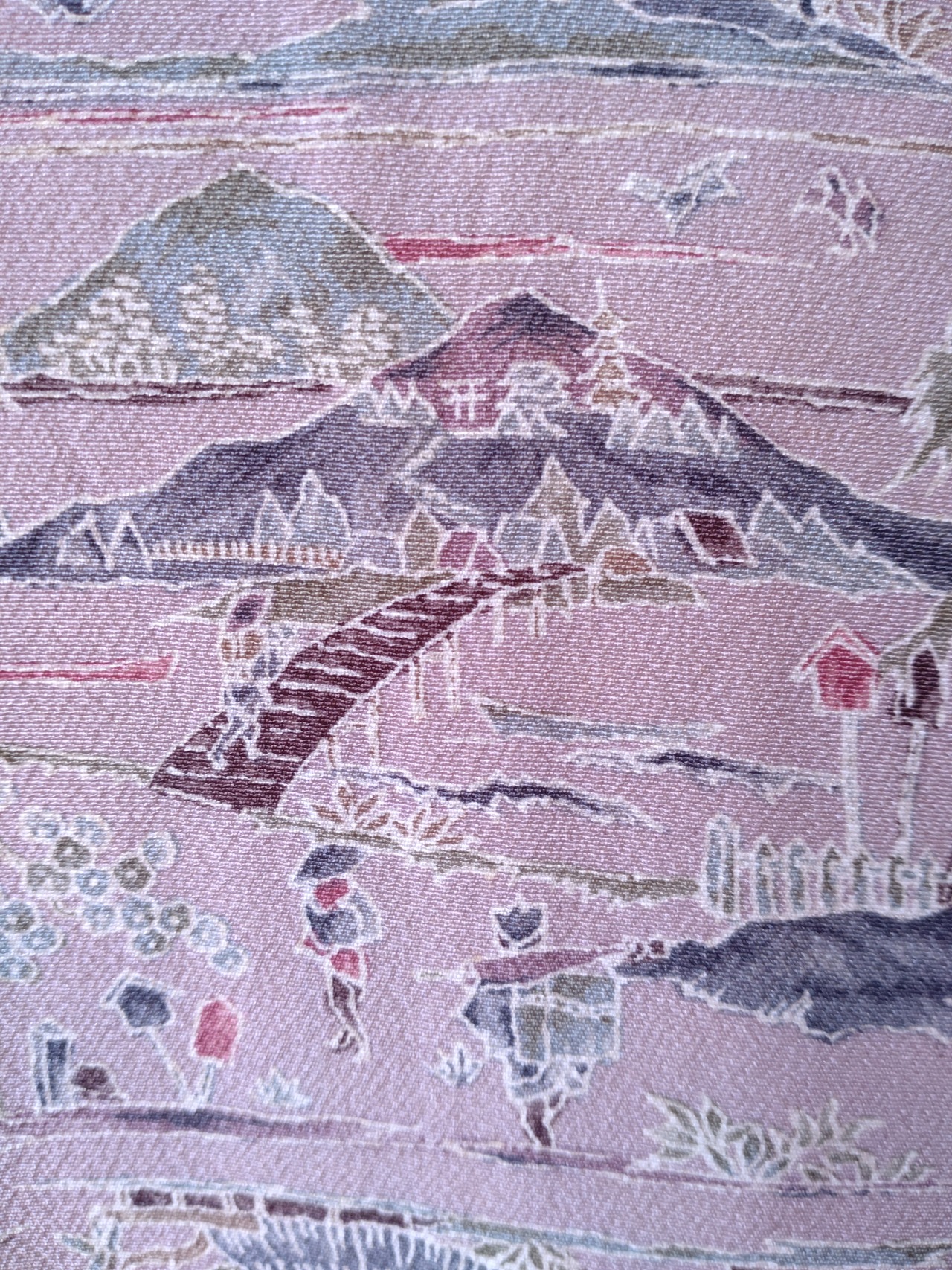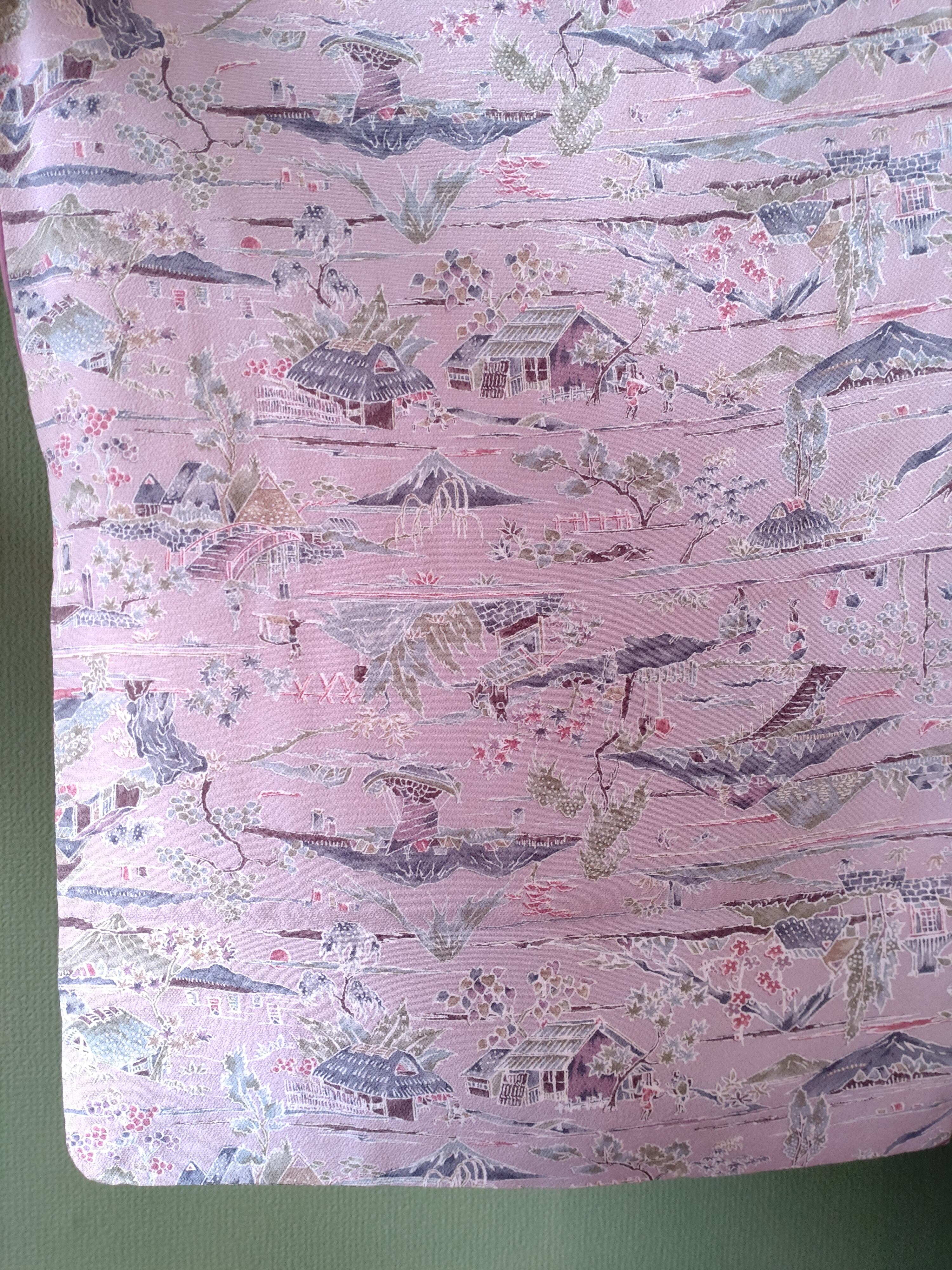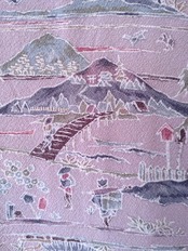 ちりめんの袷着物です。ラベンダーカラーに山々や人々の生活が描かれた長閑なデザインです。