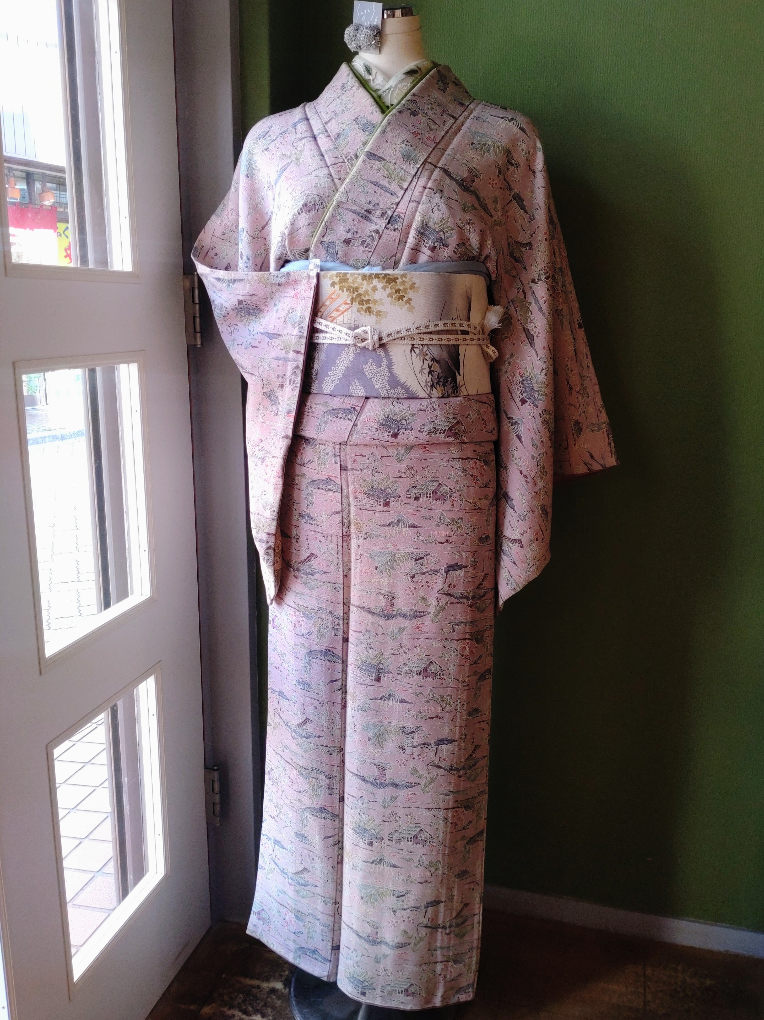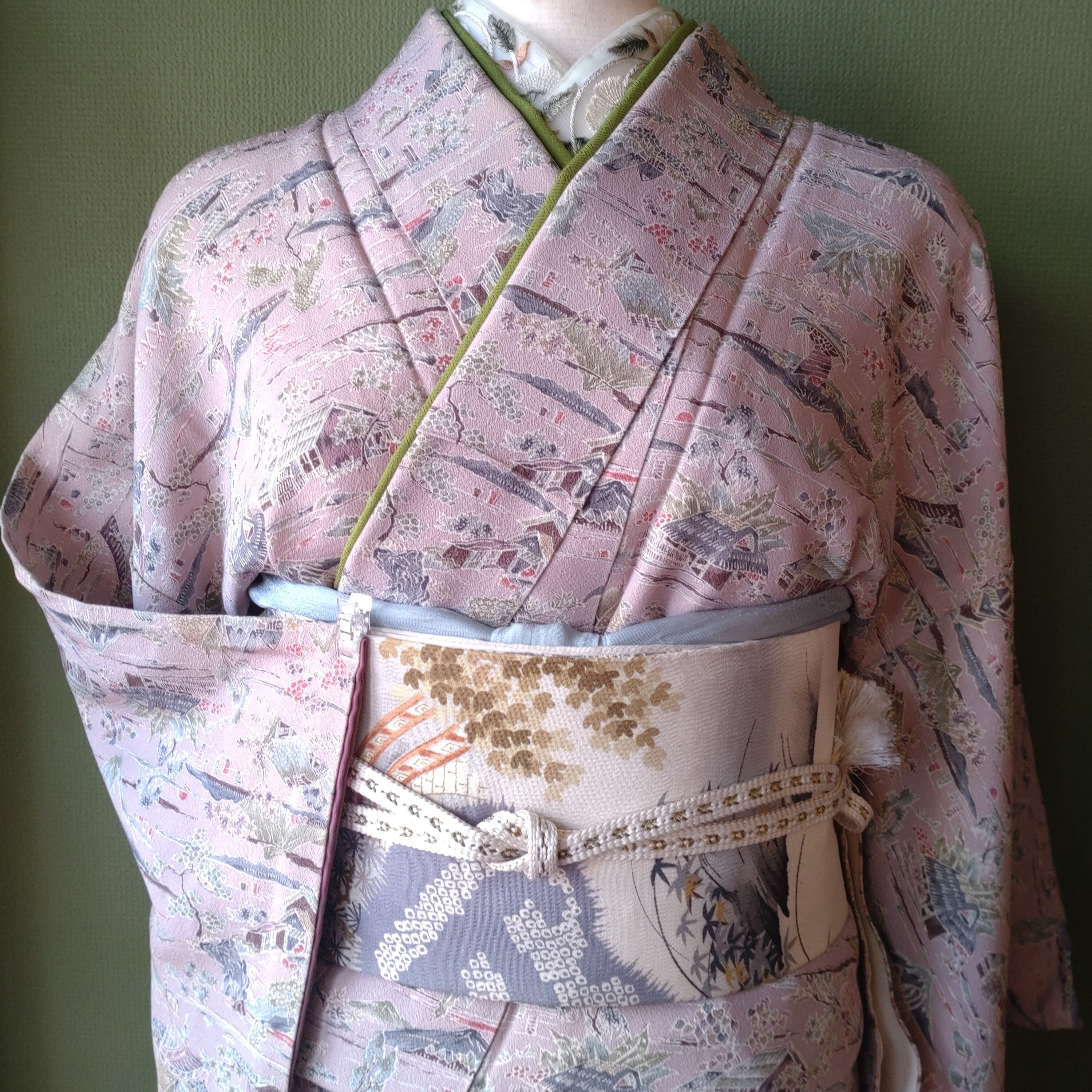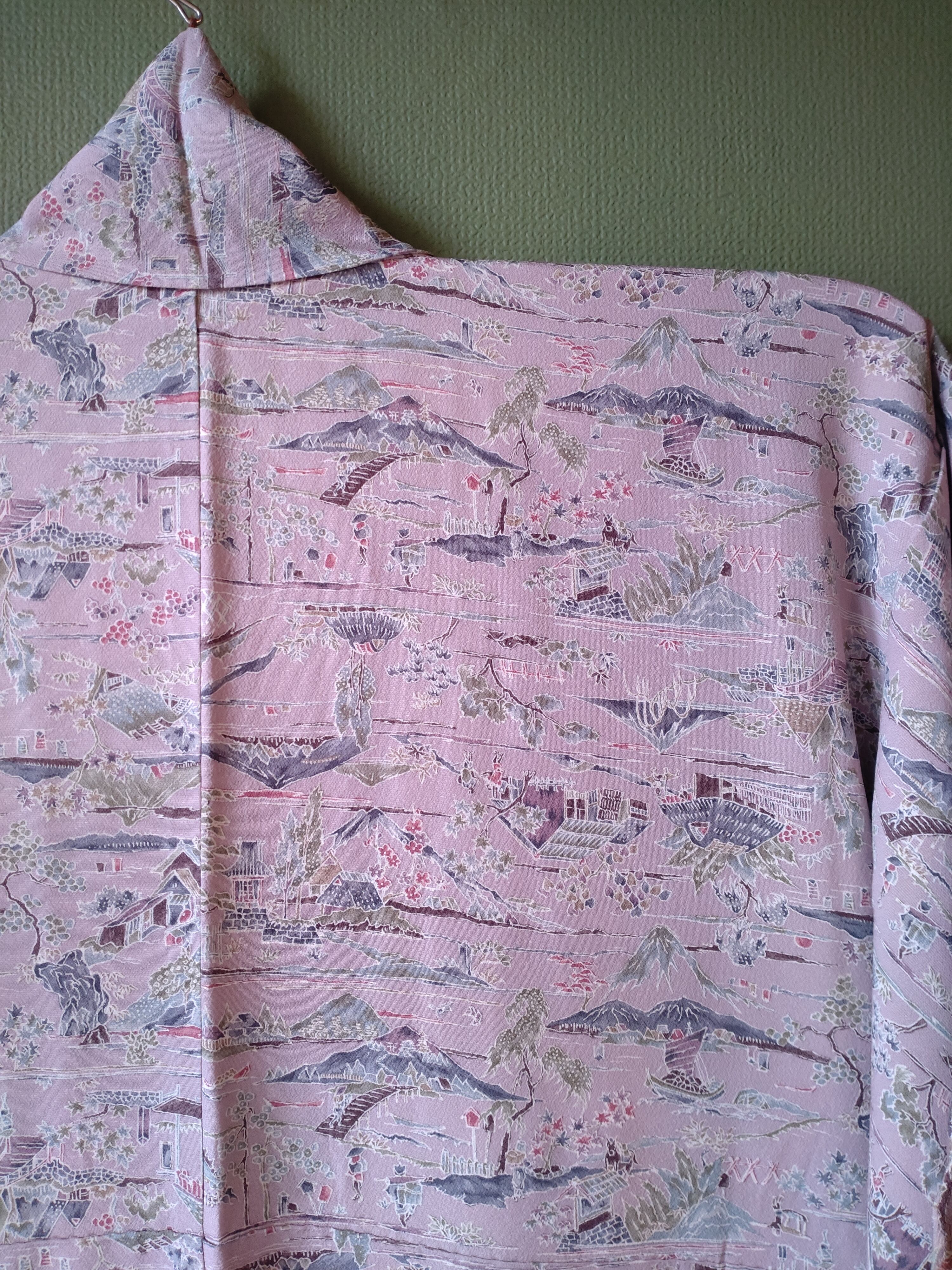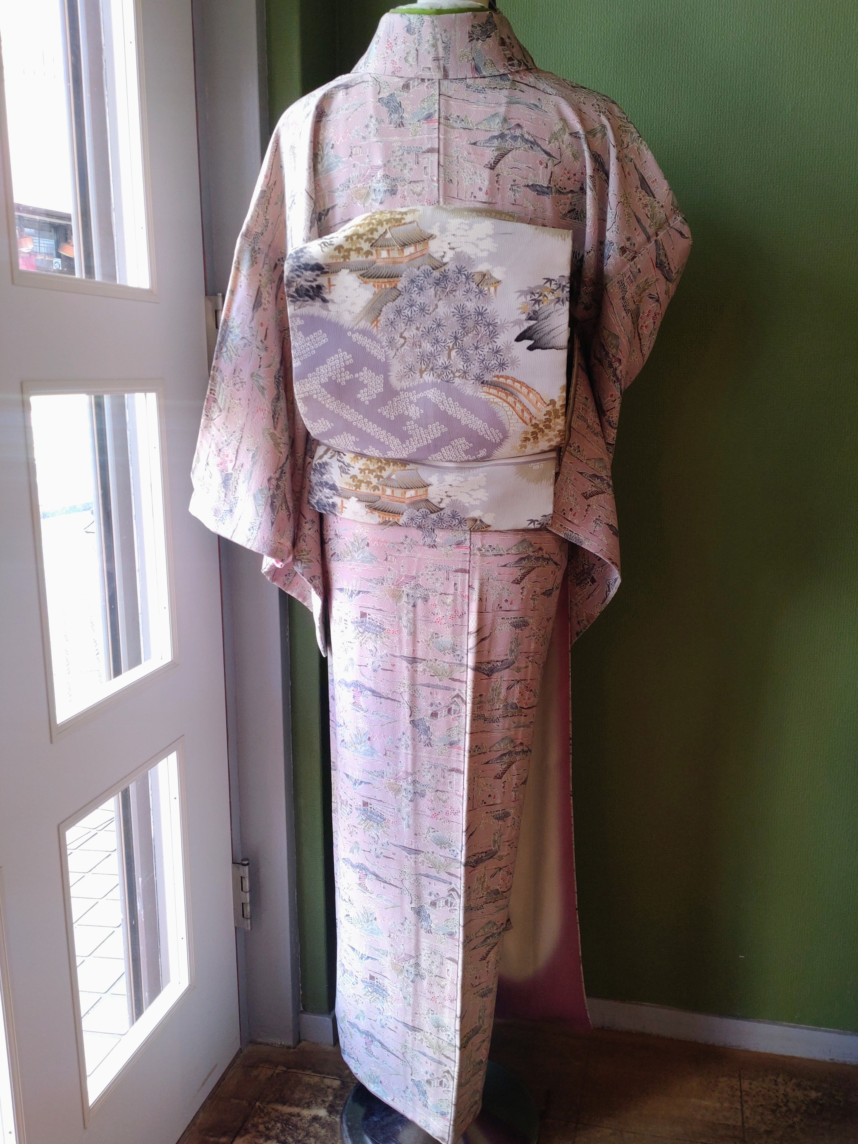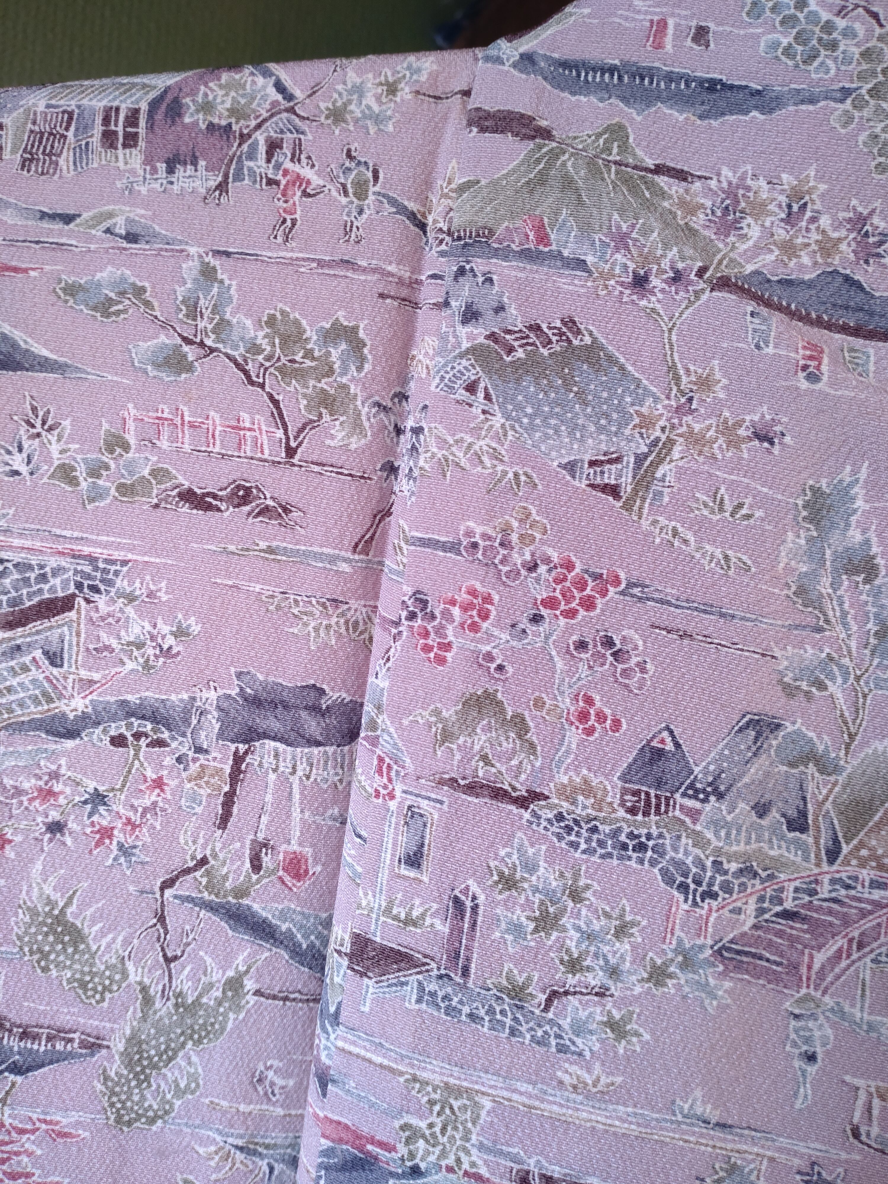 ちりめんの袷着物です。ラベンダーカラーに山々や人々の生活が描かれた長閑なデザインです。