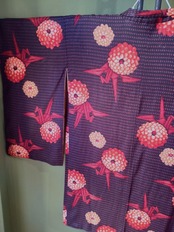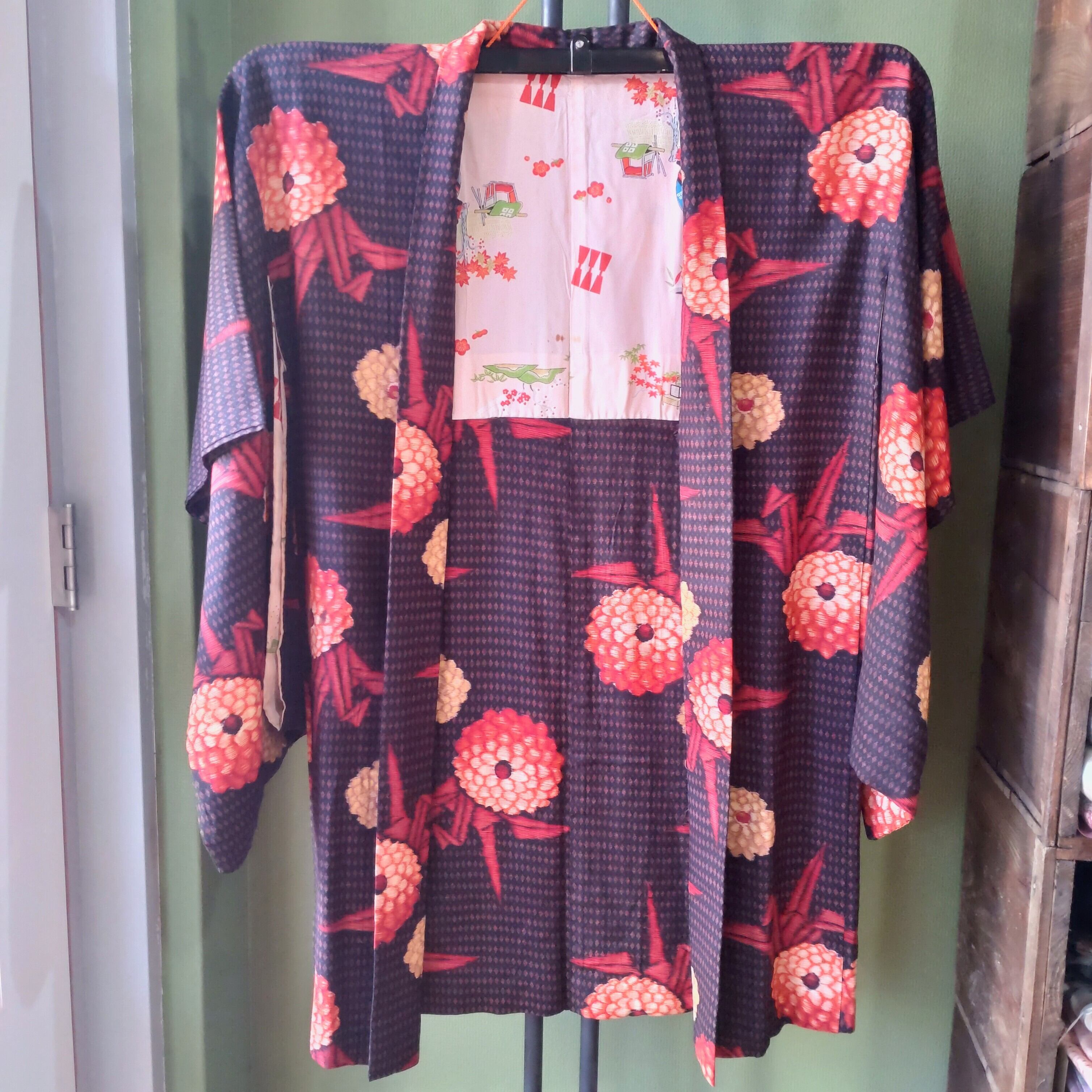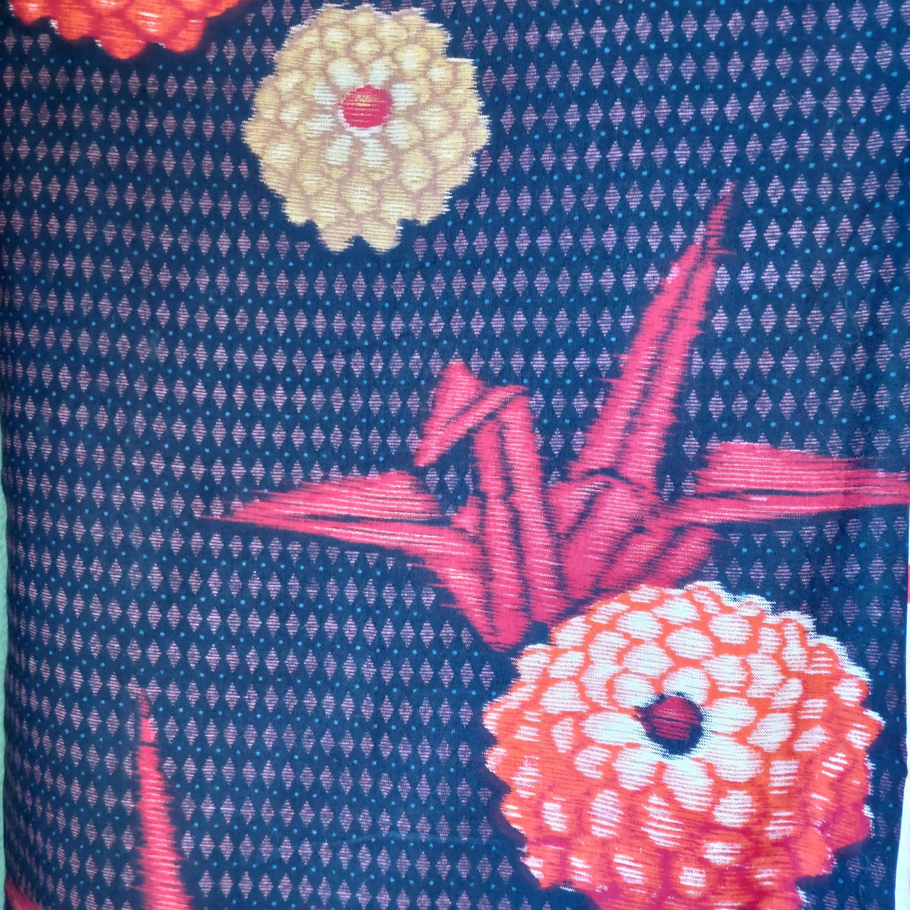 華やかな折り鶴とダリアのような花のモチーフが黒地のダイヤ柄に浮かび上がり、