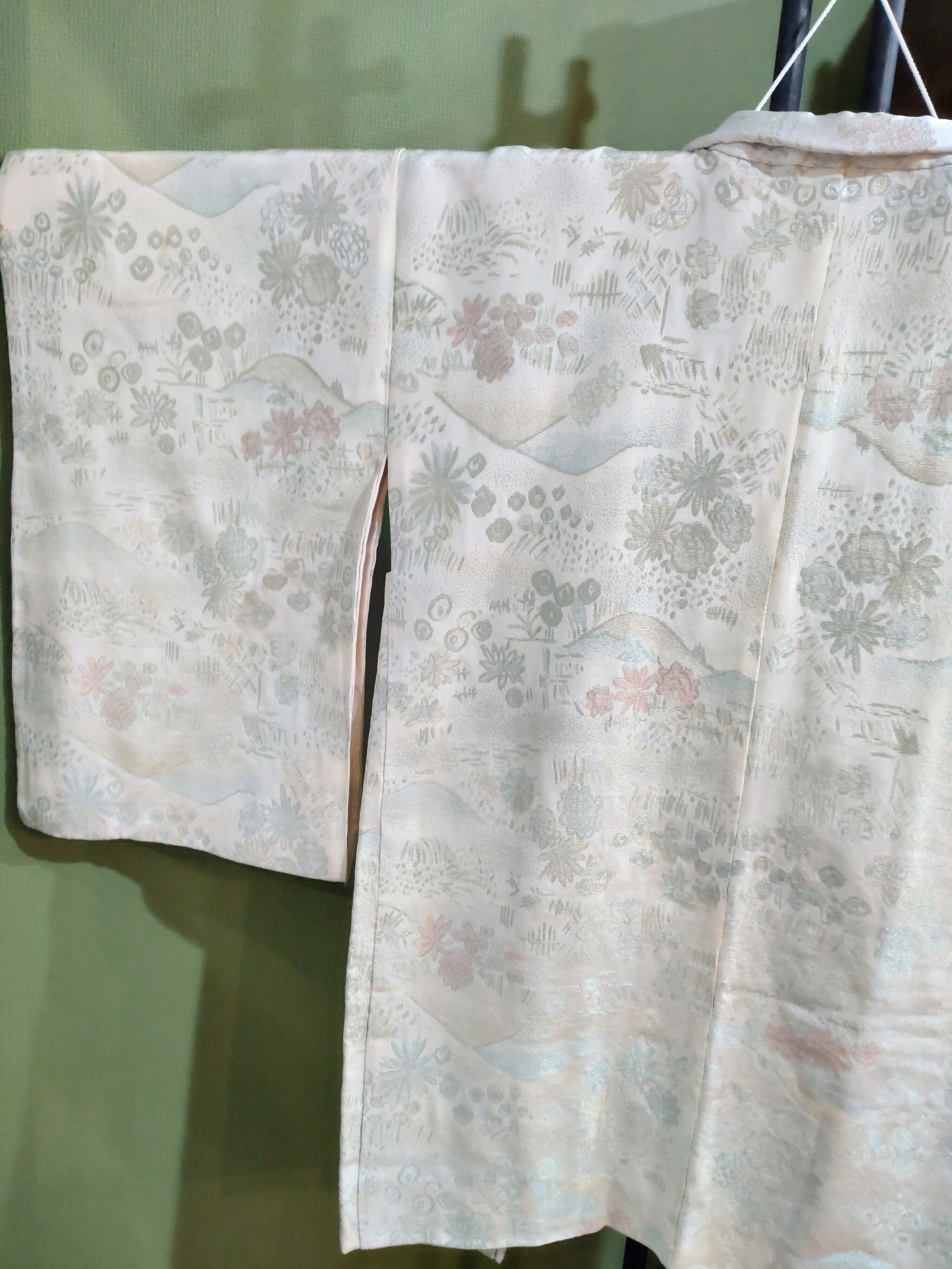 白地に控えめな金銀糸が織り込まれた、メレンゲにアラザンがかかったような可愛らしさと上品さのある羽織です。