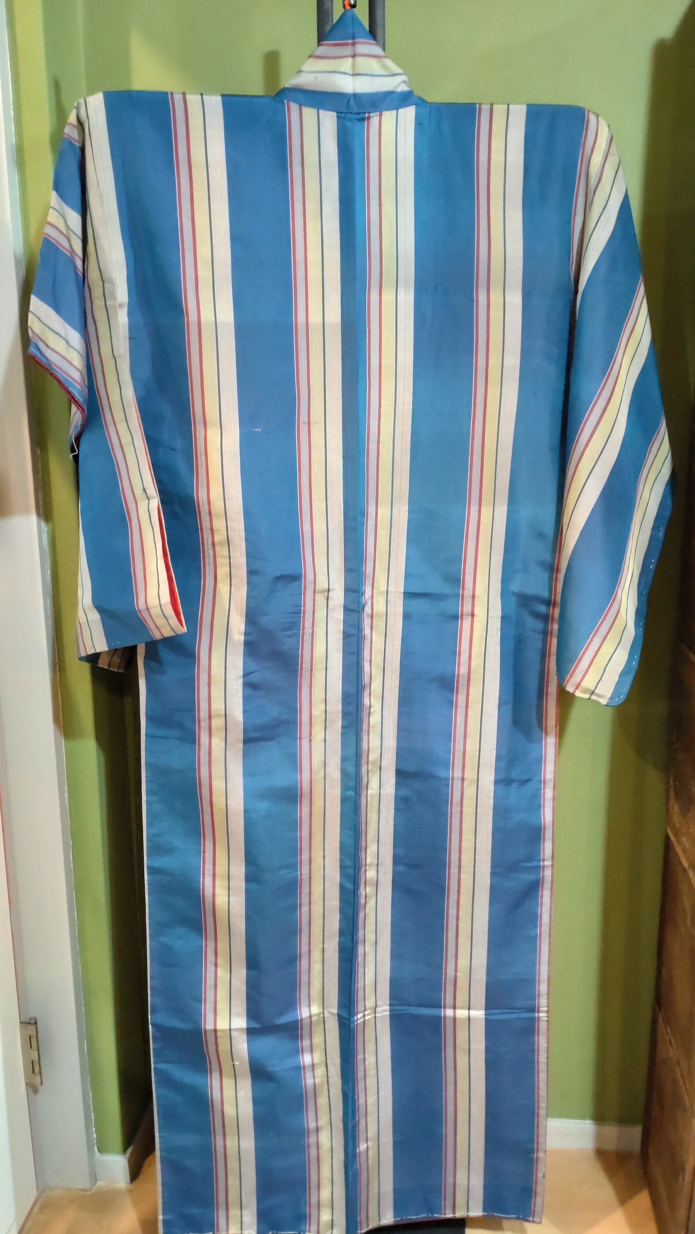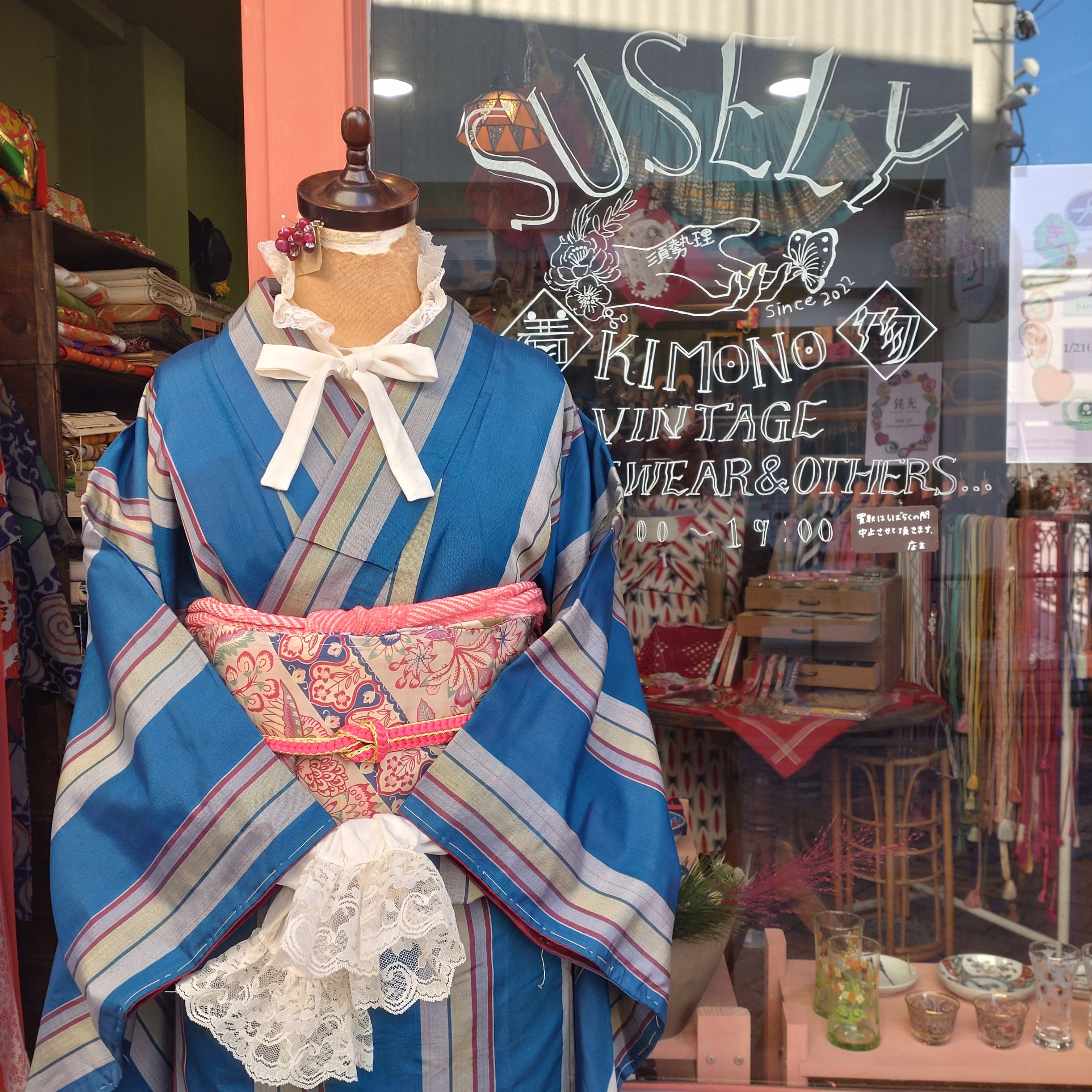 明るいブルーと太めのストライプが目立ちながらも色々な帯と合わせやすそうです。