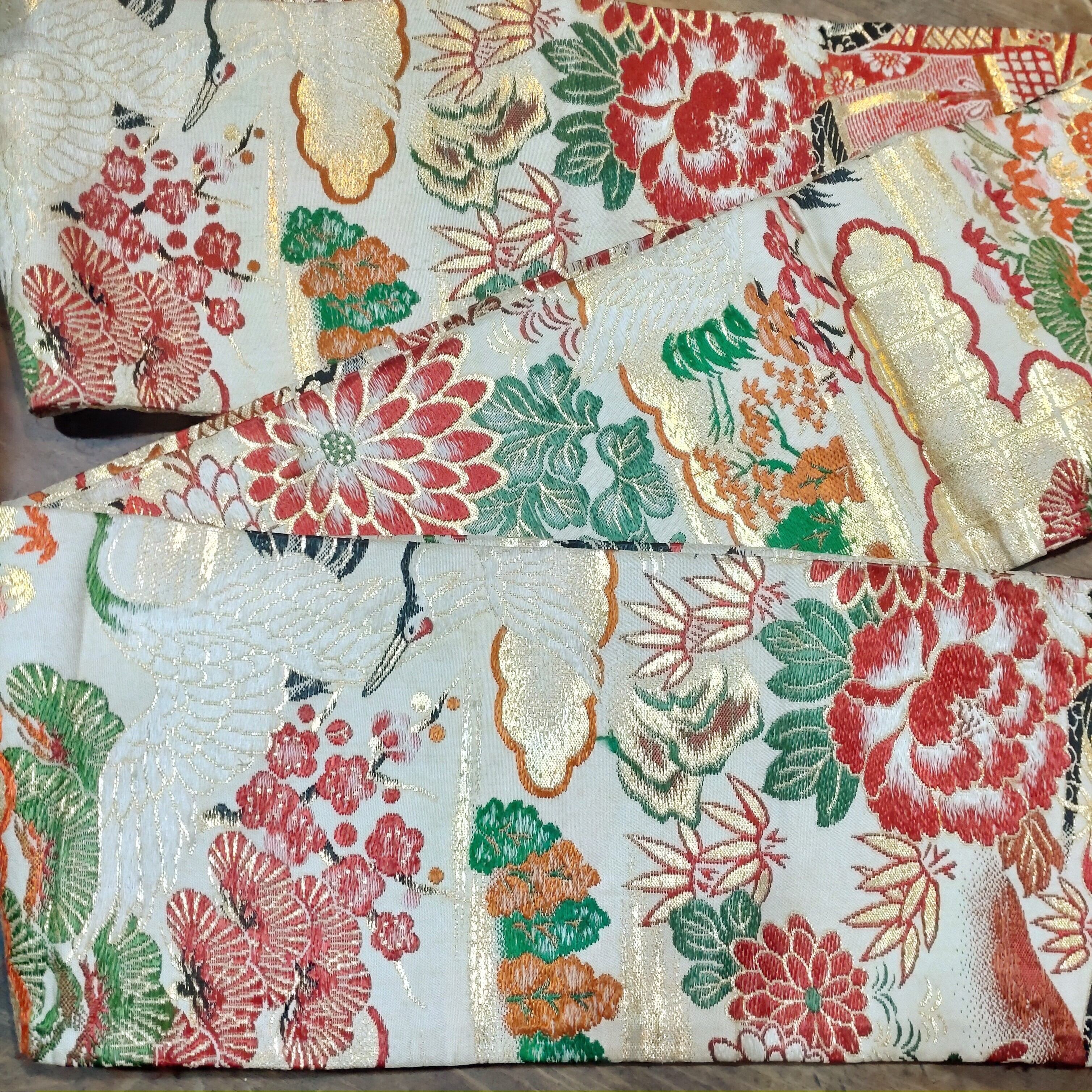 前の持ち主が袋帯を半幅に仕立て直したと思われます。キラキラ豪華な帯をデイリーユースで気軽に締められちゃうお得さ。