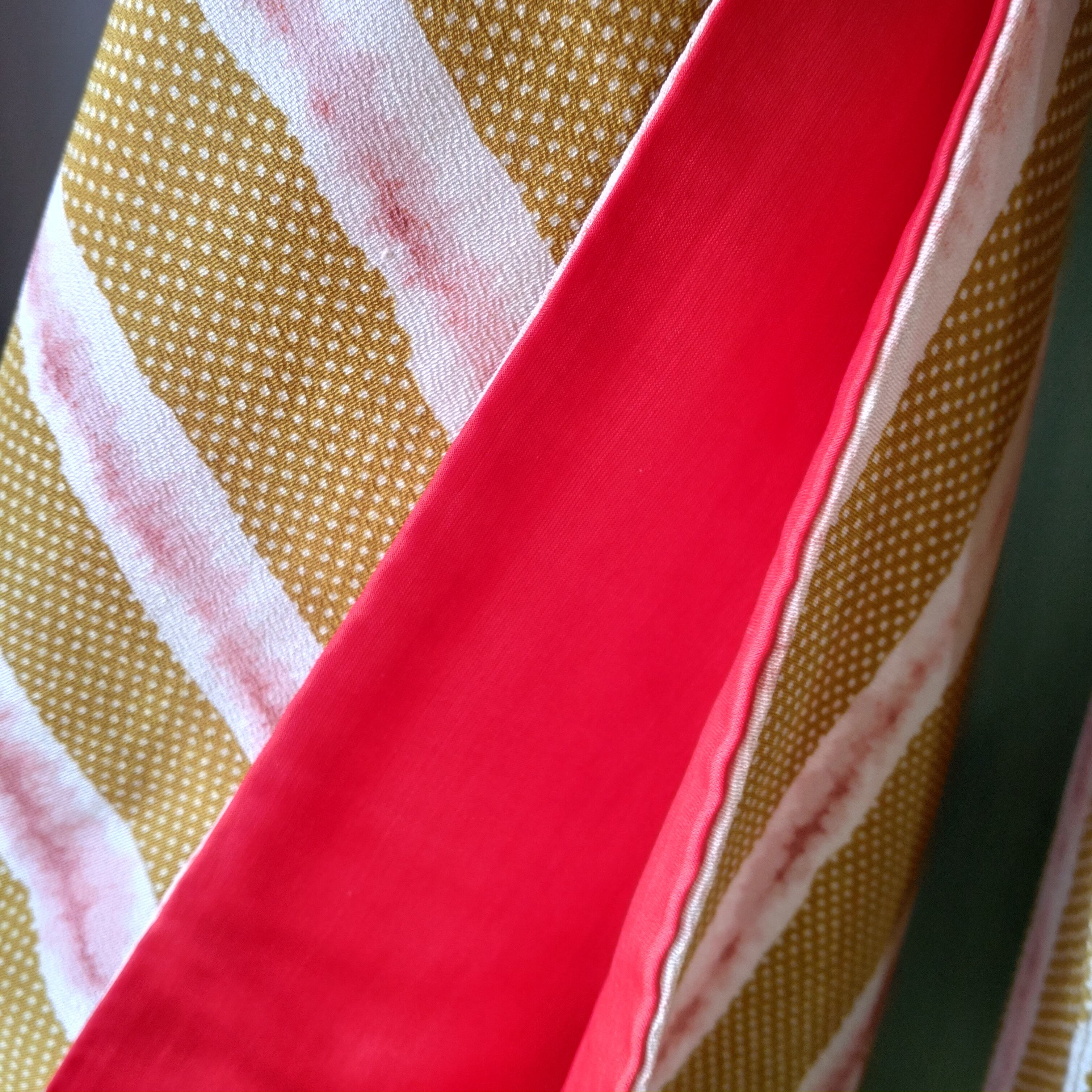 色合いも、破いたような白い線も、全てが可愛らしいデザイン。昔ながらの軽い絹で、さらりとした着心地です。