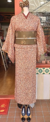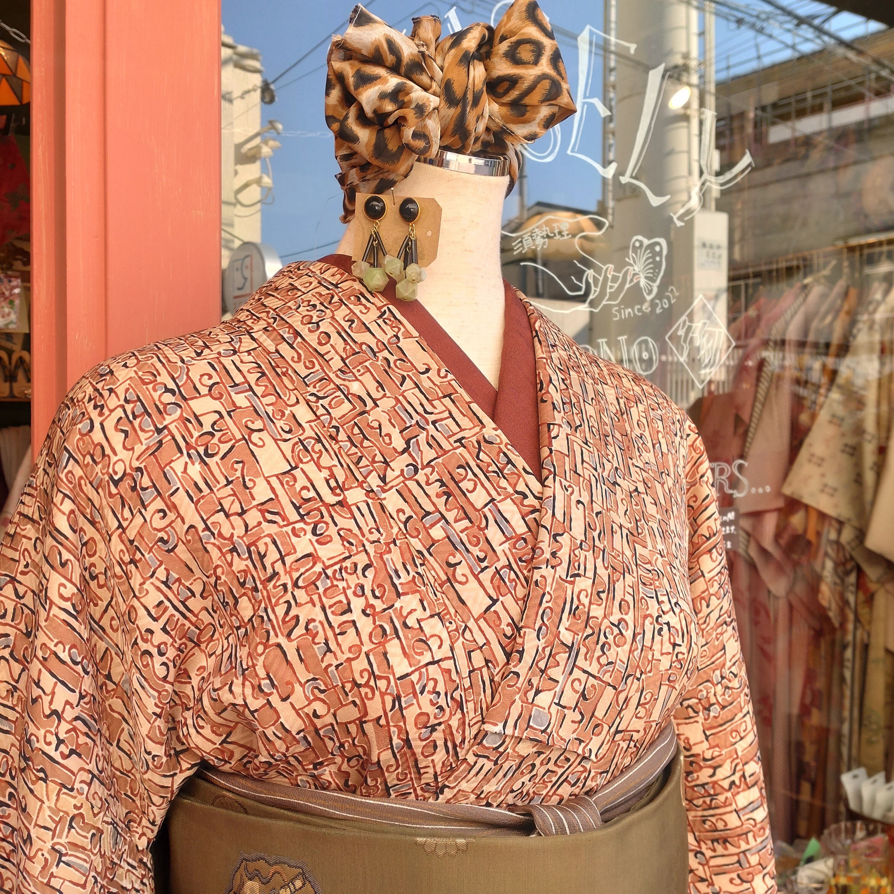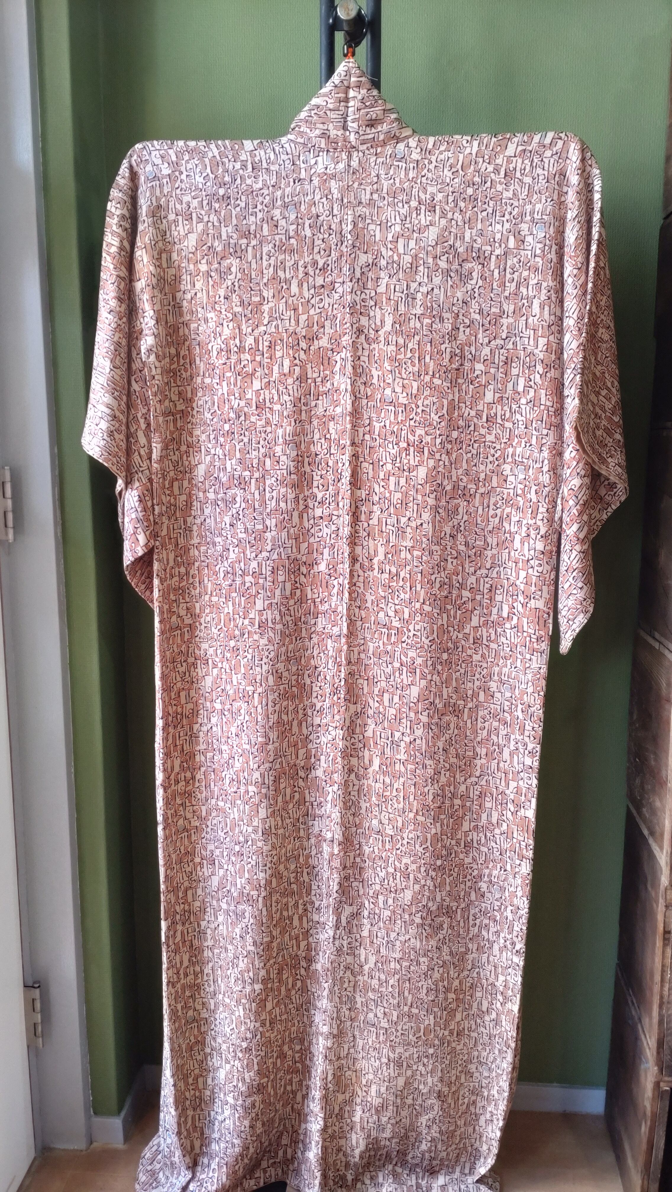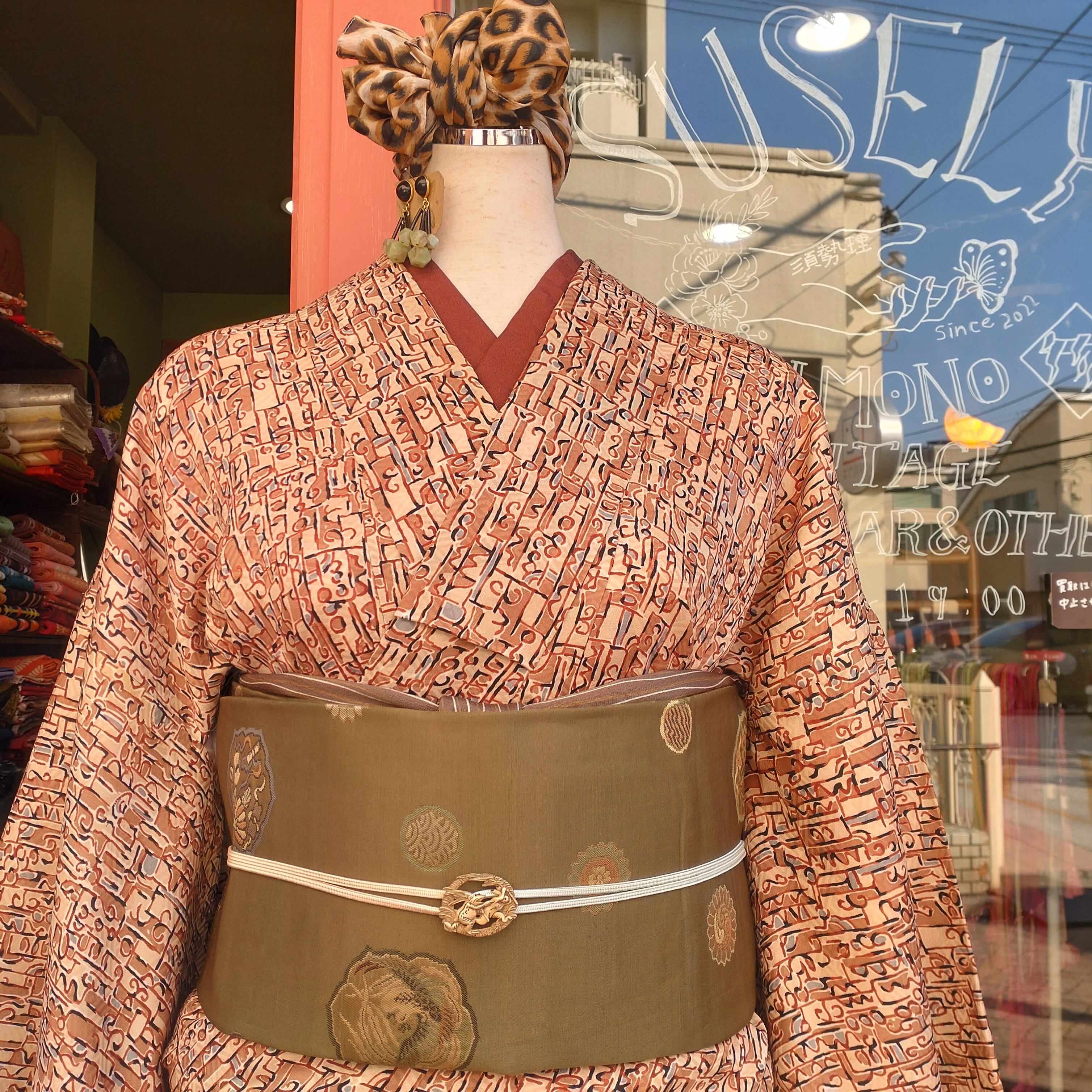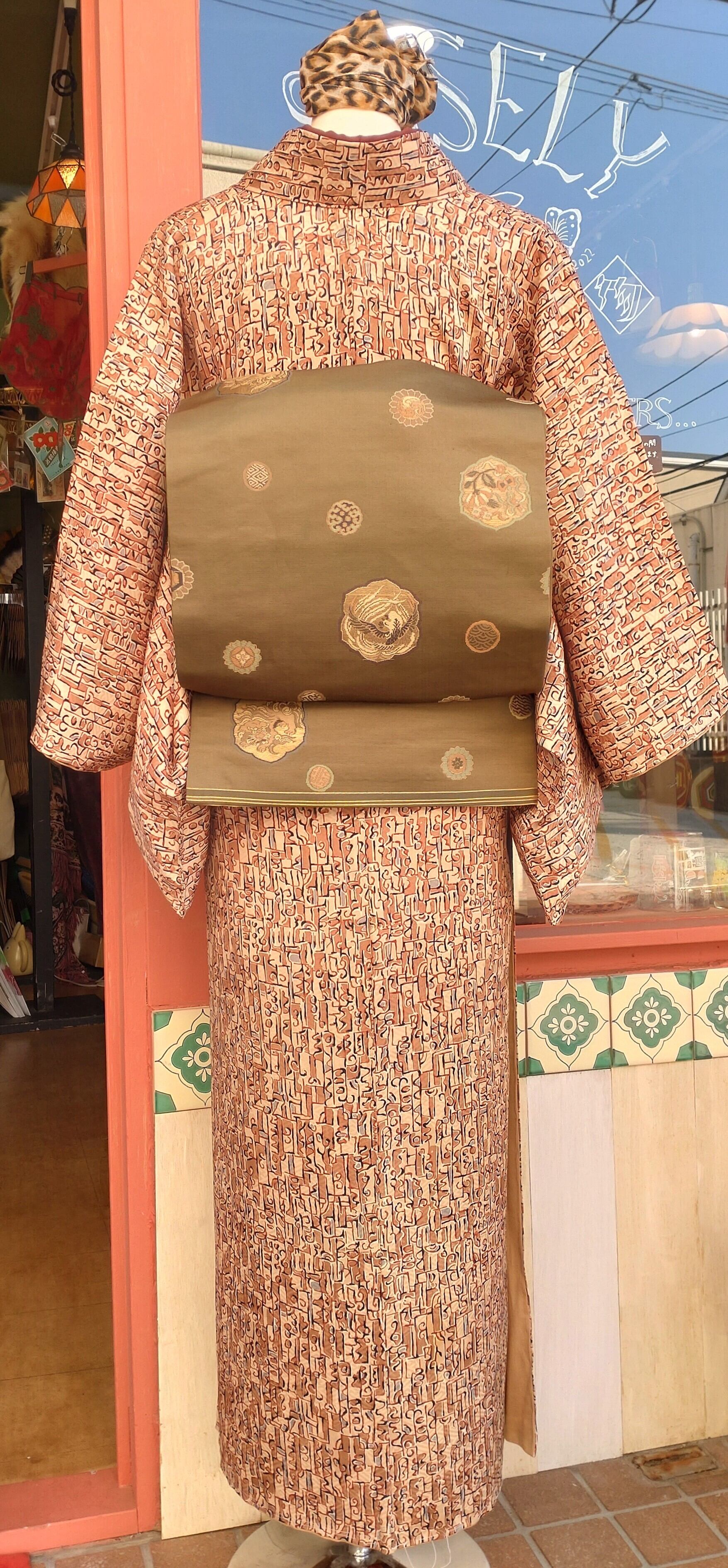 不思議な文字のような柄の袷着物です。