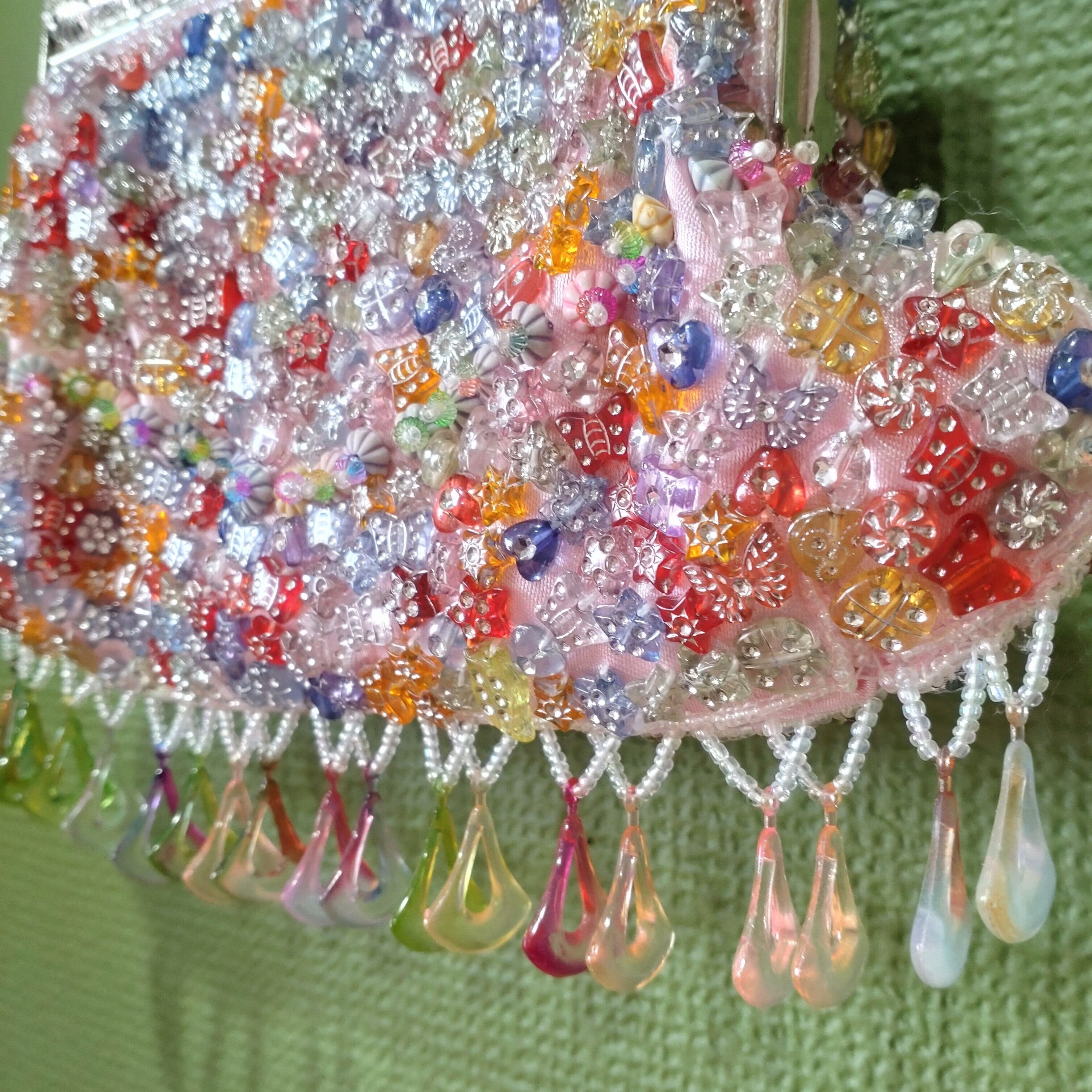 おもちゃ箱をひっくり返したようなビーズのパーティバッグです。揺れるフリンジの部分が光に透けるととっても綺麗。長いショルダー用のチェーンも付いています。