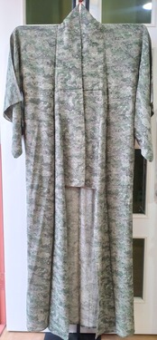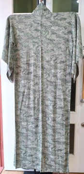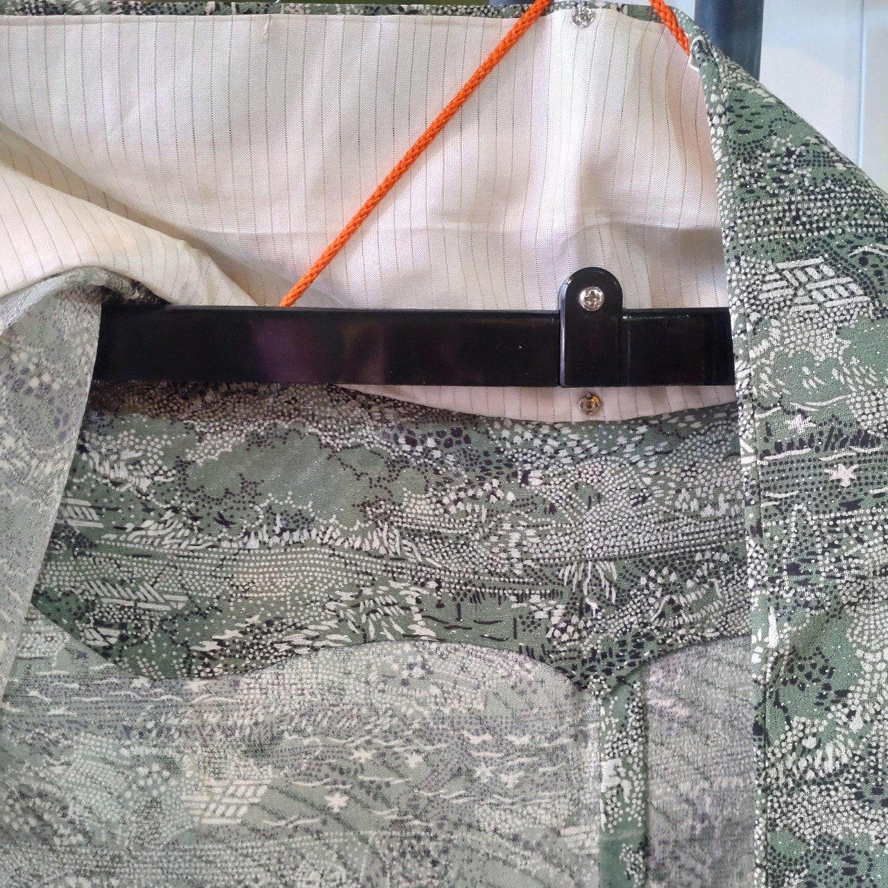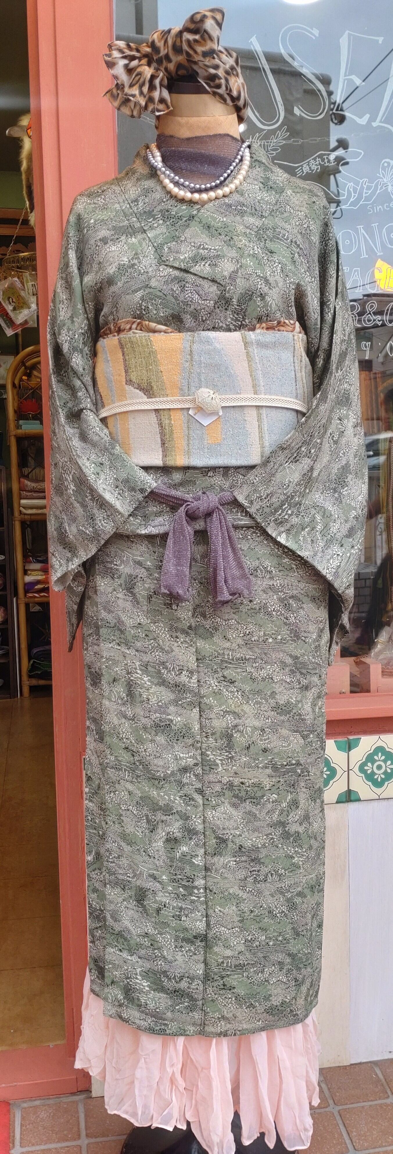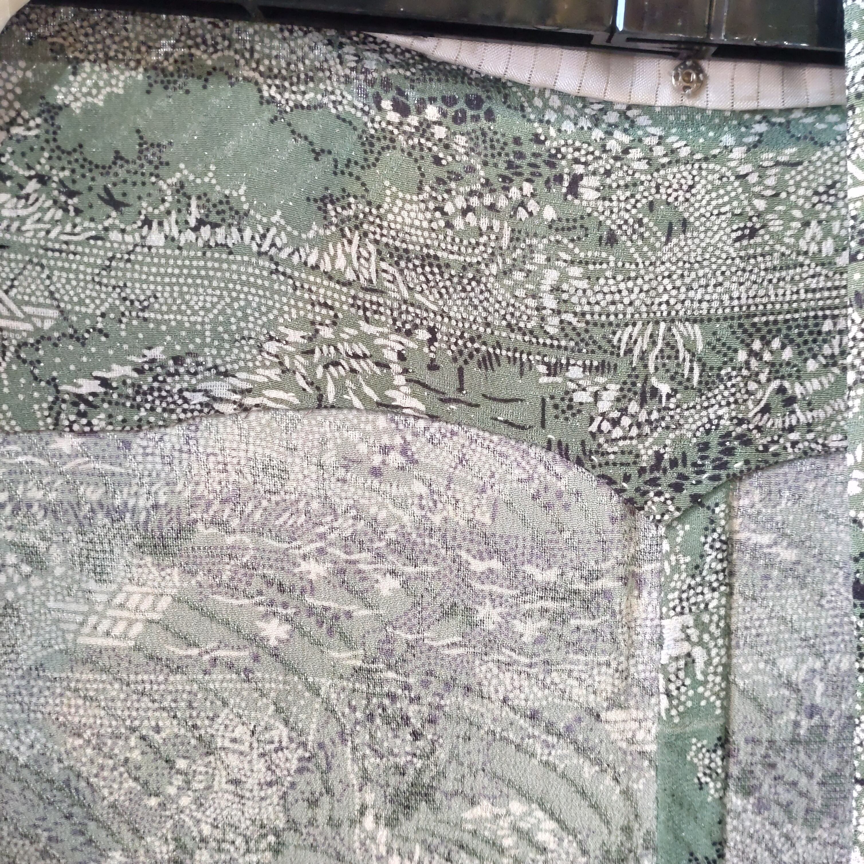 風景が細かく表現された型染めに、近くで見ると銀の染料でキラキラ雪が降っているようにも見えます。美しい故郷の思い出でしょうか。