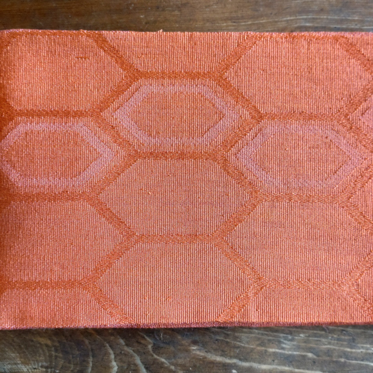 表地は菱形とリボンの様な織模様で、裏側は無地かと思いきや亀甲文様です。無地の方を使っても安っぽくならないので幅広くつかえます。