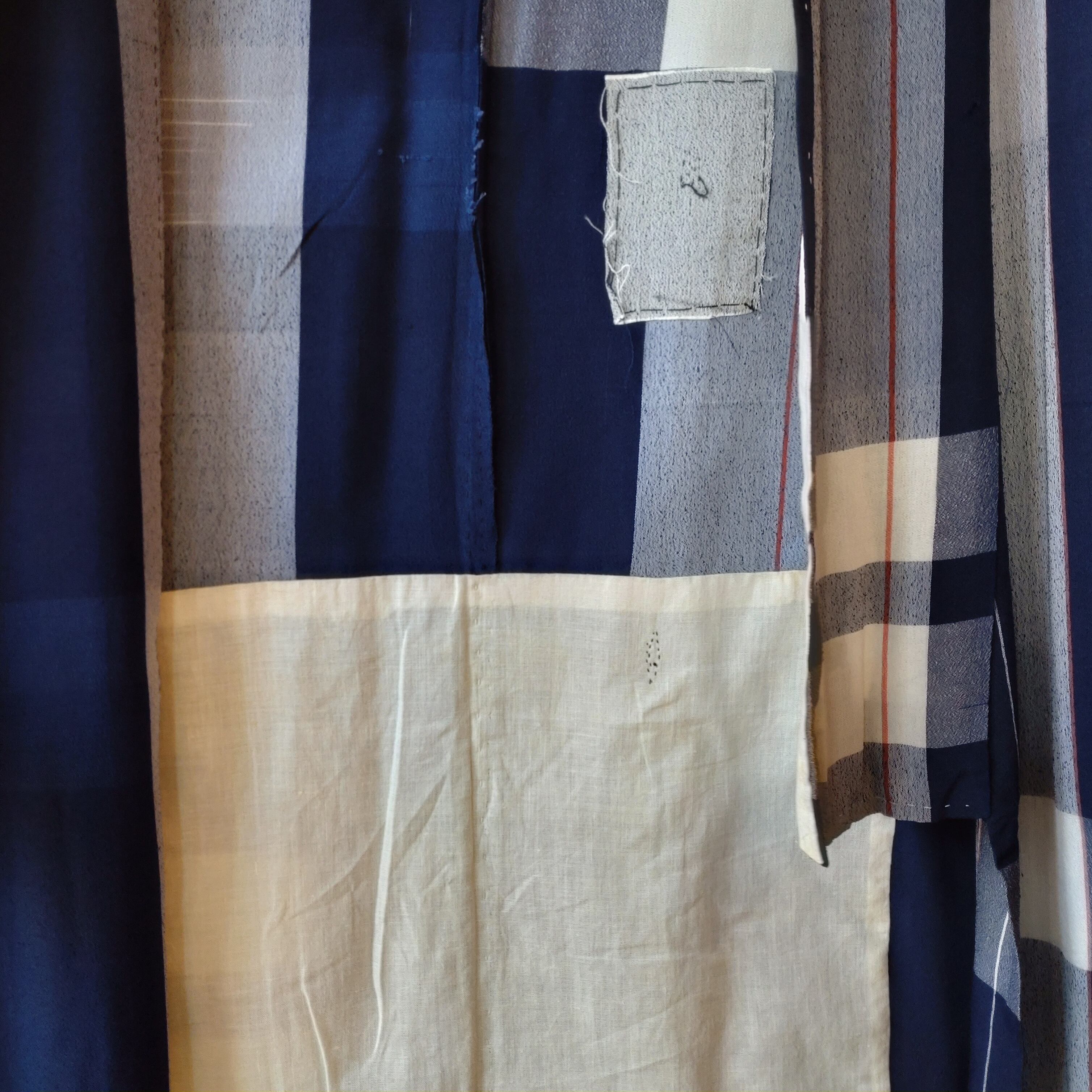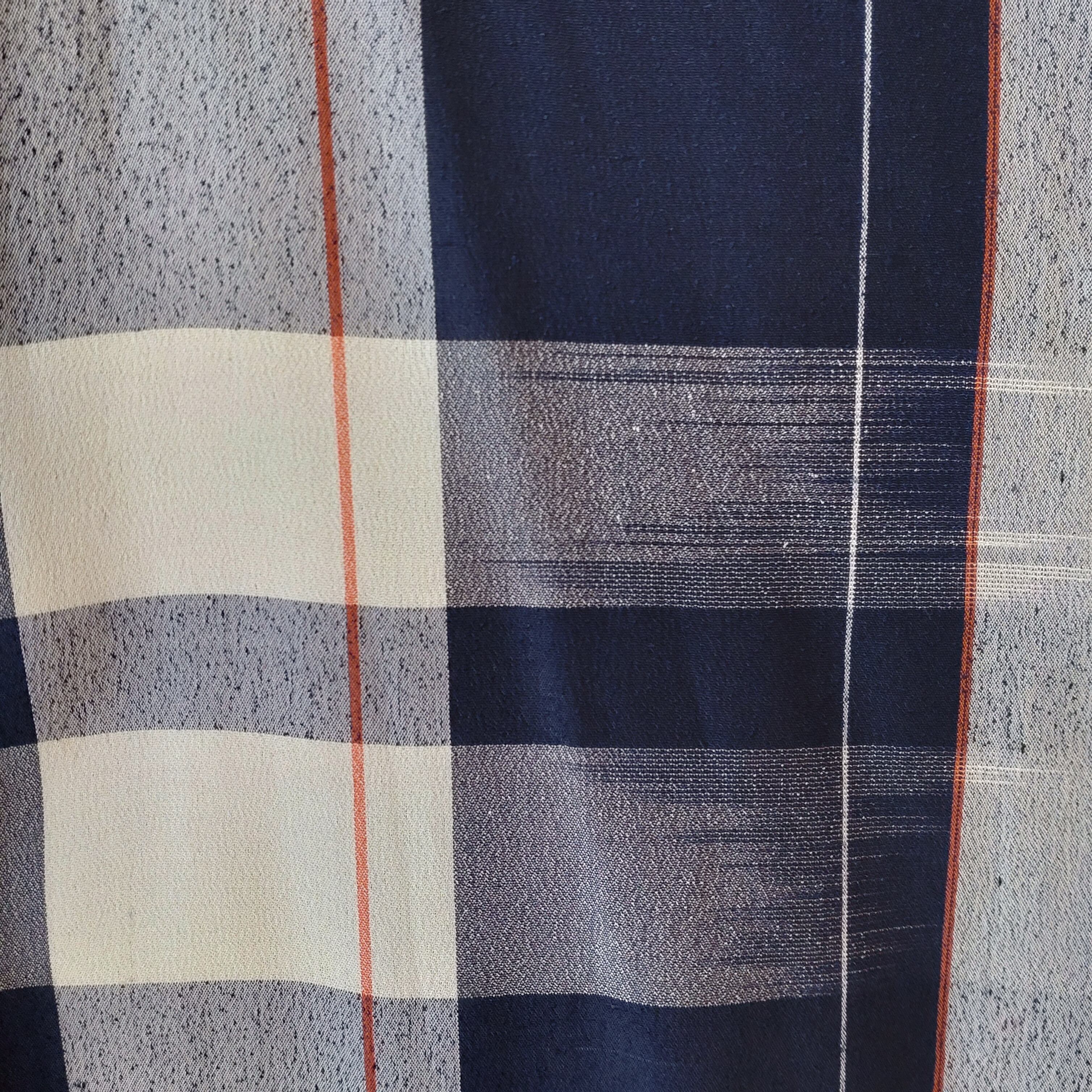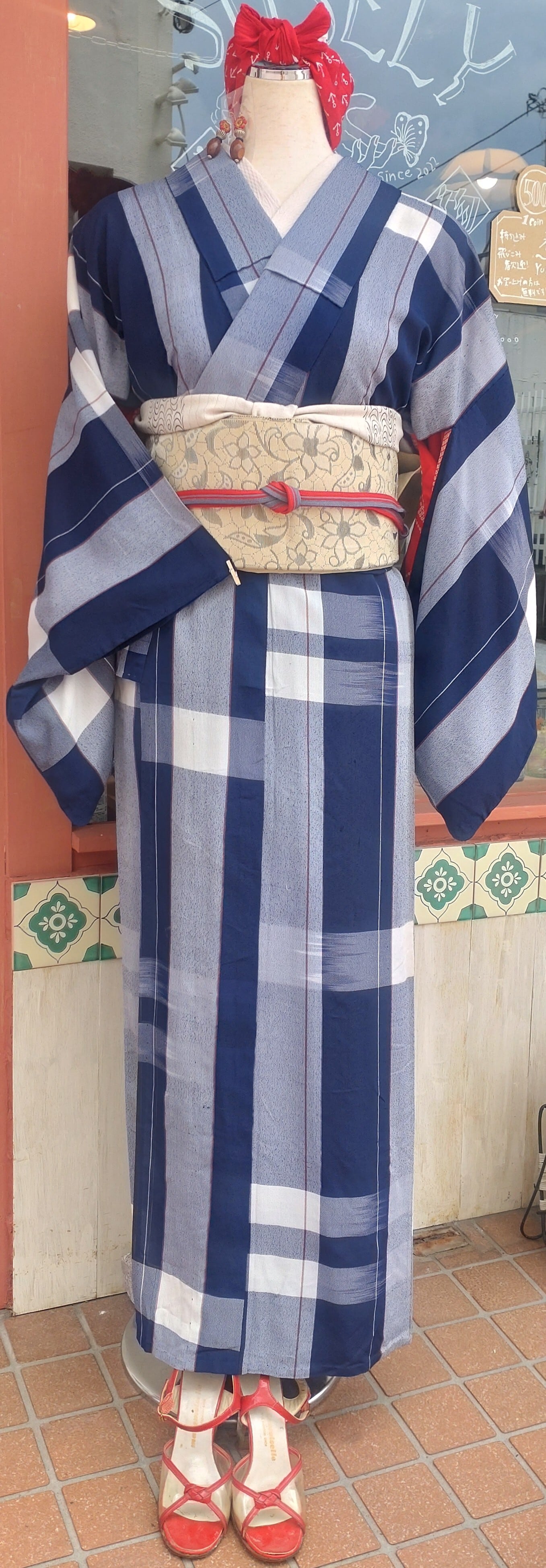 大きな絣のチェックが印象的なアンティークの夏銘仙です。ネイビーに細く走る赤のラインが年齢問わず着て頂きたい可愛さです。