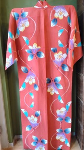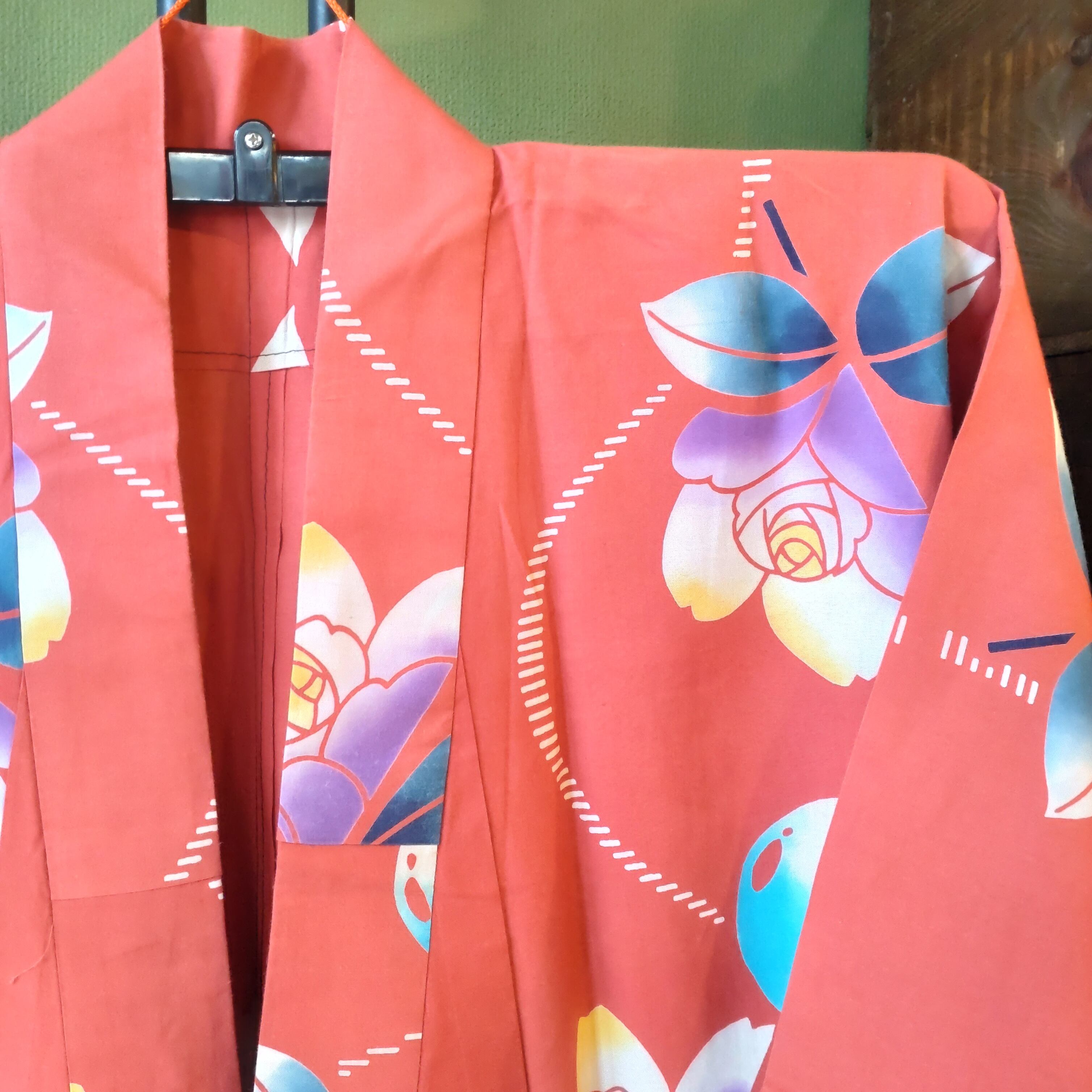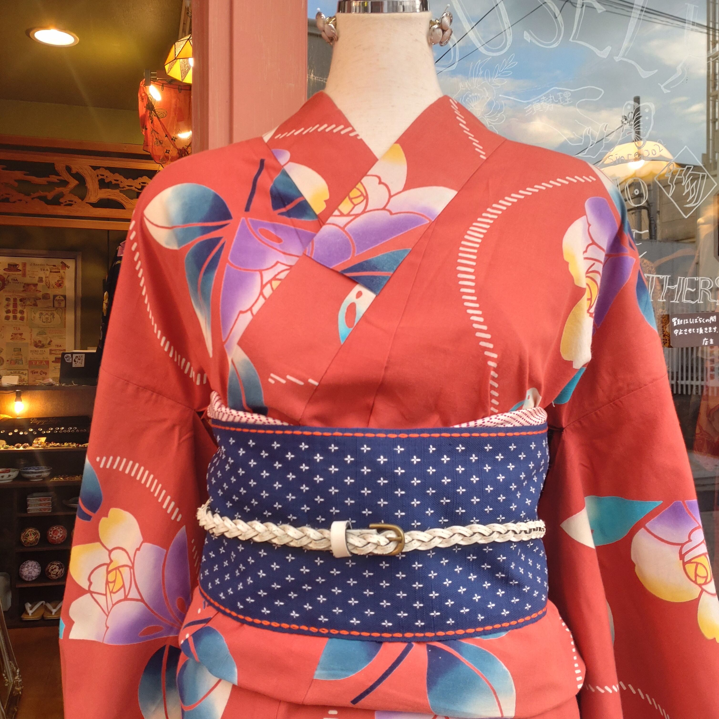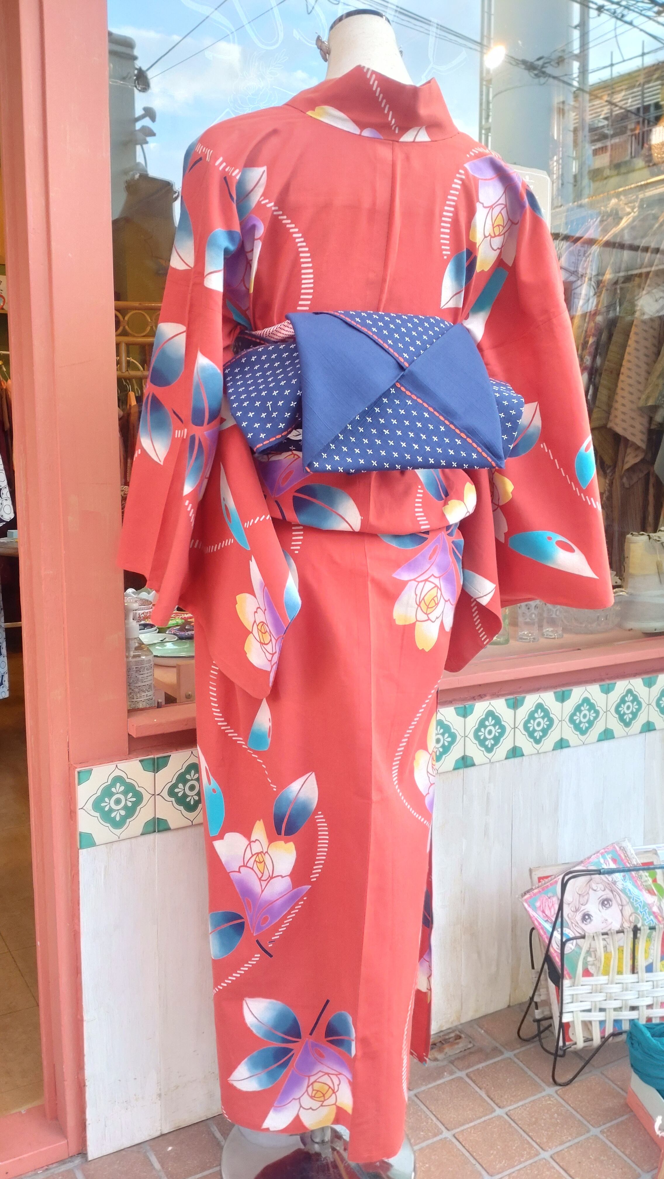 注染の現代浴衣です。真っ赤でも朱色でもでもないまろやかな赤に、暮れなずむ空の色のような薔薇が印象的です。