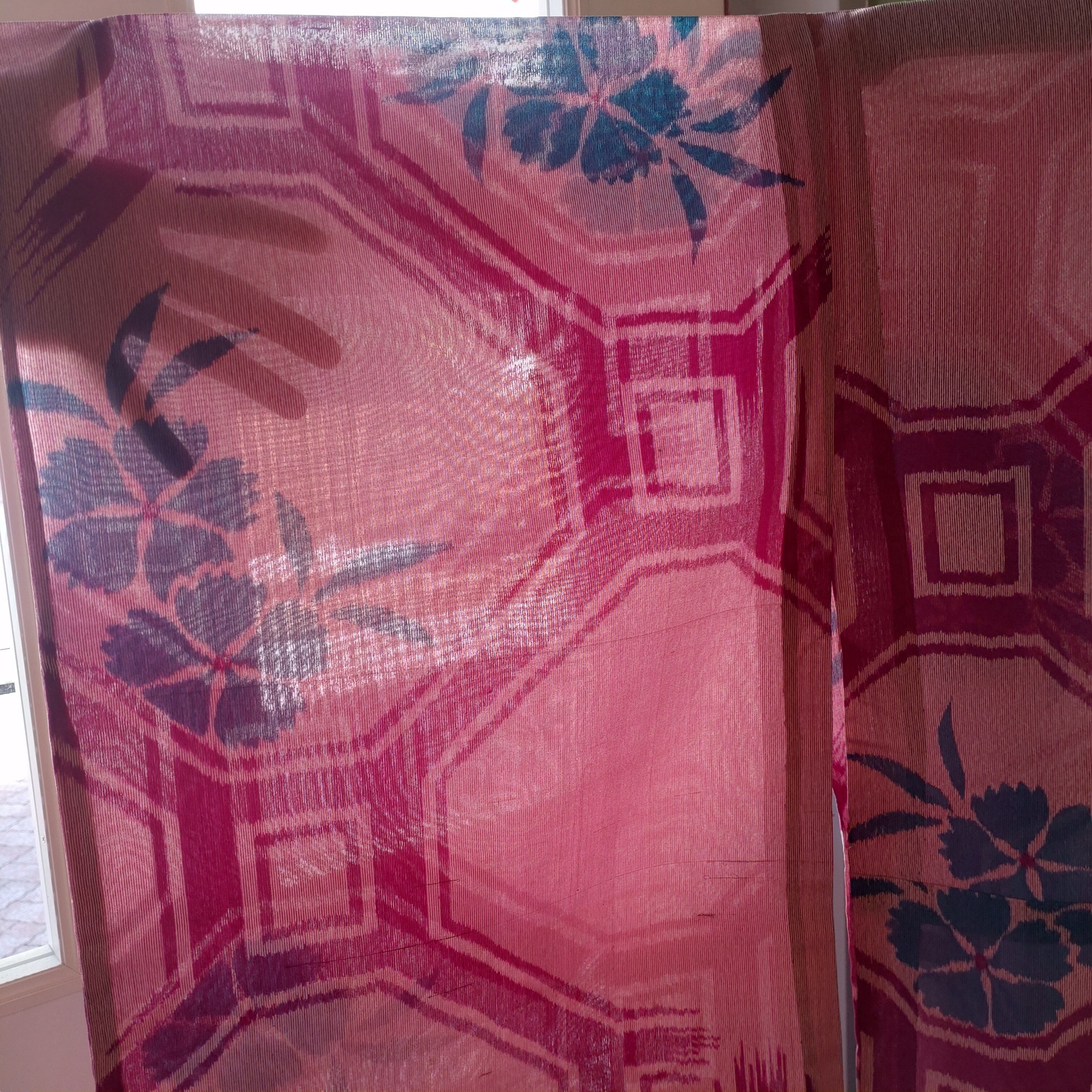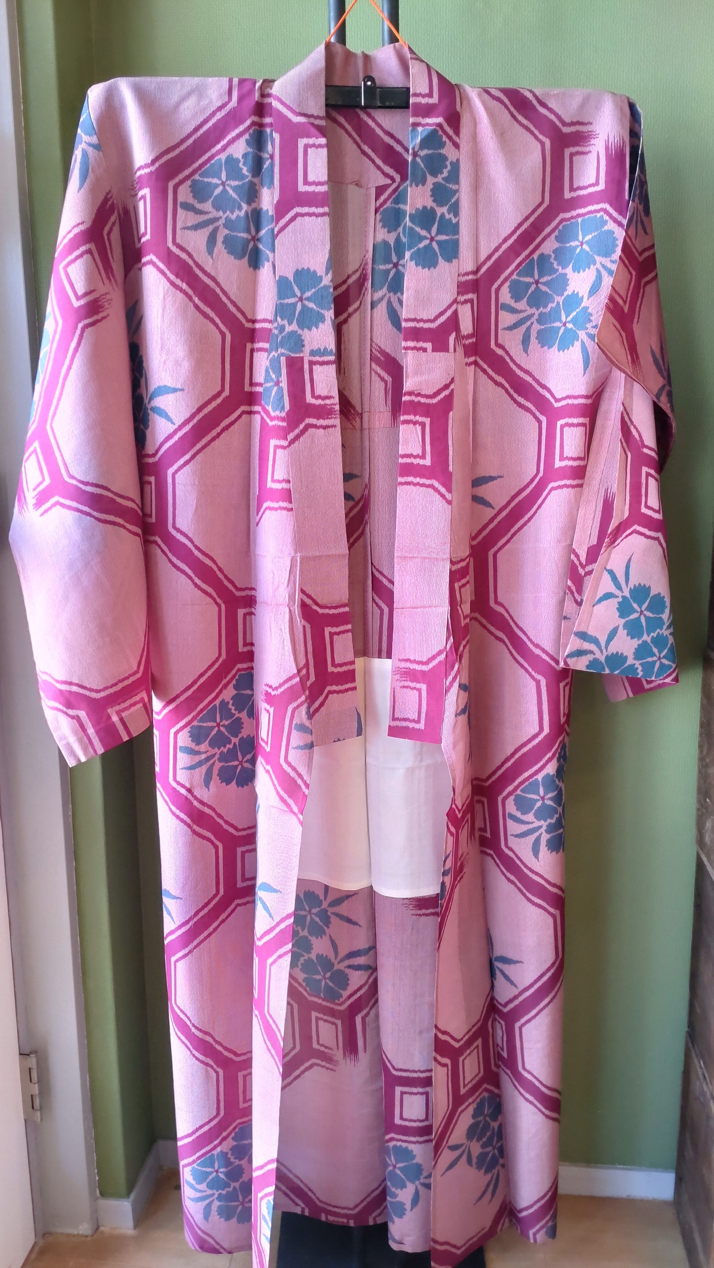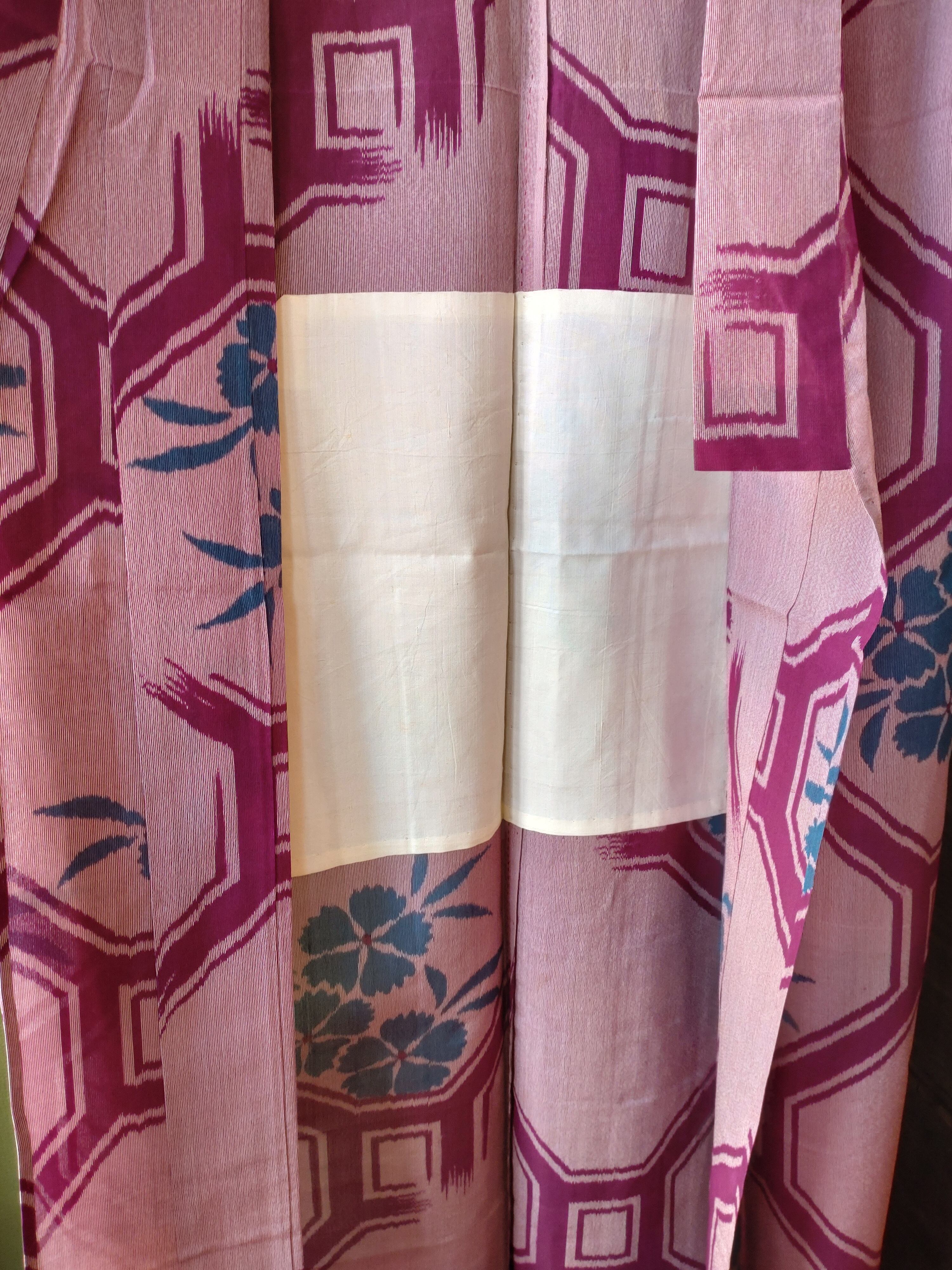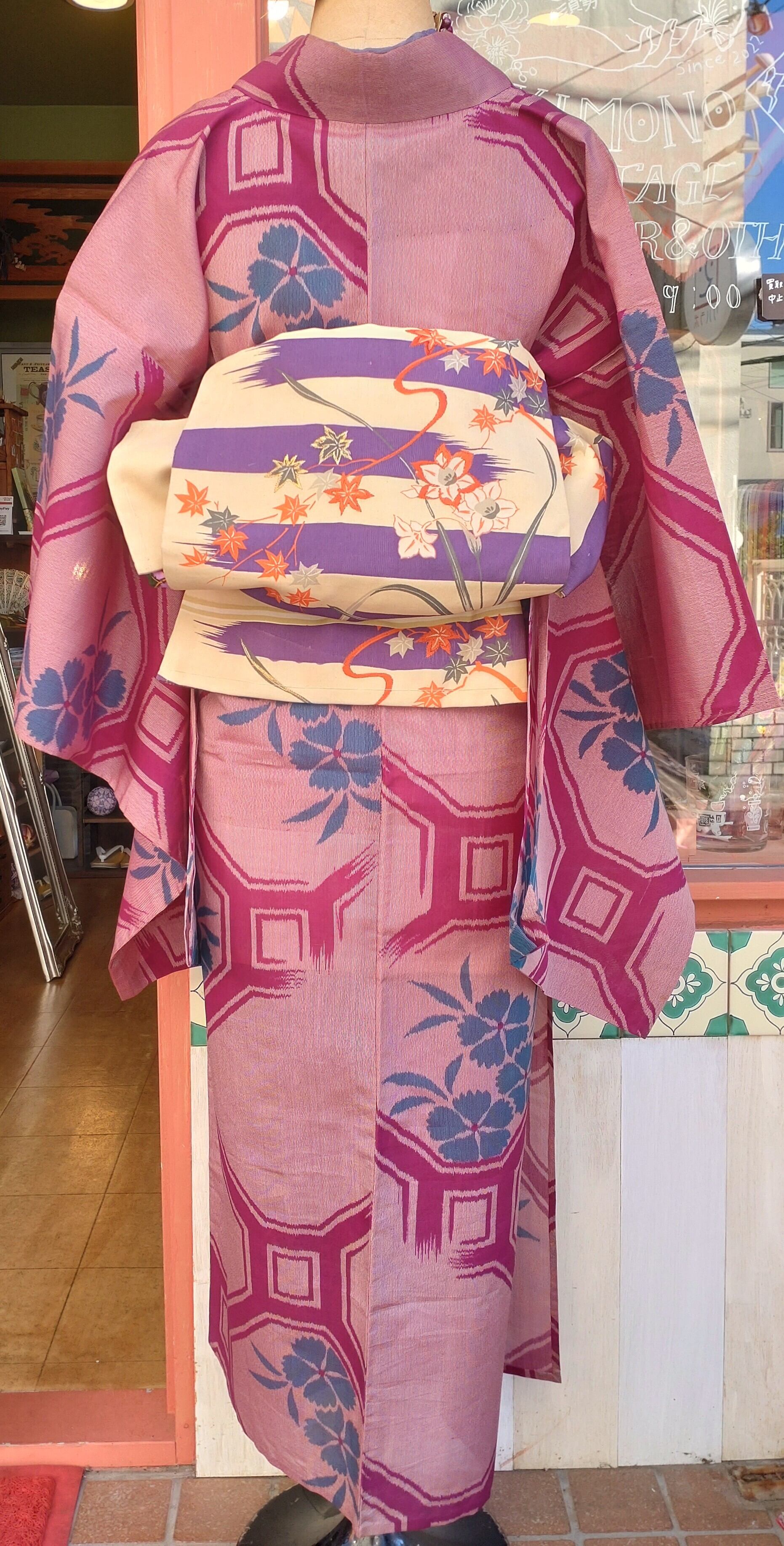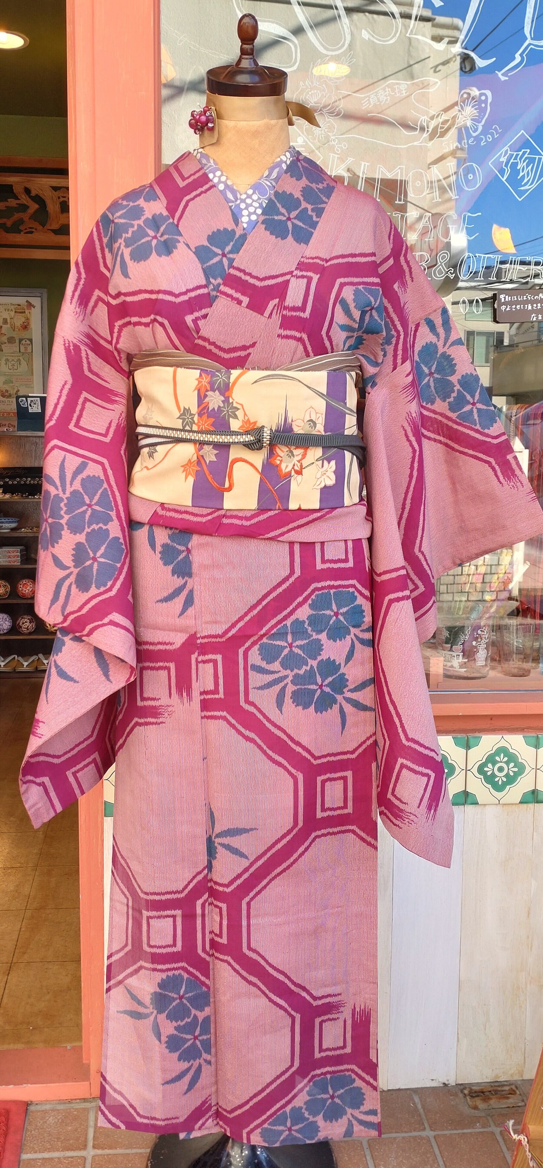 葡萄色の夏銘仙です。たもと長めのアンティーク感と透け感の爽やかさが絶妙なバランス。