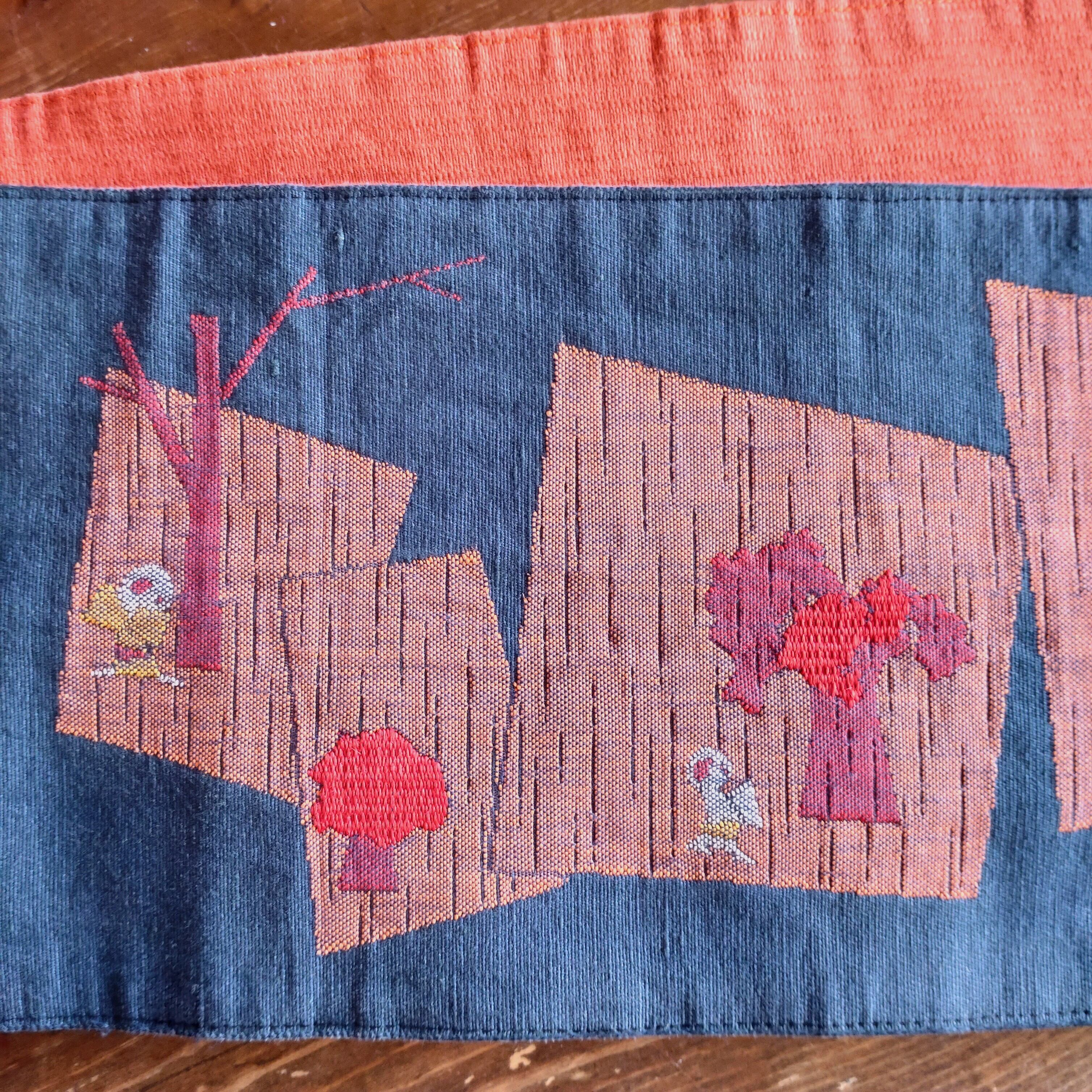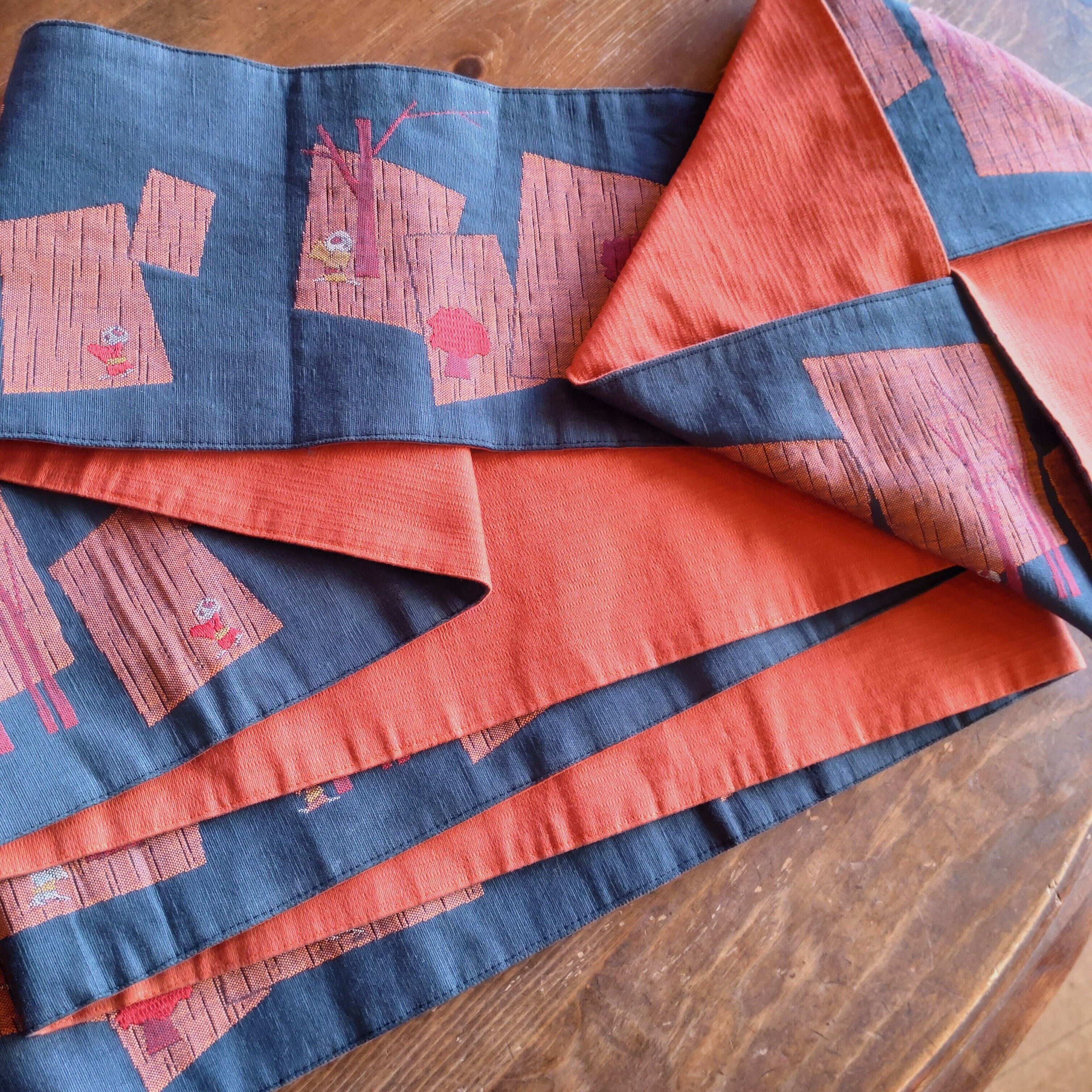 やたら四角い森のなかで小さな子供が追いかけっこしている半幅帯です。