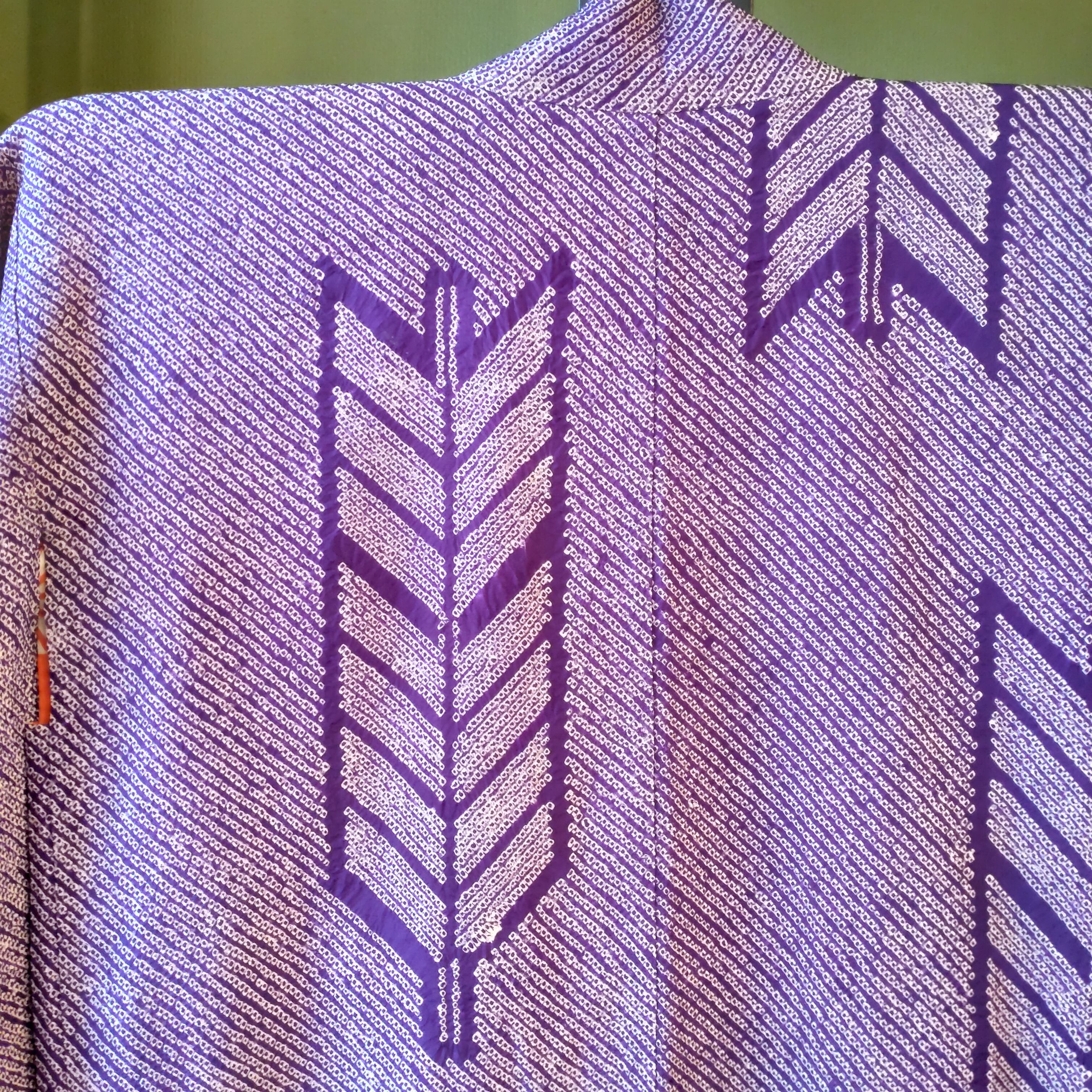 絞りの矢羽柄アンティーク羽織です。羽裏の朱色に麻の葉模様も洒脱です。羽織紐が黄色とピンクなのも抜け目なく可愛い一枚。