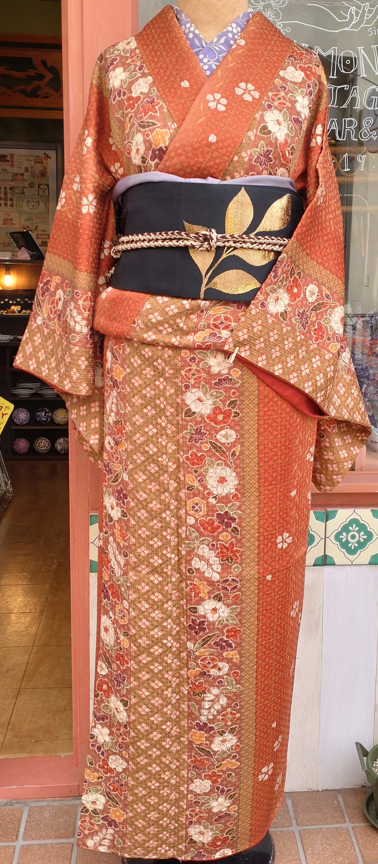 これぞ秋色!な袷着物です。縦のラインでパッチワークのように違う柄になっており、見た目に楽しいです。なんと八掛にも柄が。