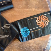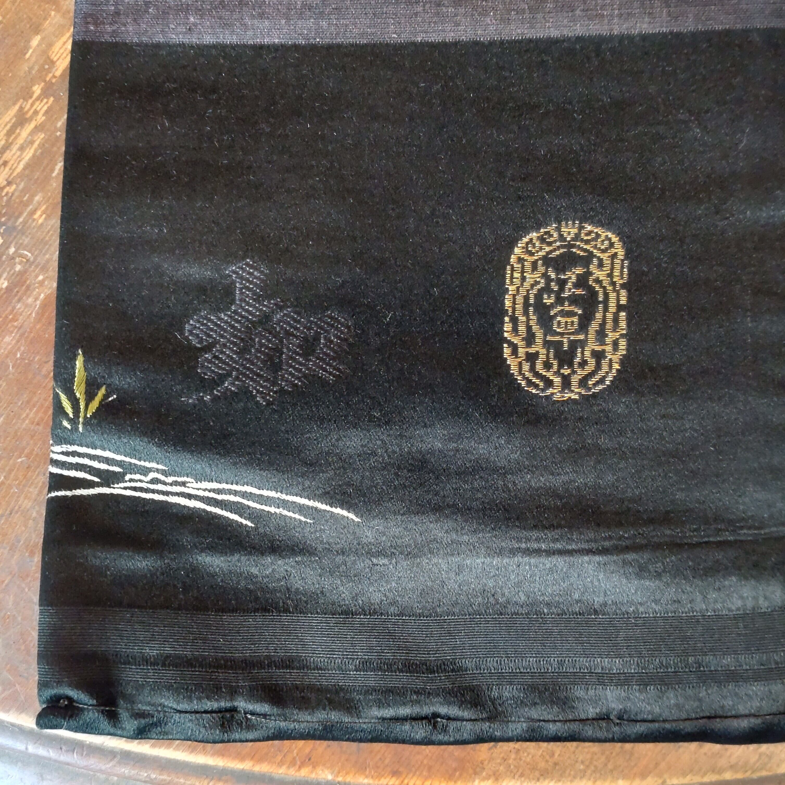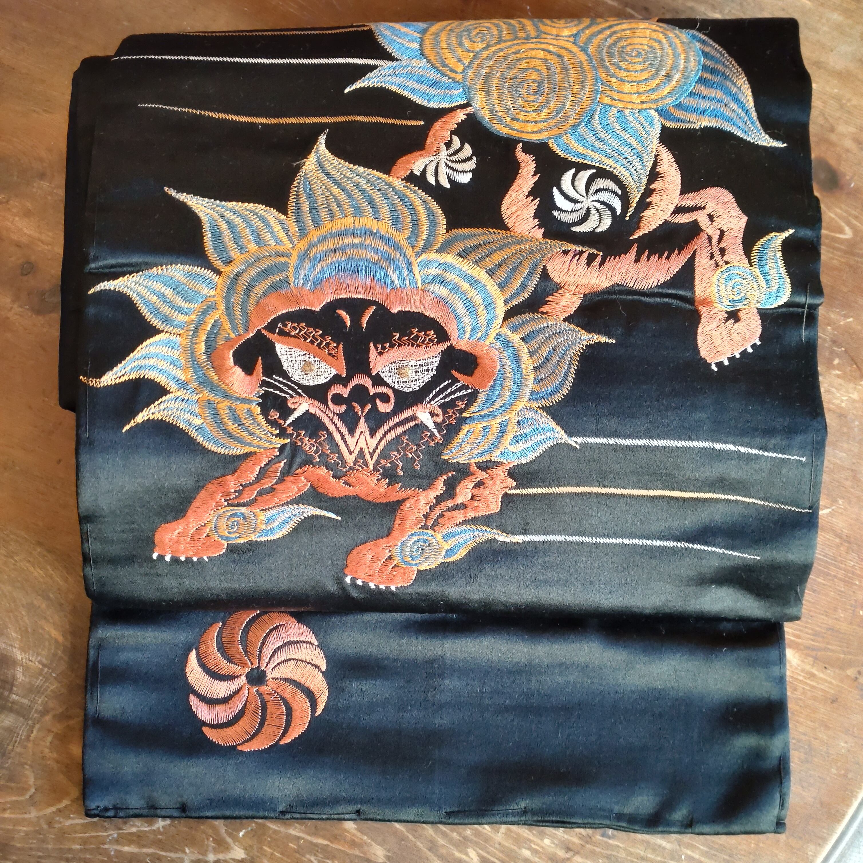 アンティークの名古屋帯です。柔らかい正絹の帯地にポップなお顔の獅子が刺繍されています。胴巻の部分の刺繍は飛び飛びに違う模様が刺されています。
