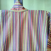 渋色マルチカラーのウール単衣です。紺や茶の帯でお渋なコーディネートをするもよし、ネオンカラーでポップにキメるもよし、年齢問わず楽しめます。