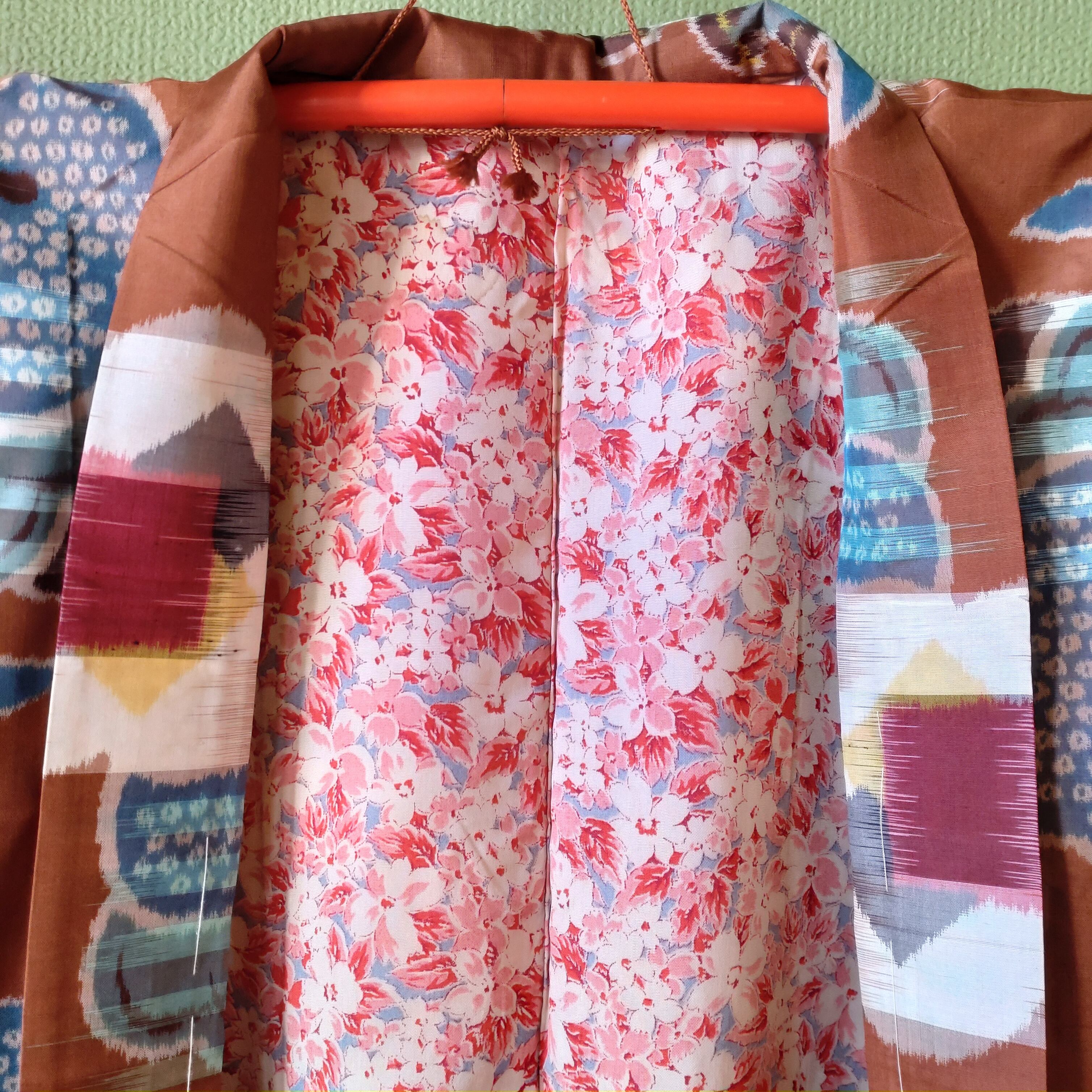 ポップな花柄の銘仙羽織です。渋かわいい色合いに、羽裏もとっても華やか。